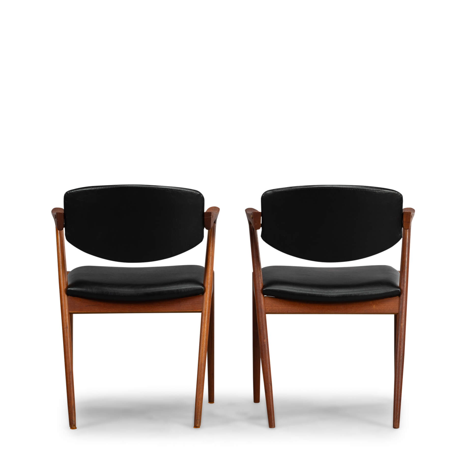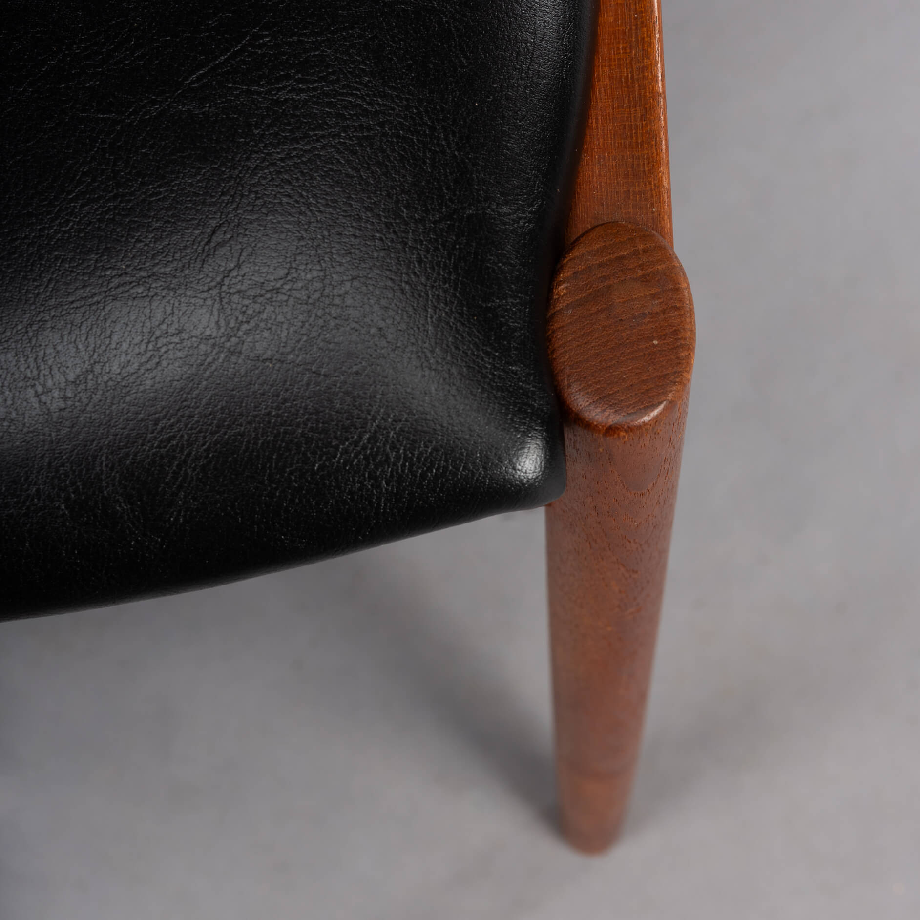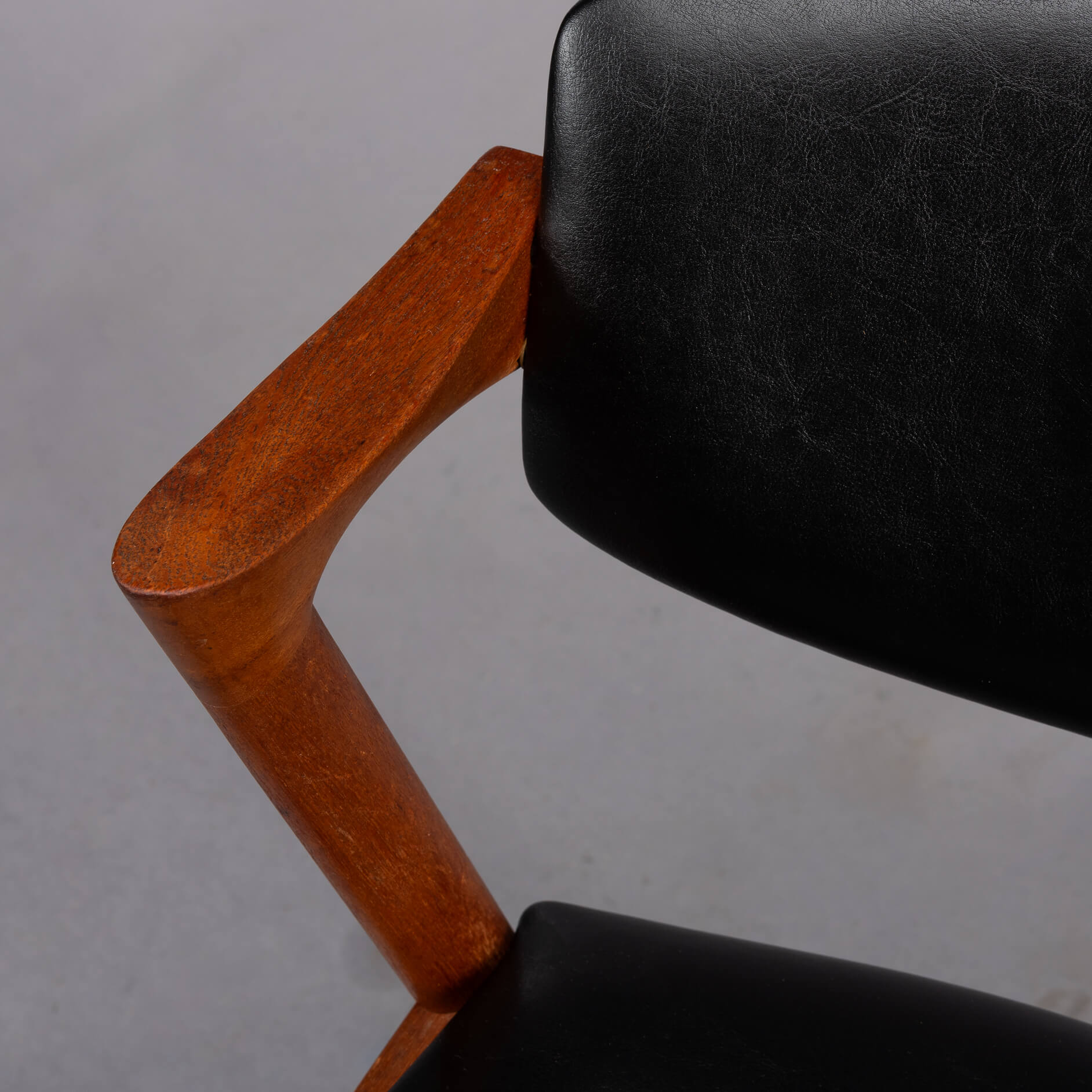 At first sight the chair might look slightly uncomfortable, however sits as a winner. Actually the short armrests are much better sized than typical ones you’ll find on a chair. Kristiansen clearly put some thought into this. These four chairs are from teak and the seats and backs have been reupholstered in a high quality (Retro) leatherette. The subtile glow makes it look like the original upholstery. We always choose this Retro leatherette because of its high quality and subtle shine, which makes it very similar to the original upholstery.