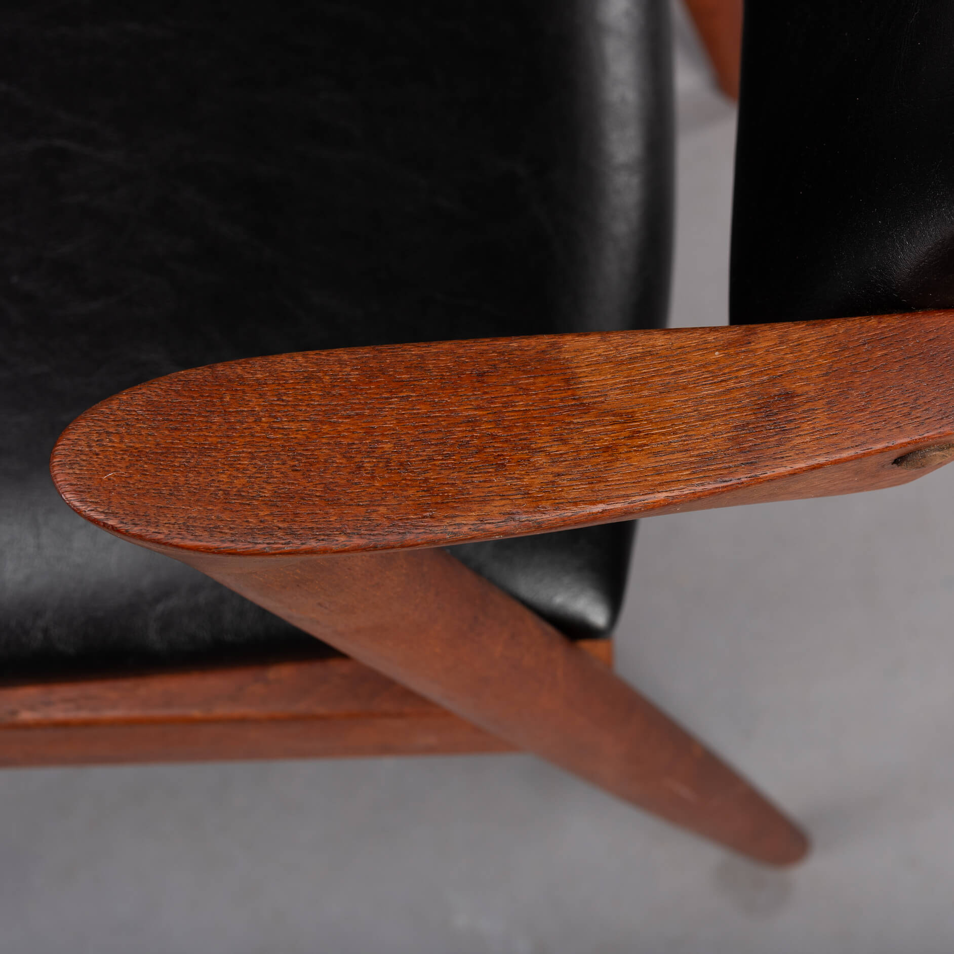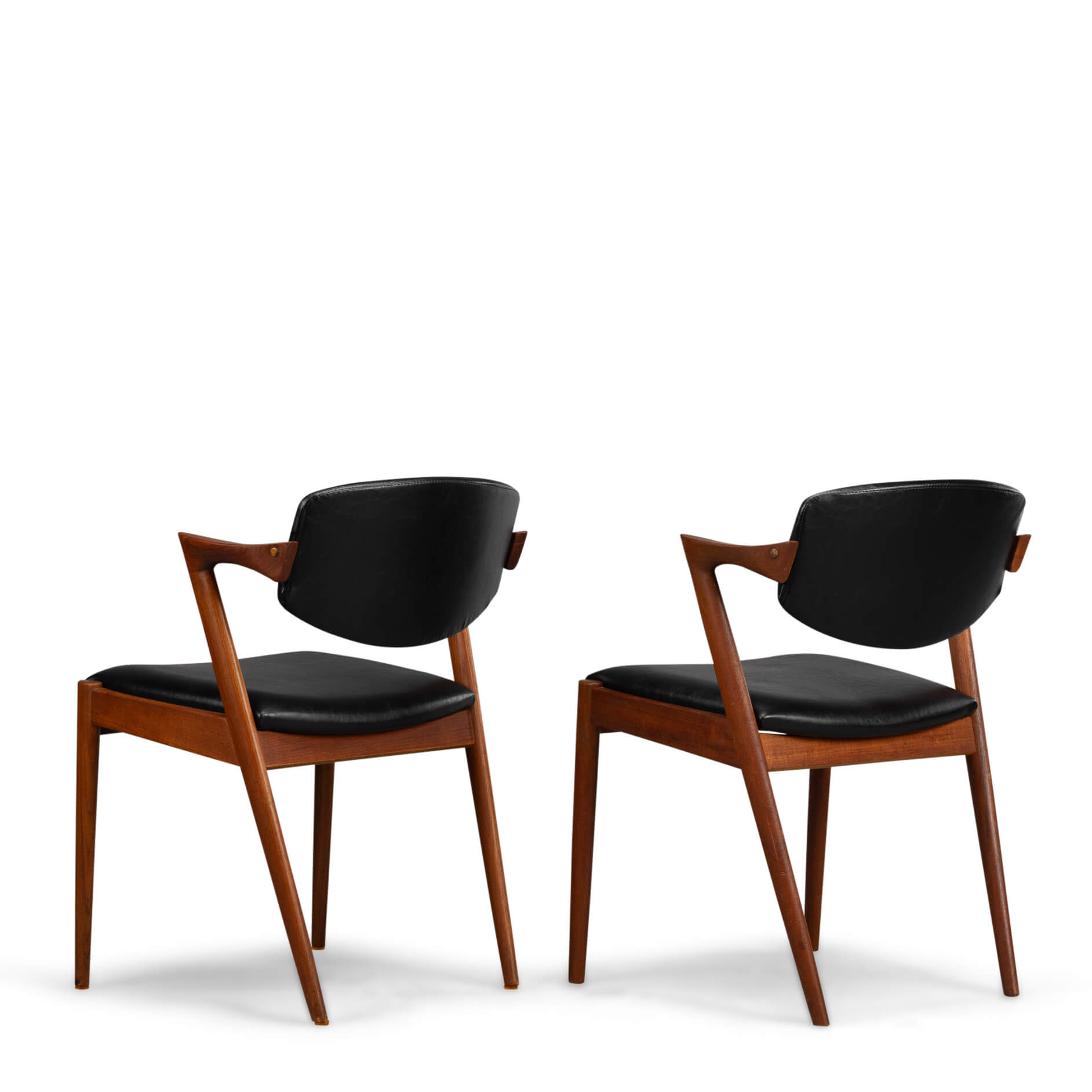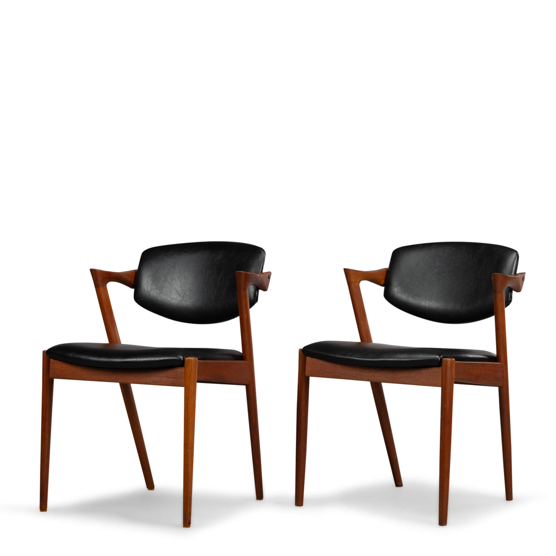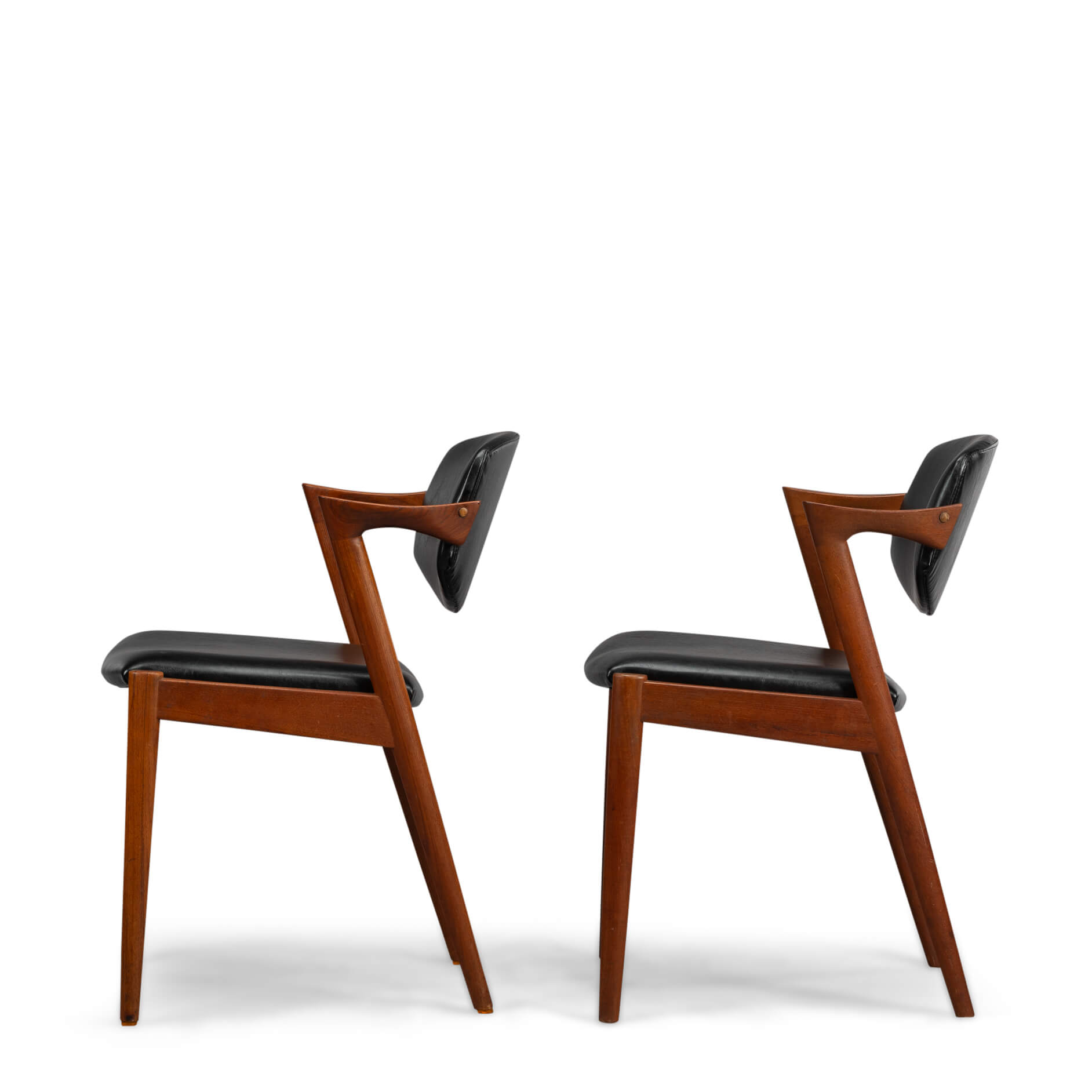 At first sight the chair might look slightly uncomfortable, however sits as a winner. Actually the short armrests are much better sized than typical ones you’ll find on a chair. Kristiansen clearly put some thought into this. These four chairs are from teak and the seats and backs have been reupholstered in a high quality (Retro) leatherette. The subtile glow makes it look like the original upholstery. We always choose this Retro leatherette because of its high quality and subtle shine, which makes it very similar to the original upholstery.
