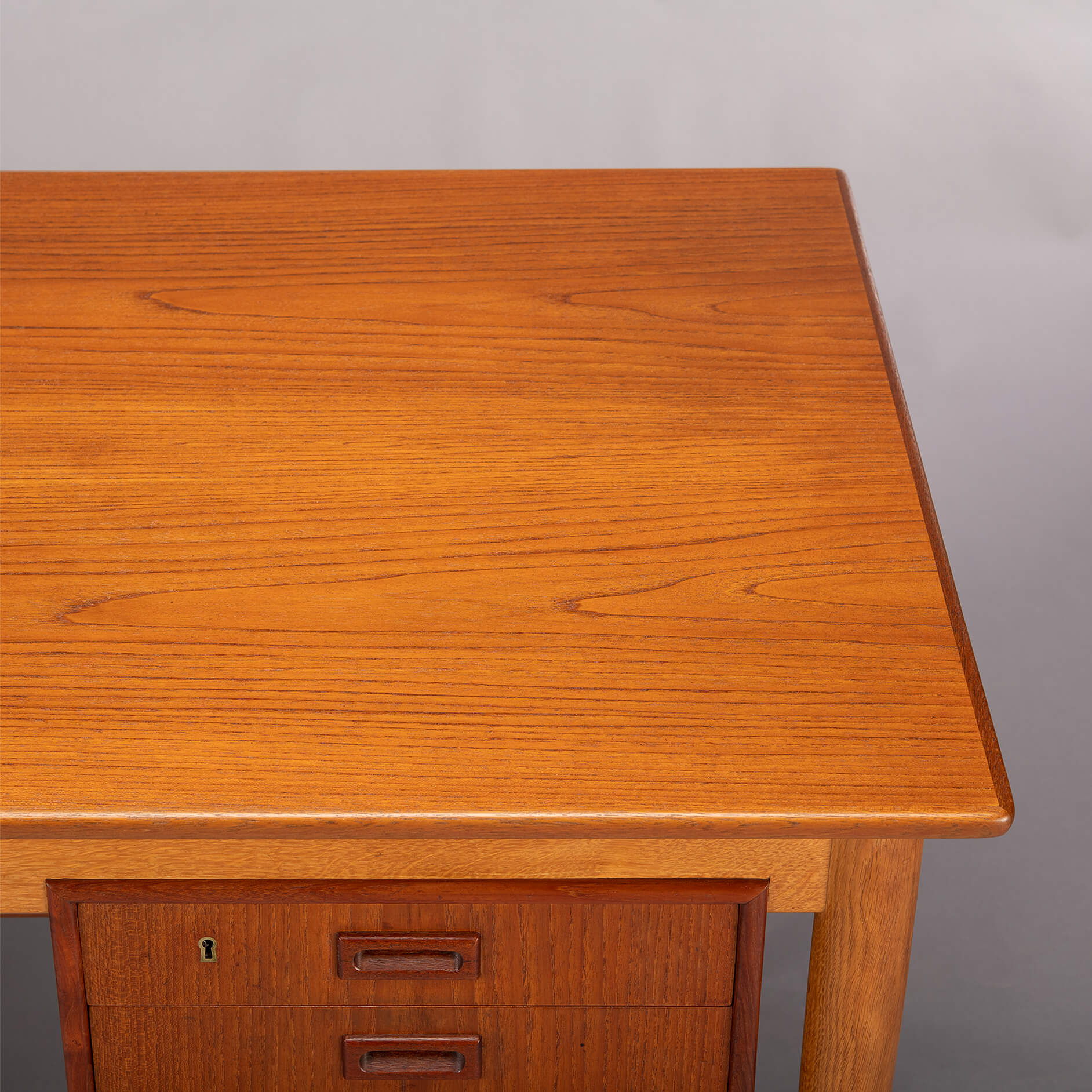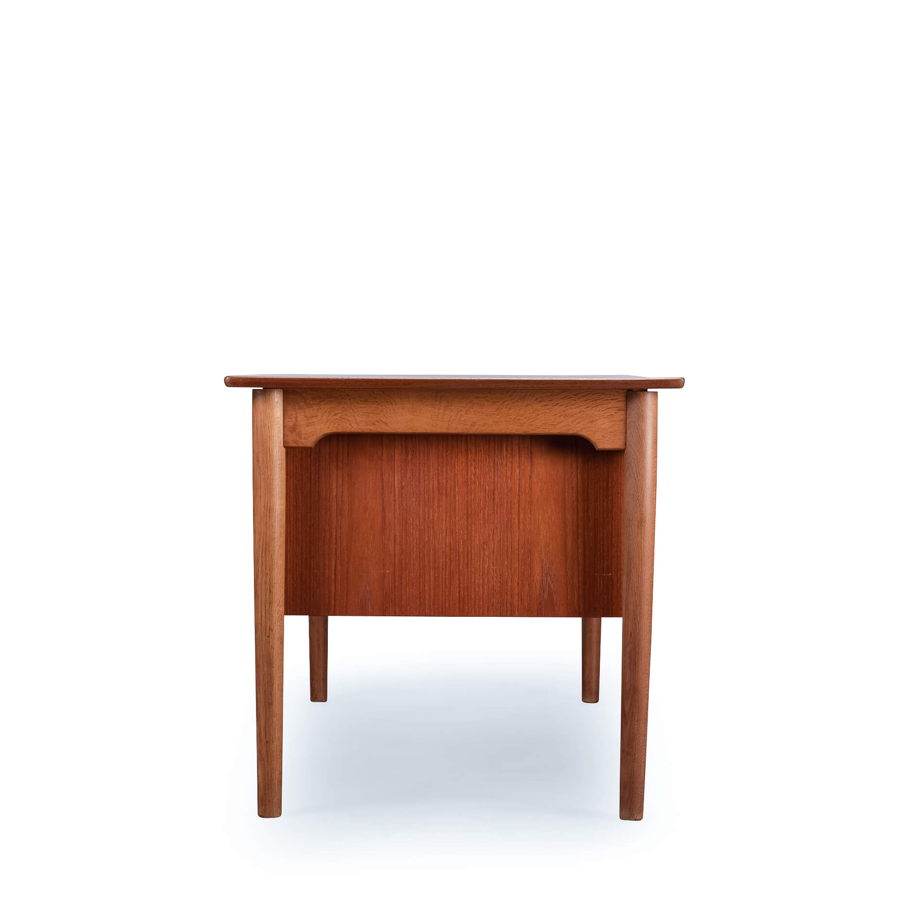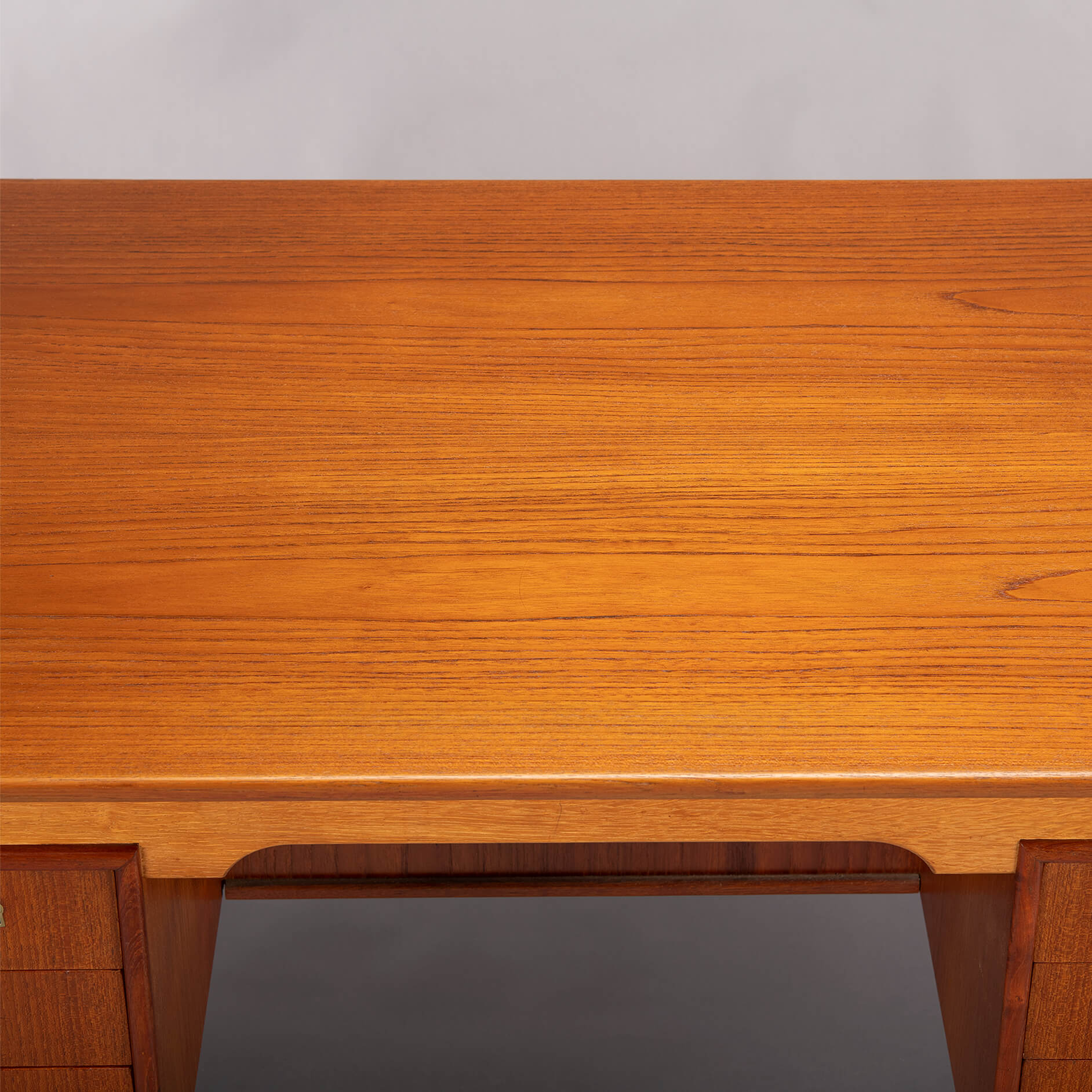 The legs of the desk are made out of solid oak. We had the top refinished with a cellulose laquer system minimizing the impact on the pure teak feel but adding a layer of robustness to the top. There are signs of use and time on the frame and the drawer banks but none of those disturb really. For this reason we give this desk a very good vintage condition mark.