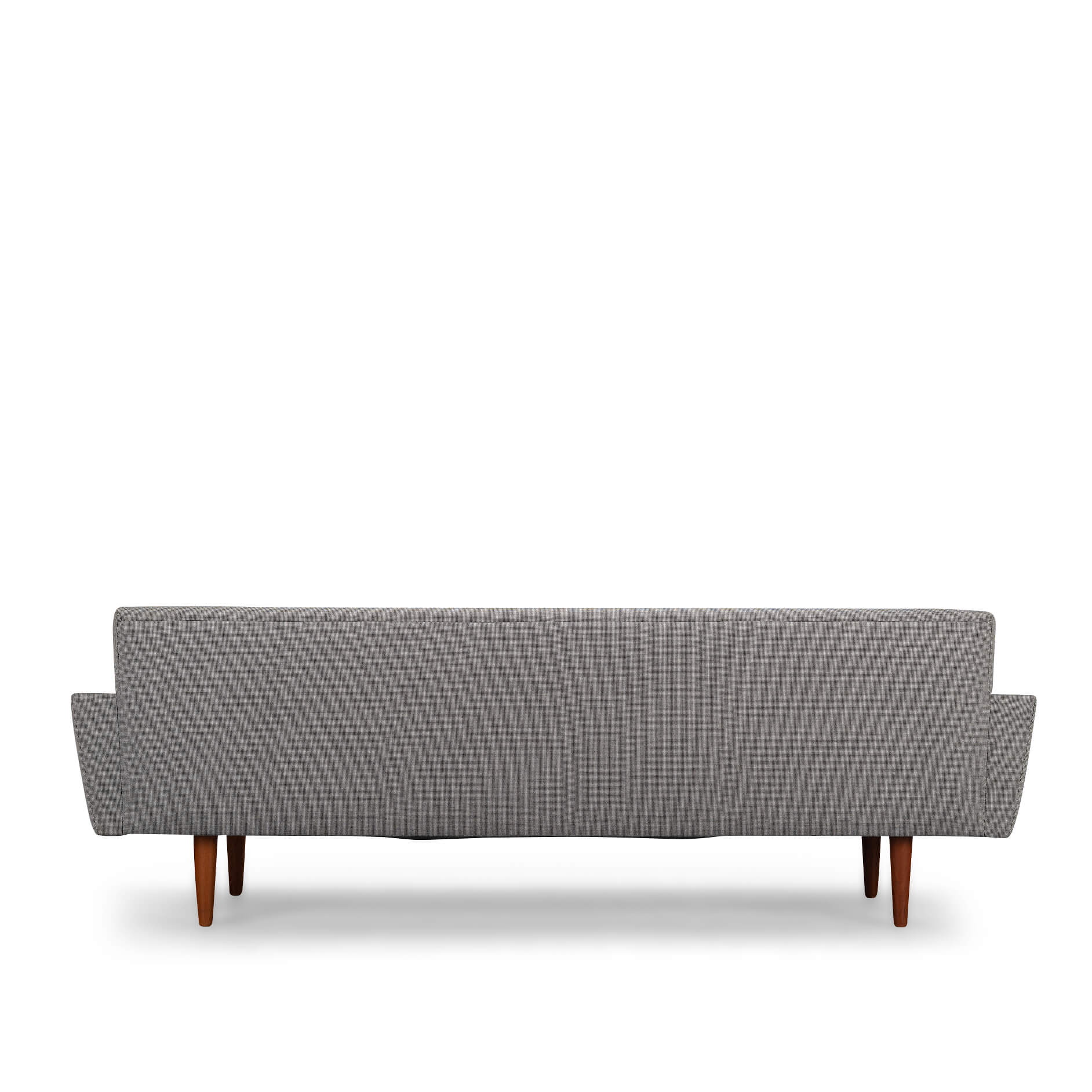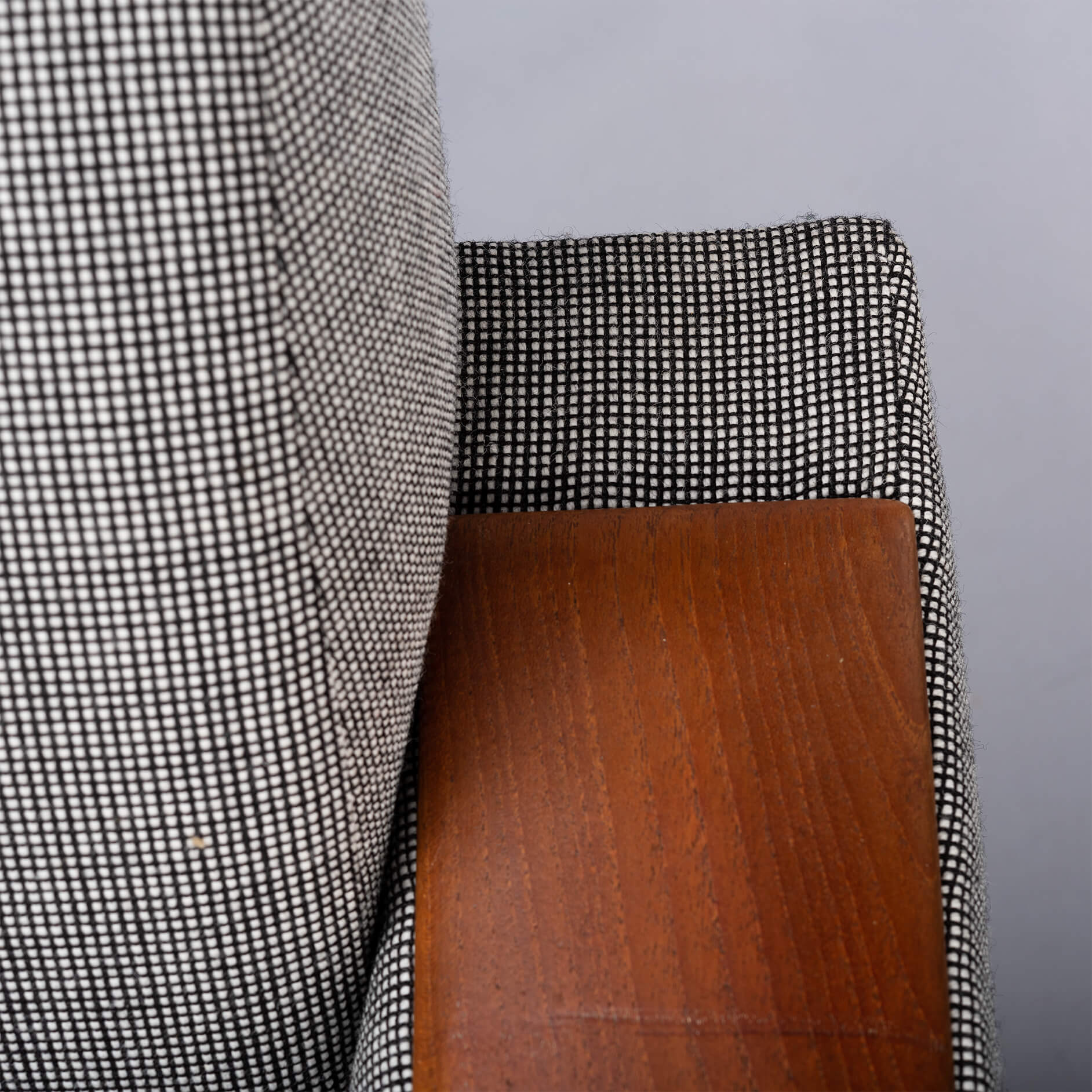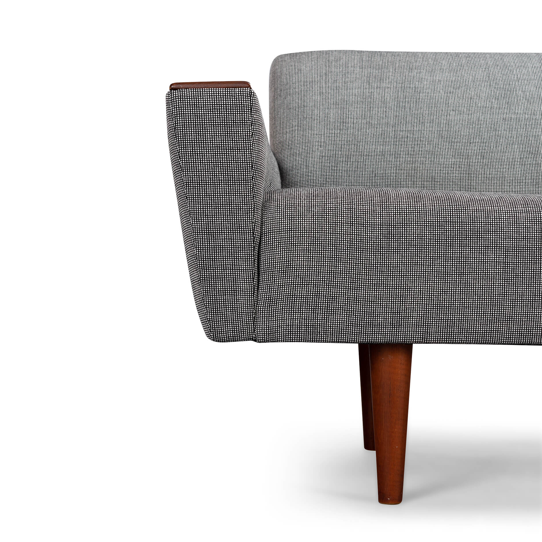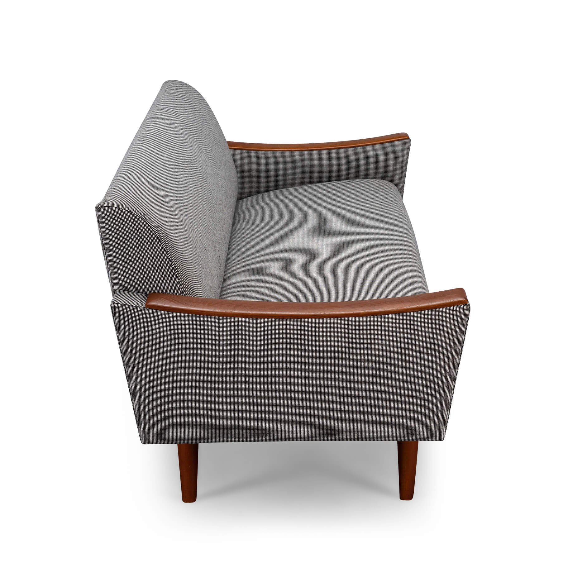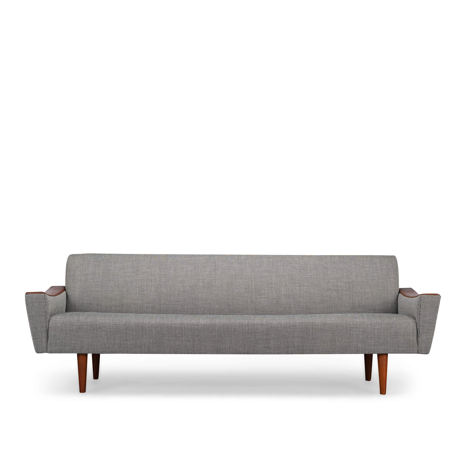 Stylish Deense design bank door CFC Silkeborg in volledig nieuwe stoffering. Helemaal in lijn met de originele bekleding. De bank heeft een ruime en rechte zit, ideaal voor activiteiten zoals lezen of werken. De grote armleuningen in teak die in zeer goede vintage conditie zijn maken deze bank compleet.