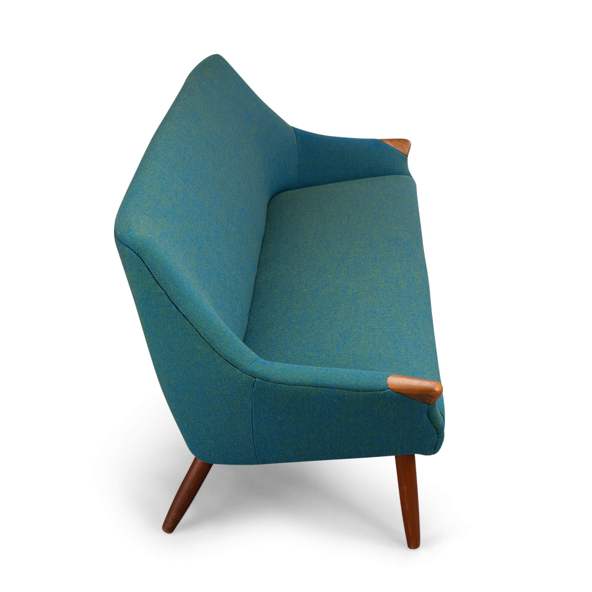 Edgy Johannes Andersen bank gemaakt door CFC Silkeborg in een opvallende groen blauwe bekleding. Deze bank is professioneel geherstoffeerd met Kvadrat Hallingdal in volledige overeenstemming met de originele bekleding zoals ontworpen door Andersen. Ook het binnenwerk is volledig vernieuwd. Deze bank heeft een ruime actieve zit. Ergonomisch geschikt voor gesprekken en activiteiten zoals lezen en werken. Met de pakkende mid-century modern teak armleuningen maakt deze blikvanger je living compleet.
