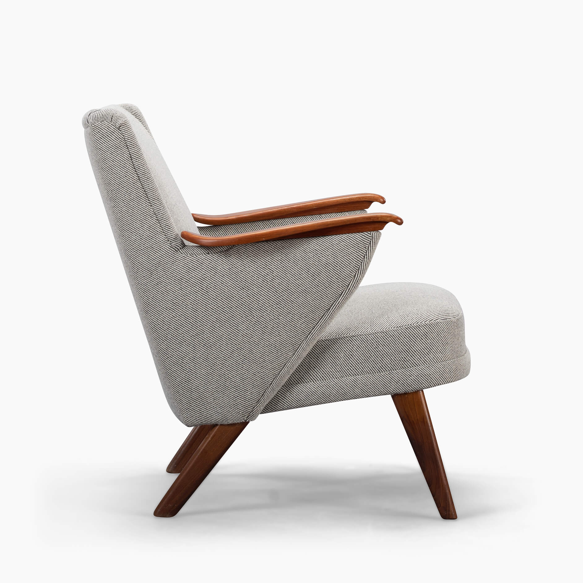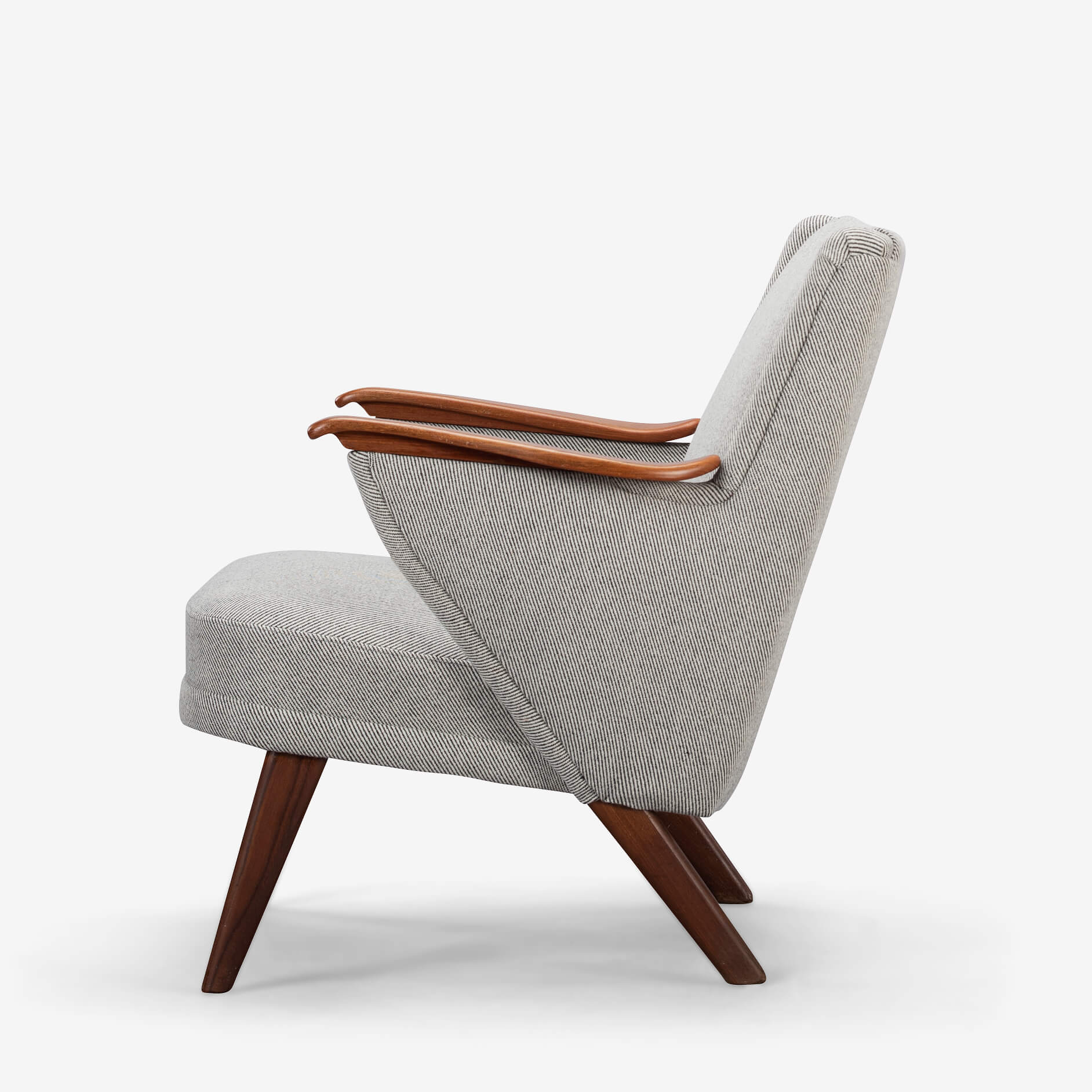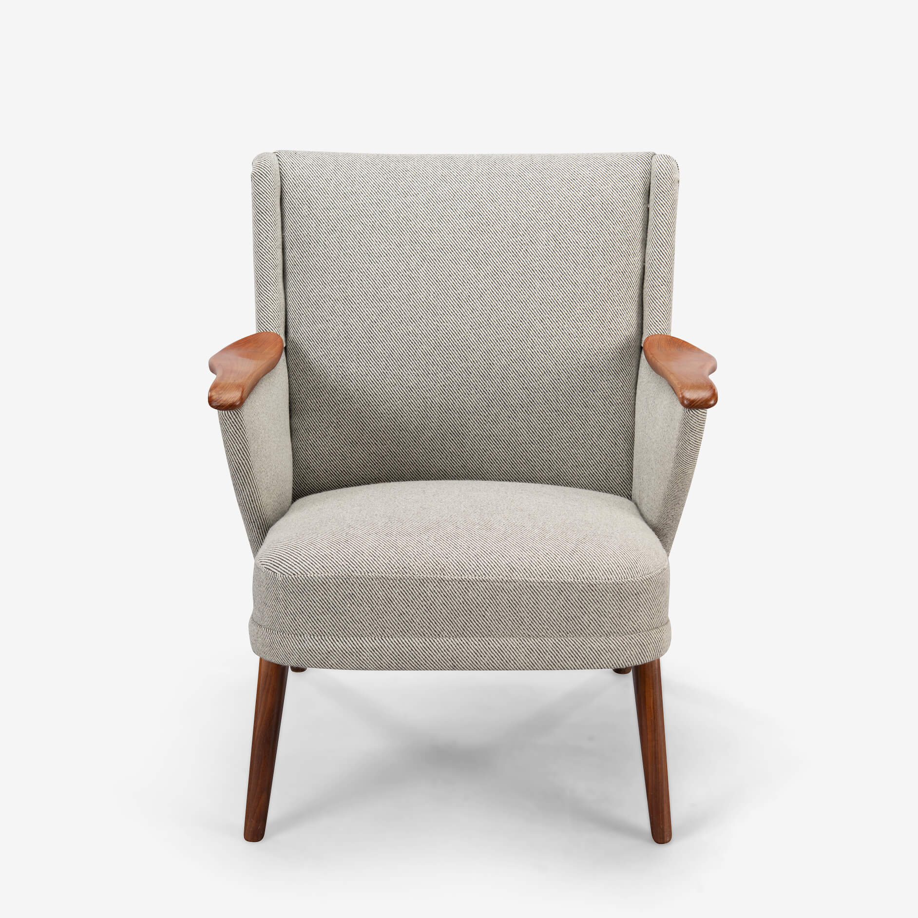 Edgy Johannes Andersen fauteuil gemaakt door CFC Silkeborg in een verbluffende nieuwe bekleding. Deze stoel is professioneel opnieuw gestoffeerd met Ploeg Bergen 12/08 in volledige overeenstemming met de originele bekleding zoals ontworpen door Andersen. Deze fauteuil heeft een ruime actieve zit en pakkende mid-century modern armleuningen. Ergonomisch geschikt voor gesprekken en activiteiten zoals lezen en werken.