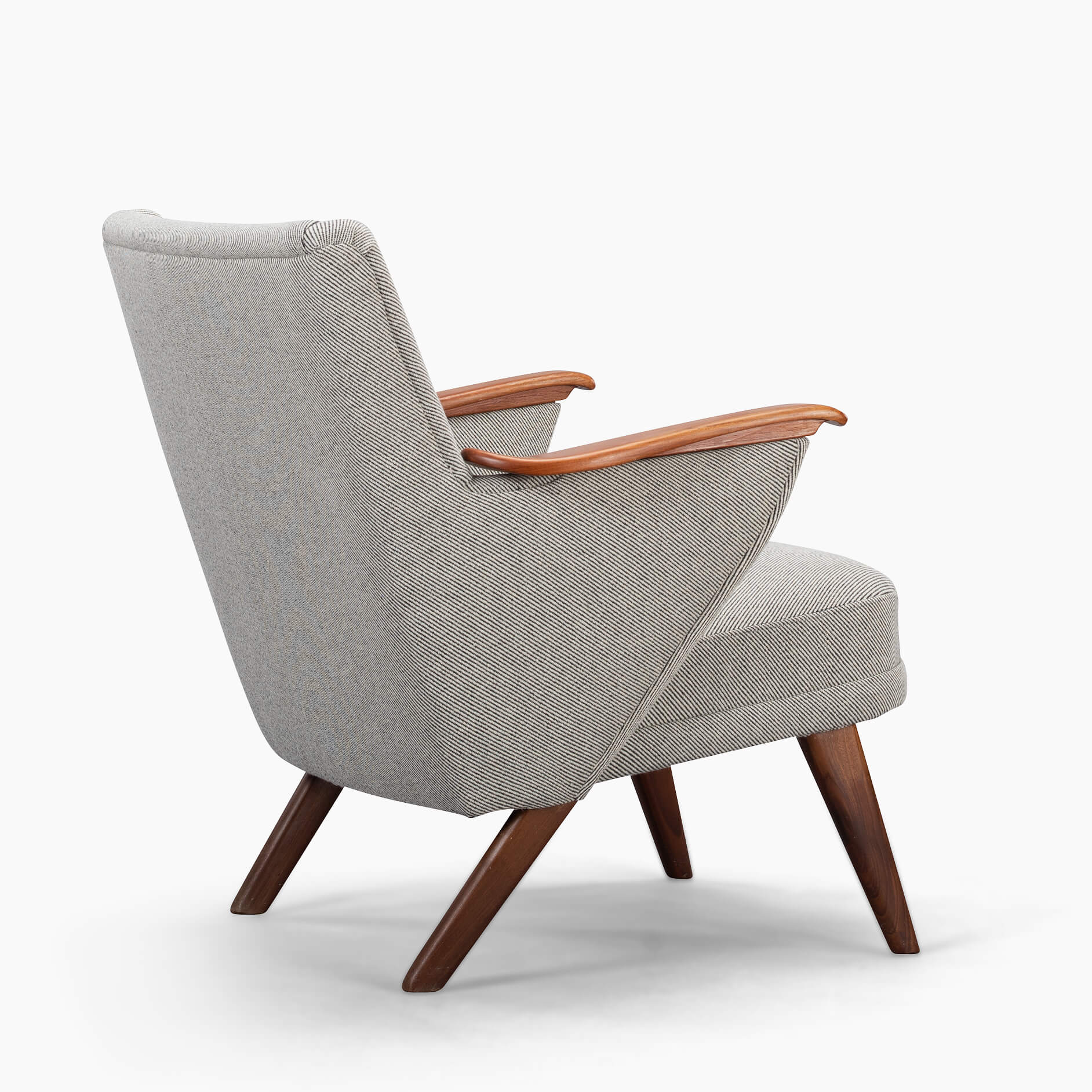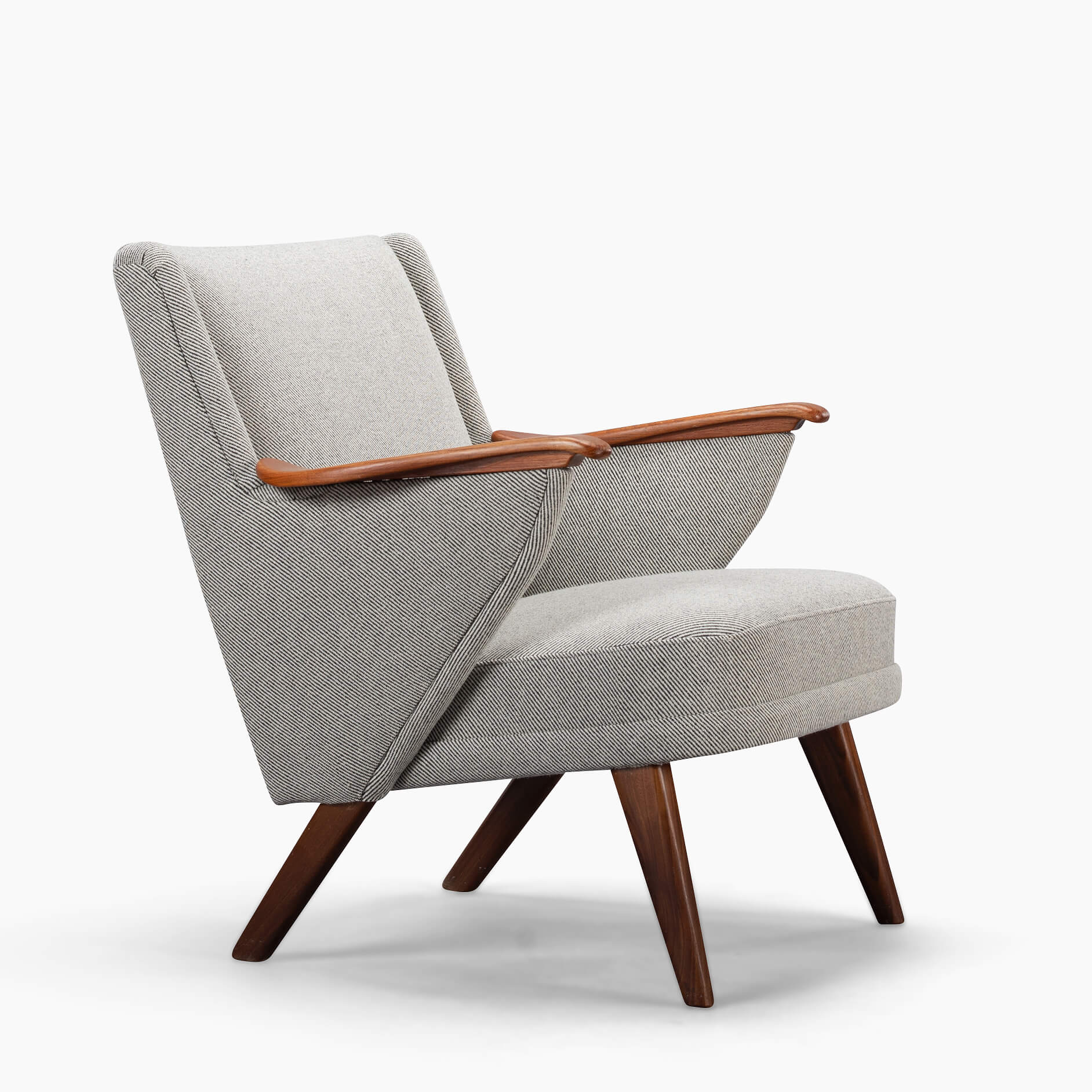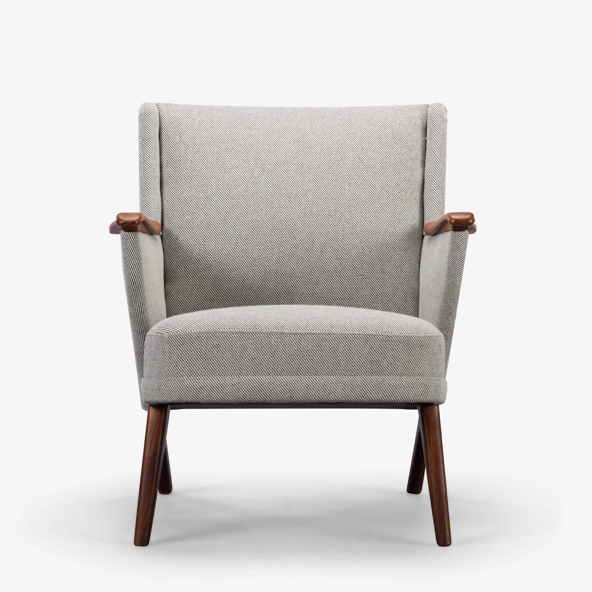Edgy Johannes Andersen fauteuil gemaakt door CFC Silkeborg in een verbluffende nieuwe bekleding. Deze stoel is professioneel opnieuw gestoffeerd met Ploeg Bergen 12/08 in volledige overeenstemming met de originele bekleding zoals ontworpen door Andersen. Deze fauteuil heeft een ruime actieve zit en pakkende mid-century modern armleuningen. Ergonomisch geschikt voor gesprekken en activiteiten zoals lezen en werken.