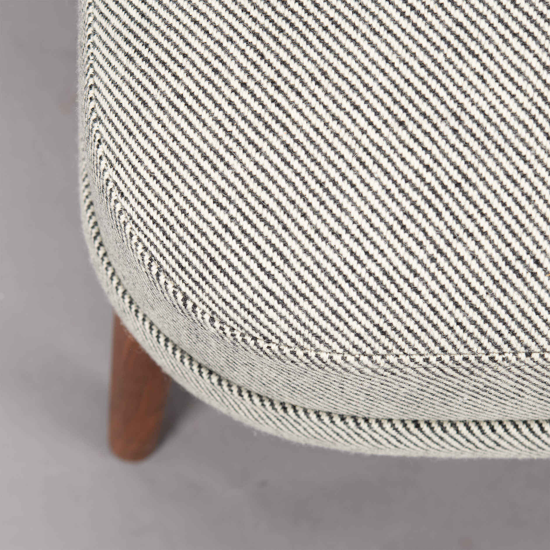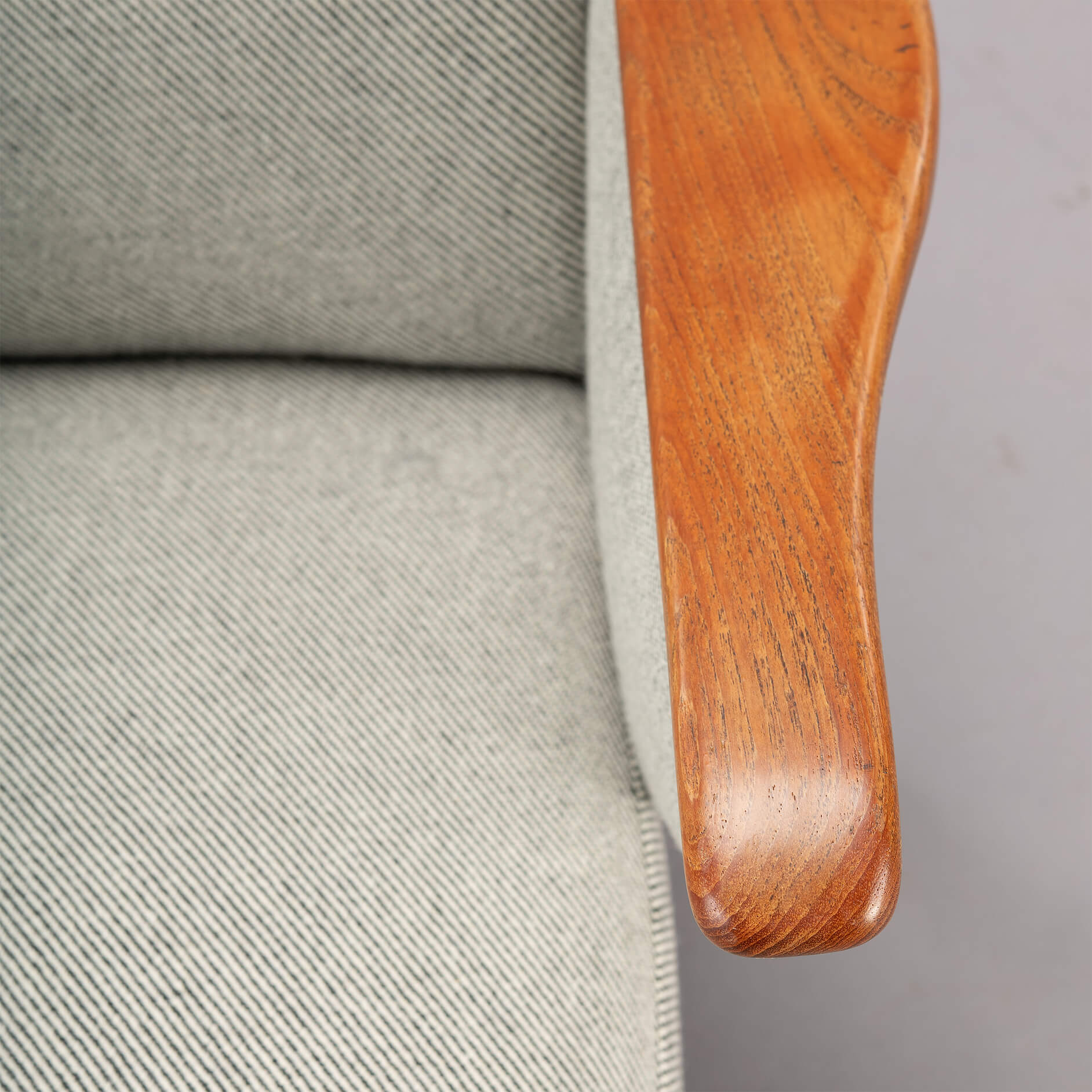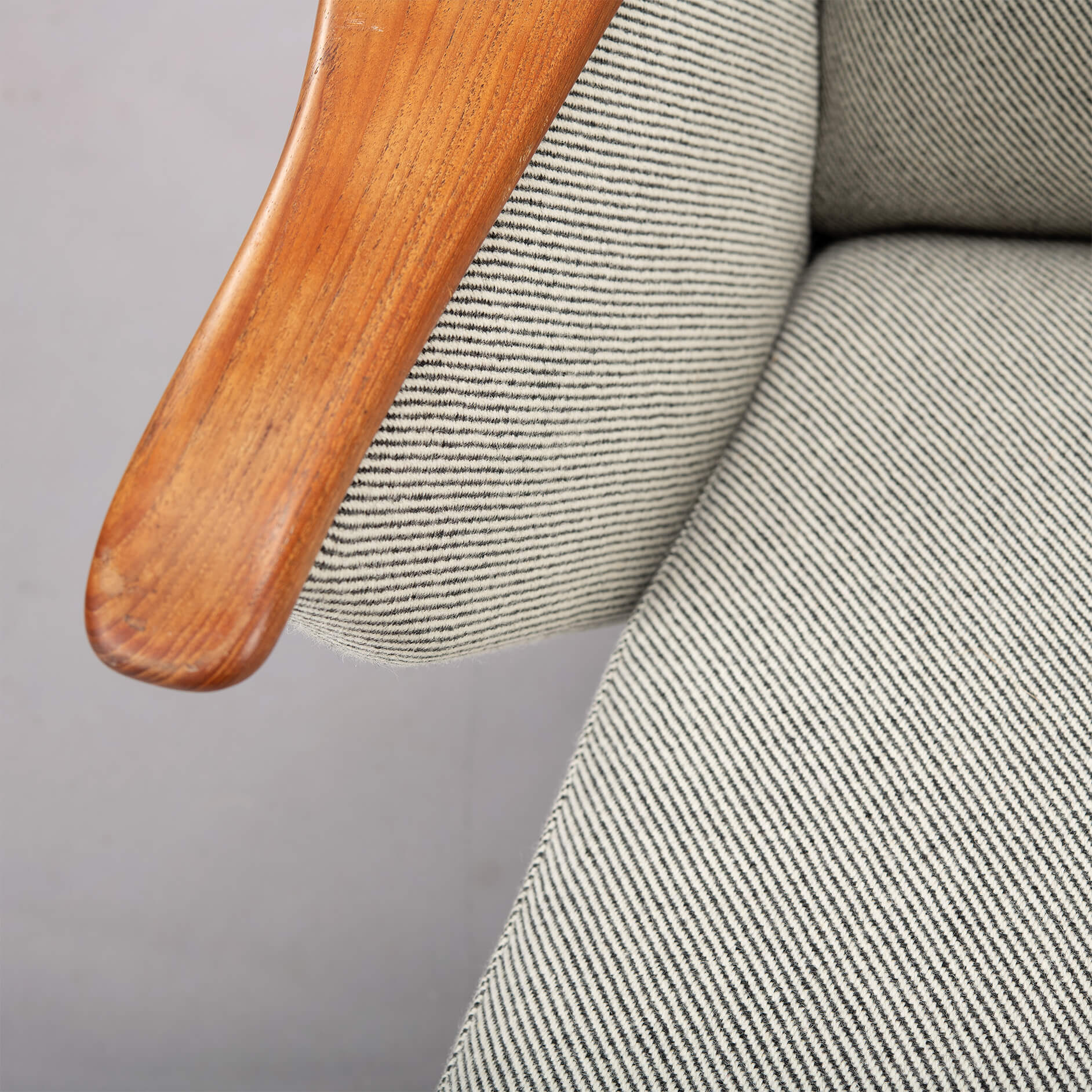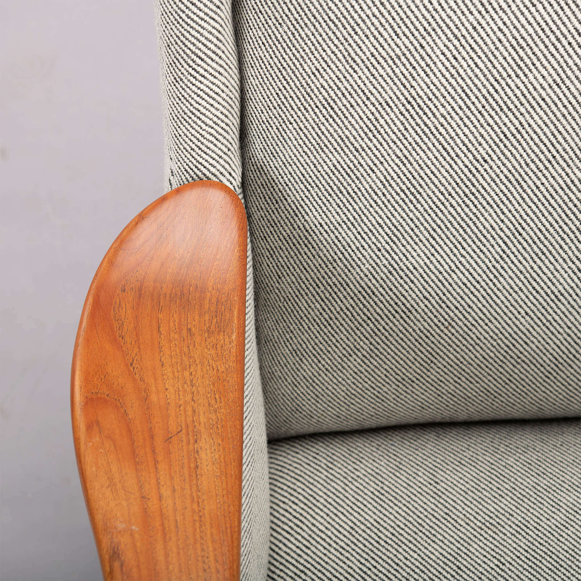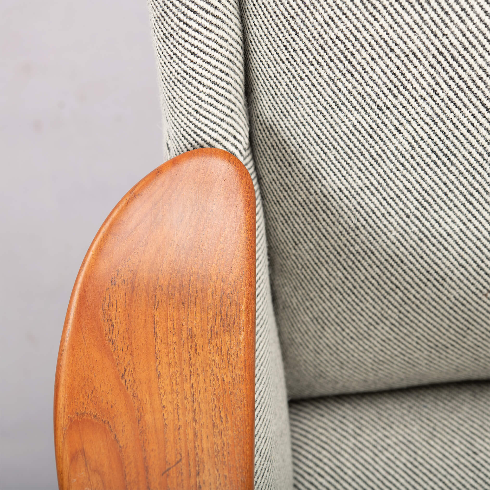 - De gebruikte Ploeg Bergen 12/08 is een 25% polyamide en 75% zuiver scheerwol meubelstof met een slijtvastheid van 50000 martindale. De teak armleuningen en poten bevatten zeer lichte gebruikssporen horend bij de leeftijd van deze te gekke sofa!