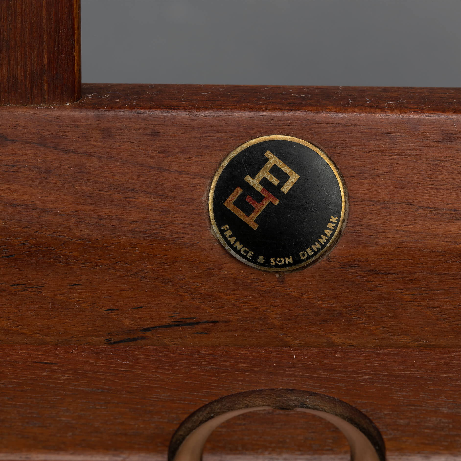 Deense design fauteuil van de beroemde Grete Jalk gemnaakt door France & Son in prachtige nieuwe bekleding. De kussens zijn volledig vervangen. De zitkussens zijn gemaakt van koudschuim HR45 8 cm dik. De rugkussens zijn gemaakt van polyether SG30 8cm dik. We hebben gekozen voor de Deense kwaliteitsstof Kvadrat Divina MD 713 in volledige overeenstemming met de originele bekleding zoals ontworpen door Jalk.