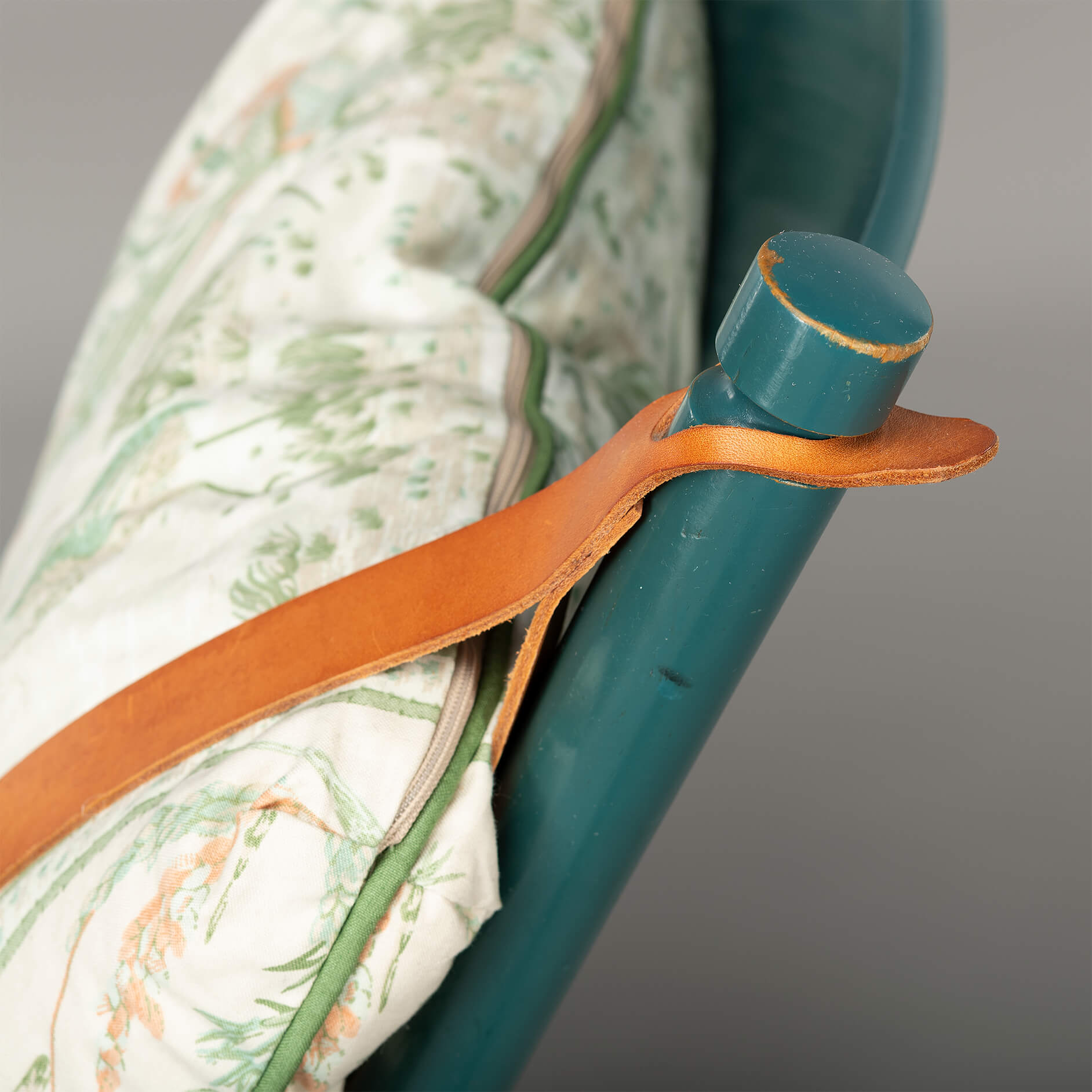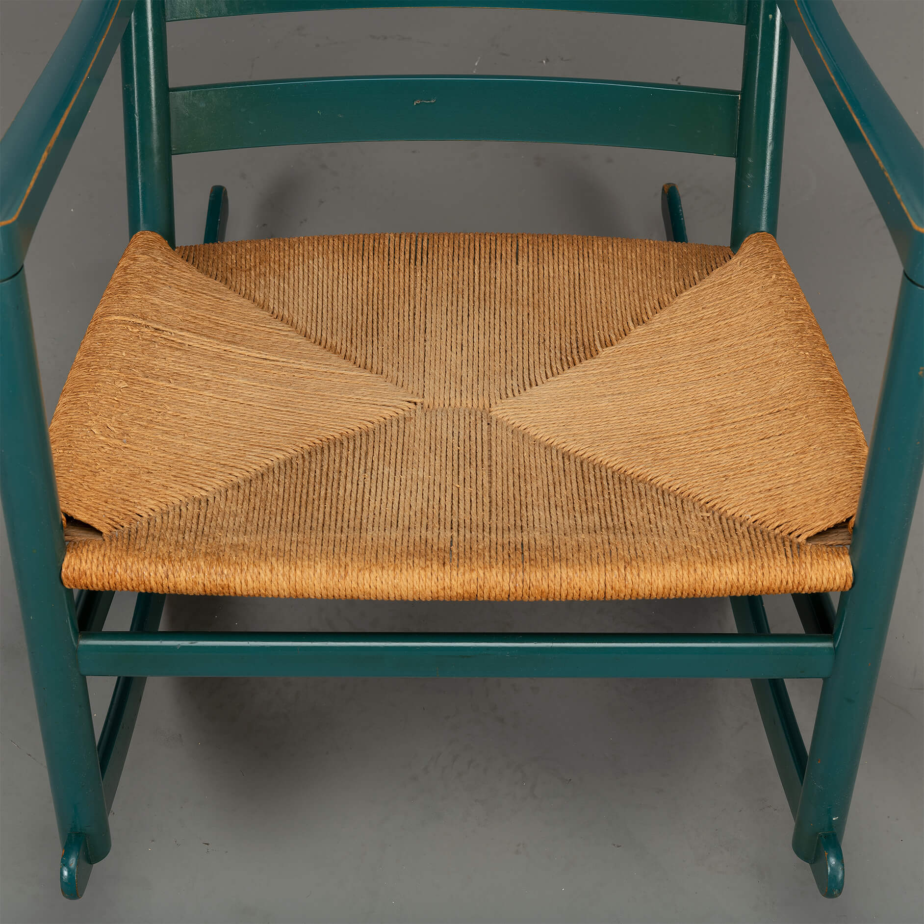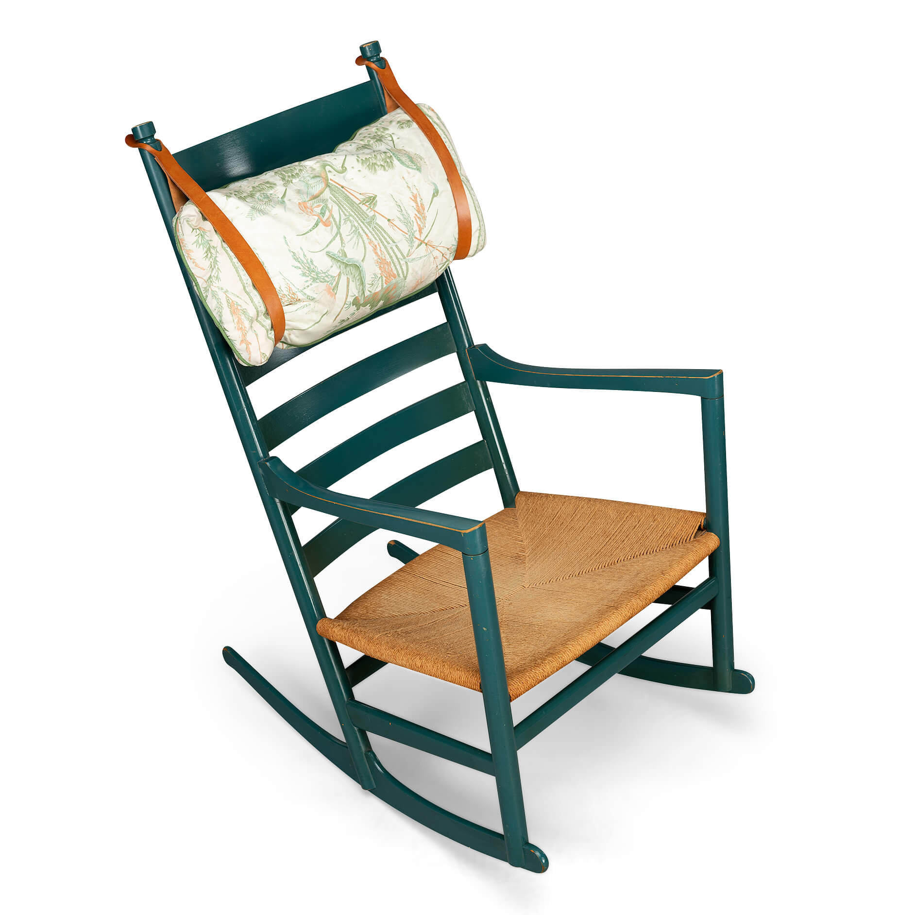 Zeldzame Wegner-schommelstoel met de horizontale rugleuningsteunen van de Tarm-meubelfabriek die als dochteronderneming van FDB Møbler opereerde. Deze specifieke stoel heeft de originele groene lakafwerking en wordt geleverd met een prachtige patina. De verf is prachtig afgesleten op de randen van de armleuning. De shcommelstoelen heeft nog de originele leren riemen en kussen, hoewel de stof van het kussen een make-over kan gebruiken. We werken samen met een professionele stoffeerder, dus als je een stof kiest... Dan kan deze stoel precies worden zoals je hem voor ogen hebt.