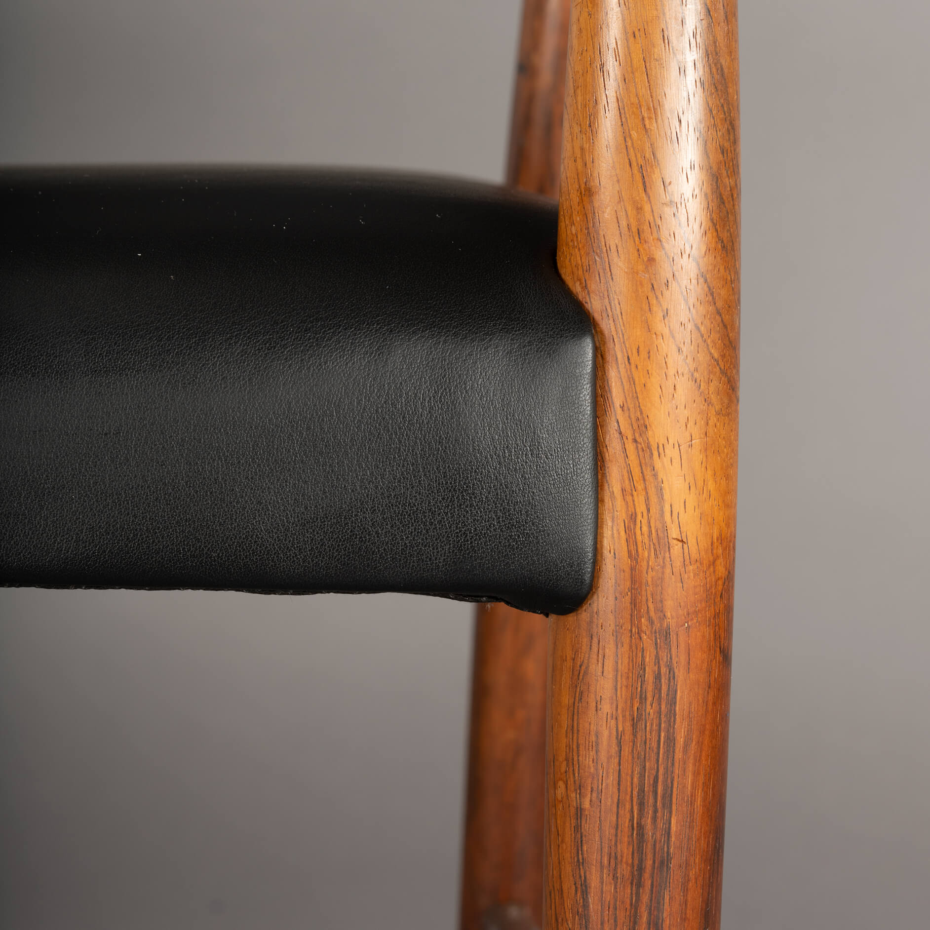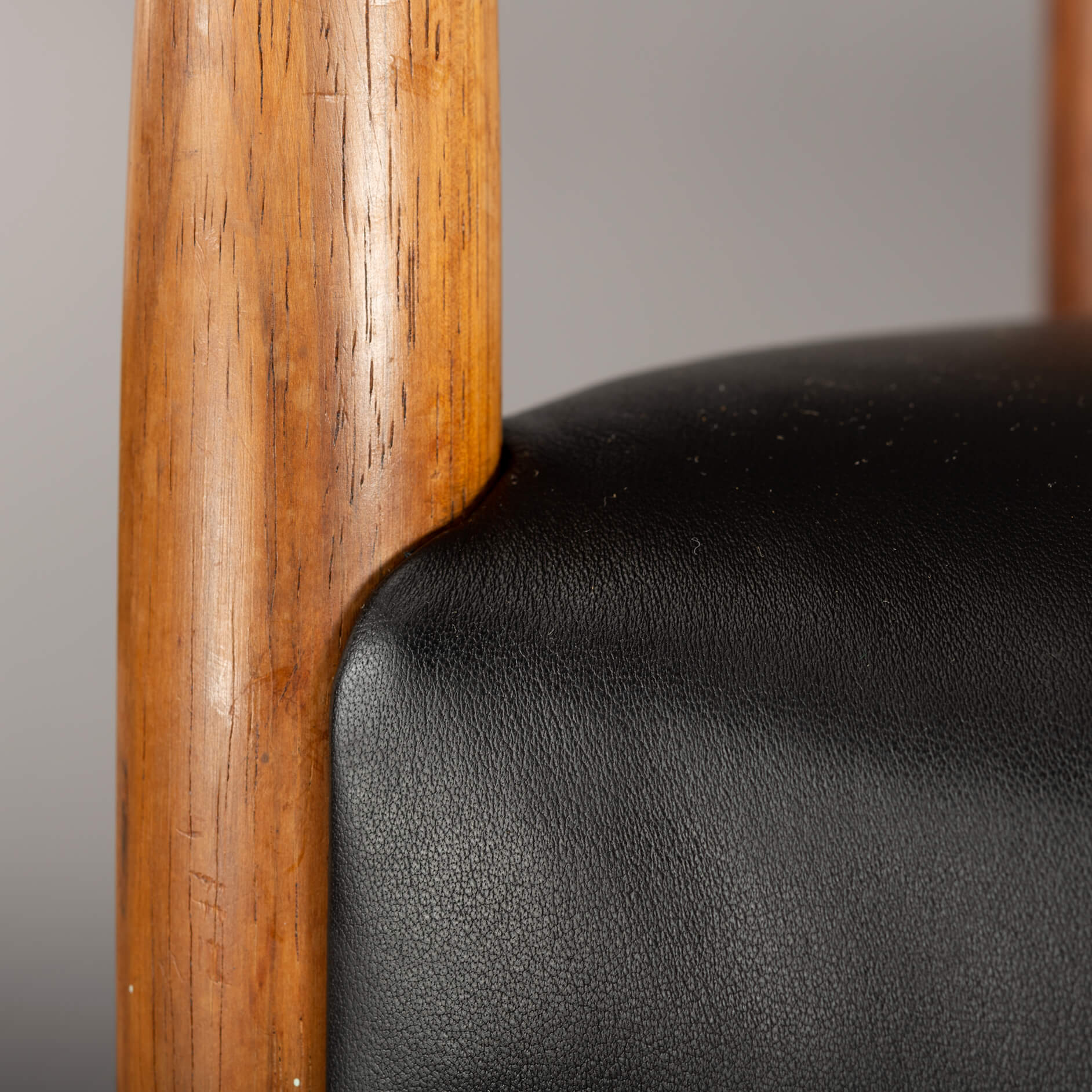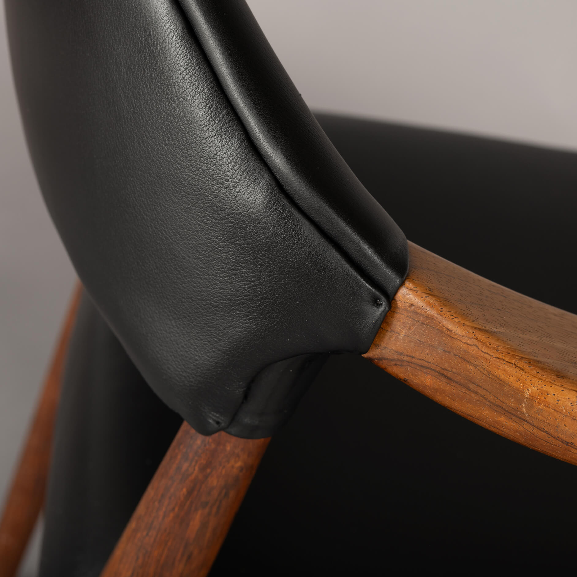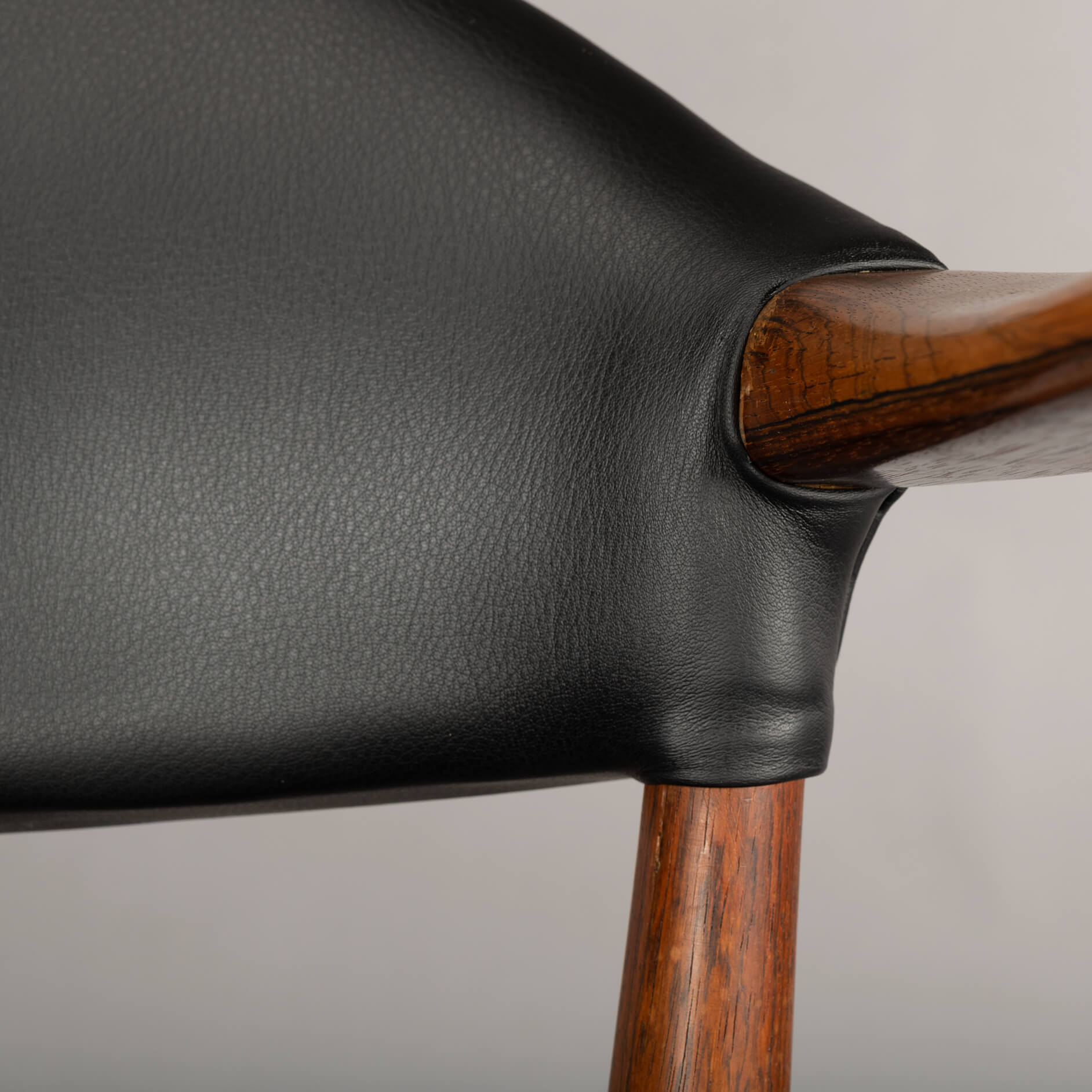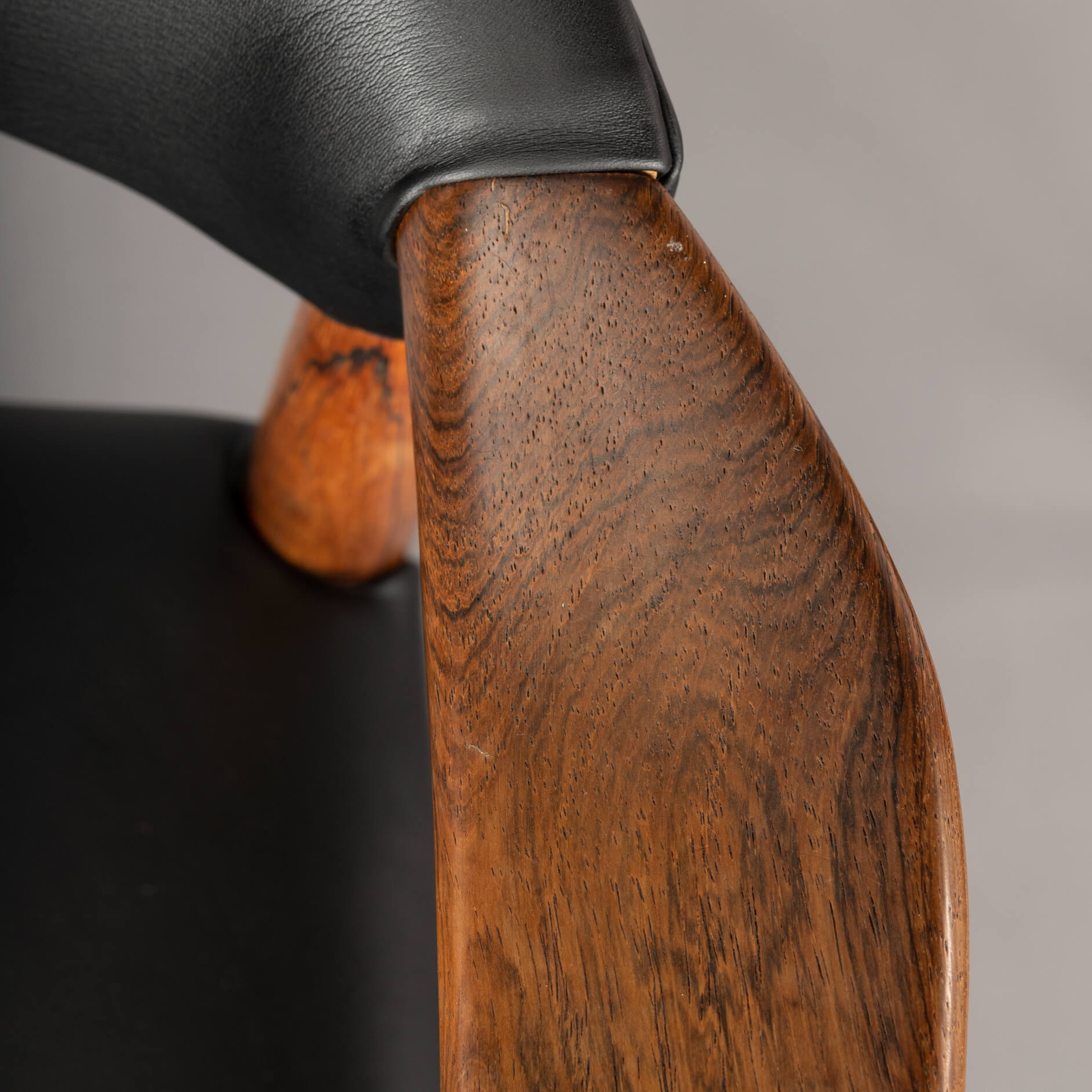 Kurt Olsen ontwierp deze robuuste stoel met palissander frame voor Slagelse Mobelvaerk. Het geleefde rozenhout van de armleuningen heeft juist de goede vintage slijtage. Het leer van de rug en zitting is opnieuw bekleed met echt zwart leer. De stoelen zijn gestoffeerd conform de originele leren bekleding. De verbinding onder de armleuning doet wat denken aan ‘the chair’ van Wegner. De twee stoelen worden enkel verkocht als set en zijn in uitstekende vintage staat.