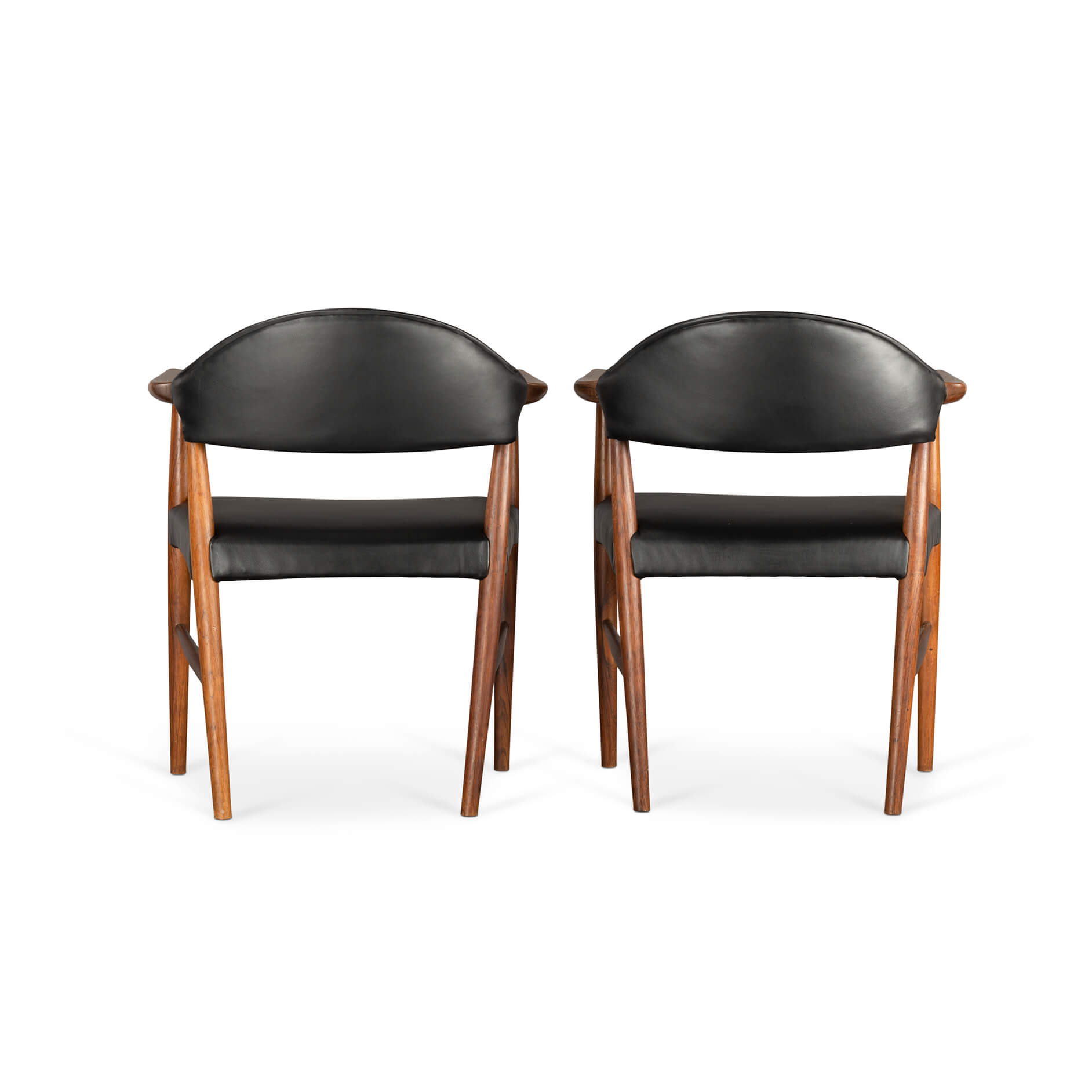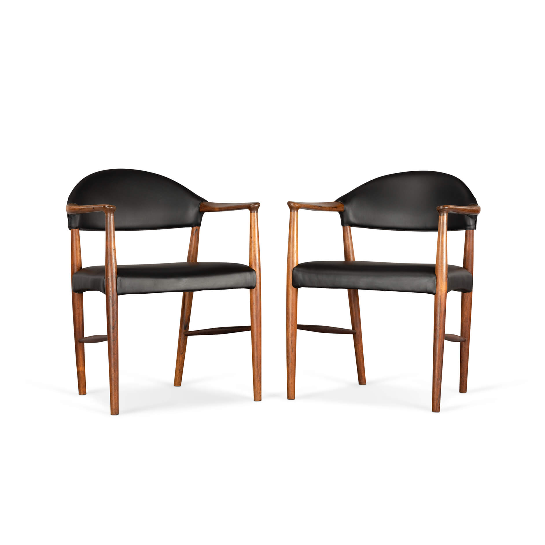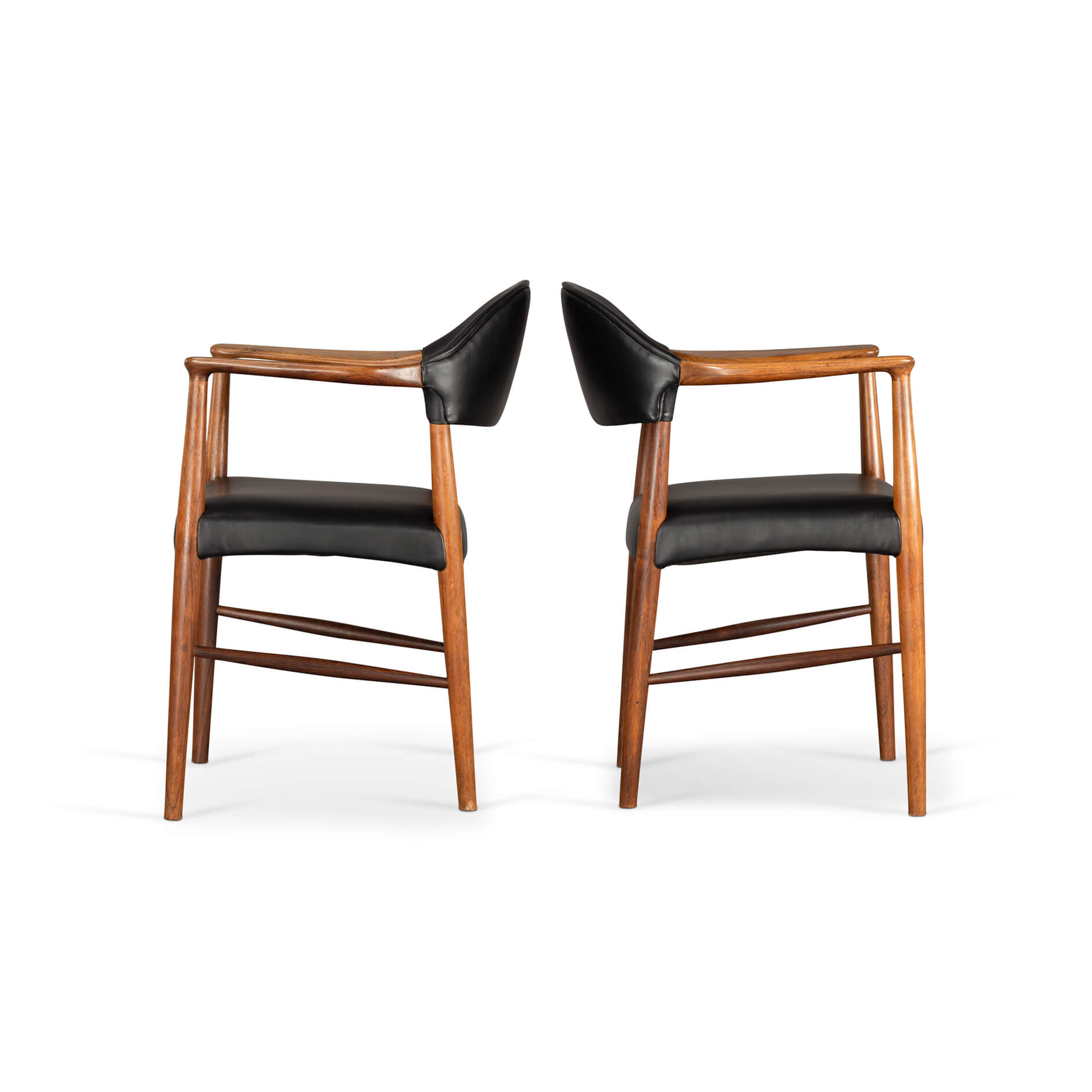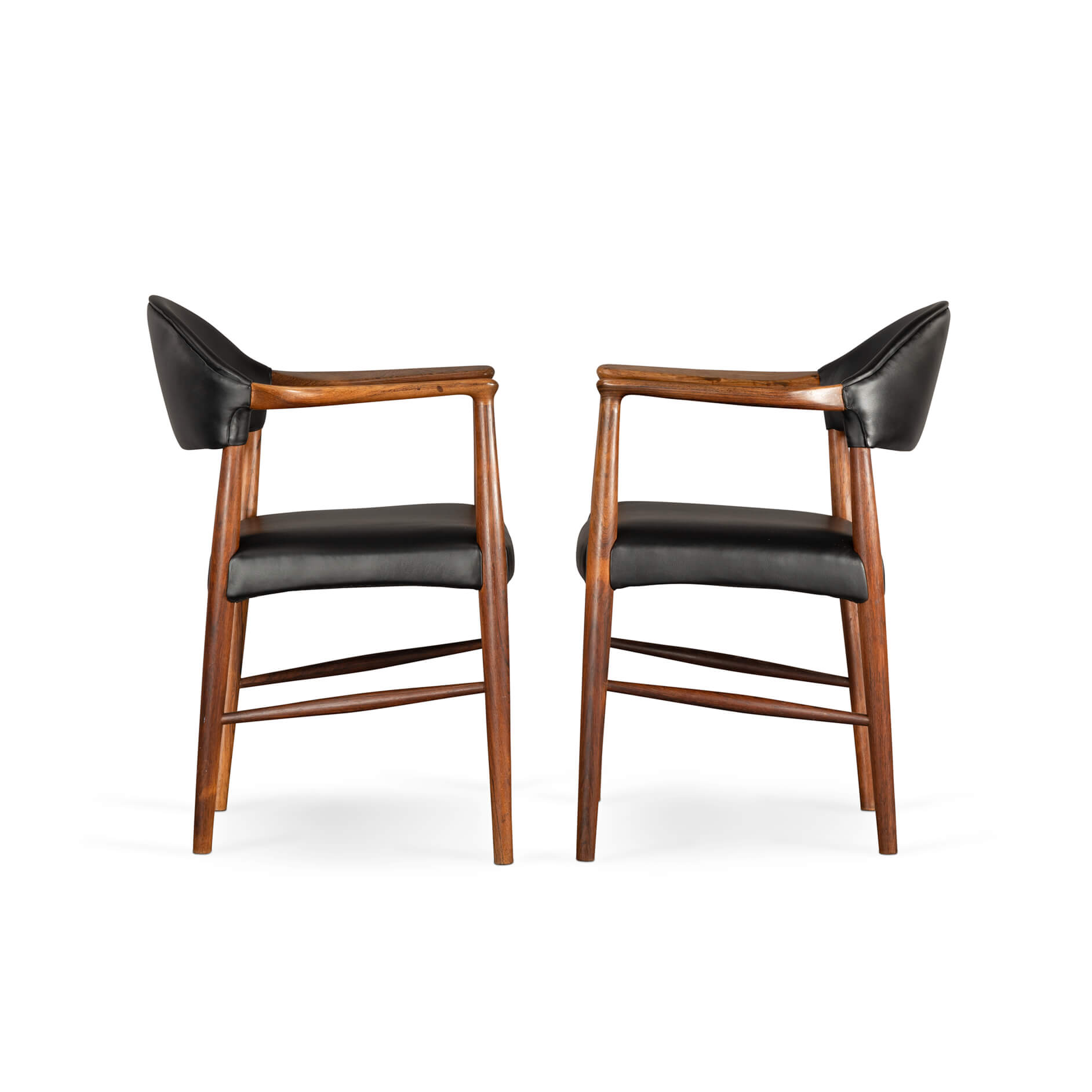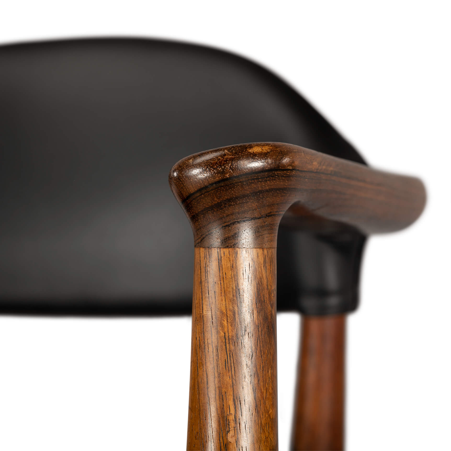 Kurt Olsen ontwierp deze robuuste stoel met palissander frame voor Slagelse Mobelvaerk. Het geleefde rozenhout van de armleuningen heeft juist de goede vintage slijtage. Het leer van de rug en zitting is opnieuw bekleed met echt zwart leer. De stoelen zijn gestoffeerd conform de originele leren bekleding. De verbinding onder de armleuning doet wat denken aan ‘the chair’ van Wegner. De twee stoelen worden enkel verkocht als set en zijn in uitstekende vintage staat.