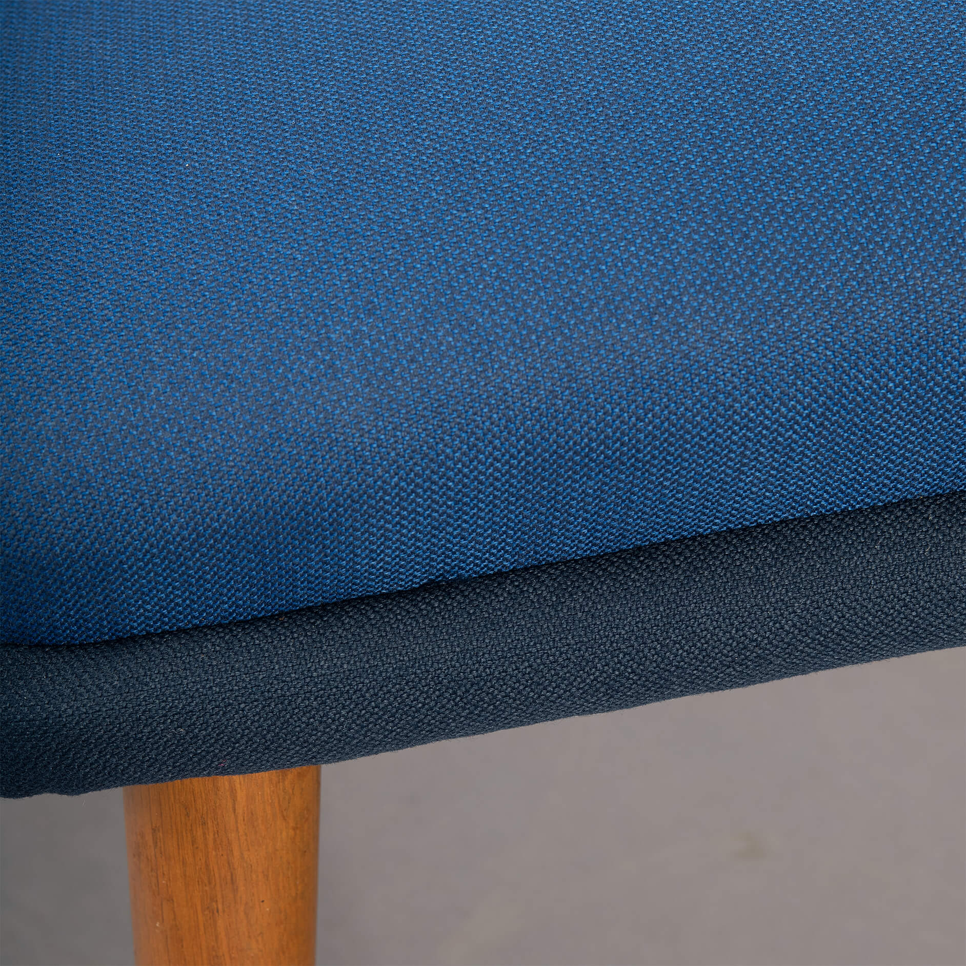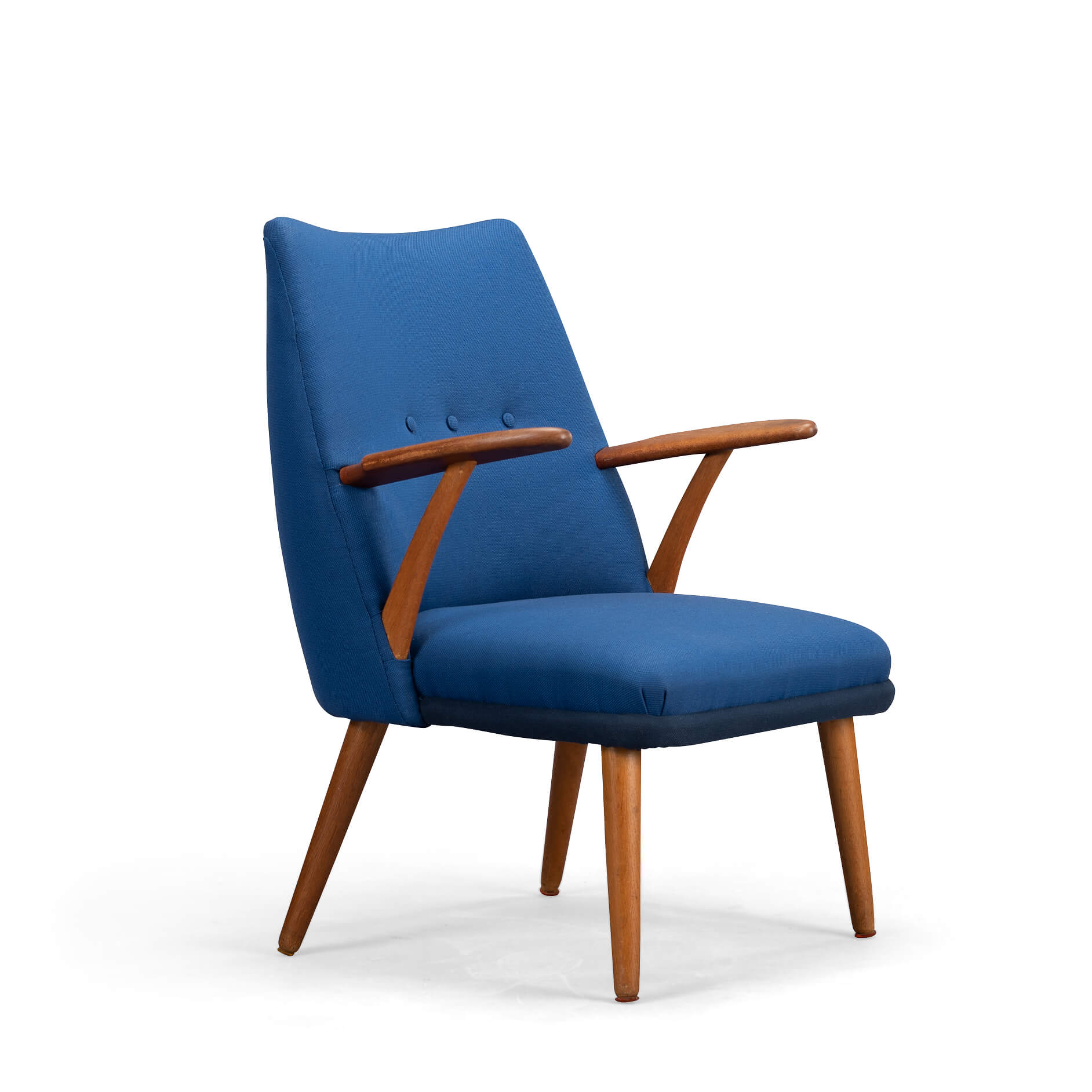 Trendy mid century cocktail stoel met armleuningen door een (helaas) voor ons onbekende Deense designer. We hebben de stoel professioneel laten herstofferen met een kwalitatief hoogwaardige De Ploeg stof in een medium en donkere blauw tint. De stoel heeft een stevige maar comfortabele zit die kenmerkend is voor deze stoelen. De onderkant van de stoel is gestoffeerd in de donkerdere stof en dat geeft een leuke twist. Het teak heeft minimale sporen van gebruik en tijd en deze zijn in lijn met de leeftijd van de stoel. De hernieuwde stoffering maakt de vintage conditie van de stoel zeer goed.