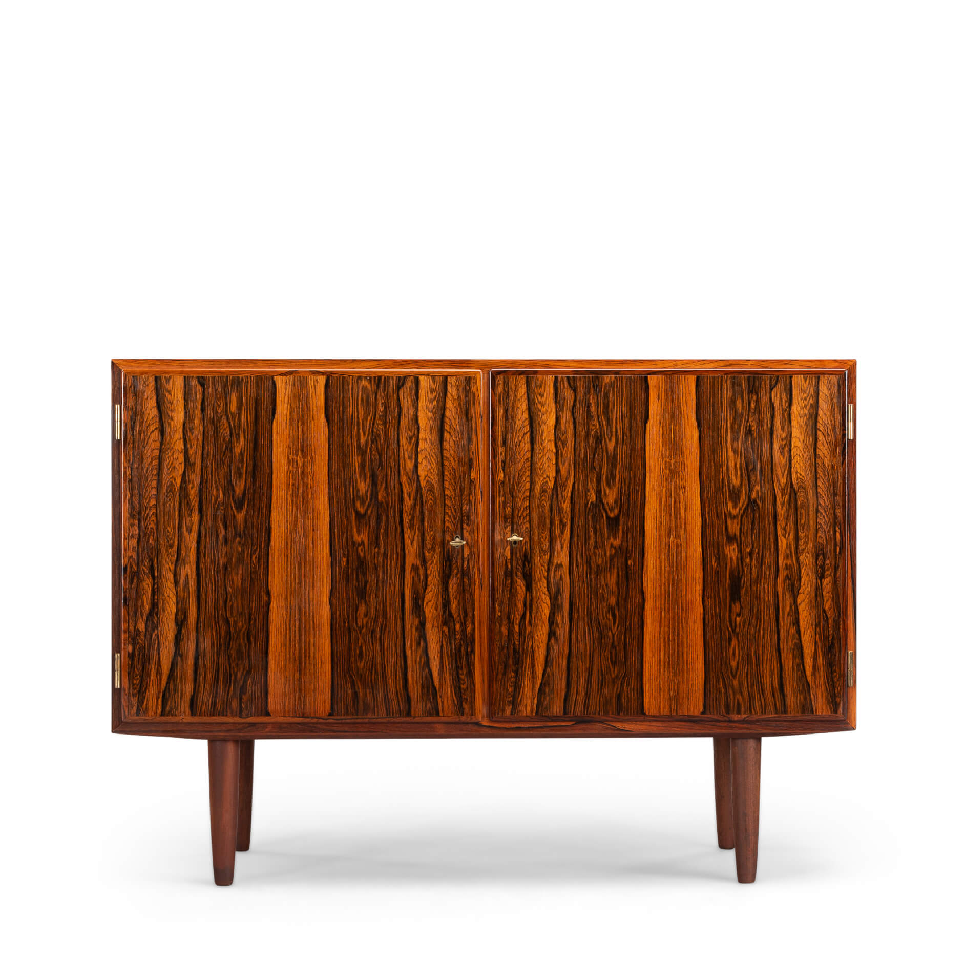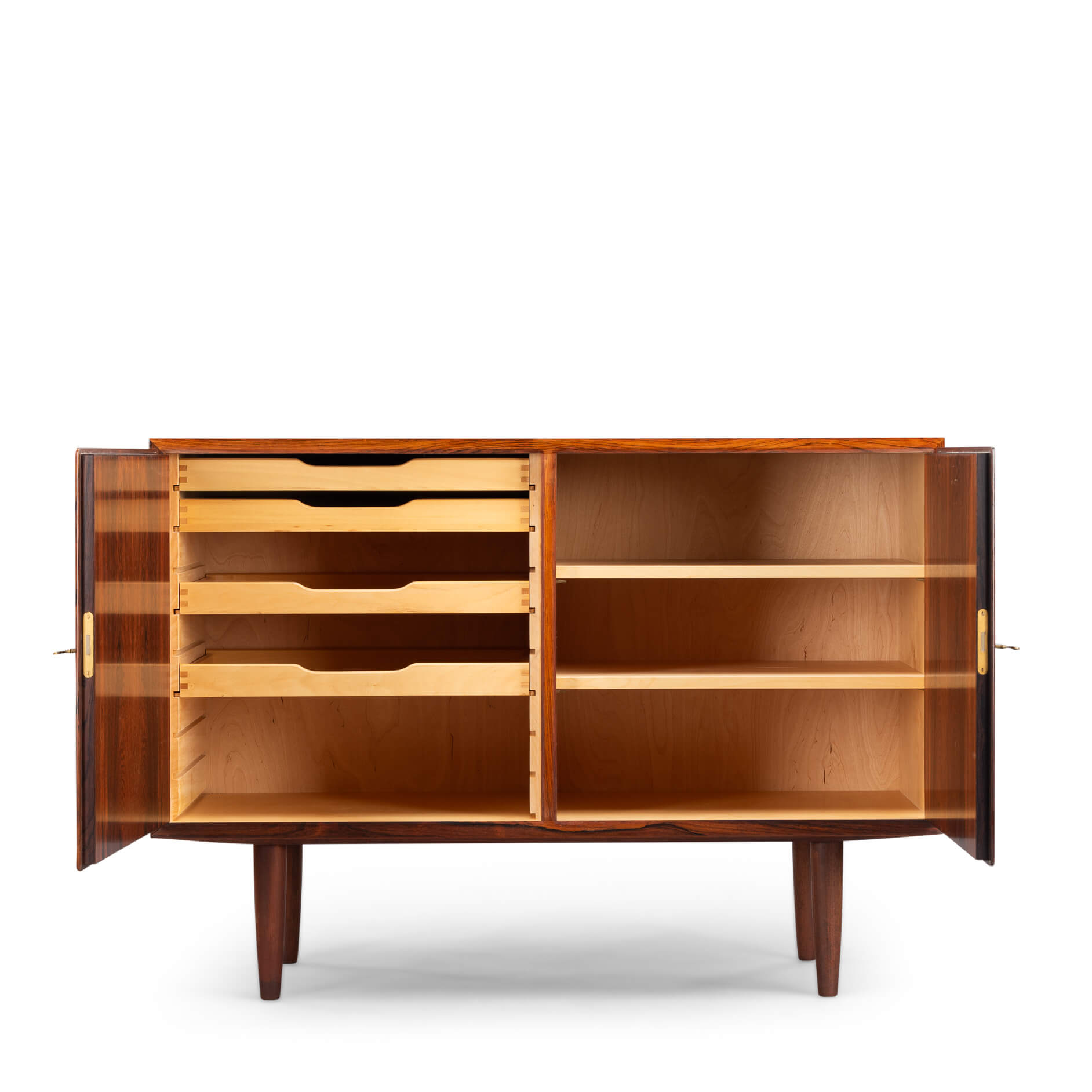 Een Carlo Jensen design geproduceerd door Hundevad & Co. Dit is een kast waar het ook om de finesse van constructie gaat. Zoals in de linkerhelft de in hoogte verplaatsbare schuiflades gemaakt van essenhout. Zodat je ook hogere items zoals glazen of flessen in dit kleine dressoir kunt plaatsen. Aan de rechterkant in de kast twee in hoogte verstelbare planken.