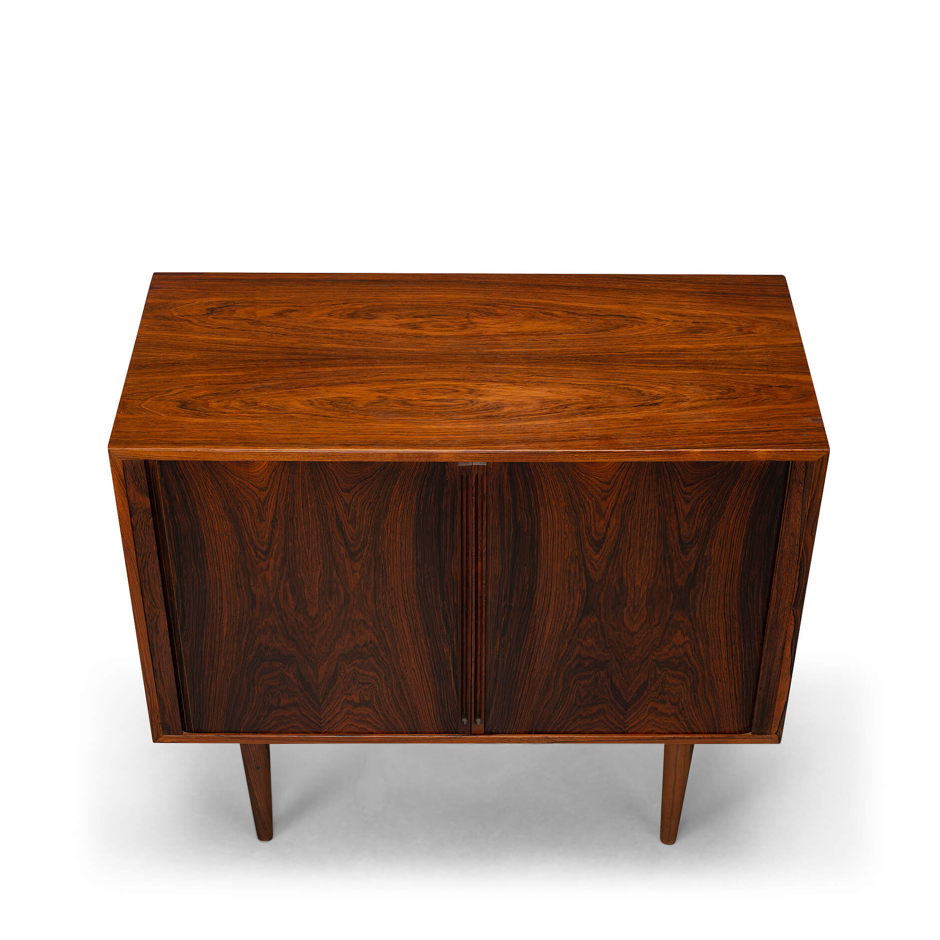 Klein palissander dressoir met mooie tambour deuren. Deense design tambour deuren zijn een opvallend kenmerk in Scandinavisch mid century modern meubeldesign. Jaloeziedeuren worden gekenmerkt door een reeks houten latten of smalle stroken die met elkaar zijn verbonden door flexibele scharnieren, waardoor ze soepel langs een rail kunnen glijden en bij het openen in de zijkanten of bovenkant van een kast of opbergeenheid kunnen verdwijnen. Het ontwerp van jaloeziedeuren biedt verschillende voordelen. Ten eerste zorgen ze voor een strak en naadloos uiterlijk, omdat de deuren niet openzwaaien en de algehele esthetiek van het stuk verstoren. Ten tweede besparen ze ruimte omdat ze geen extra vrije ruimte nodig hebben om open te zwaaien. Dit maakt ze bijzonder geschikt voor compacte woonruimtes.