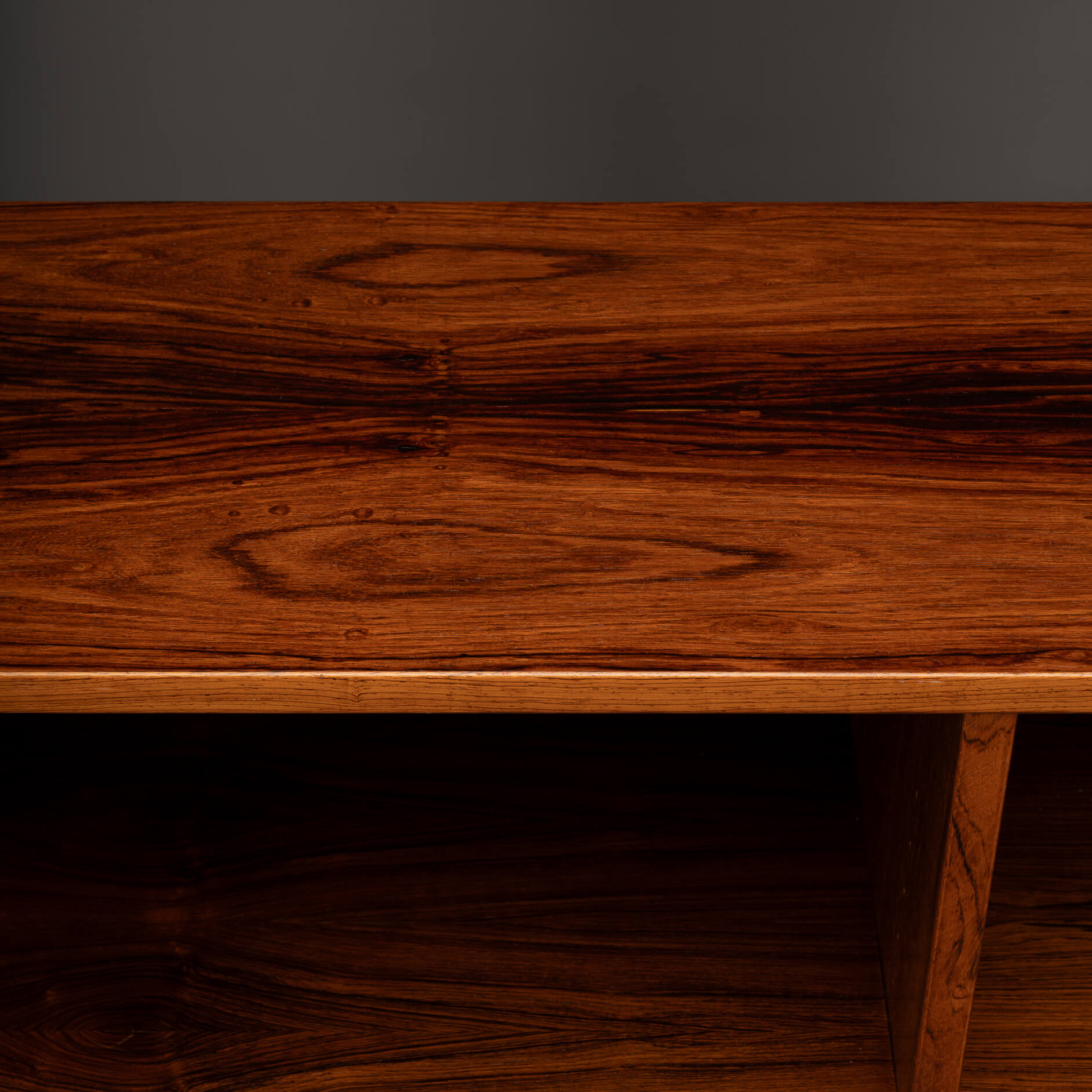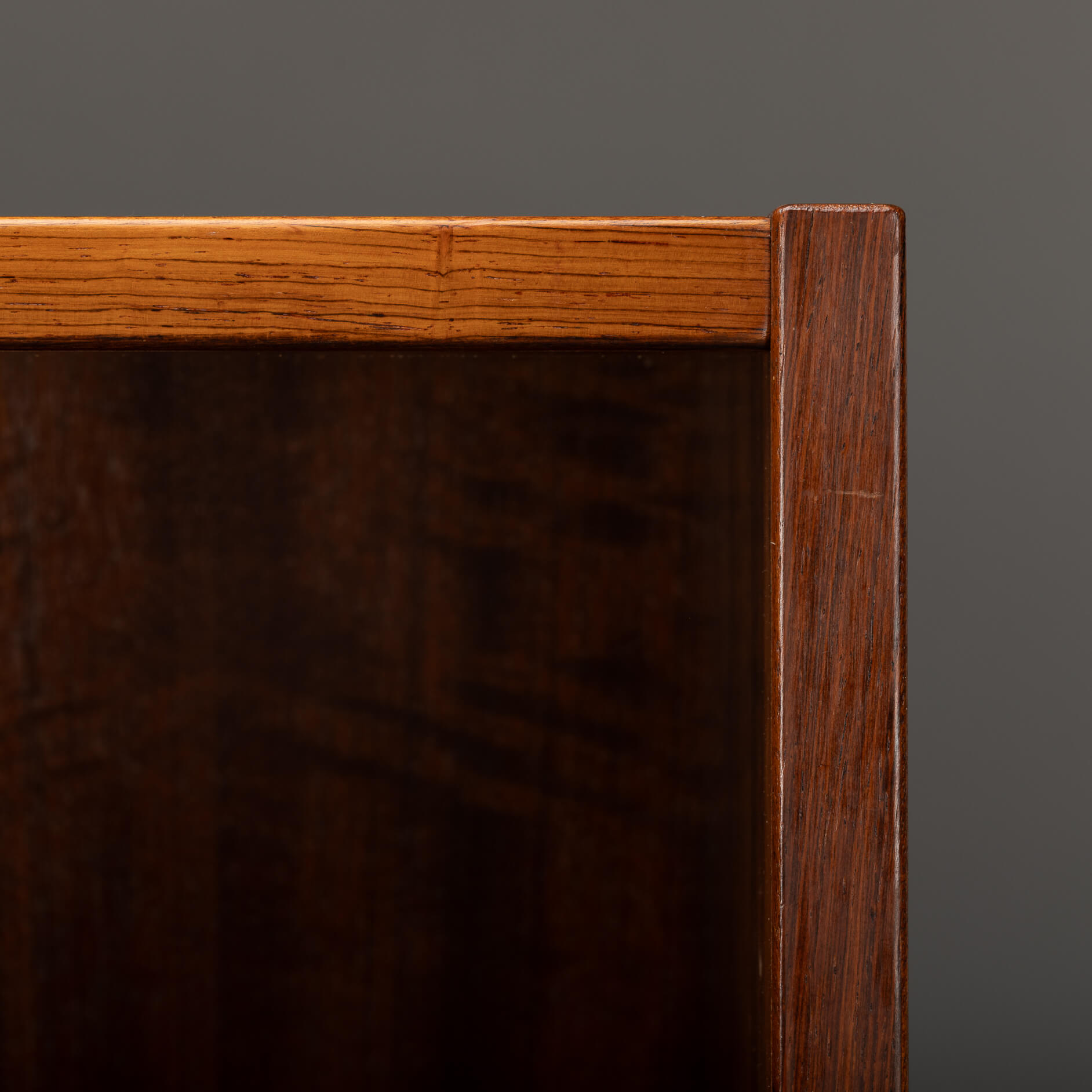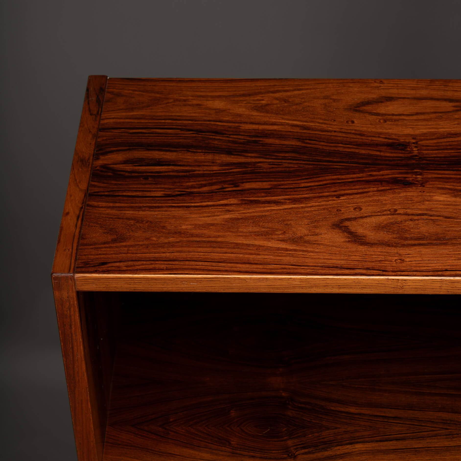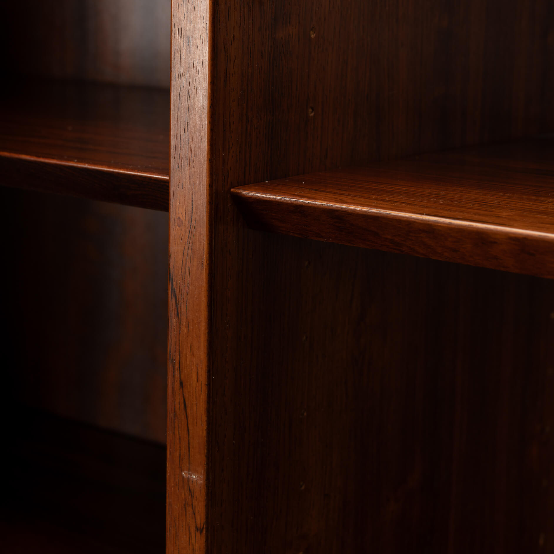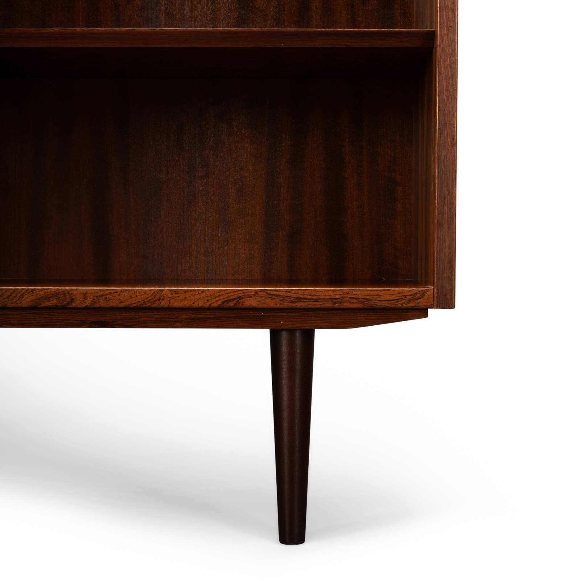 De kast beschikt over zes in hoogte verstelbare planken, dus of je nu een flinke boekenverzameling hebt, mooie objecten wilt tentoonstellen of eindelijk een plek zoekt voor die ene designvaas – het past allemaal. Praktisch én stijlvol, precies zoals de Denen het bedoelden. De kwaliteit van het hout, de strakke lijnen en de solide constructie getuigen duidelijk van hoogwaardig Deens vakmanschap uit de bloeiperiode van het mid-century design, uitgevoerd door Hundevad & Co. De afgeschuinde planken zijn het kenmerk van een Hundevad.
