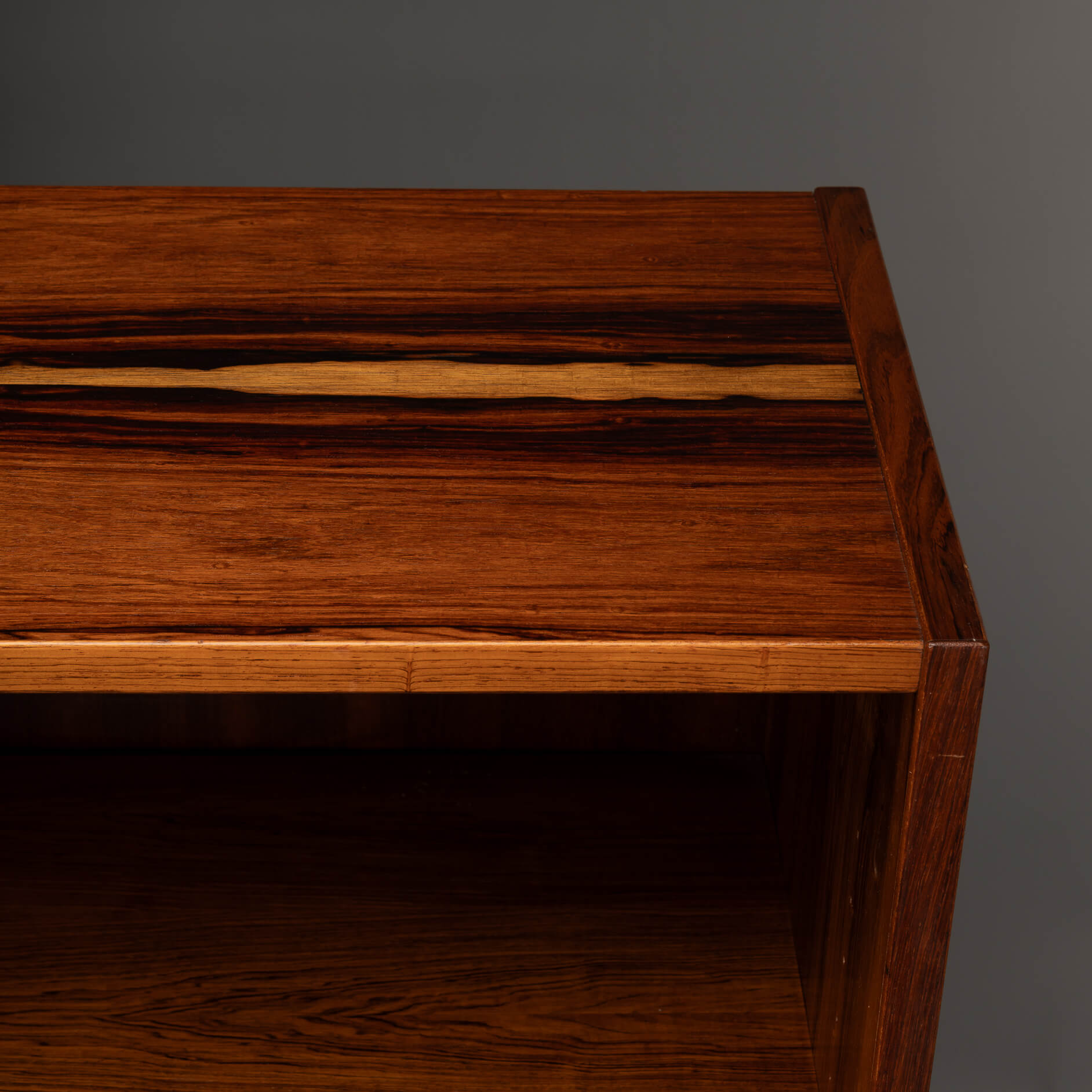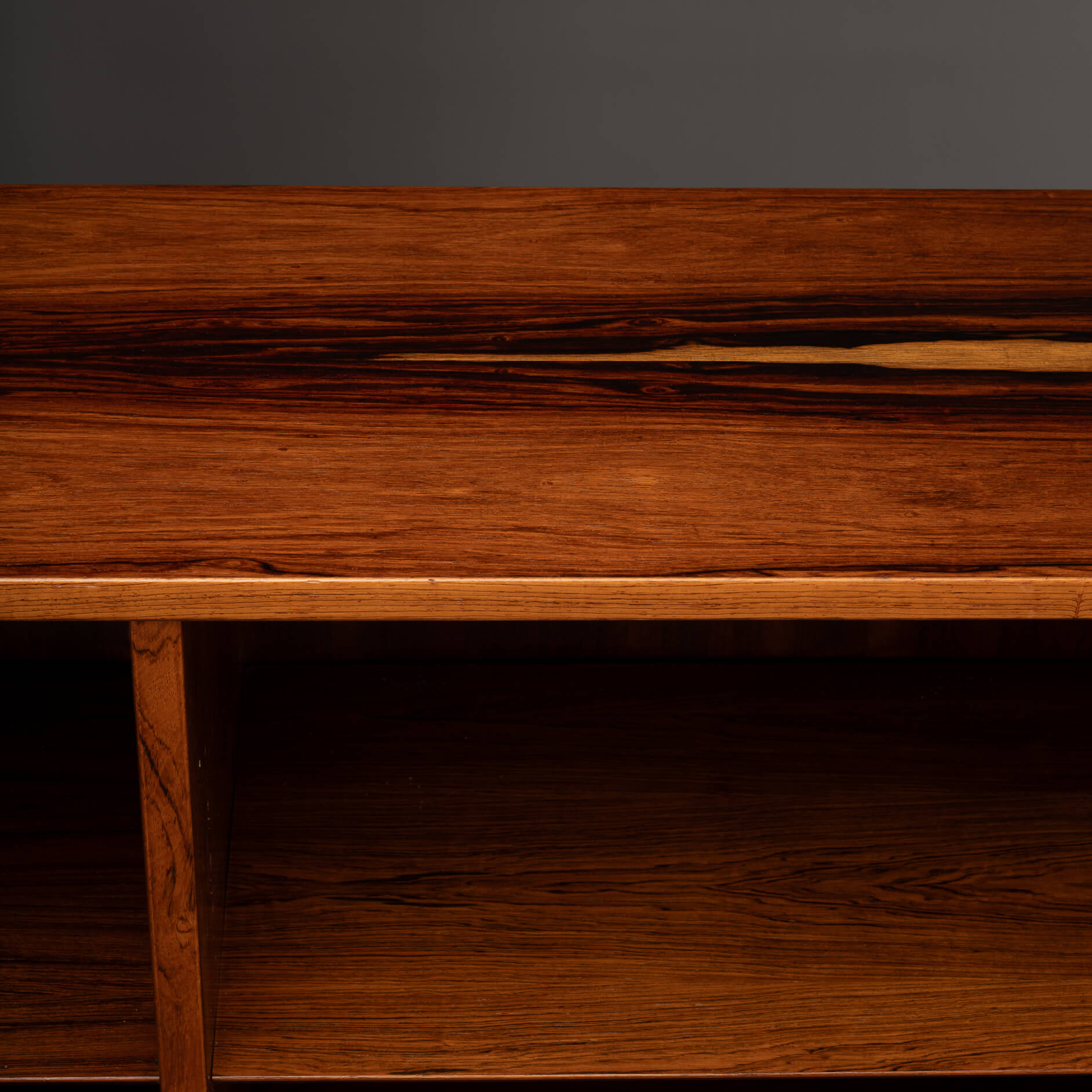 Deze knappe Deense boekenkast uit de Mid-Century Modern periode laat precies zien waarom Scandinavisch design zo geliefd is. Uitgevoerd in prachtig palissanderhout met een diepe kleur en een levendige houttekening waar je bijna in kunt verdwalen.