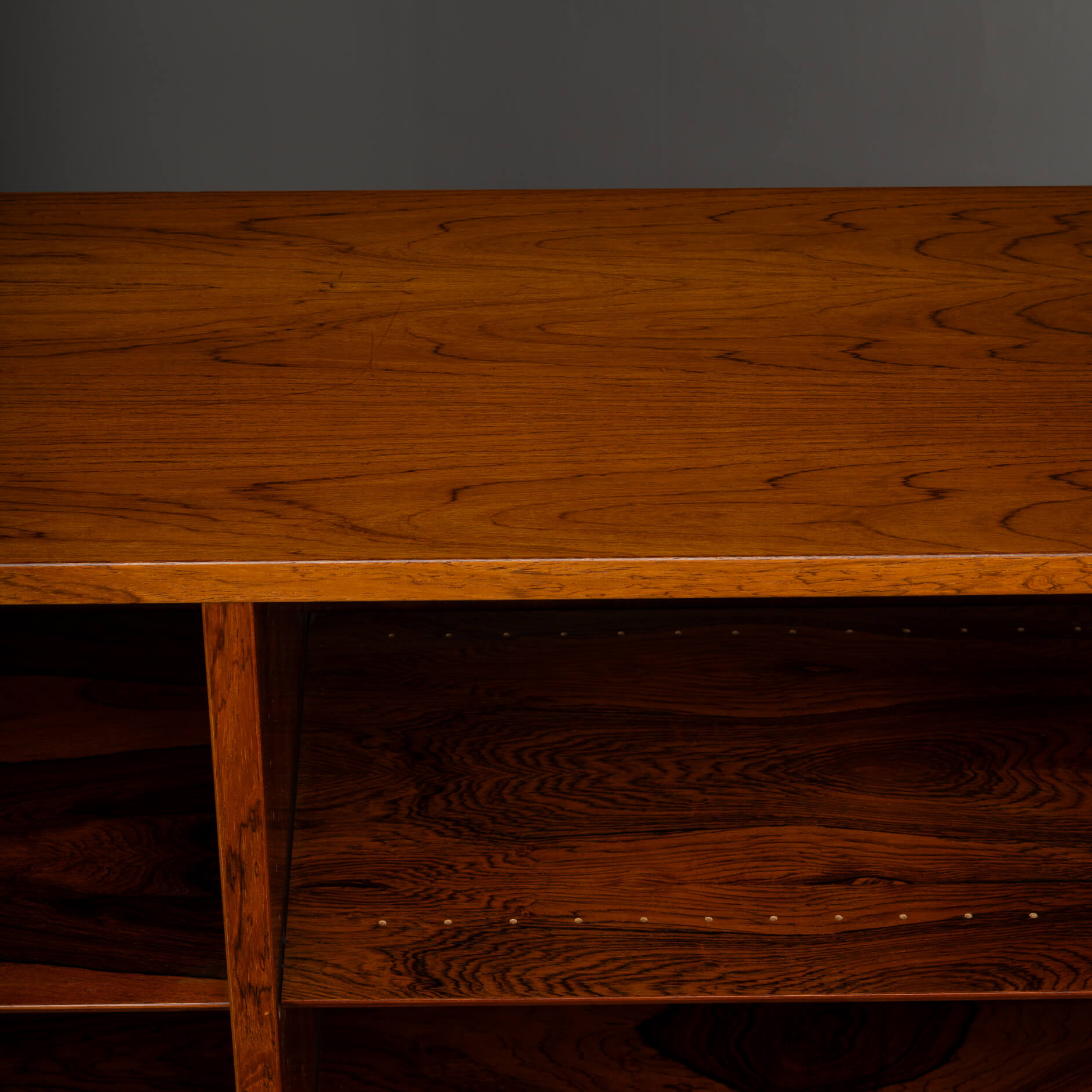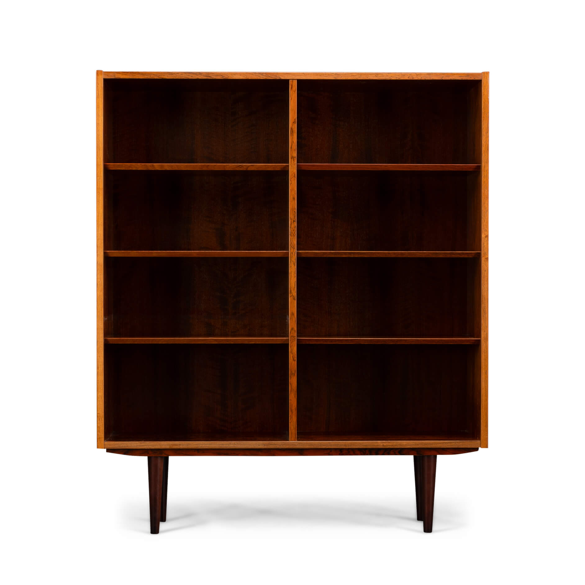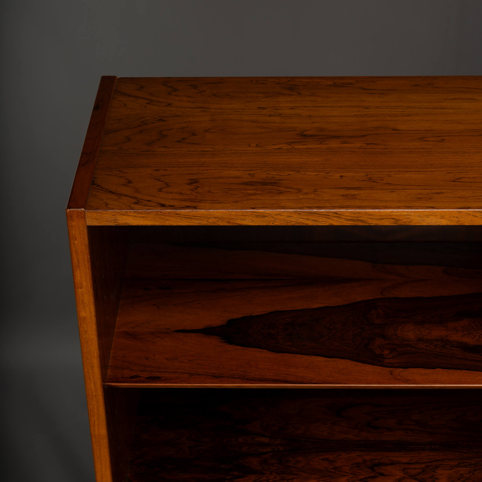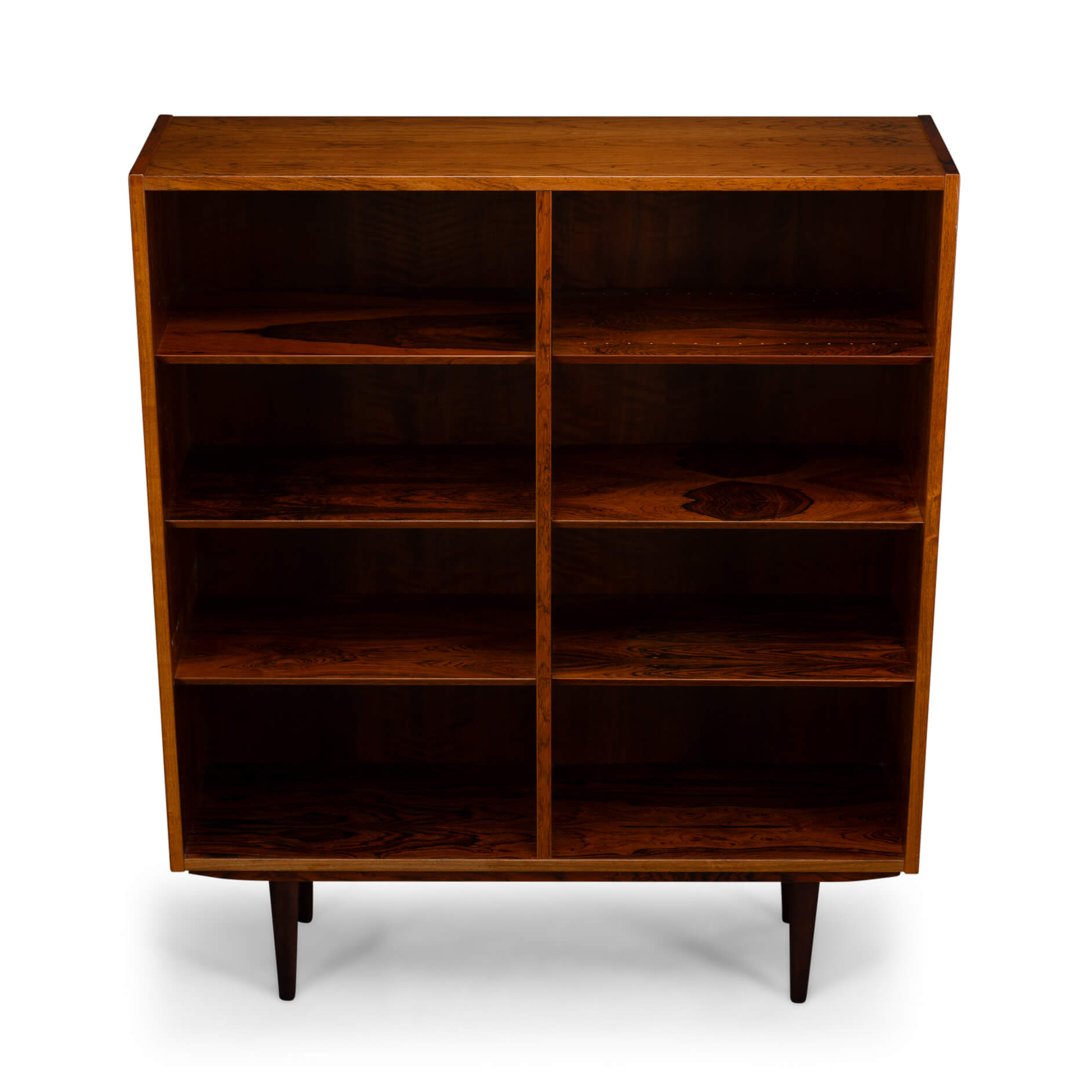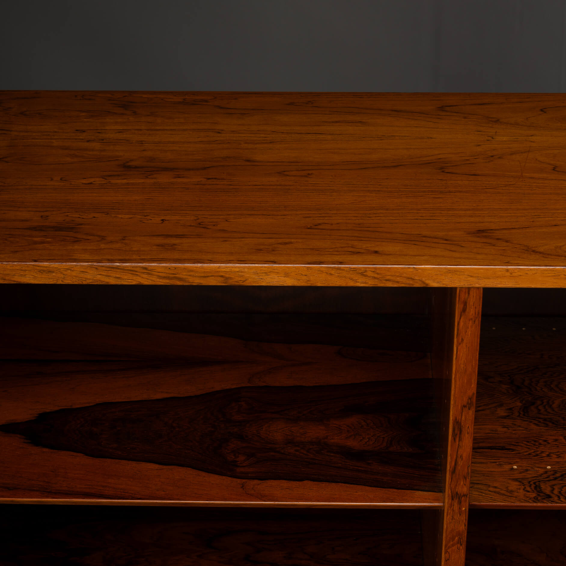 Deze knappe Deense boekenkast uit de Mid-Century Modern periode laat precies zien waarom Scandinavisch design zo geliefd is. Uitgevoerd in prachtig palissanderhout met een diepe kleur en een levendige houttekening waar je bijna in kunt verdwalen.