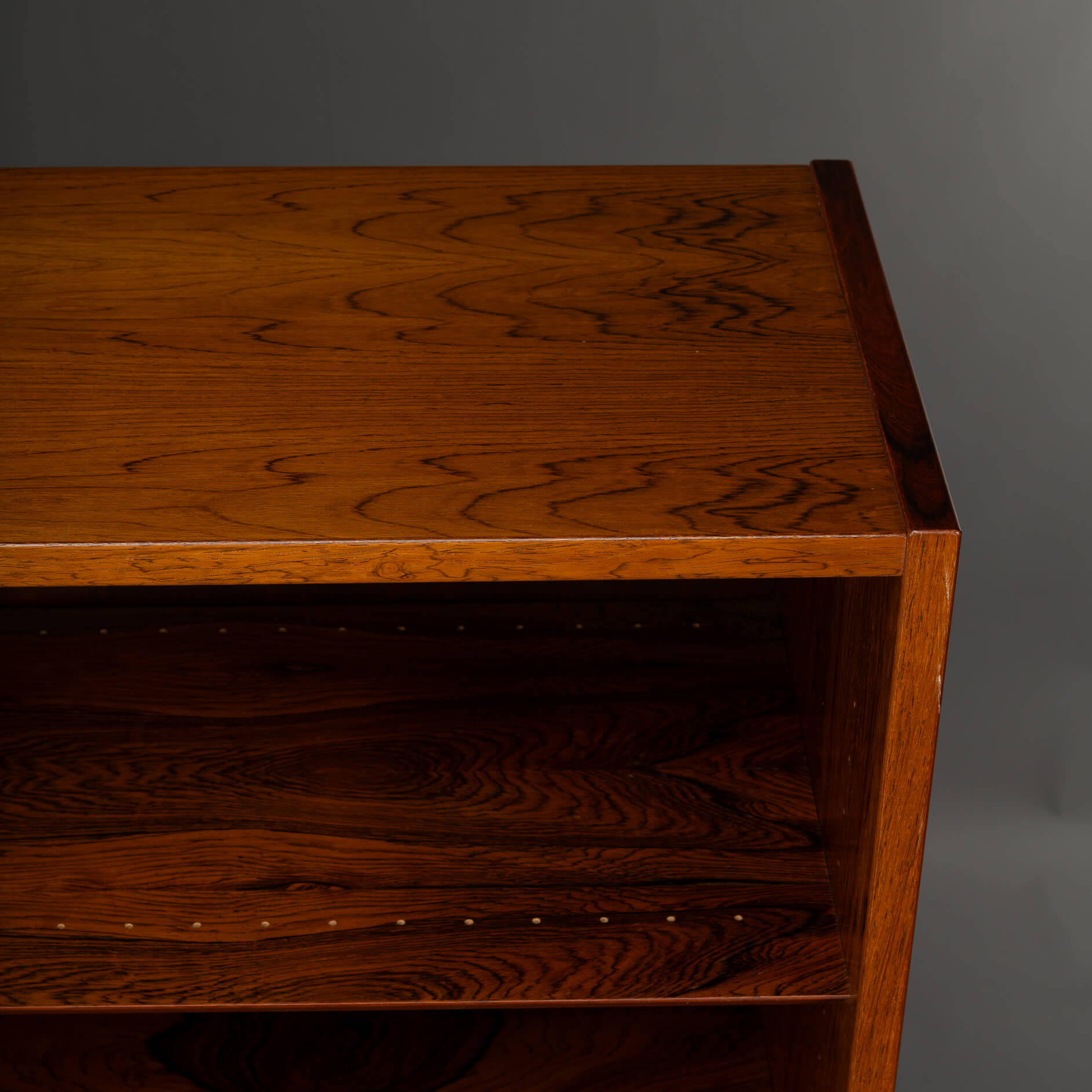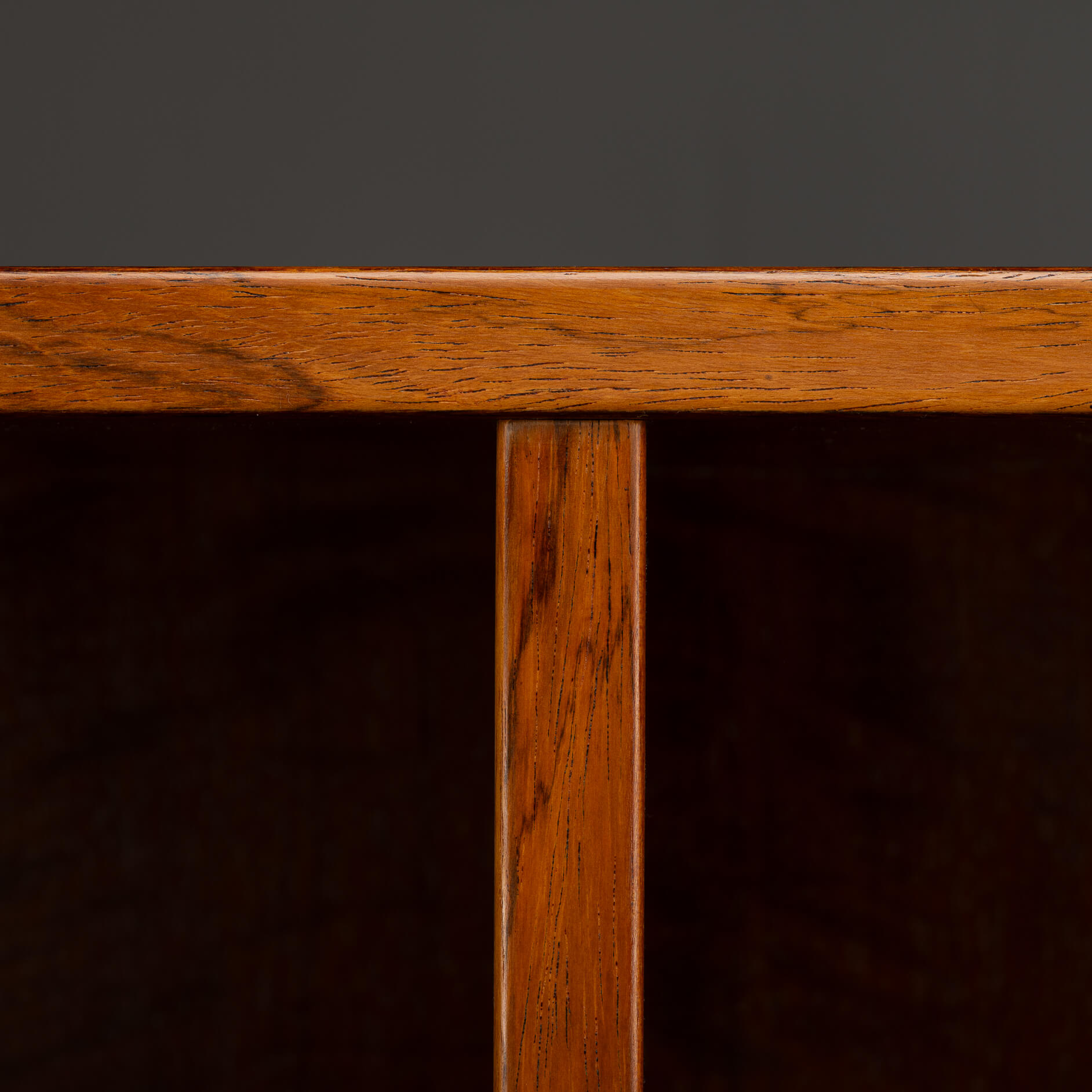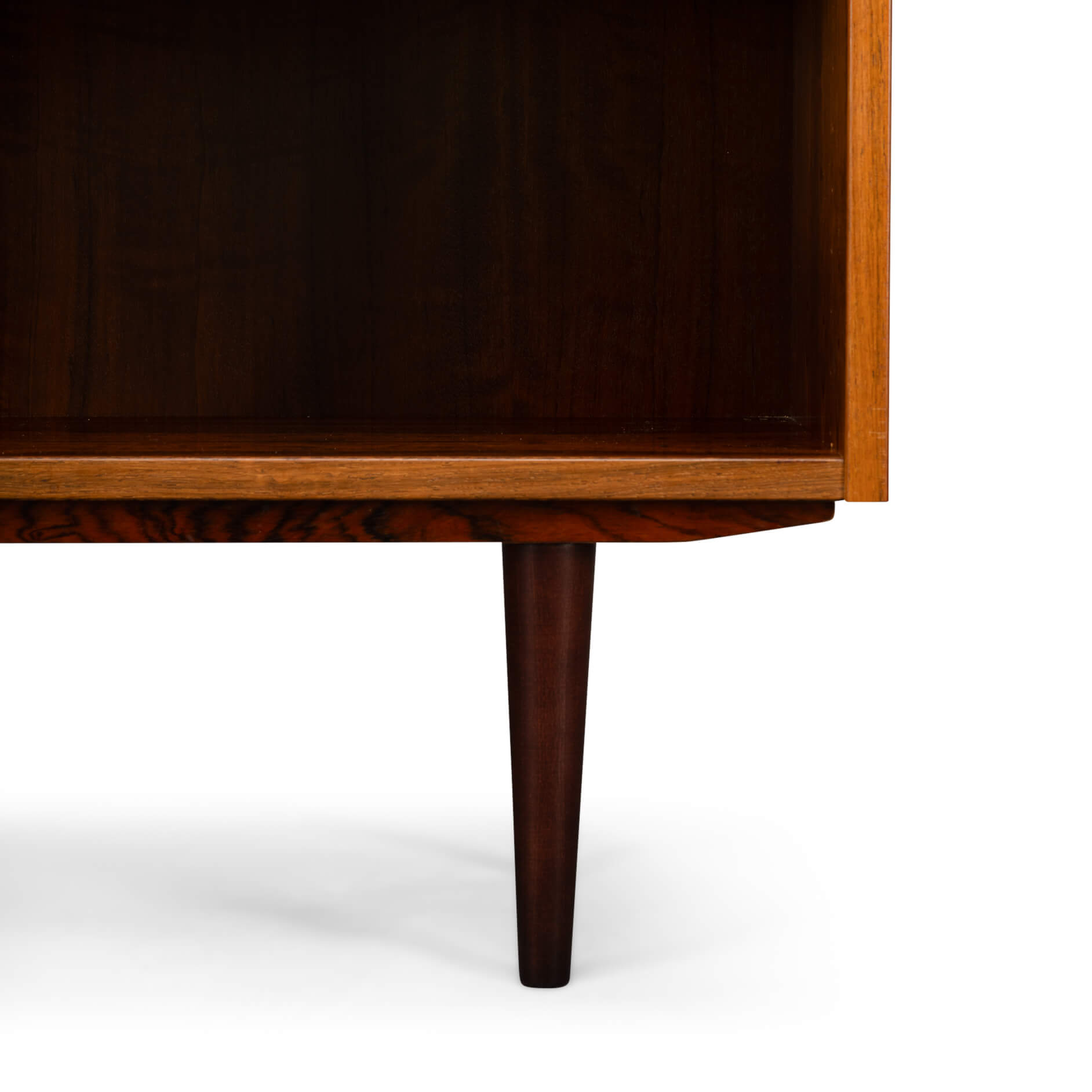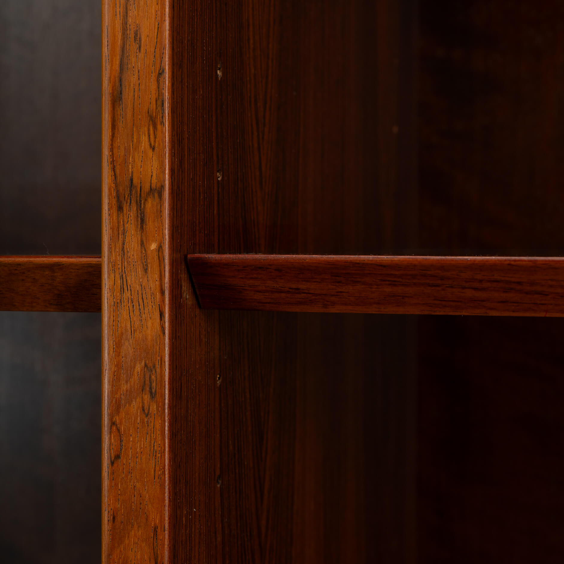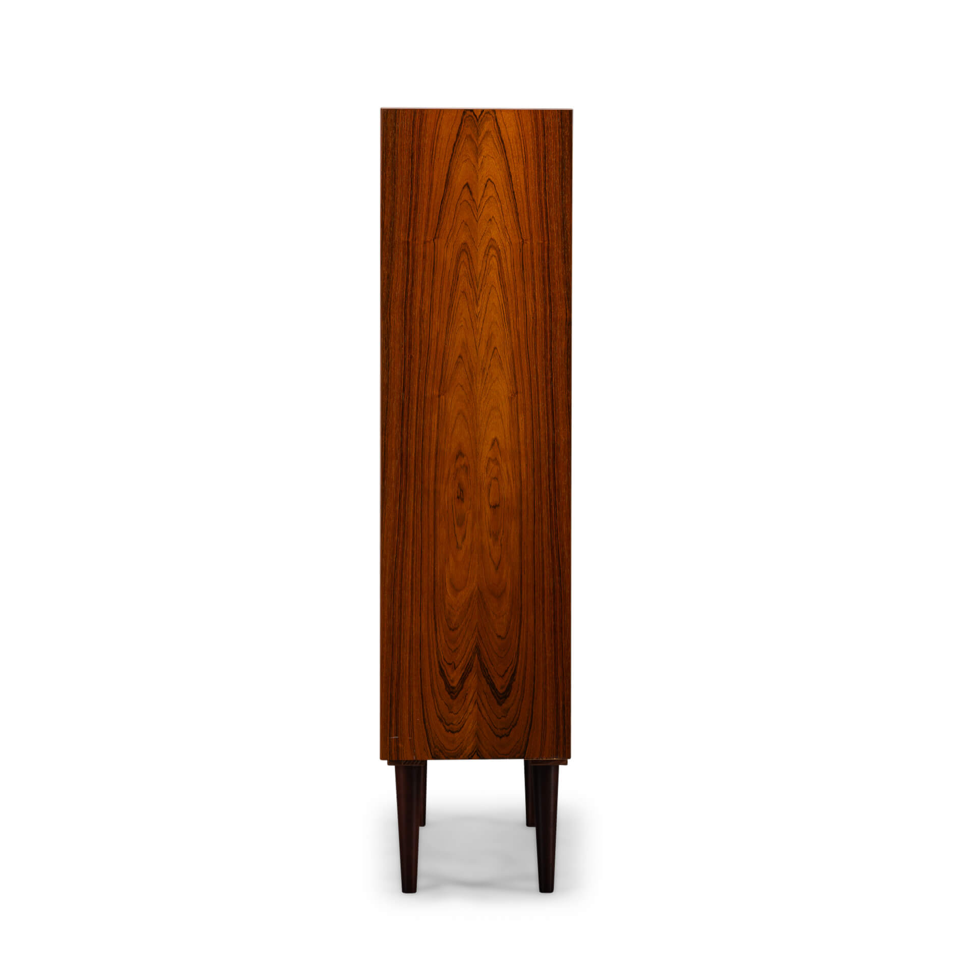 De kast beschikt over zes in hoogte verstelbare planken, dus of je nu een flinke boekenverzameling hebt, mooie objecten wilt tentoonstellen of eindelijk een plek zoekt voor die ene designvaas – het past allemaal. Praktisch én stijlvol, precies zoals de Denen het bedoelden. De kwaliteit van het hout, de strakke lijnen en de solide constructie getuigen duidelijk van hoogwaardig Deens vakmanschap uit de bloeiperiode van het mid-century design, uitgevoerd door Hundevad & Co. De afgeschuinde planken zijn het kenmerk van een Hundevad.