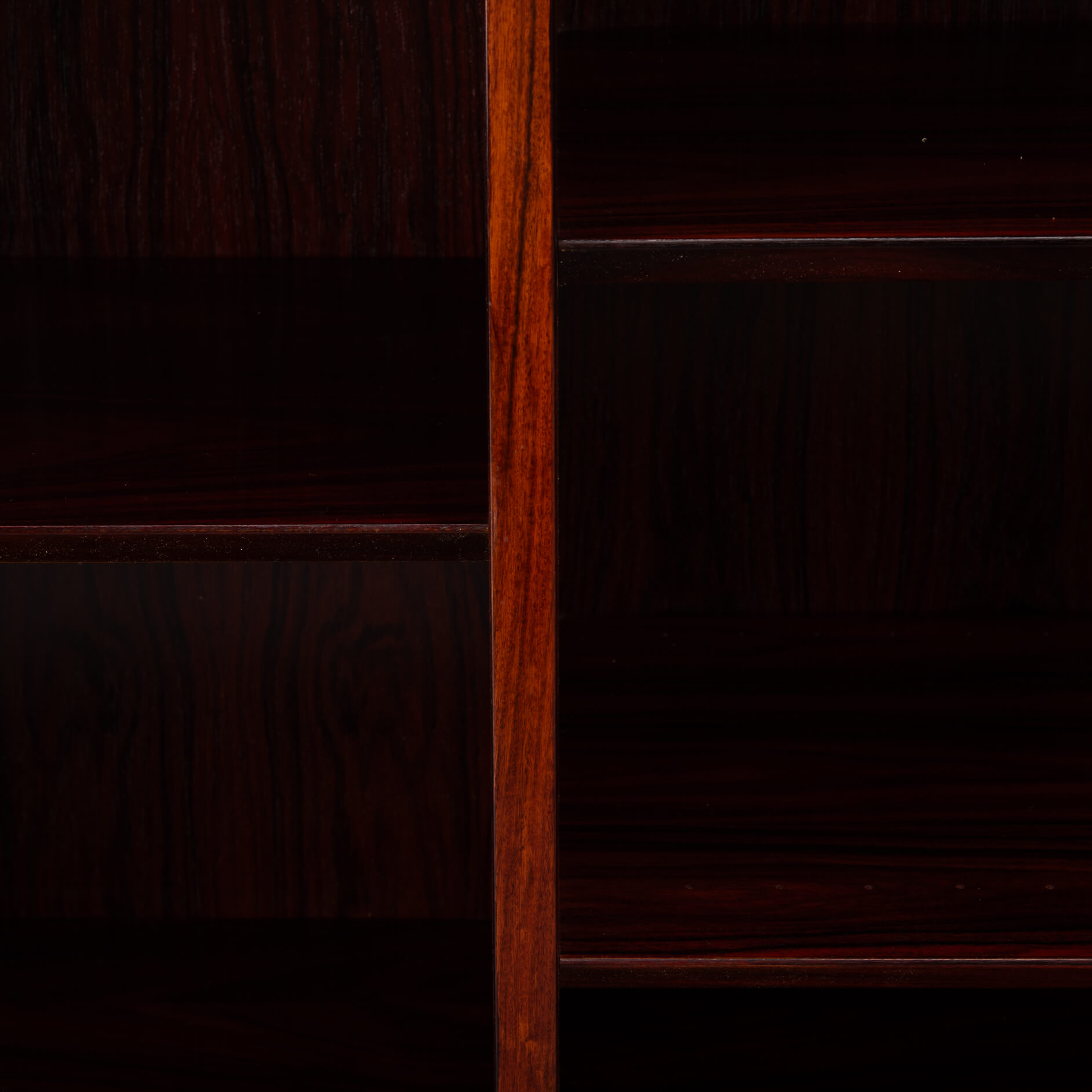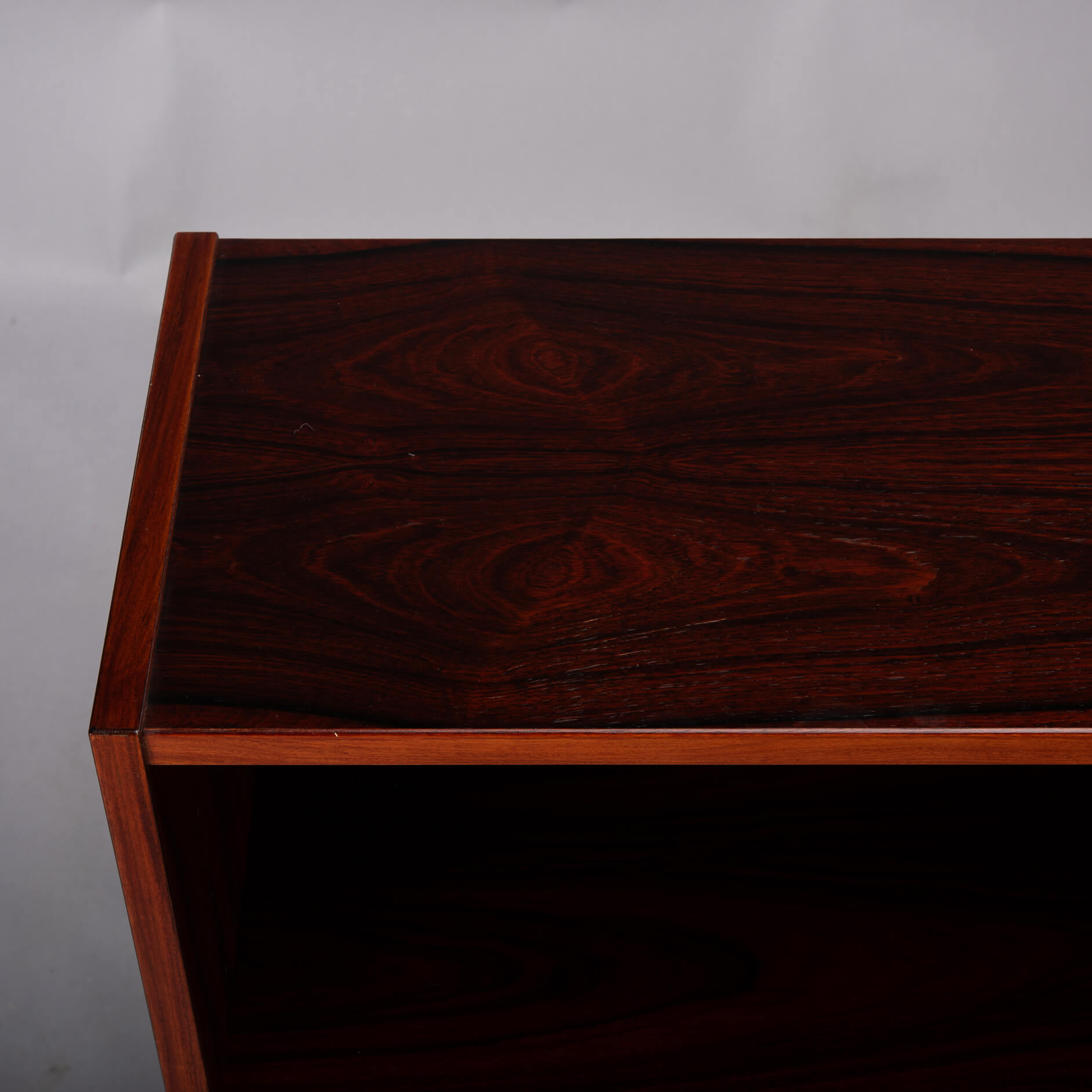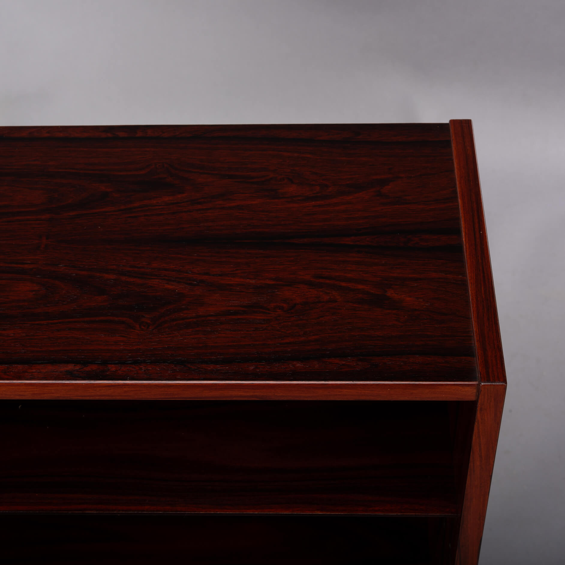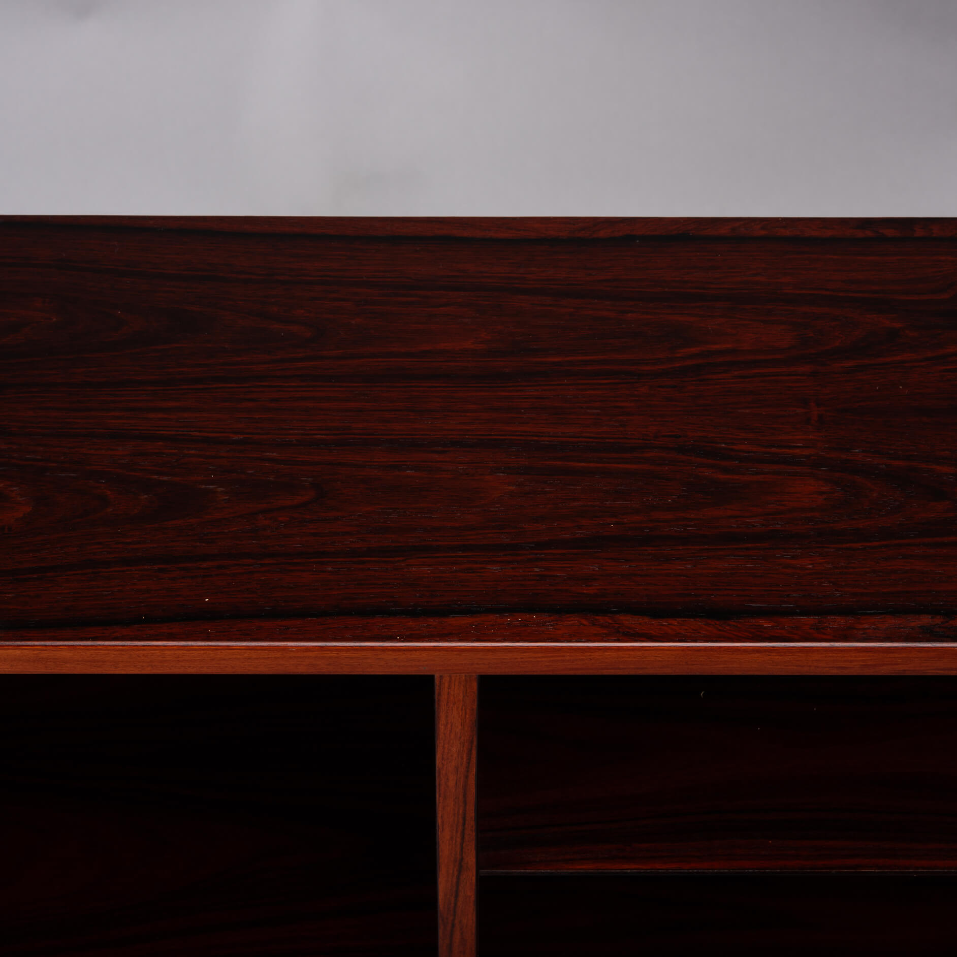 Deense lage boekenkast in prachtig palissander fineer. De kast is ontworpen door Carlo Jensen en gemaakt door Hundevad & Co. De sticker zit nog op de achterkant. Overigens is een Hundevad boekenkast is altijd te herkennen aan de planken die afgeschuind zijn.