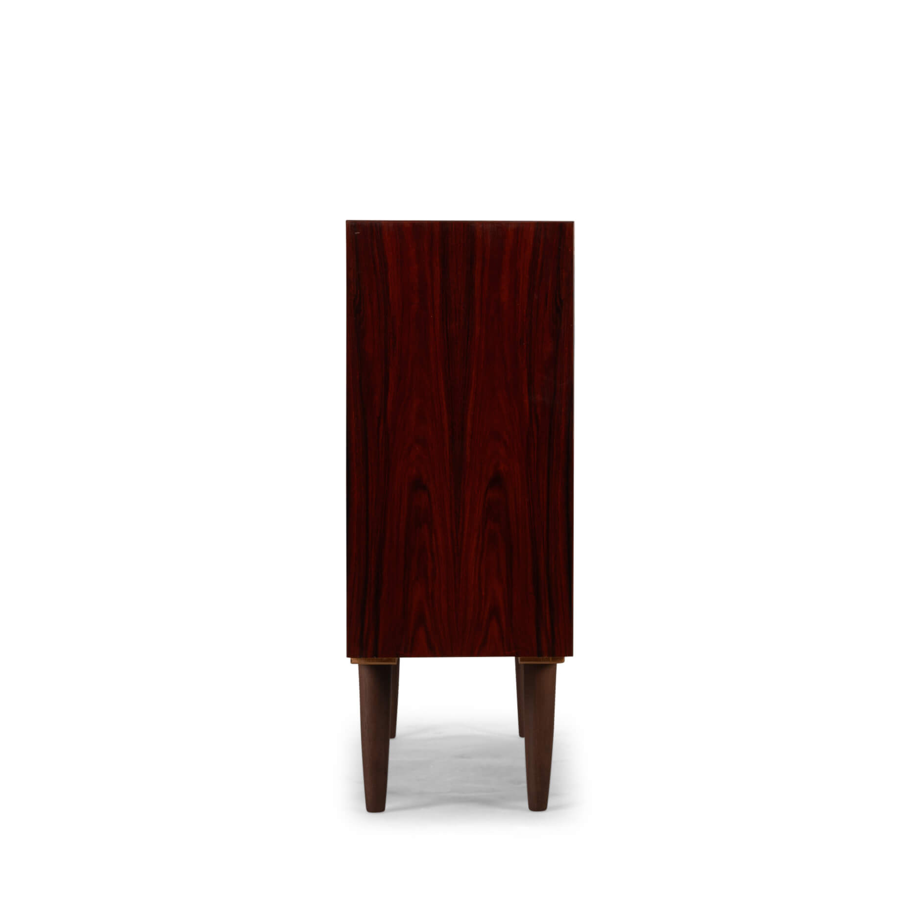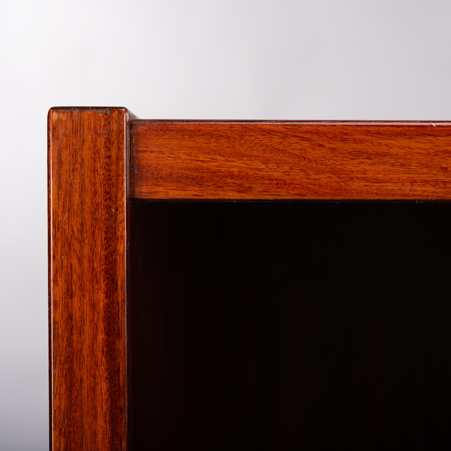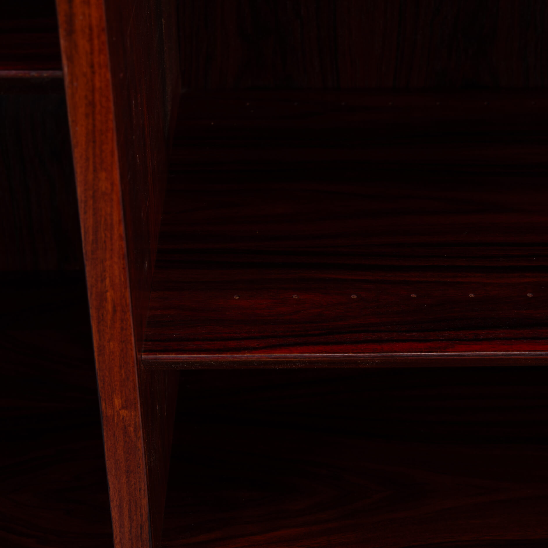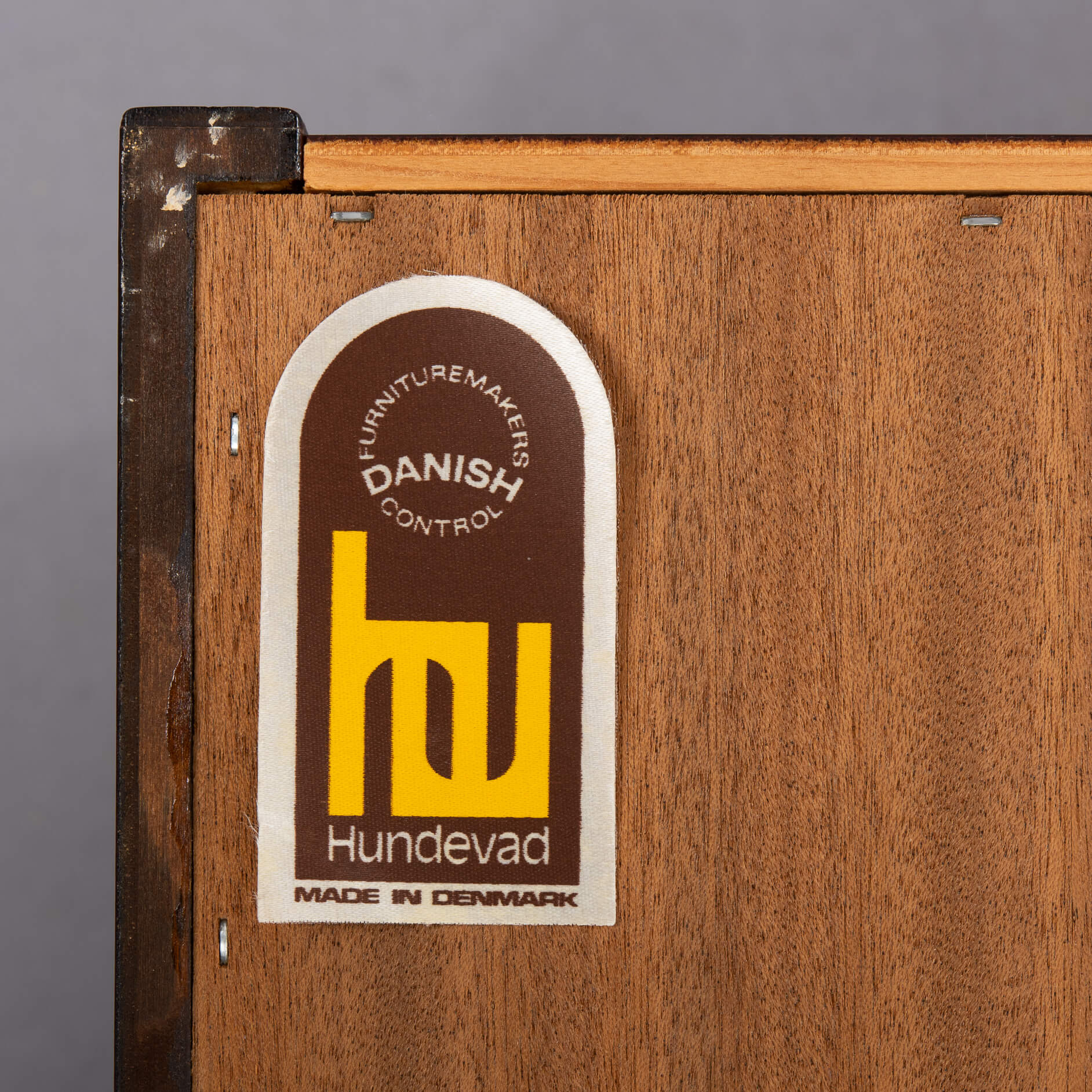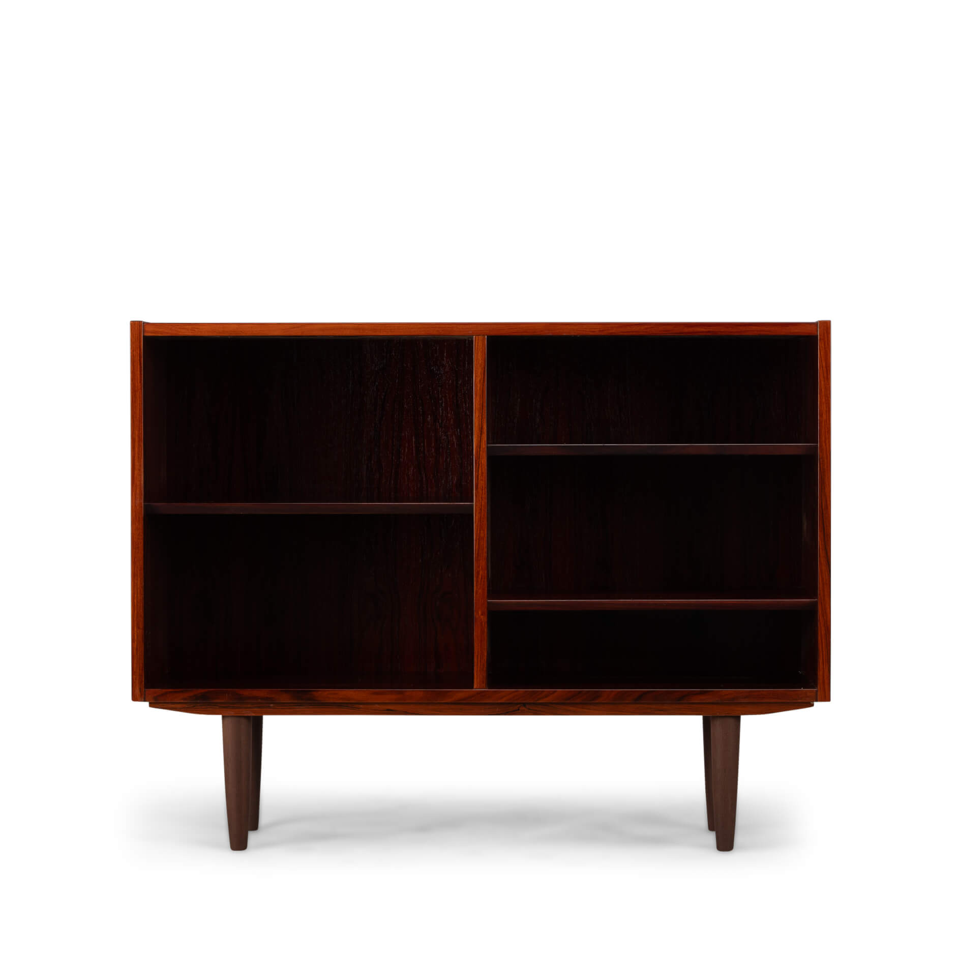 Deense lage boekenkast in prachtig palissander fineer. De kast is ontworpen door Carlo Jensen en gemaakt door Hundevad & Co. De sticker zit nog op de achterkant. Overigens is een Hundevad boekenkast is altijd te herkennen aan de planken die afgeschuind zijn.