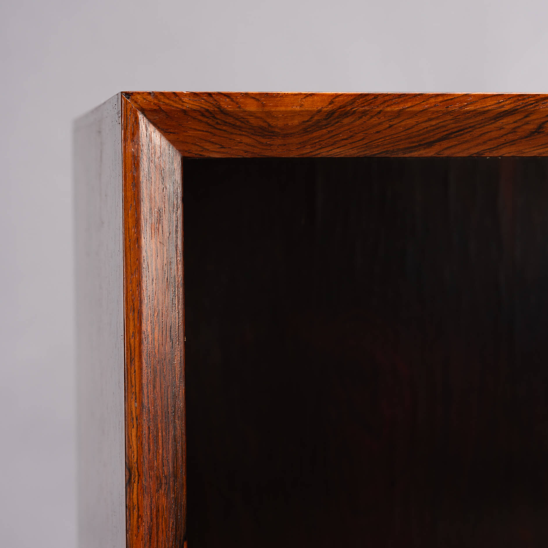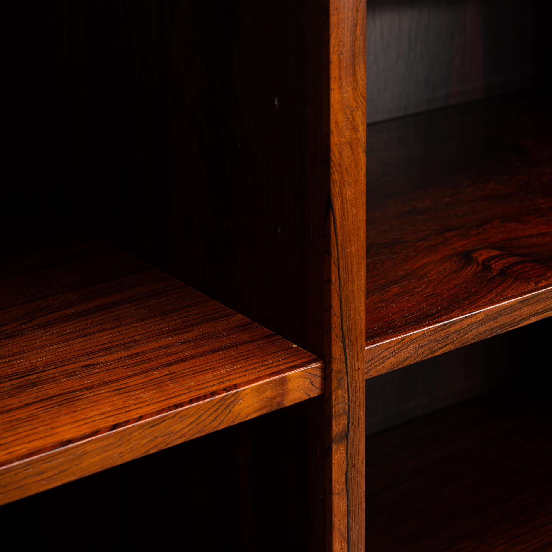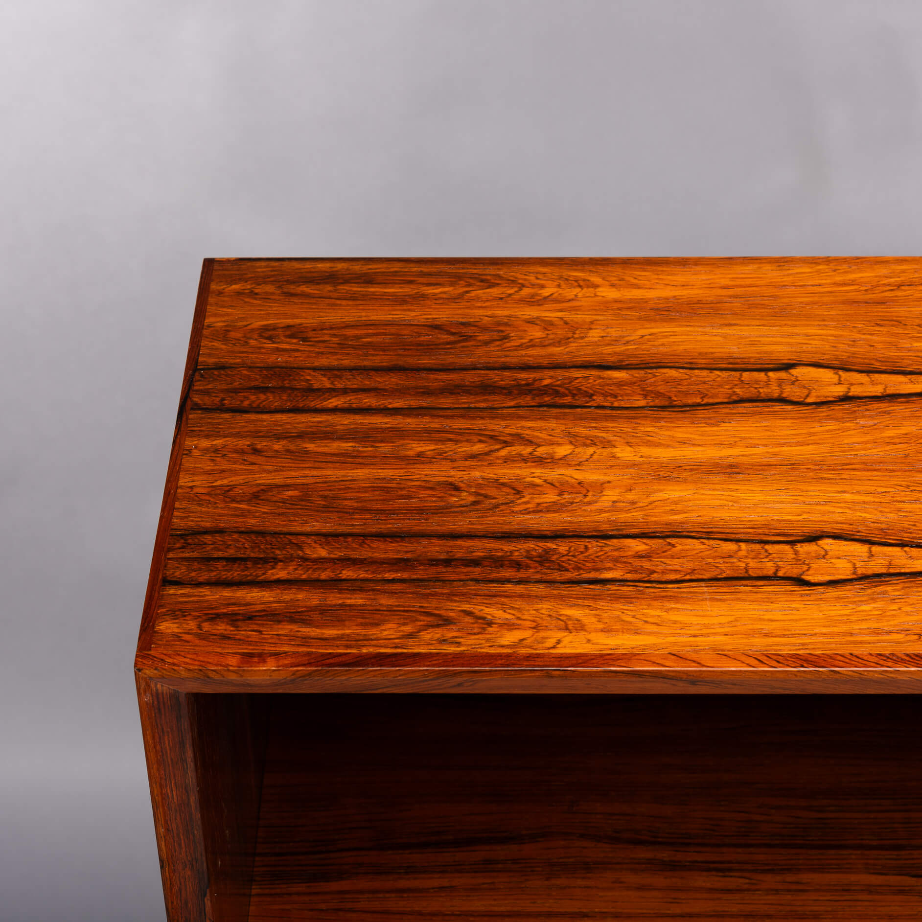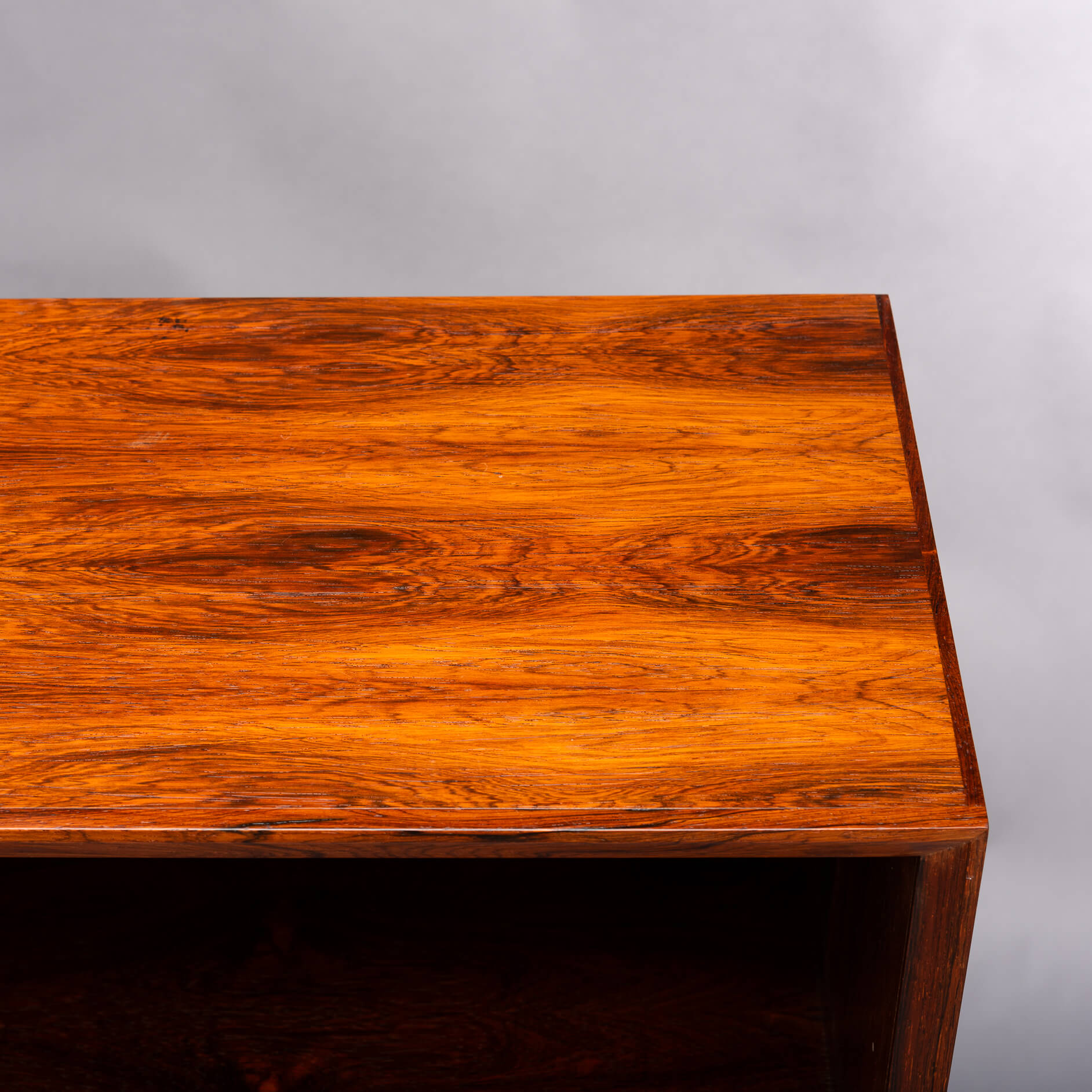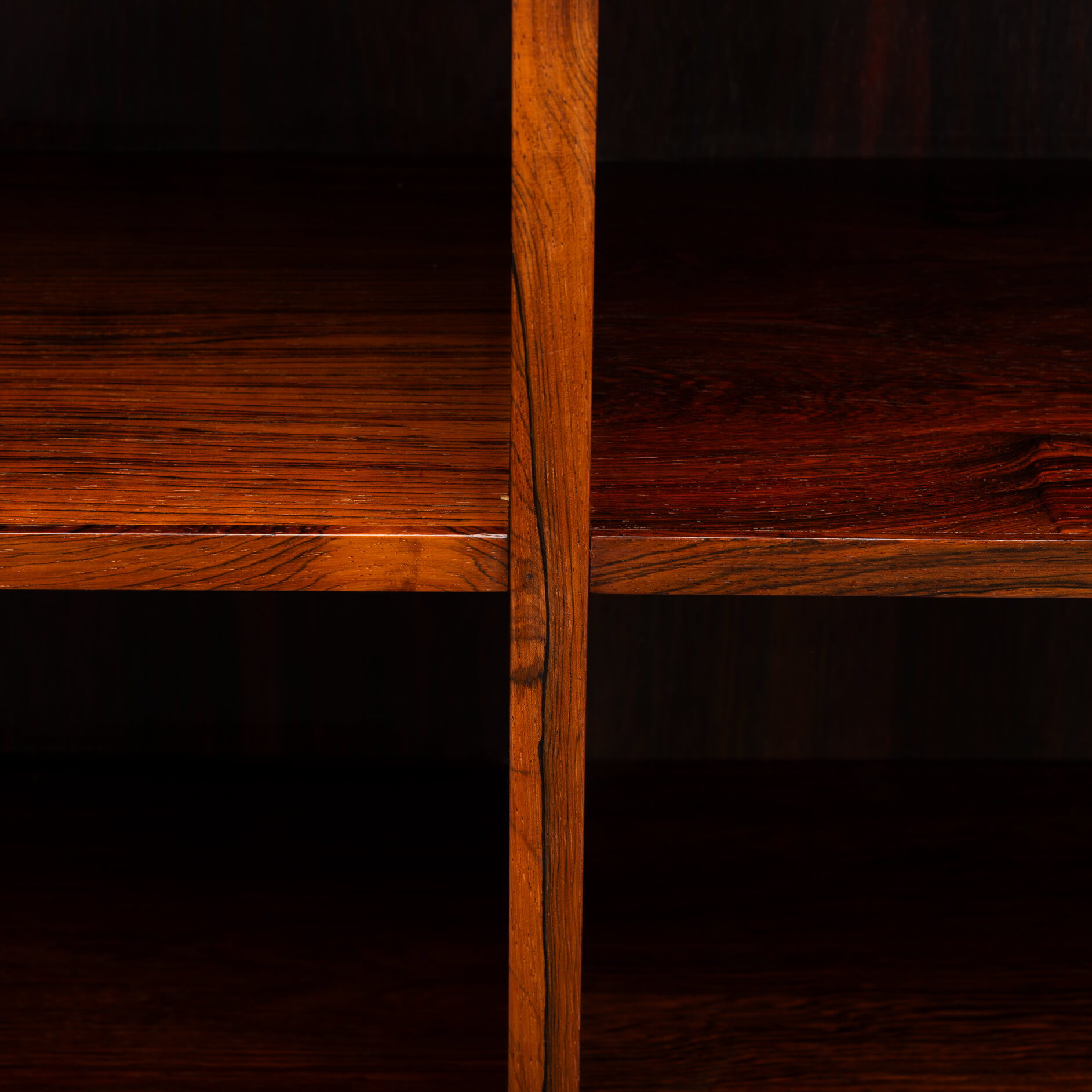 Deense midcentury modern boekenkast in prachtig palissander fineer. Helaas hebben we de designer en maker van de kwaliteitskast niet kunnen achter halen. Maar dat betekent wel een gunstigere prijs ;-)