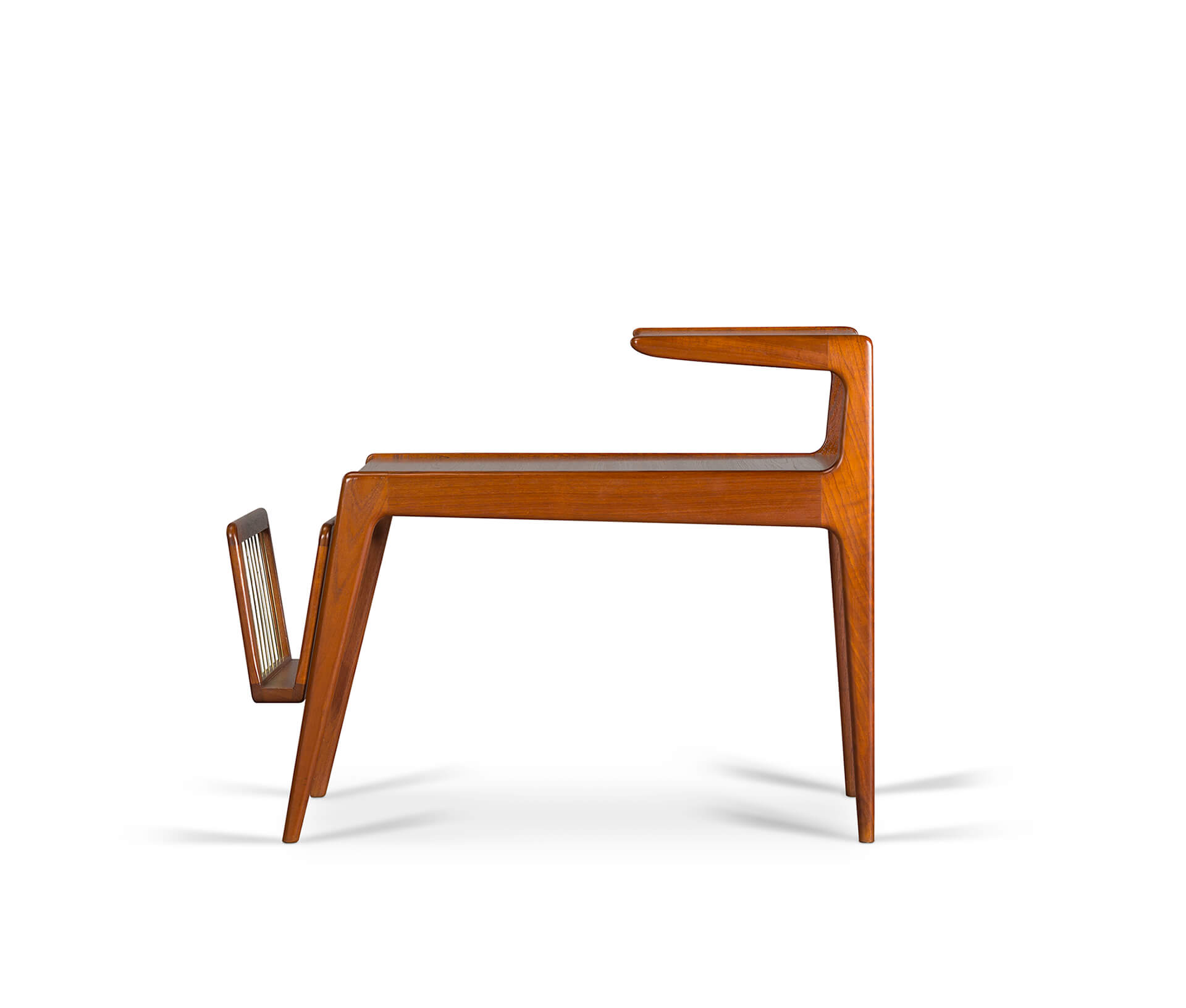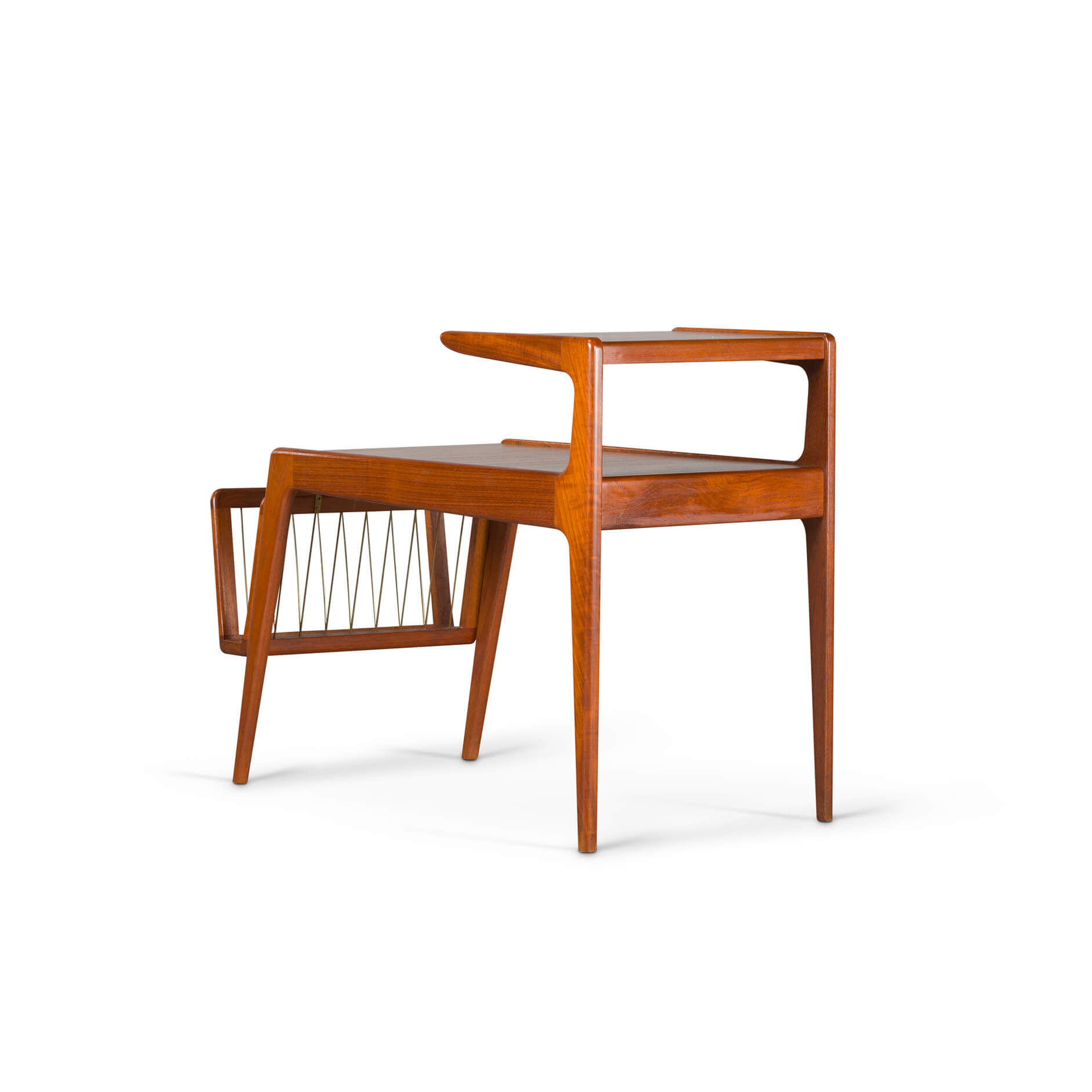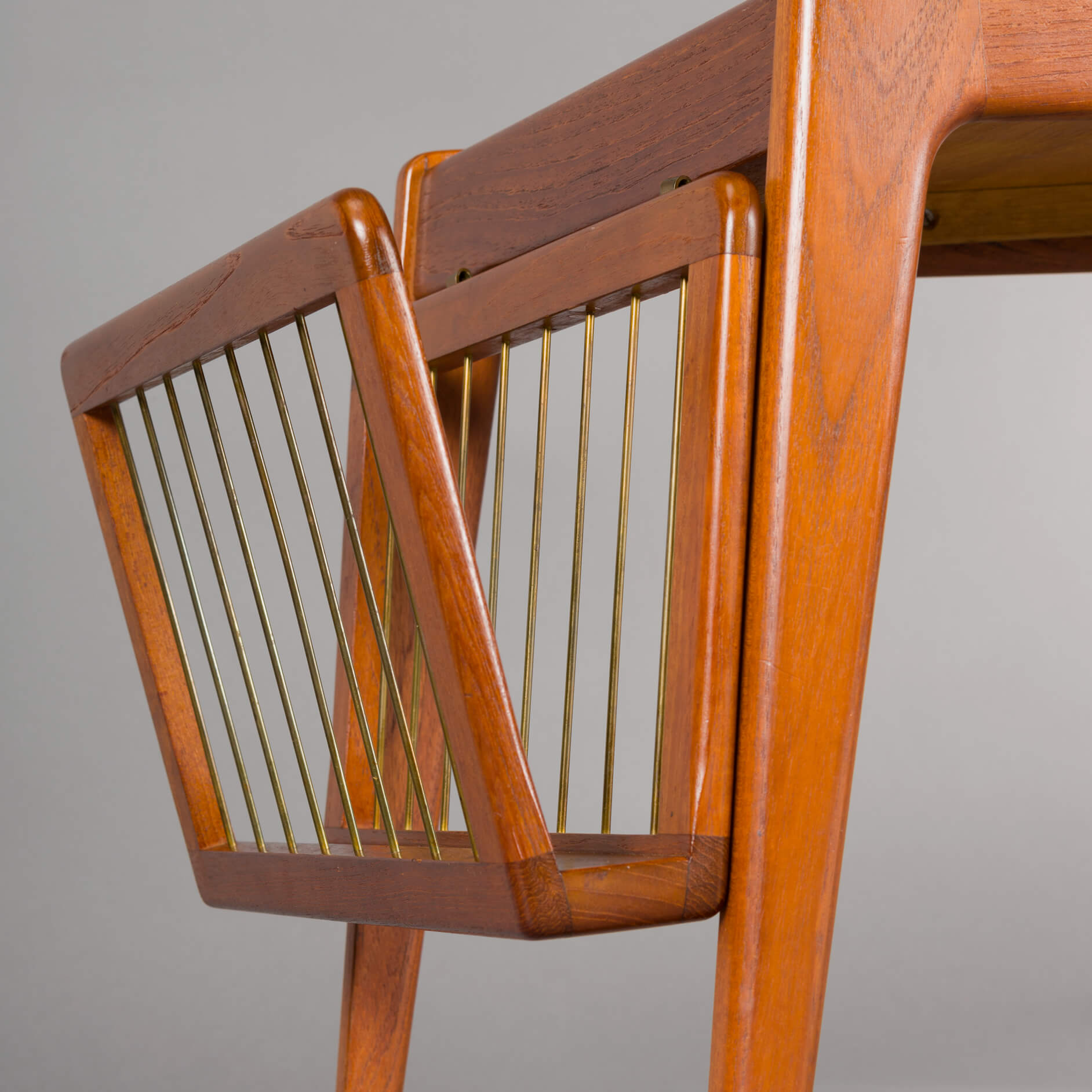 Deens teak bijzettafeltje met verwijderbaar tijdschriften rek ontworpen door Kurt Østervig voor Jason Mobler. Het design omvat een kleiner hoger plateau, een groter laag plateau en een tijdschriften rek. Het tijdschriften rek biedt makkelijk ruimte voor 10 tijdschriften en haakt in twee bronzen scharnieren aan het lagere plateau. De spijlen zijn ook vervaardigd uit brons.