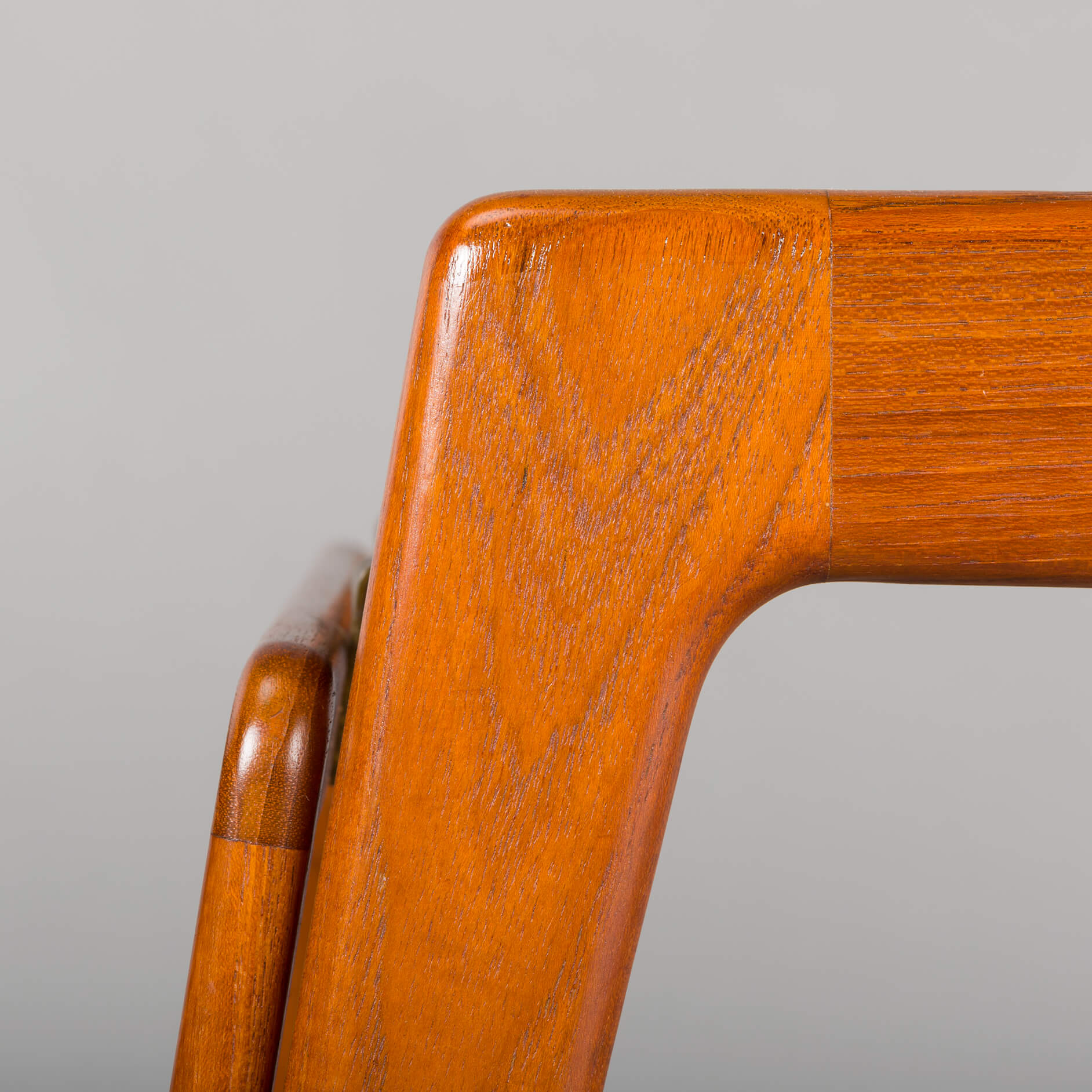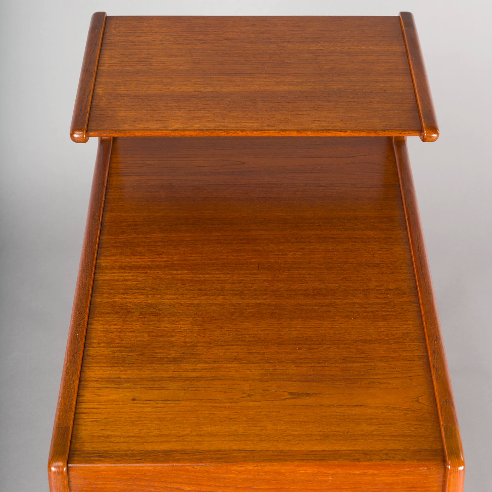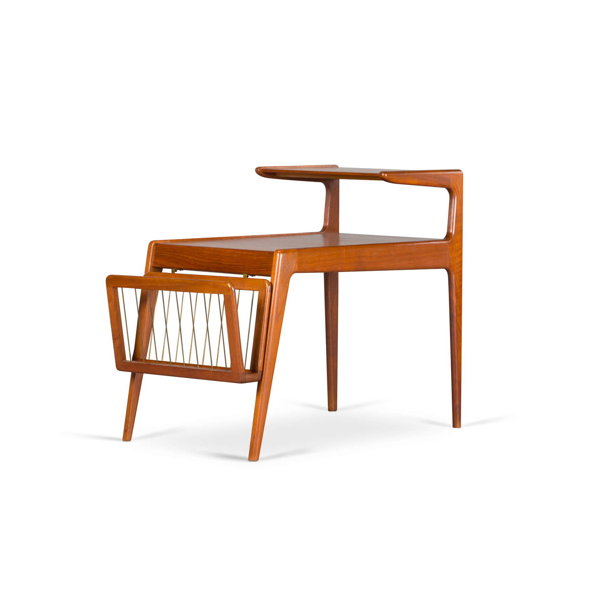 Deens teak bijzettafeltje met verwijderbaar tijdschriften rek ontworpen door Kurt Østervig voor Jason Mobler. Het design omvat een kleiner hoger plateau, een groter laag plateau en een tijdschriften rek. Het tijdschriften rek biedt makkelijk ruimte voor 10 tijdschriften en haakt in twee bronzen scharnieren aan het lagere plateau. De spijlen zijn ook vervaardigd uit brons.