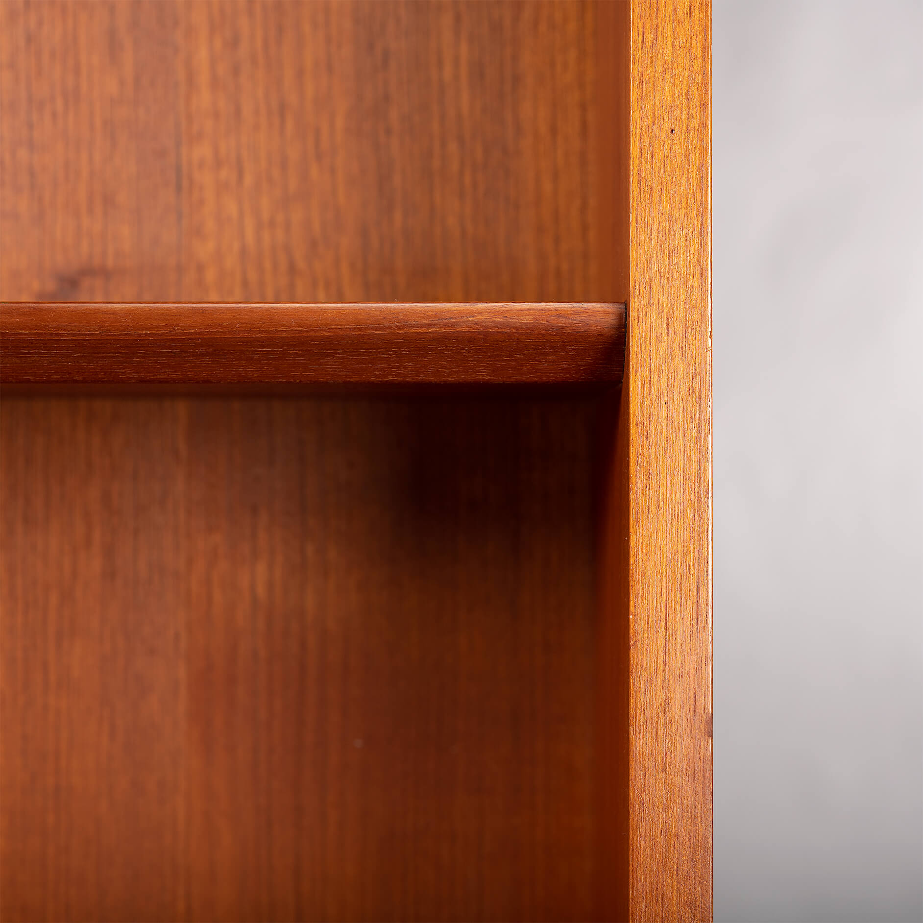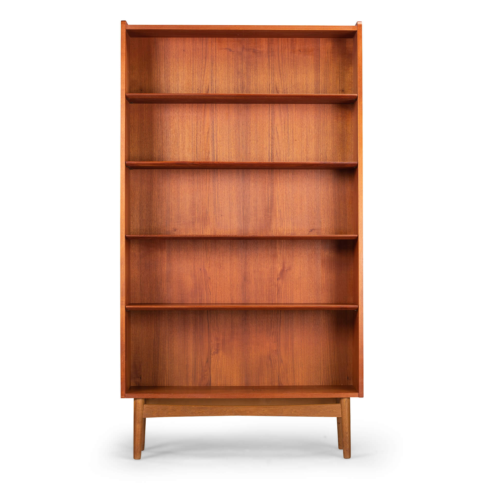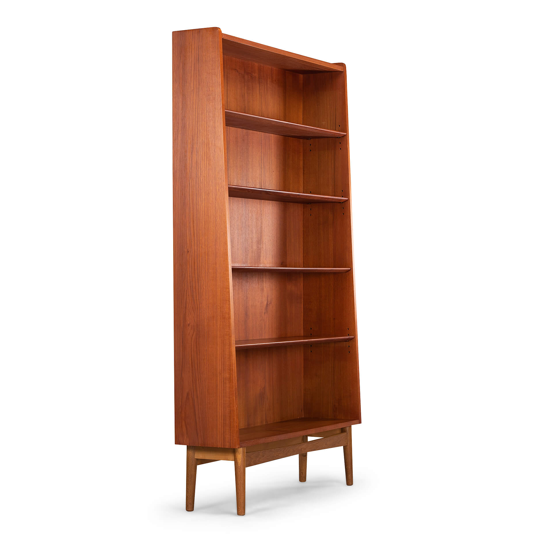 Deze zeldzame hoge Deense boekenkast in teak fineer met eiken onderstel maakt onderdeel uit van een set van 3. De kasten worden los verkocht maar als je op zoek bent naar een grote boekenkast wand dan is dit je kans! Bovenin op het smalste punt is de kast 21 cm diep.