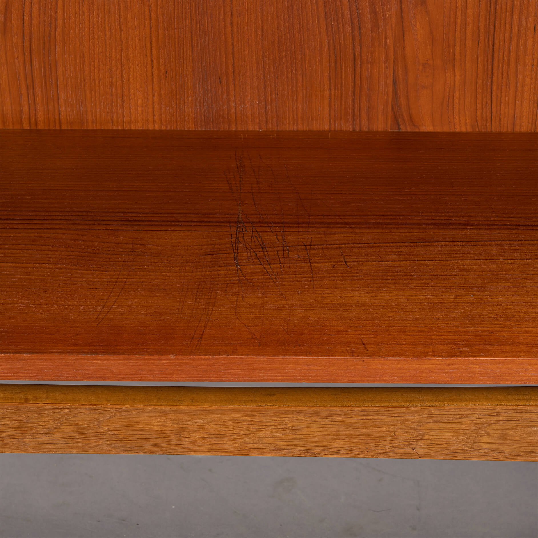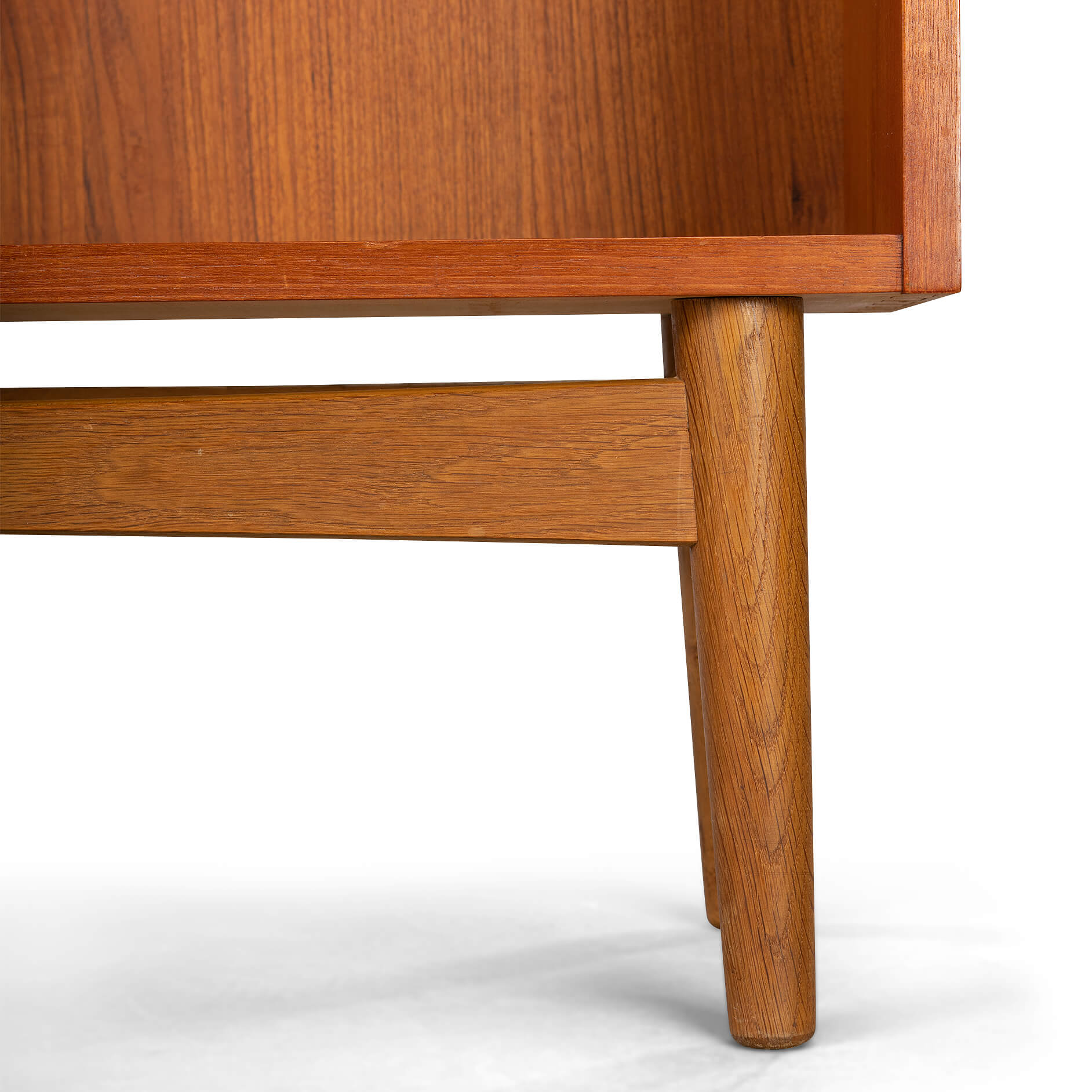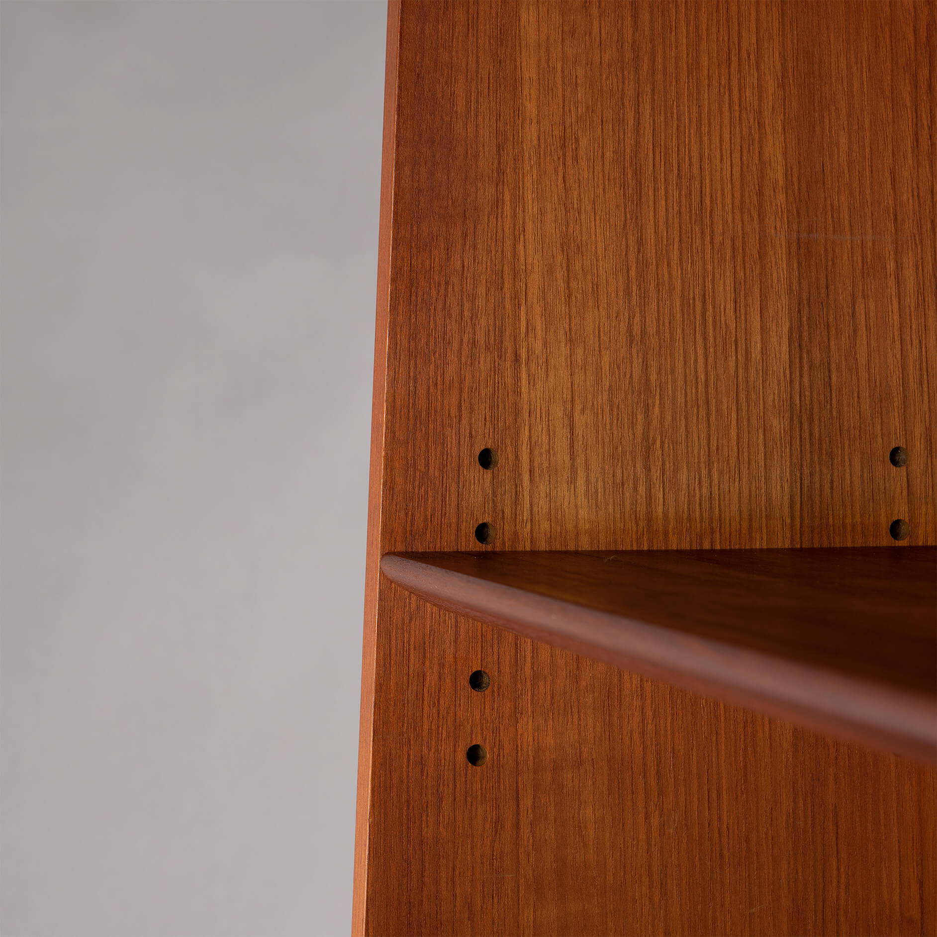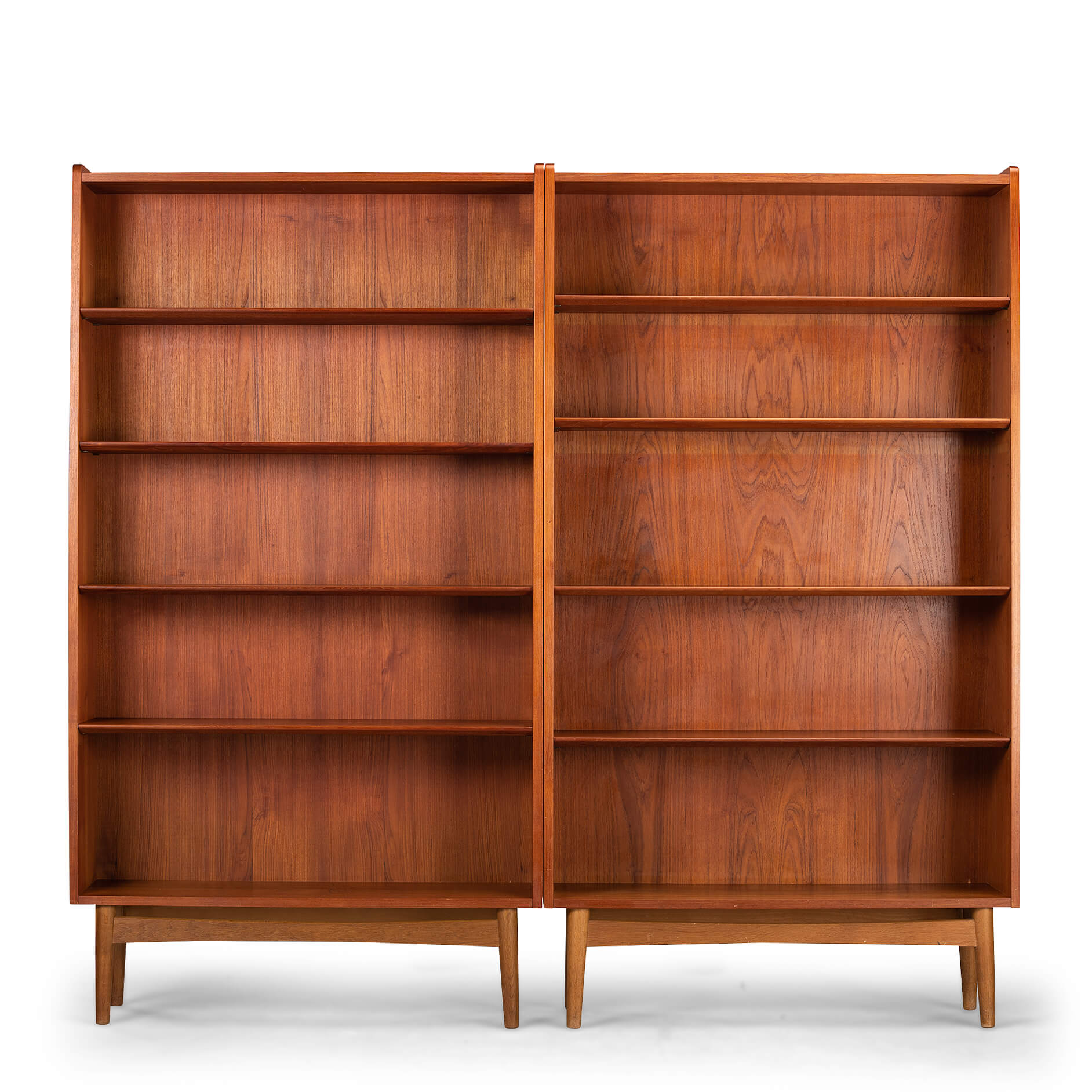 Deze zeldzame hoge Deense boekenkast in teak fineer met eiken onderstel maakt onderdeel uit van een set van 3. De kasten worden los verkocht maar als je op zoek bent naar een grote boekenkast wand dan is dit je kans! Bovenin op het smalste punt is de kast 21 cm diep.