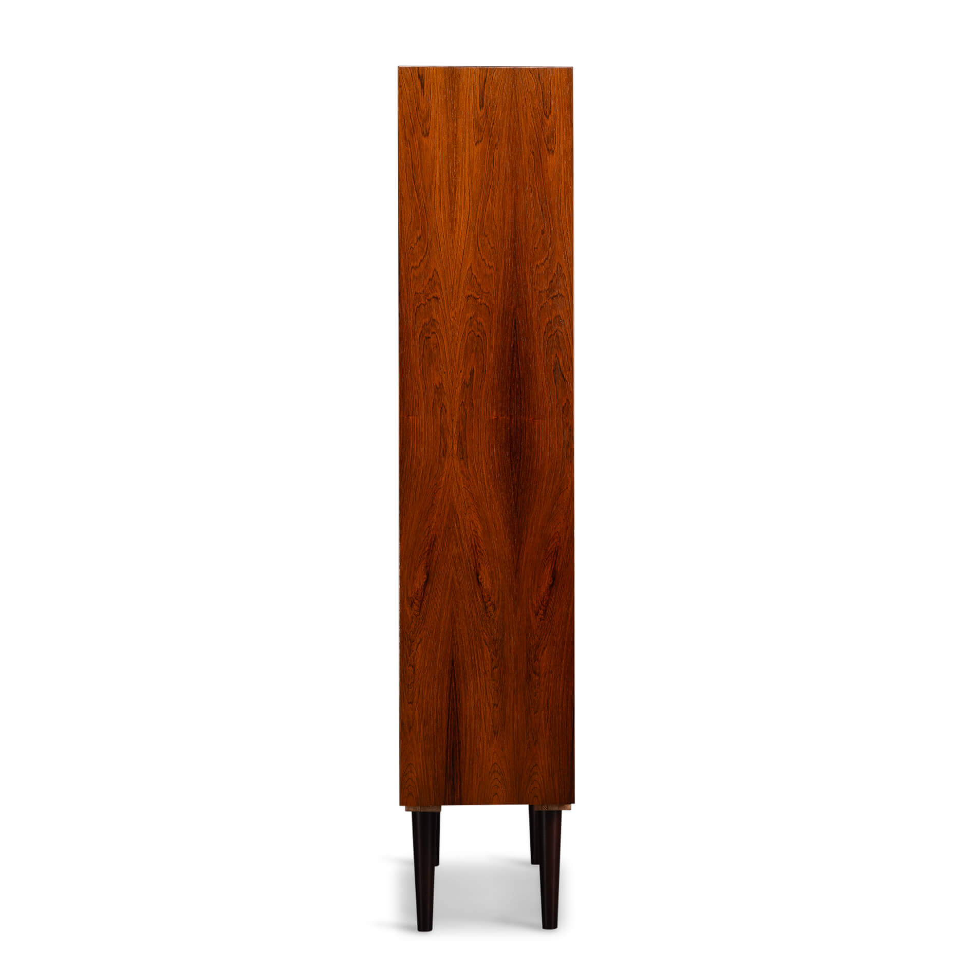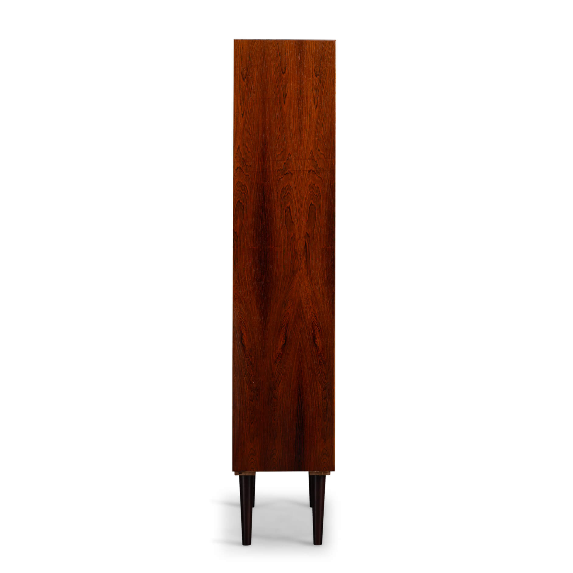 Deense hoge boekenkast in prachtig palissander fineer. De kast is ontworpen door Carlo Jensen en gemaakt door Hundevad & Co. De fabriekssticker op de achterkant is er helaas in de loop der jaren af gevallen. Maar een Hundevad boekenkast is altijd te herkennen aan de planken die afgeschuind zijn.