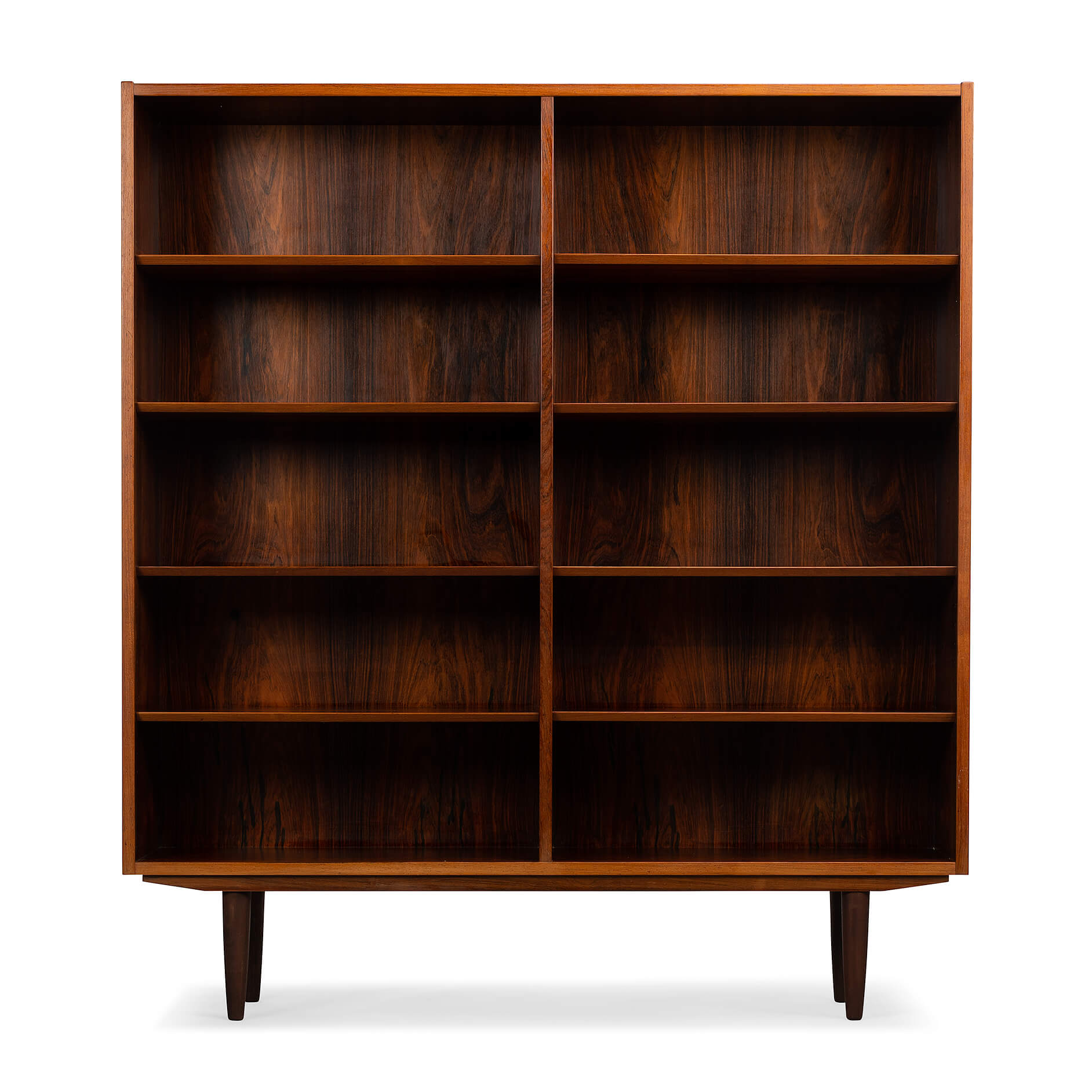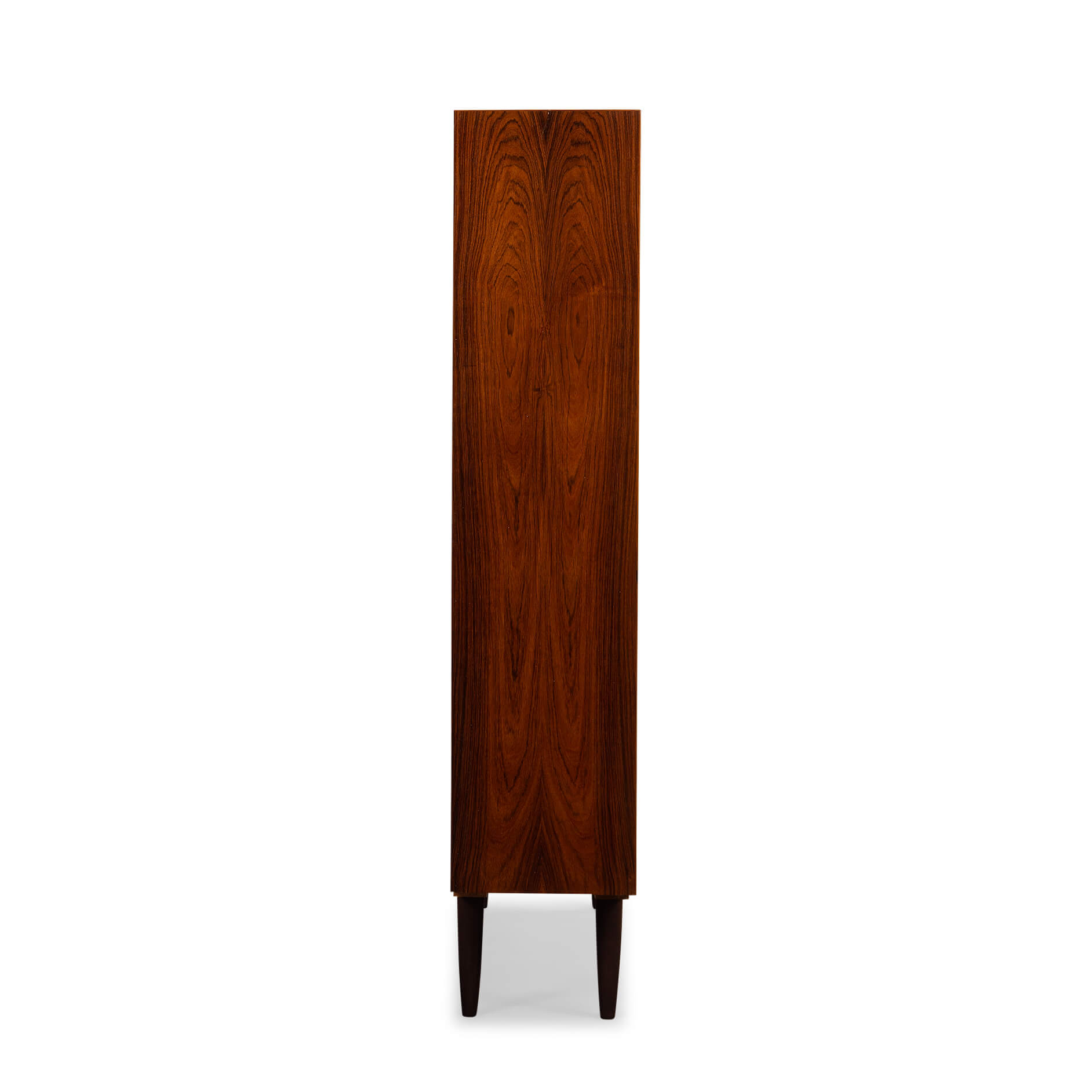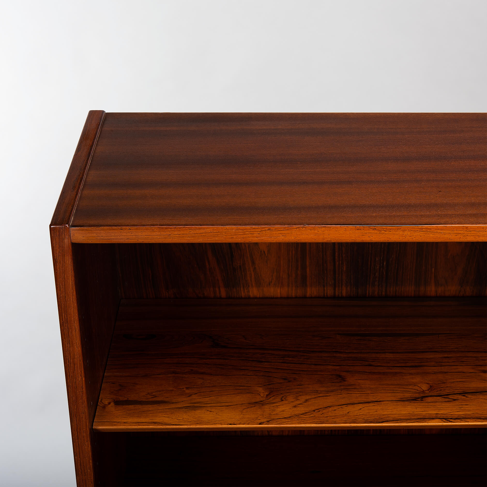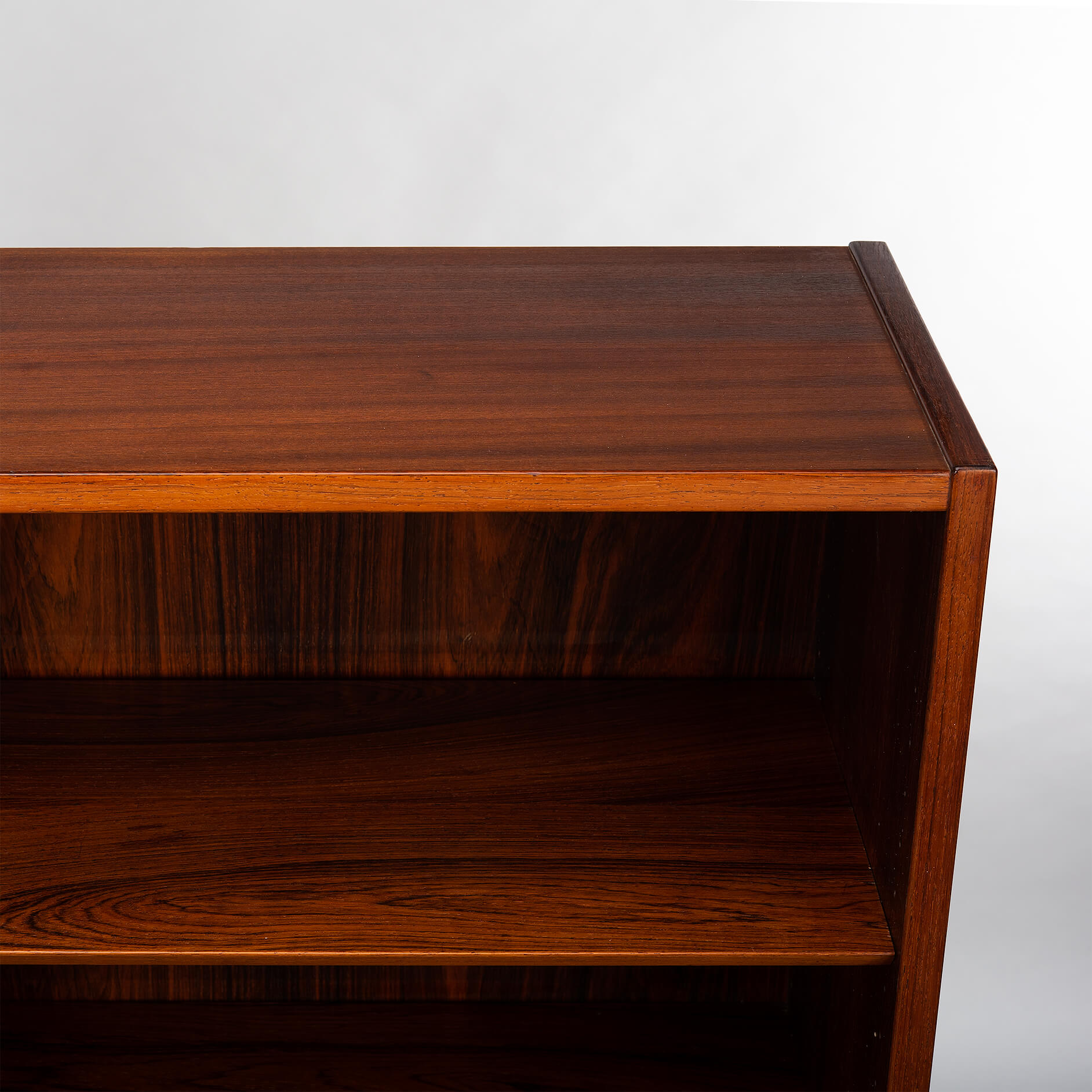 Deense boekenkast in prachtig expressief palissander fineer. Design by Carlo Jensen en gemaakt door Hundevad & Co. Deze boekenkast heeft in totaal 8 in hoogte verstelbare liggende planken.