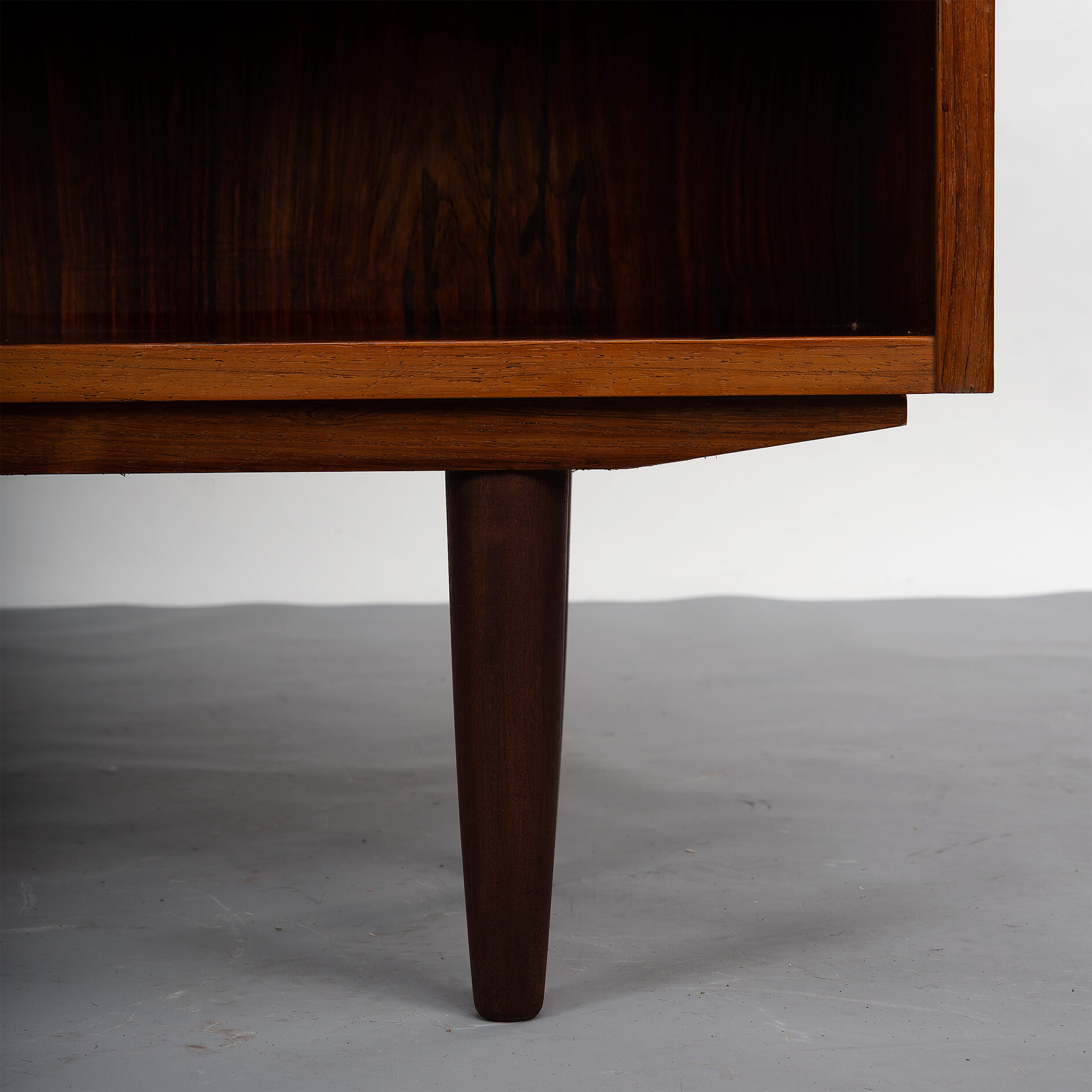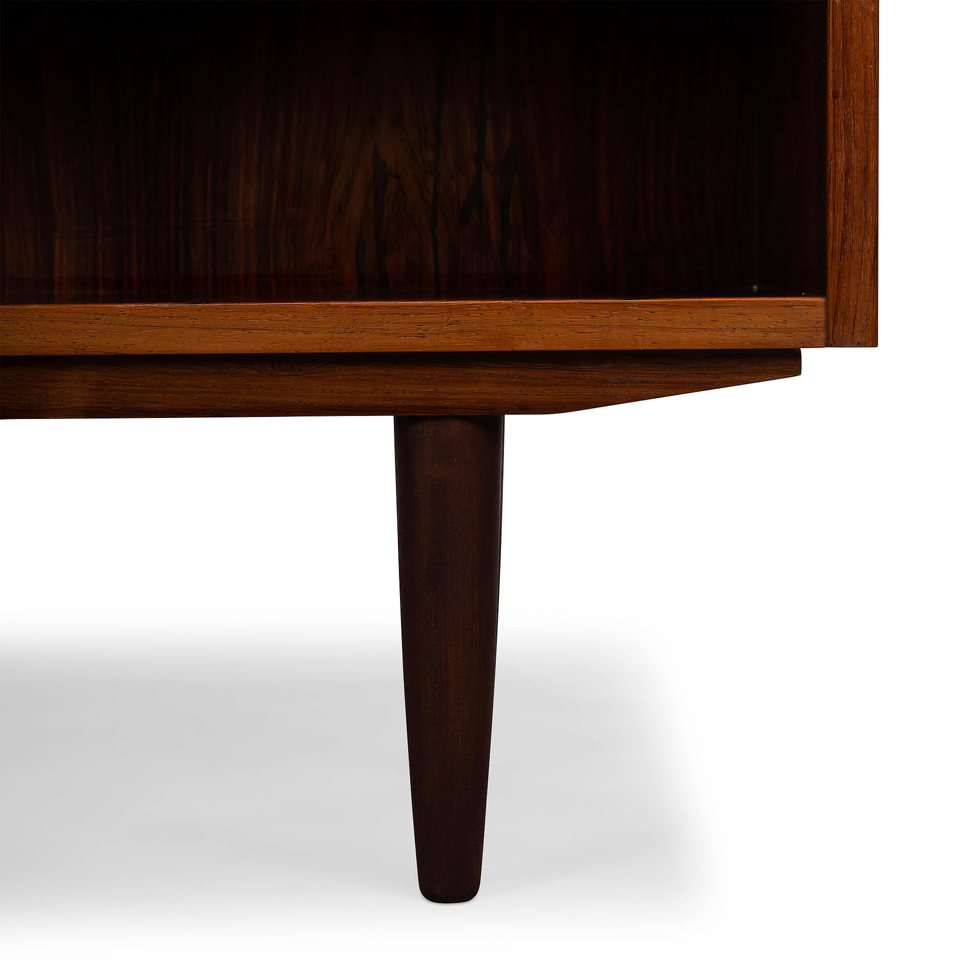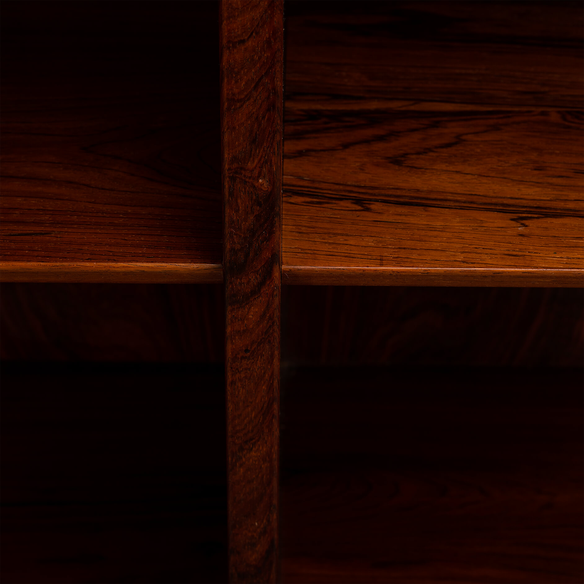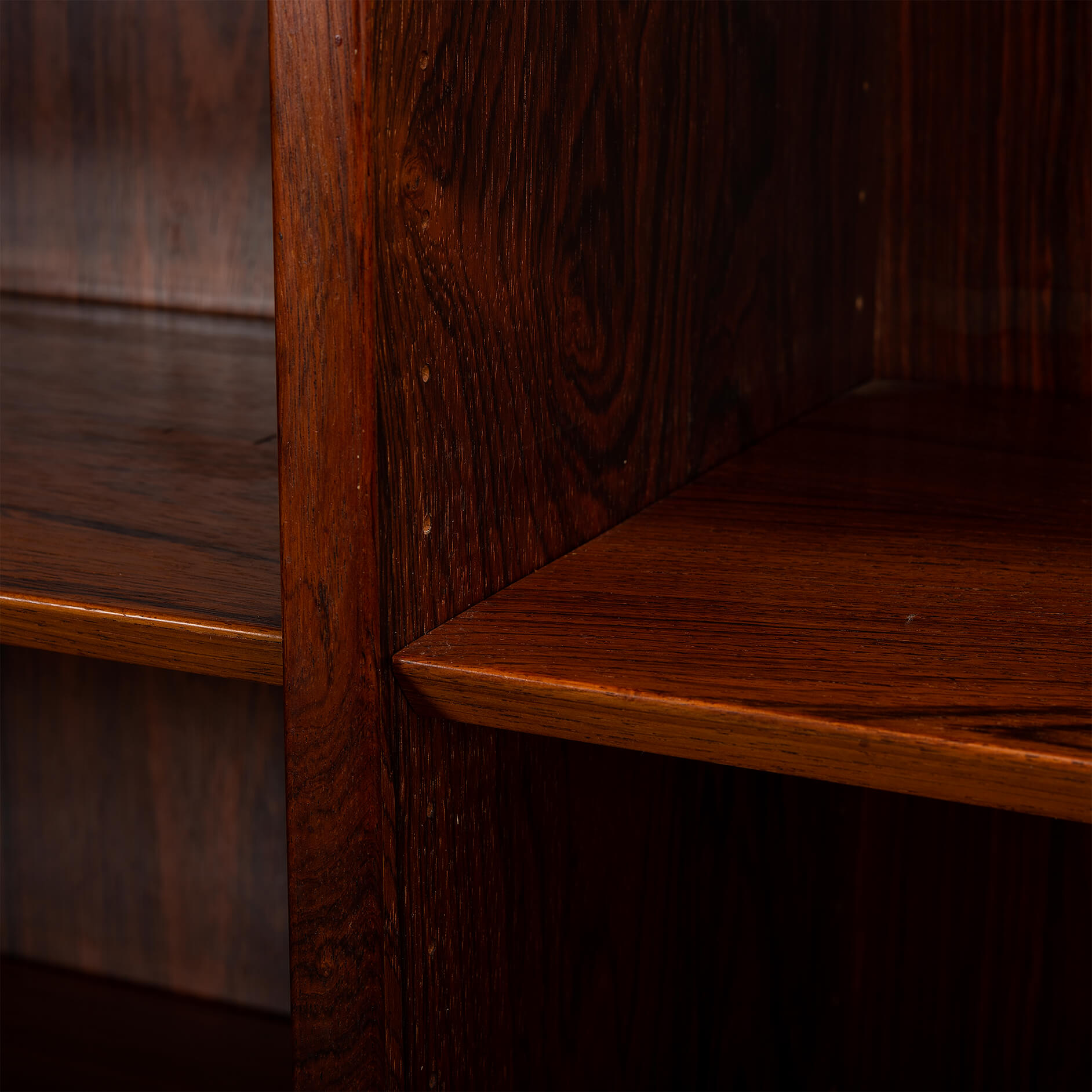 Deense boekenkast in prachtig expressief palissander fineer. Design by Carlo Jensen en gemaakt door Hundevad & Co. Deze boekenkast heeft in totaal 8 in hoogte verstelbare liggende planken.