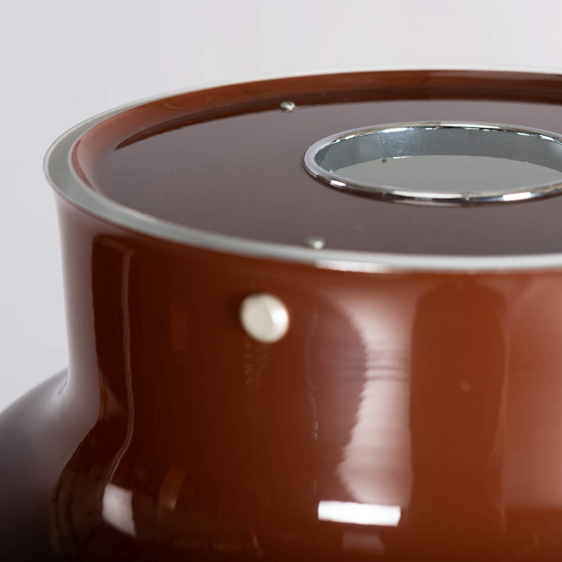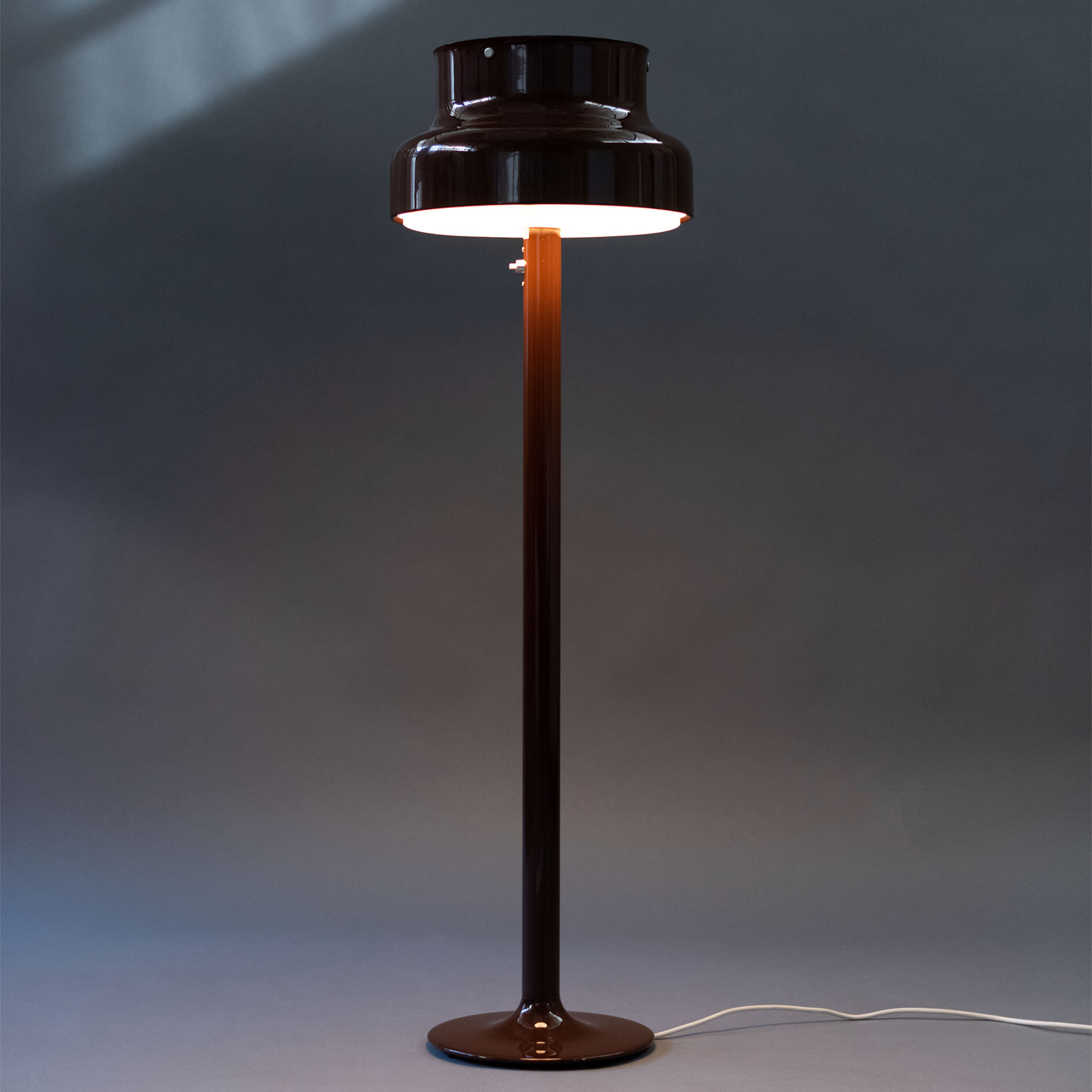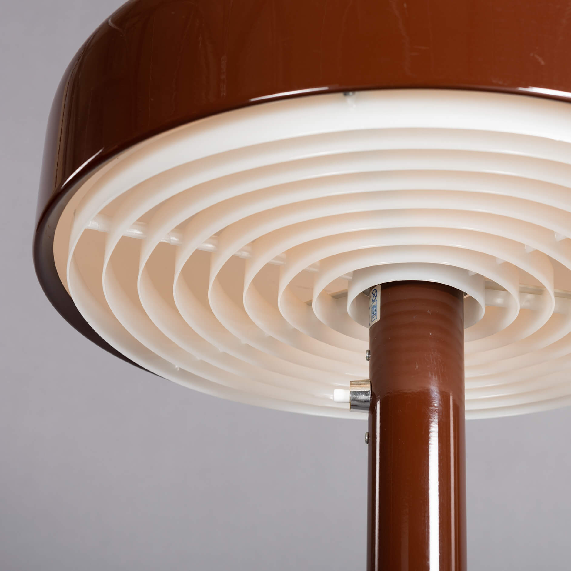 De bruine kap heeft nog de originele perspex diffuser in het wit. Deze staande versie verkeert in zijn geheel in een uitstekende staat! Slechts een tweetal heel kleine tikjes op de voet van de lamp.