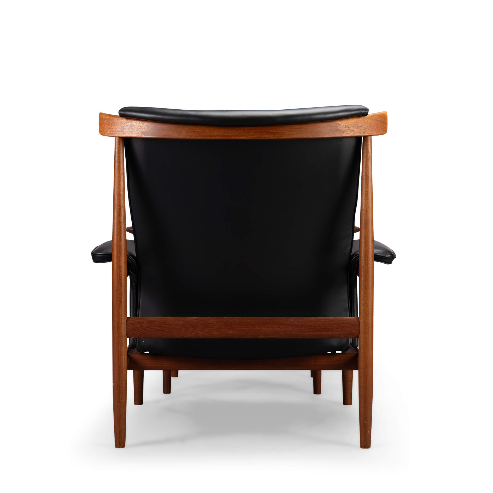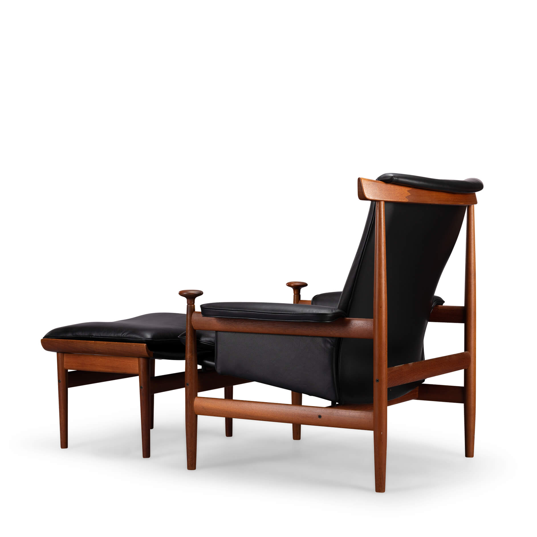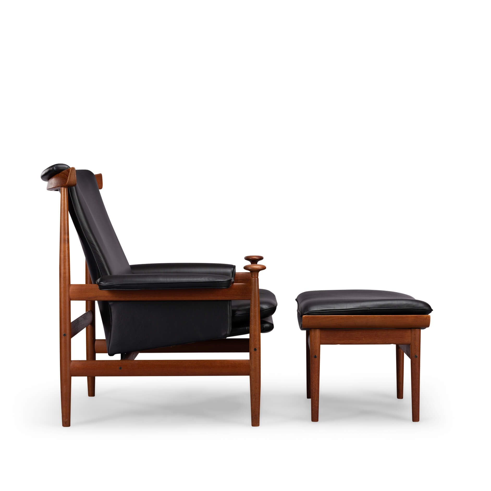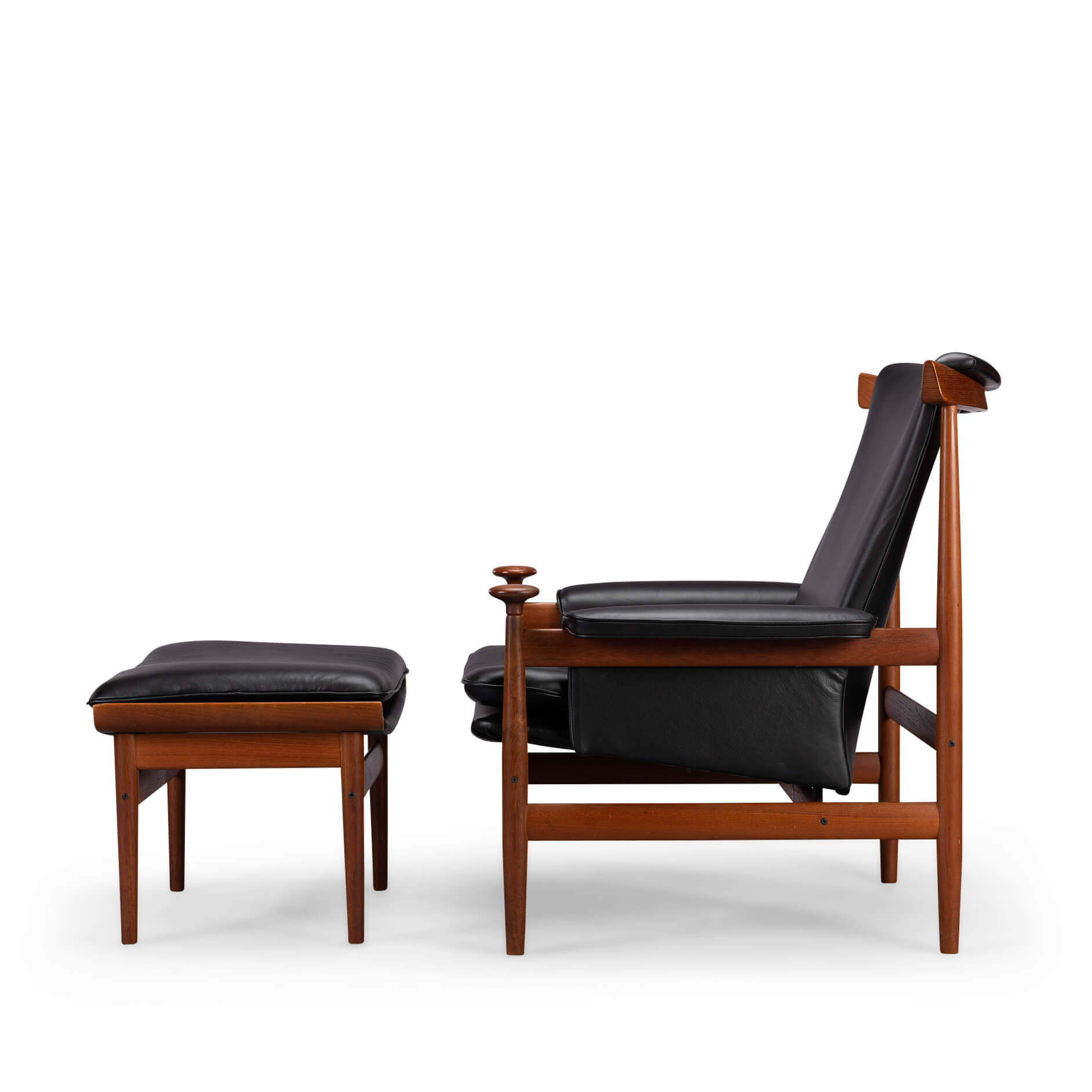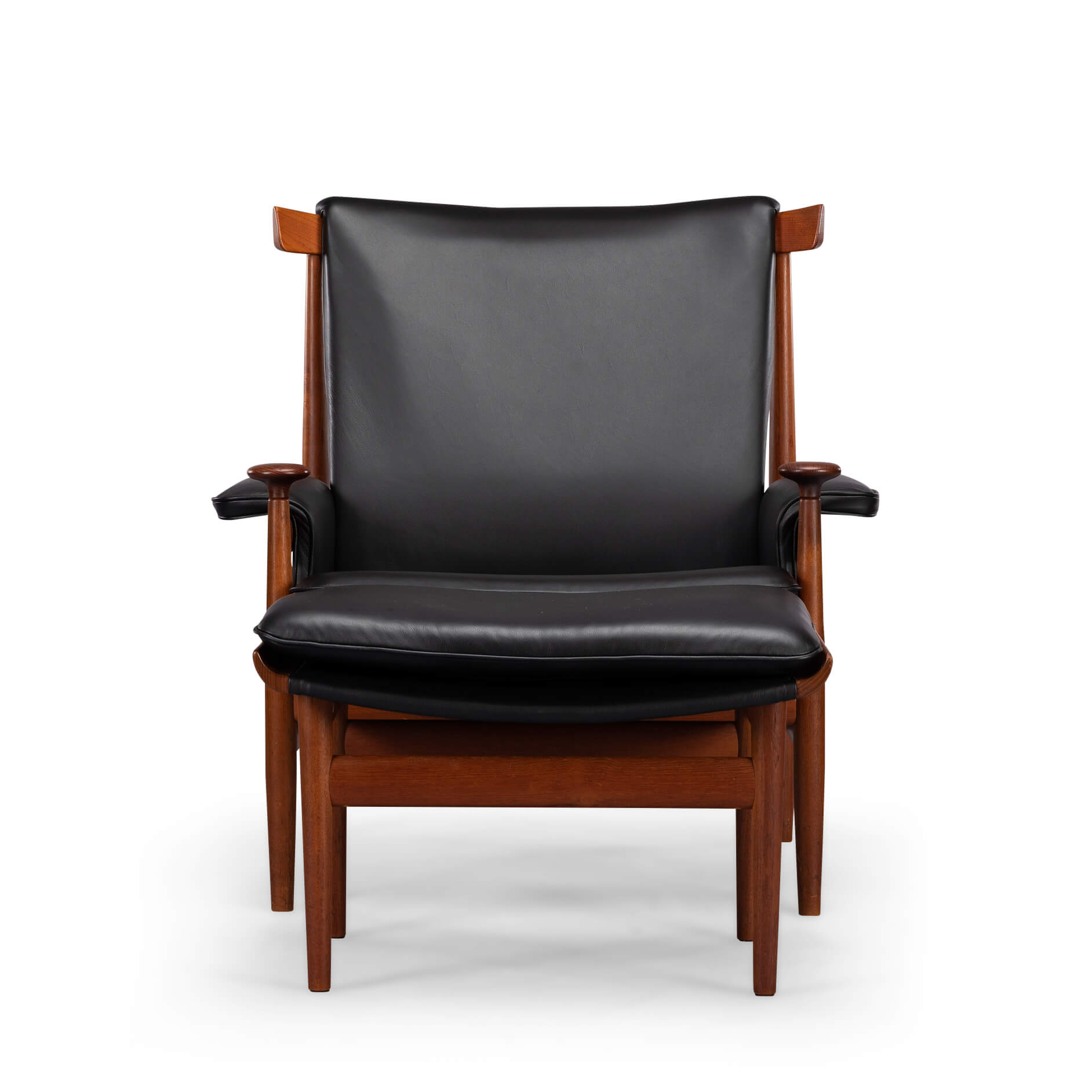 Bwana chair met ottoman designed door Finn Juhl voor France & Son in teak en opnieuw gestoffeerd in een zacht zwart leer. Hierdoor in uitstekende vintage conditie met enkel een missend stukje hout op het frame van de ottoman, zie foto's.