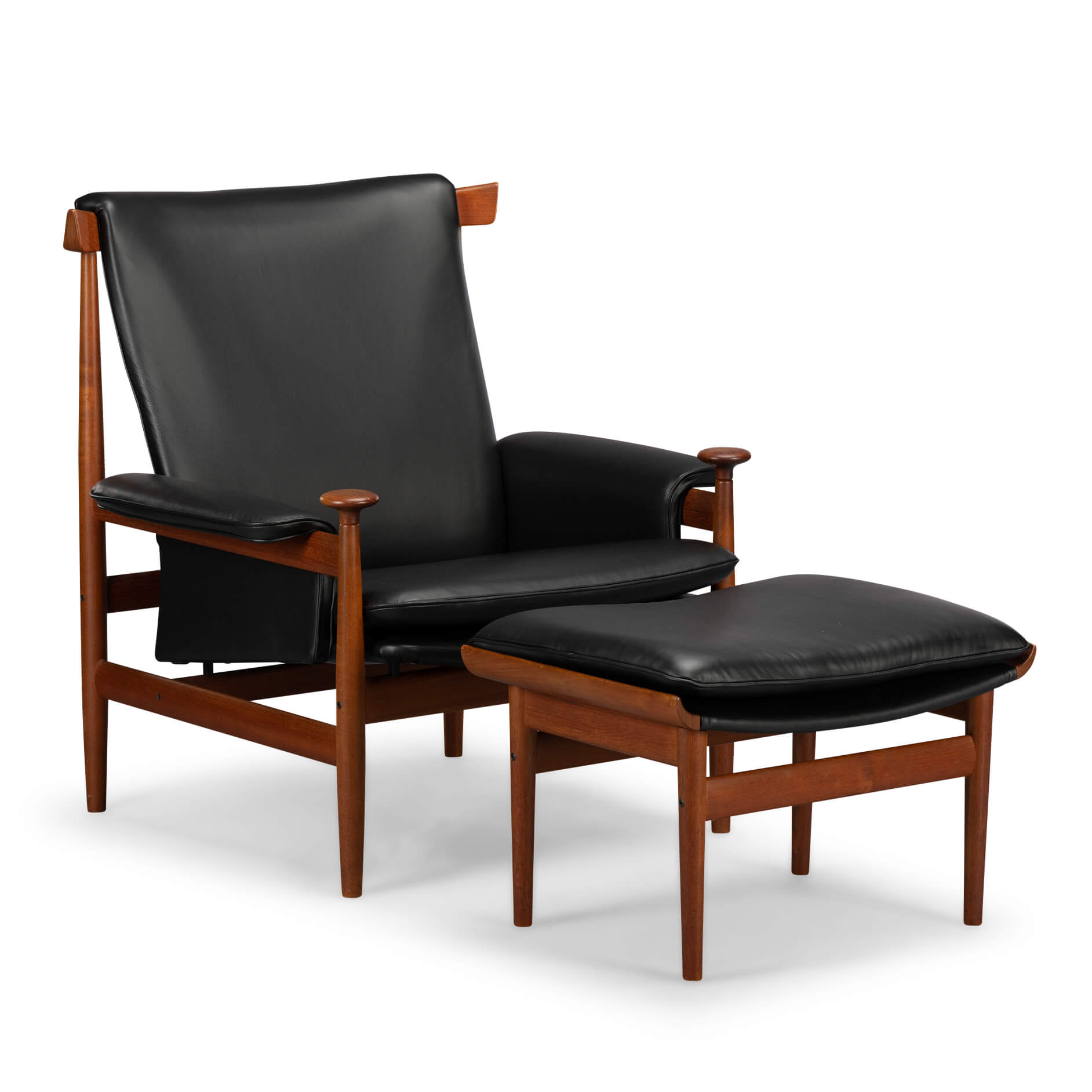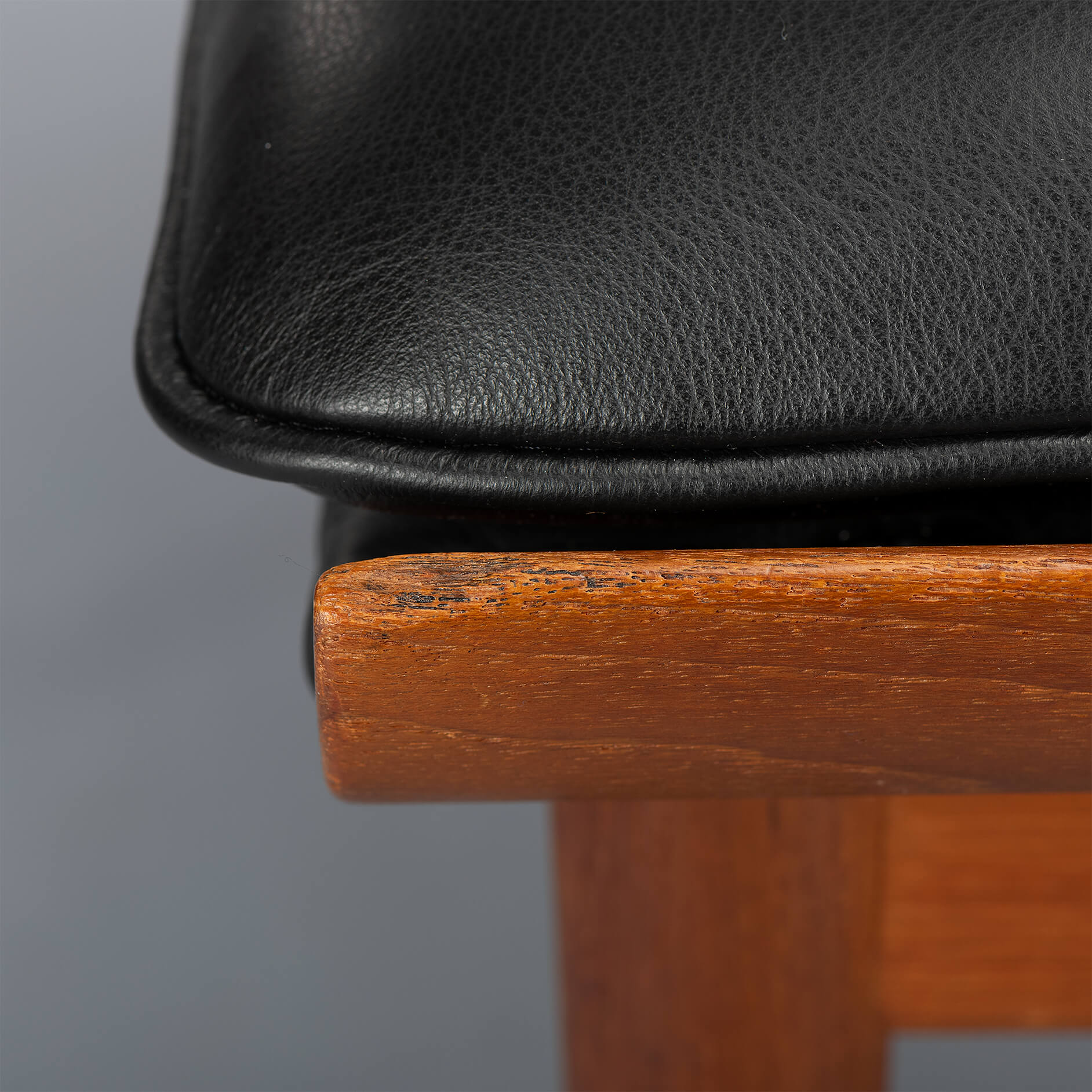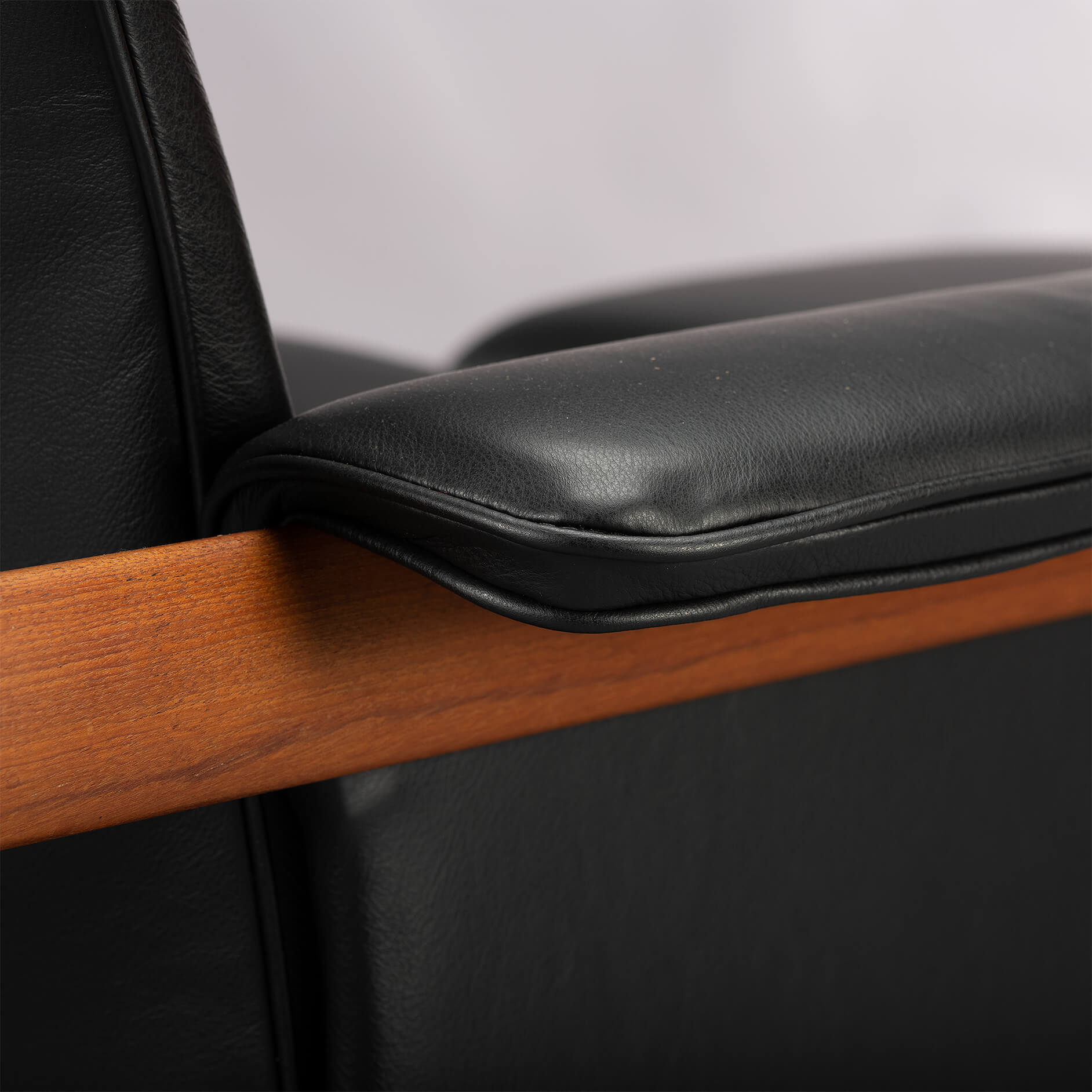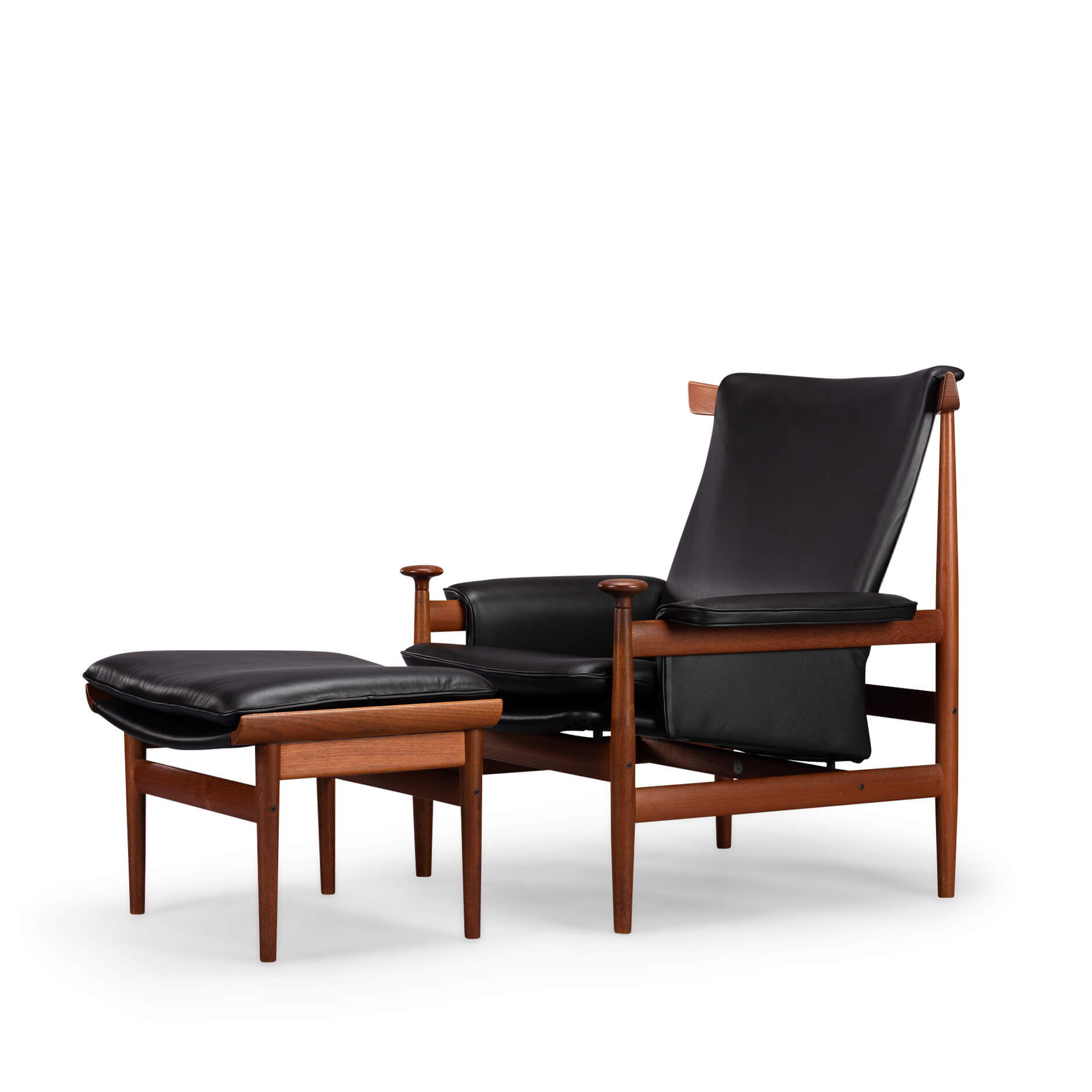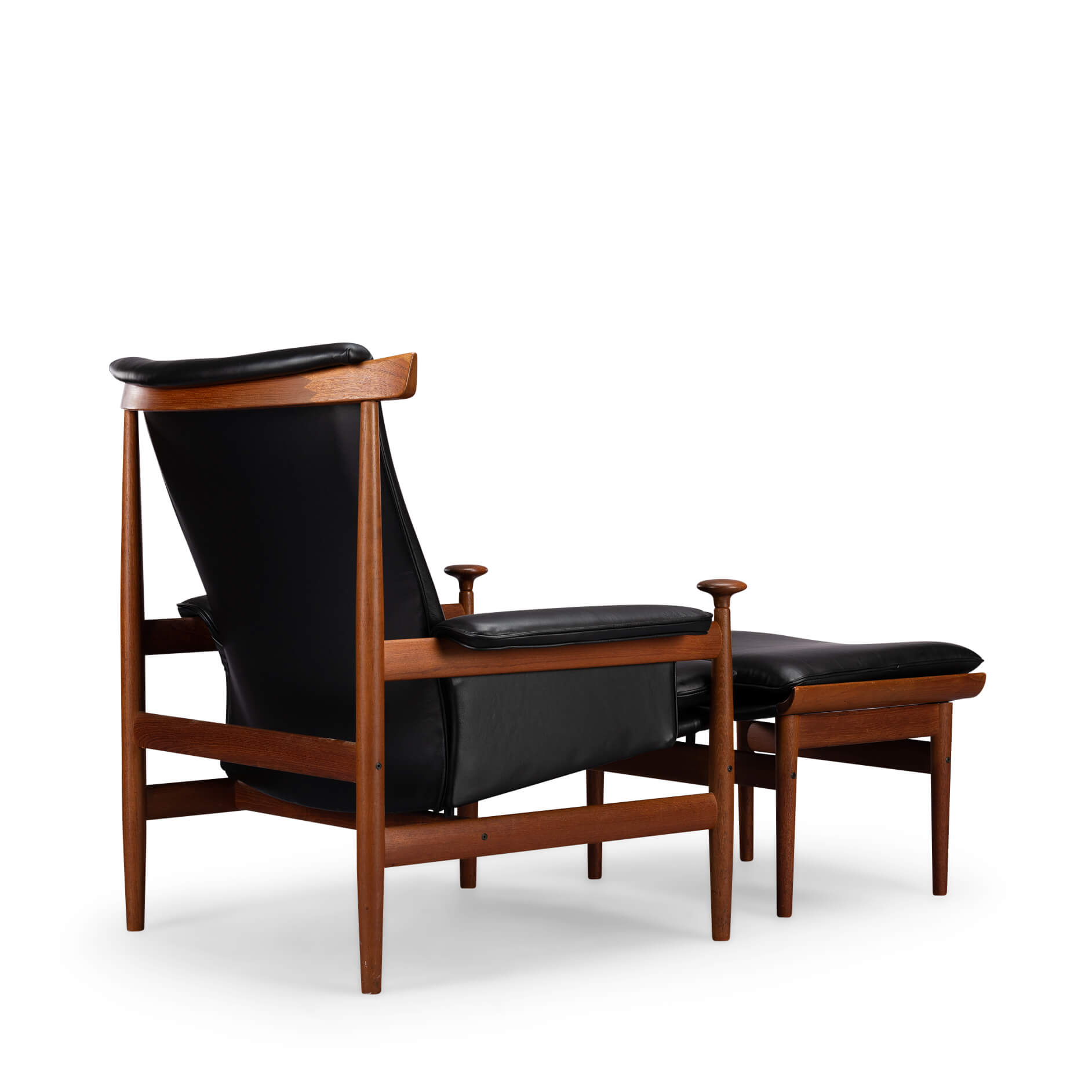 Bwana chair met ottoman designed door Finn Juhl voor France & Son in teak en opnieuw gestoffeerd in een zacht zwart leer. Hierdoor in uitstekende vintage conditie met enkel een missend stukje hout op het frame van de ottoman, zie foto's.