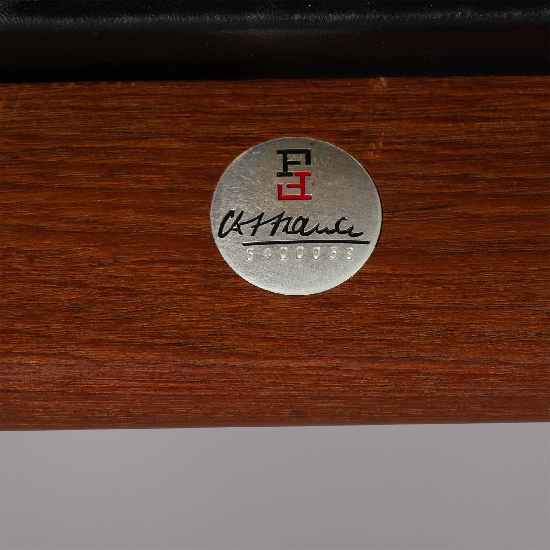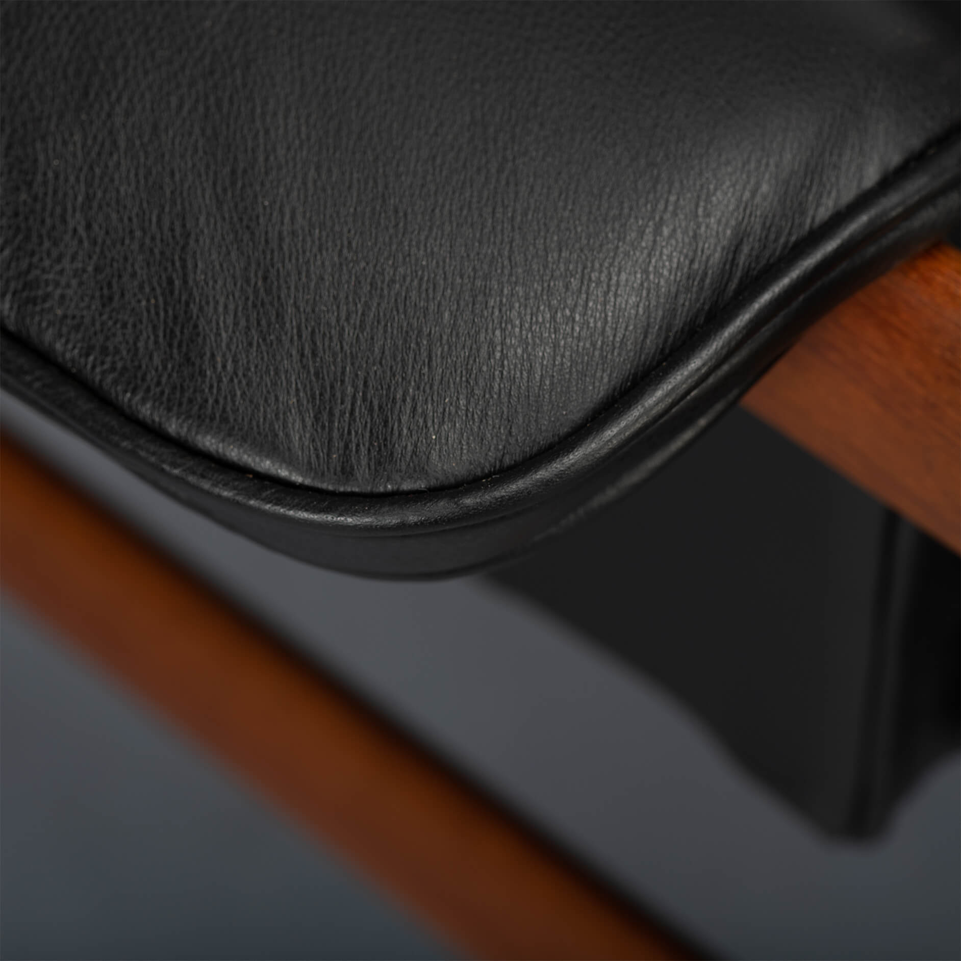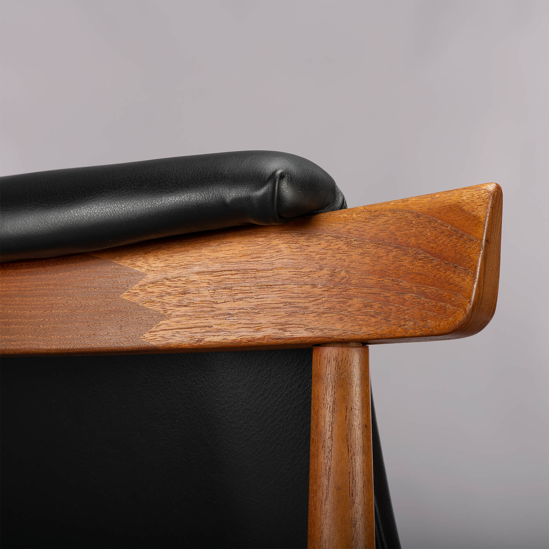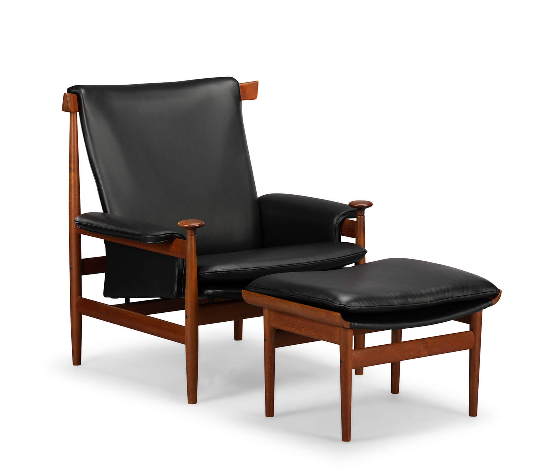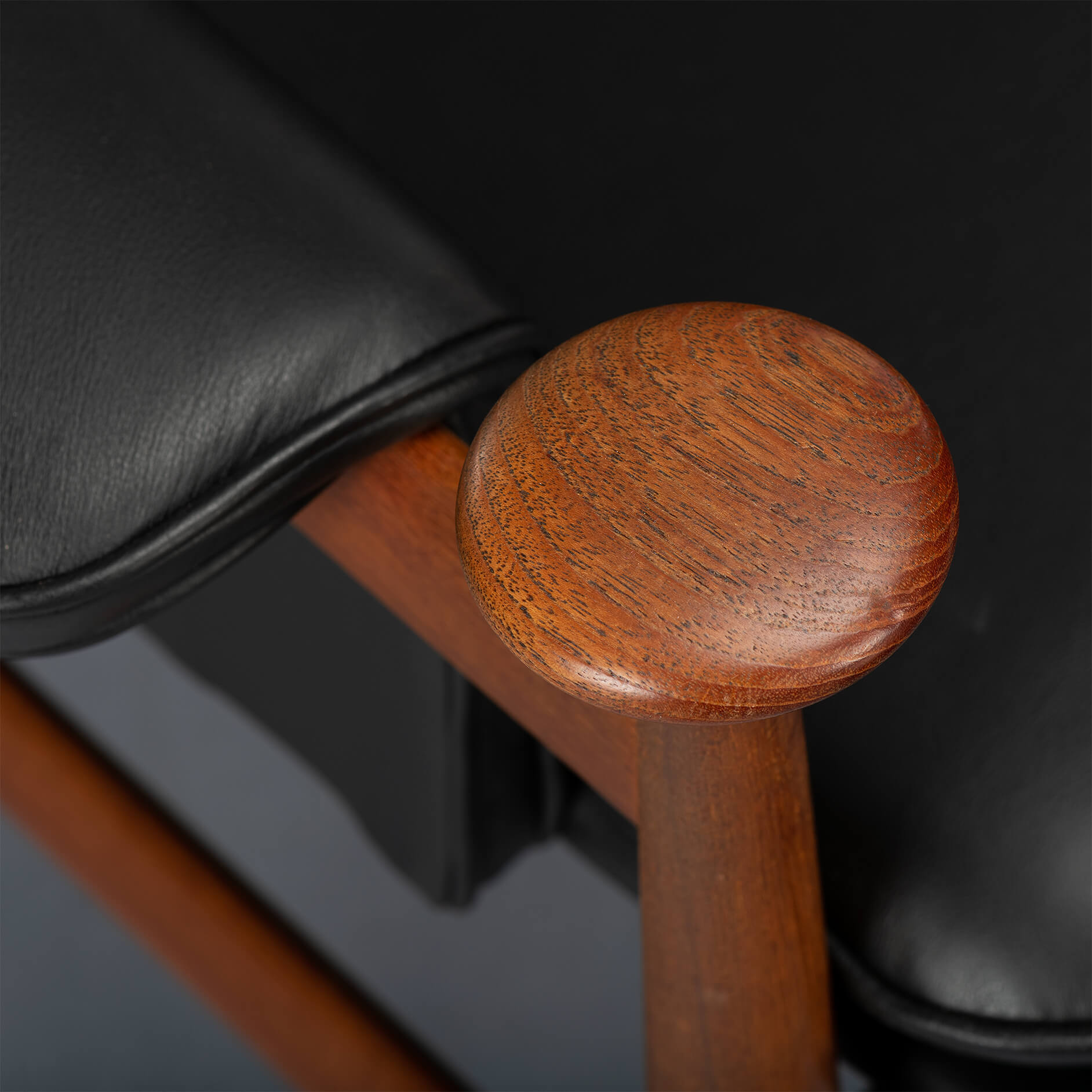 Bwana chair met ottoman designed door Finn Juhl voor France & Son in teak en opnieuw gestoffeerd in een zacht zwart leer. Hierdoor in uitstekende vintage conditie met enkel een missend stukje hout op het frame van de ottoman, zie foto's.