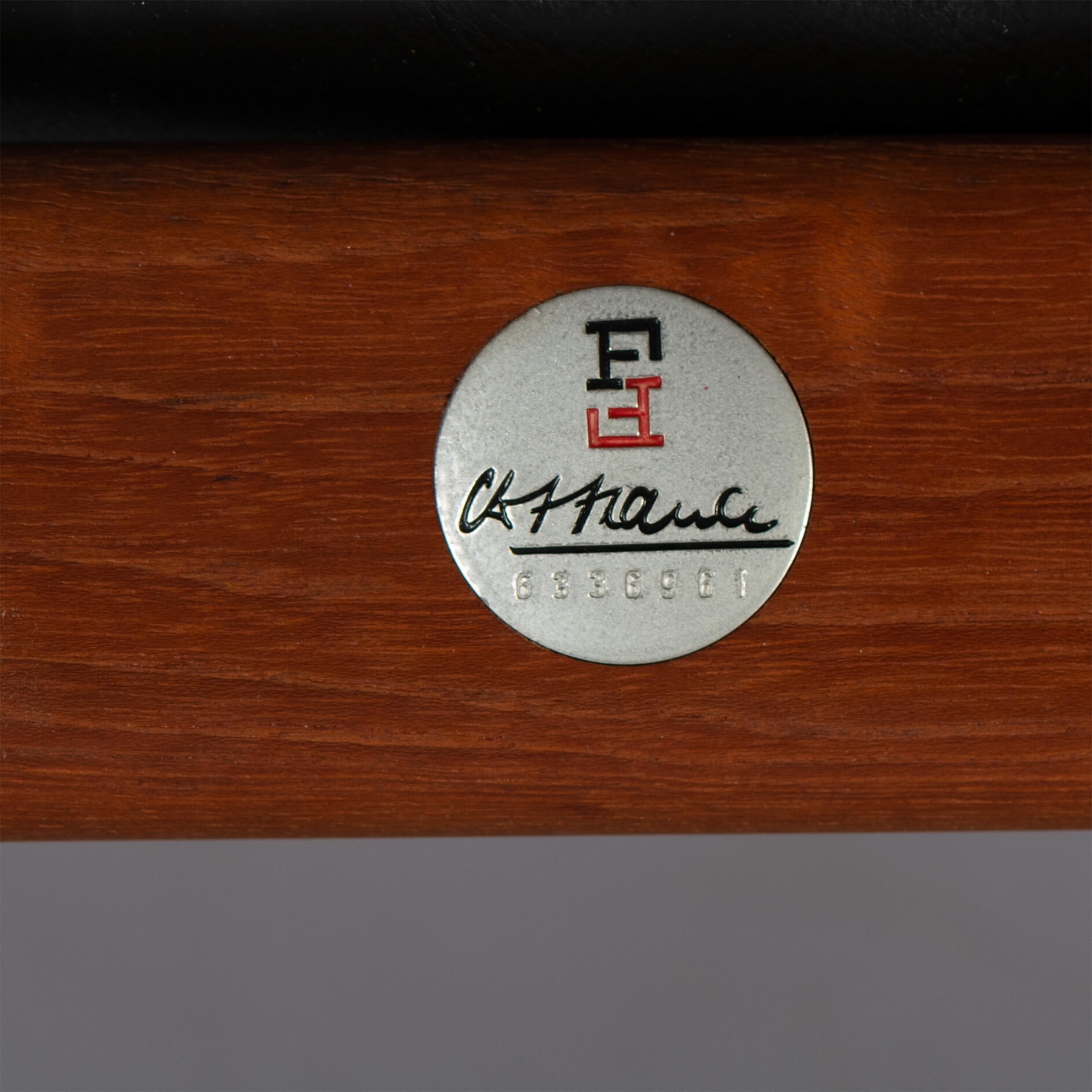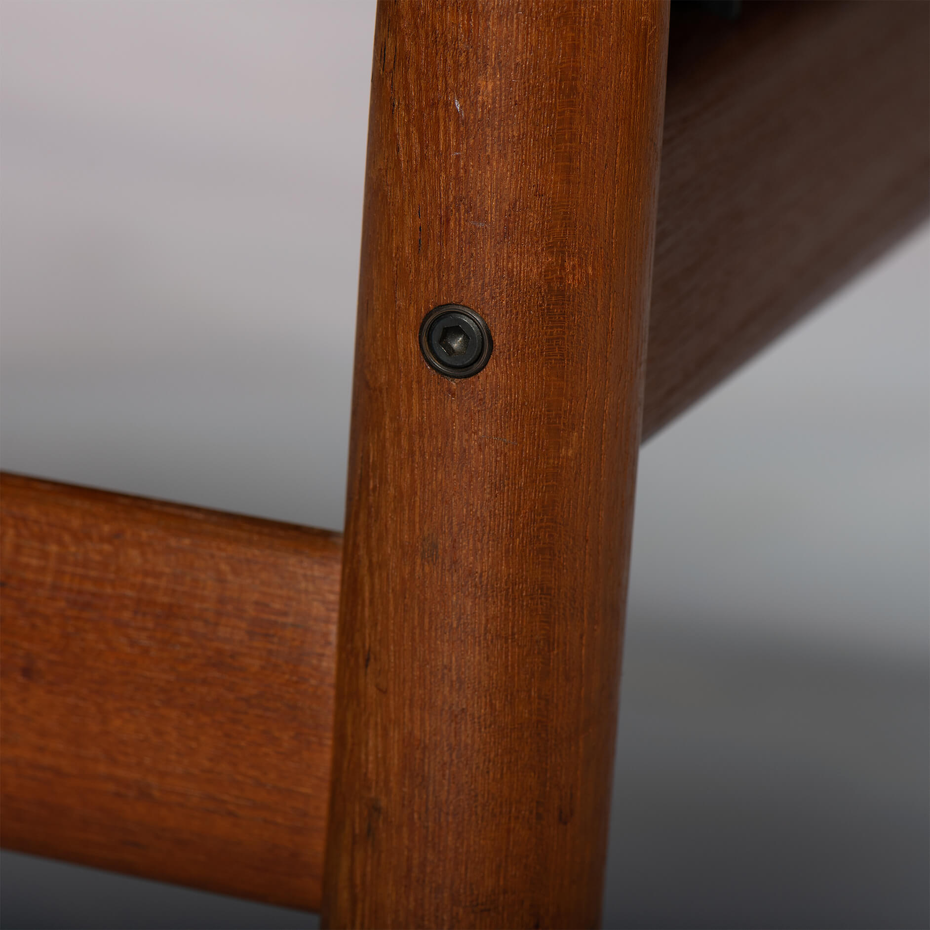 Finn Juhl designde hiermee een werkelijk majestueuze stoel, een beetje bombastisch maar geheel naar zijn stijl. De teak oren lijken haast duivelse hoornen en de ronde knoppen op de armleuningen lokken een krachtige zithouding uit. Echter we moeten toegeven dat de stoel ook in een meer relaxte pose zeer comfortabel zit!