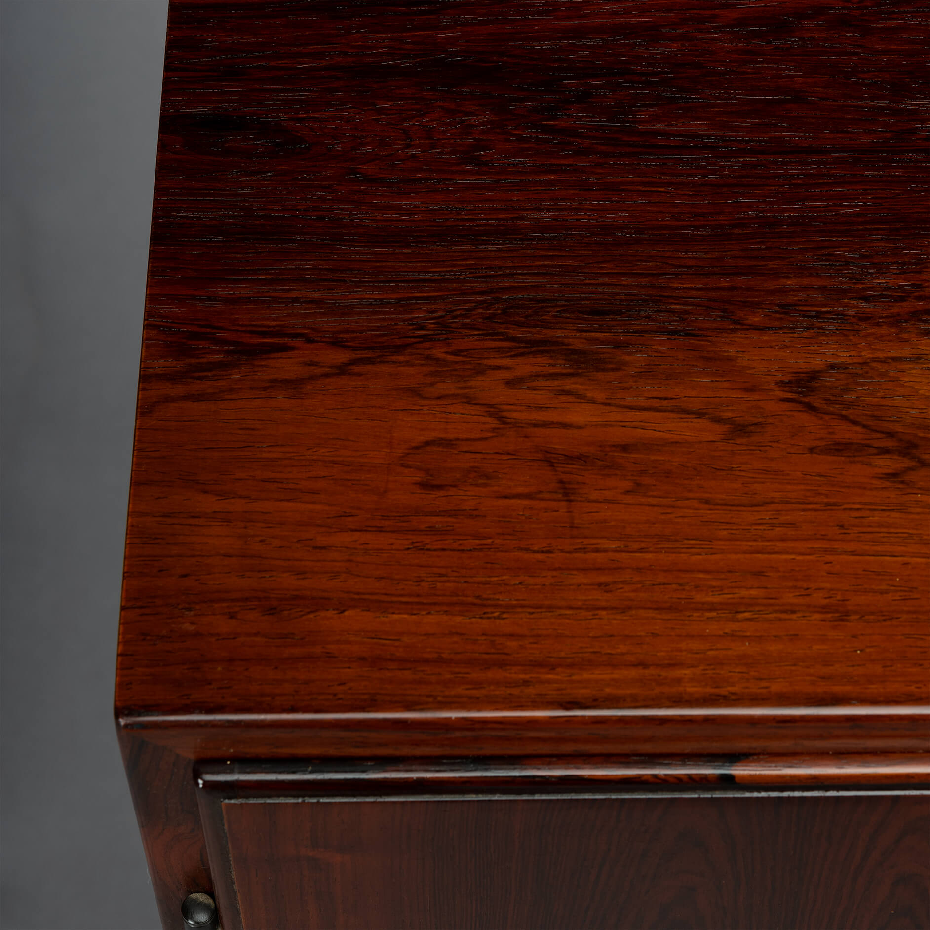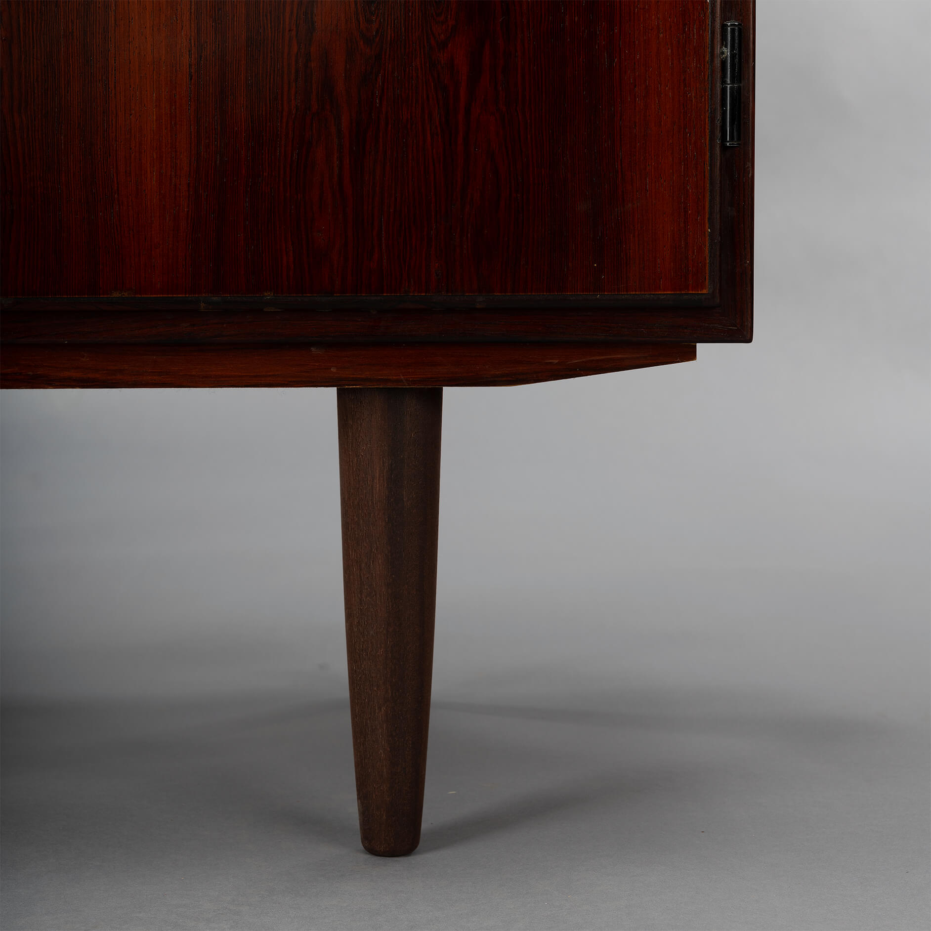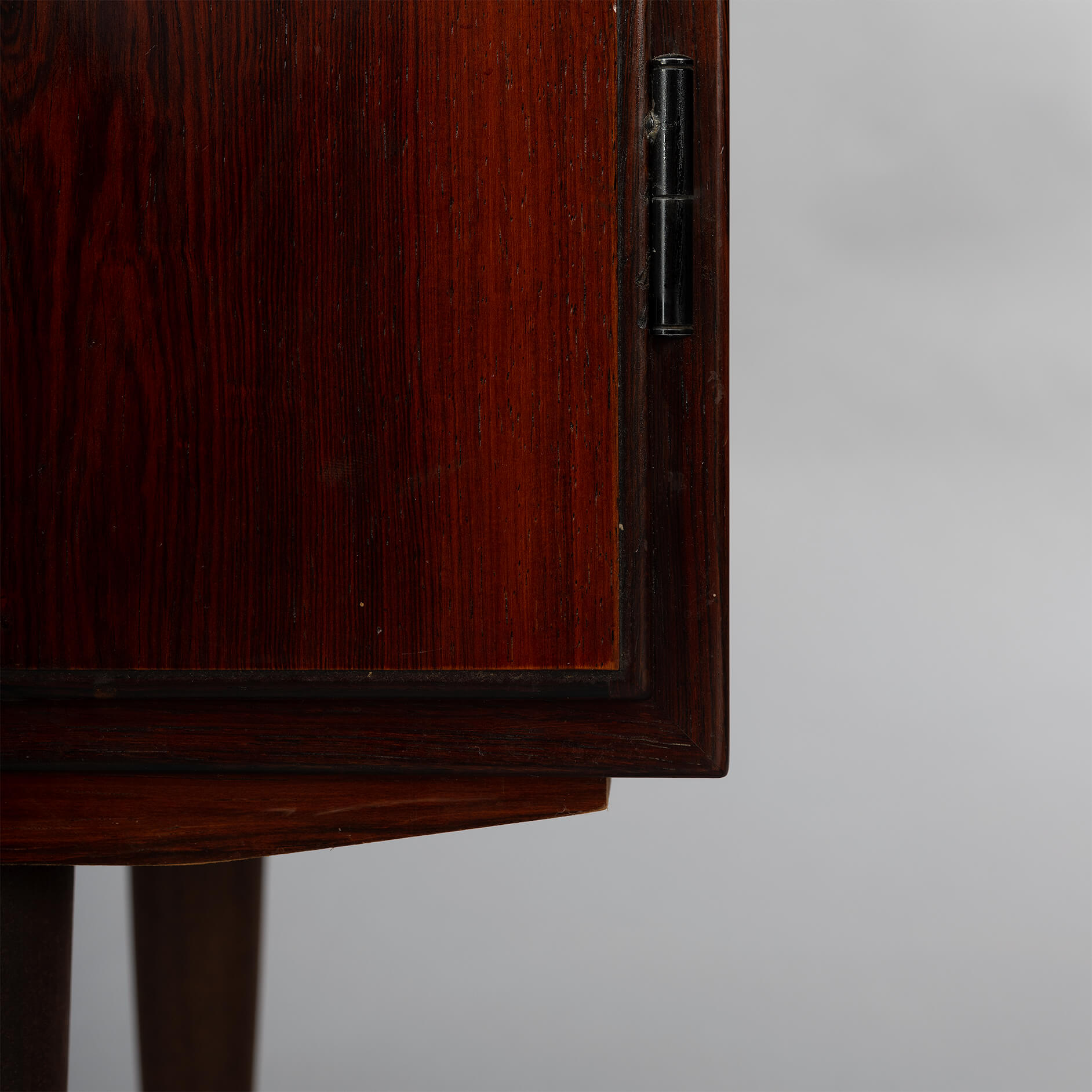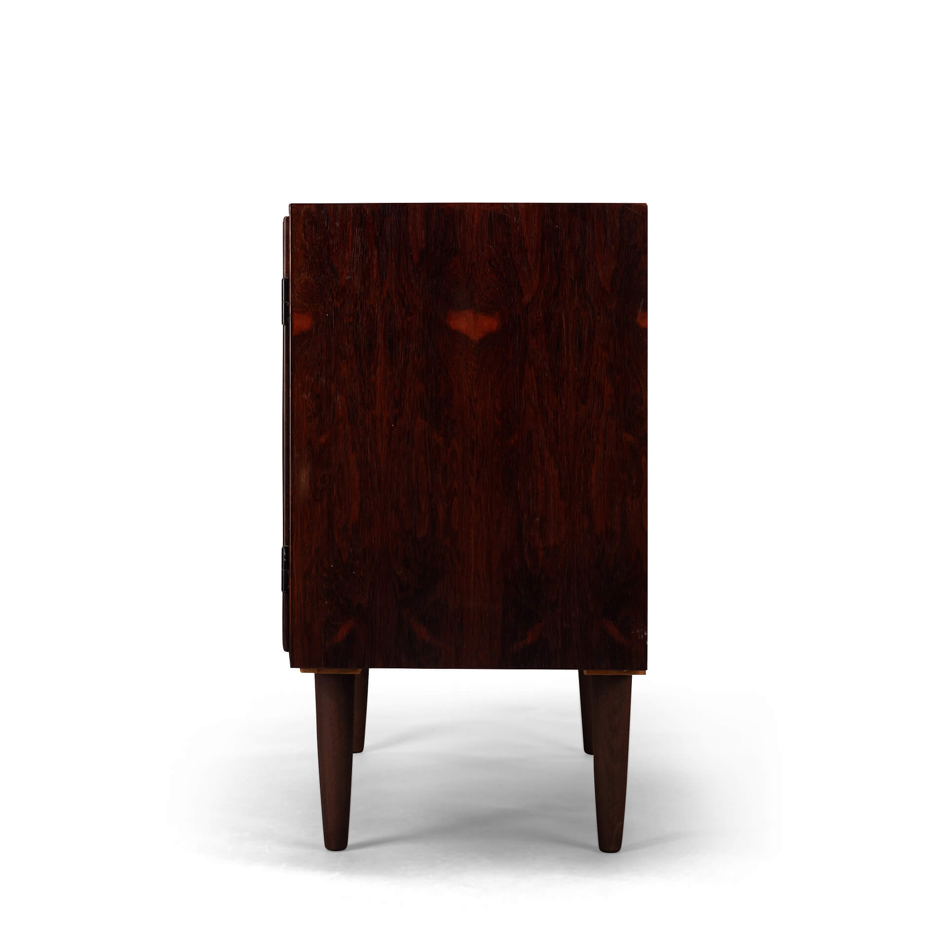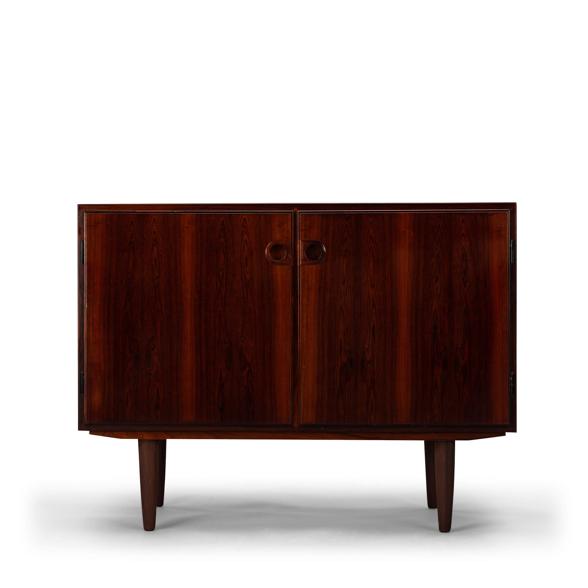 Klein palissander dressoir. Prachtige tekening van het hout en zeer bijzondere midcentury grepen! Een echte blikvanger vanger in de gang, studeerkamer of living. Deze kast heeft twee openslaande deuren.