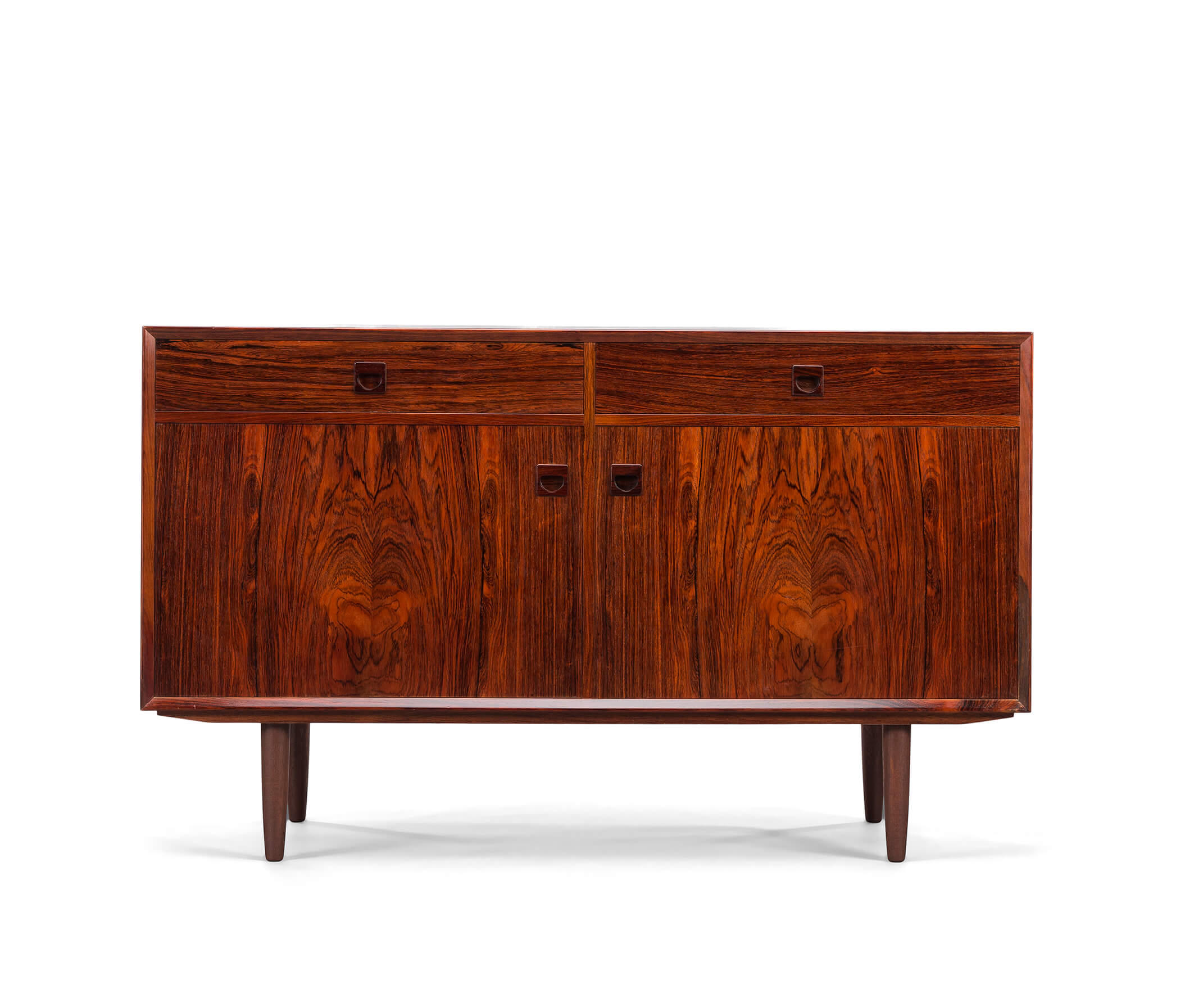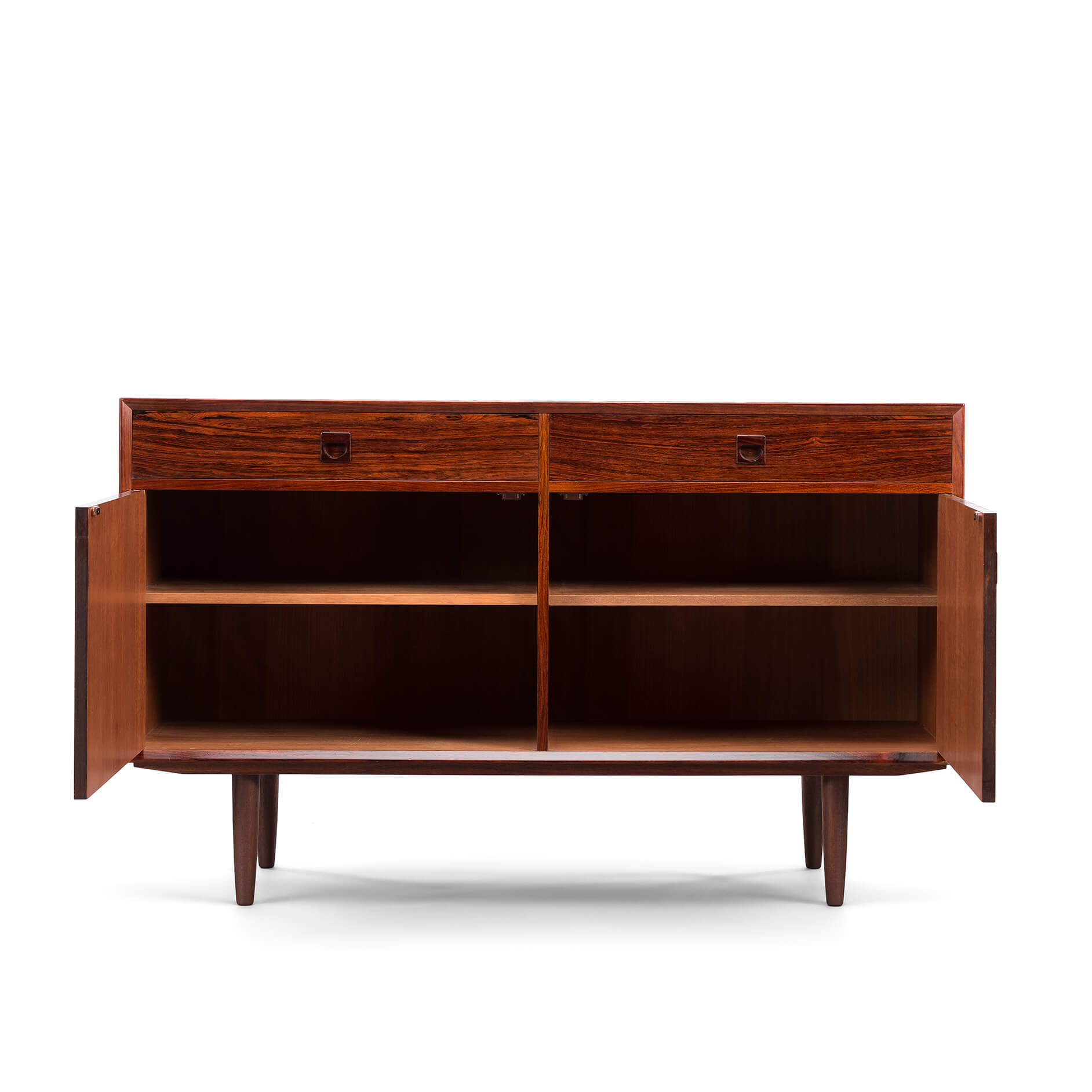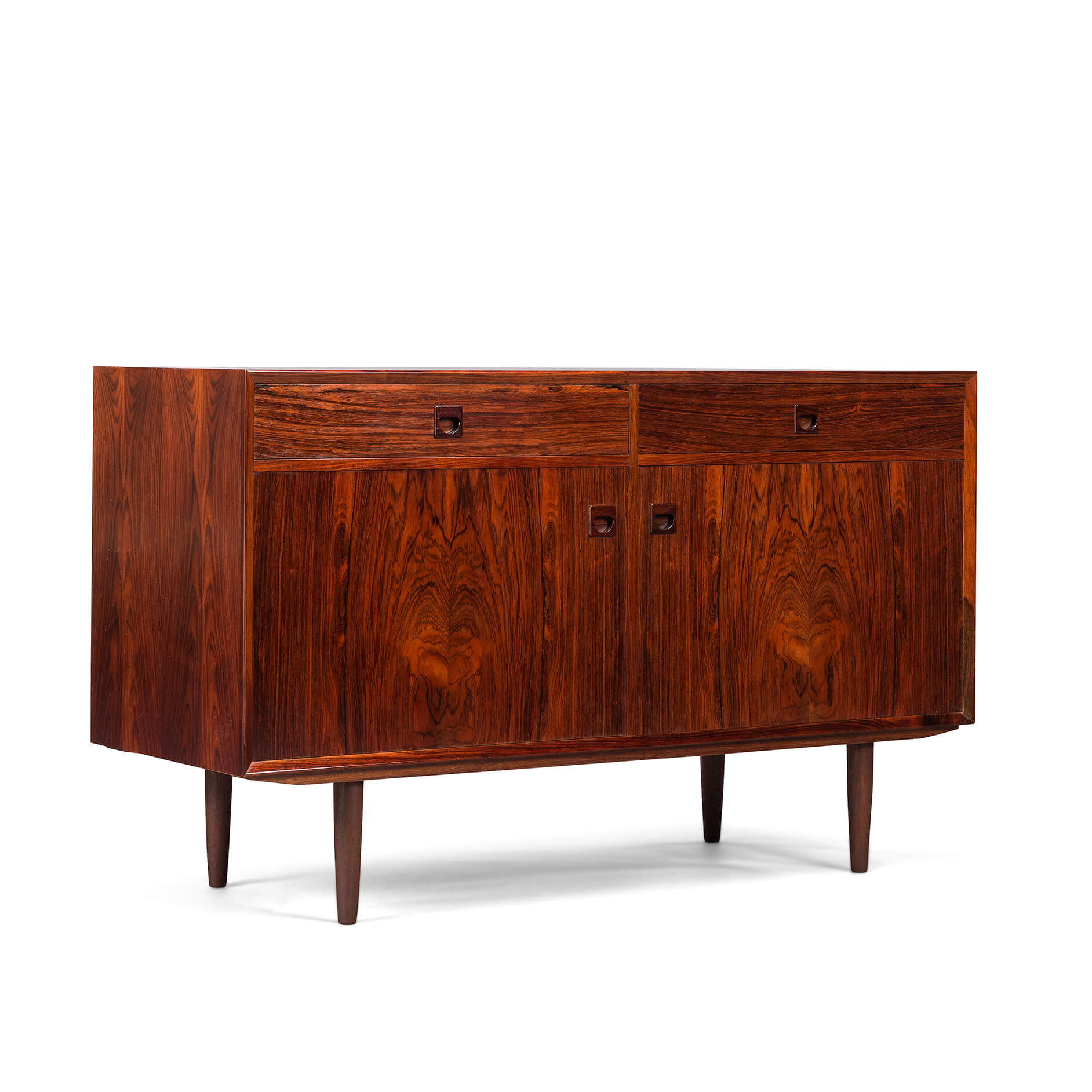 Rosewood! Oftewel Palissander in het Nederlands. Dit bescheiden dressoir, maar dan alleen in formaat, wordt gemaakt door de tekening en kleur van het hout. Een echte eye-catcher in een modern en licht interieur.