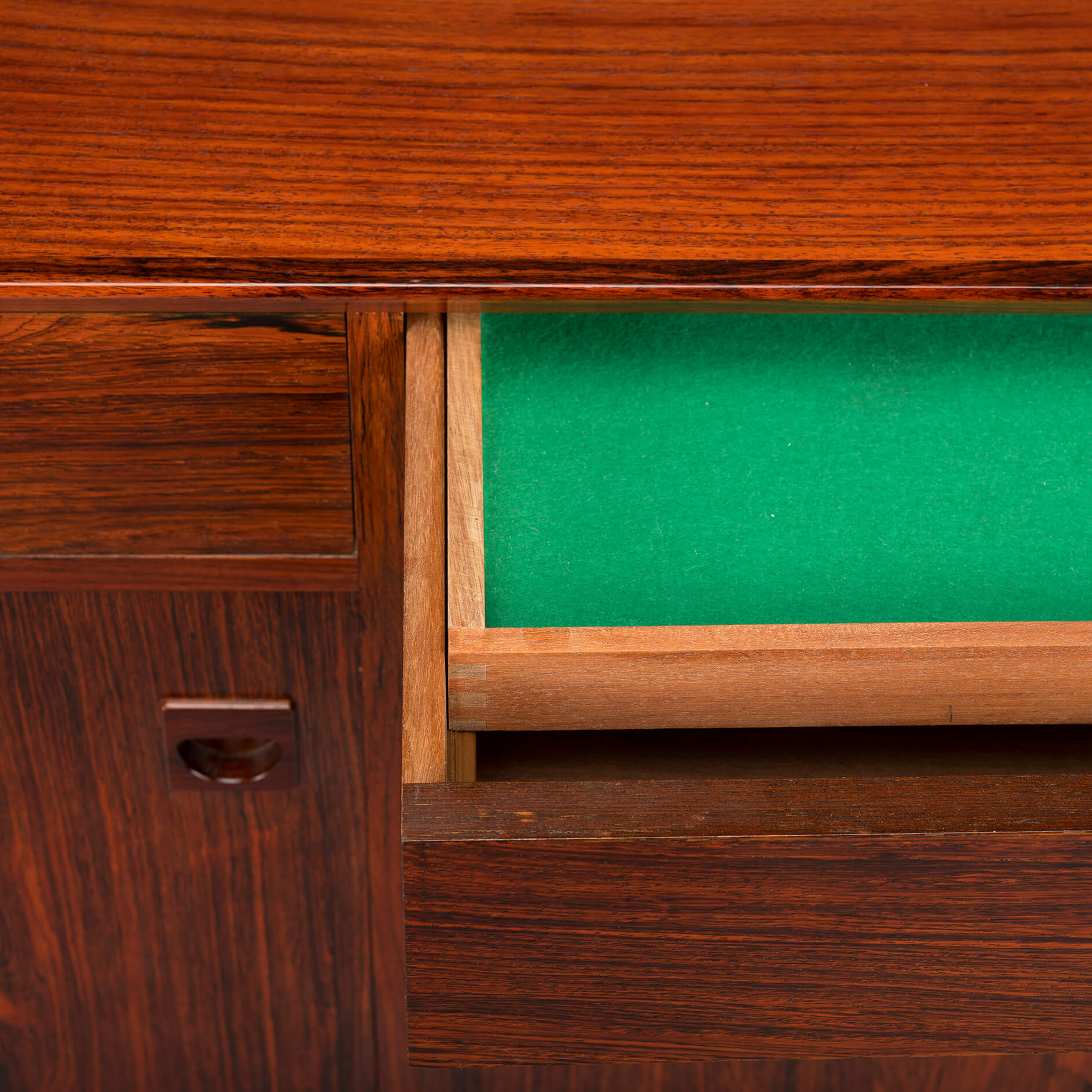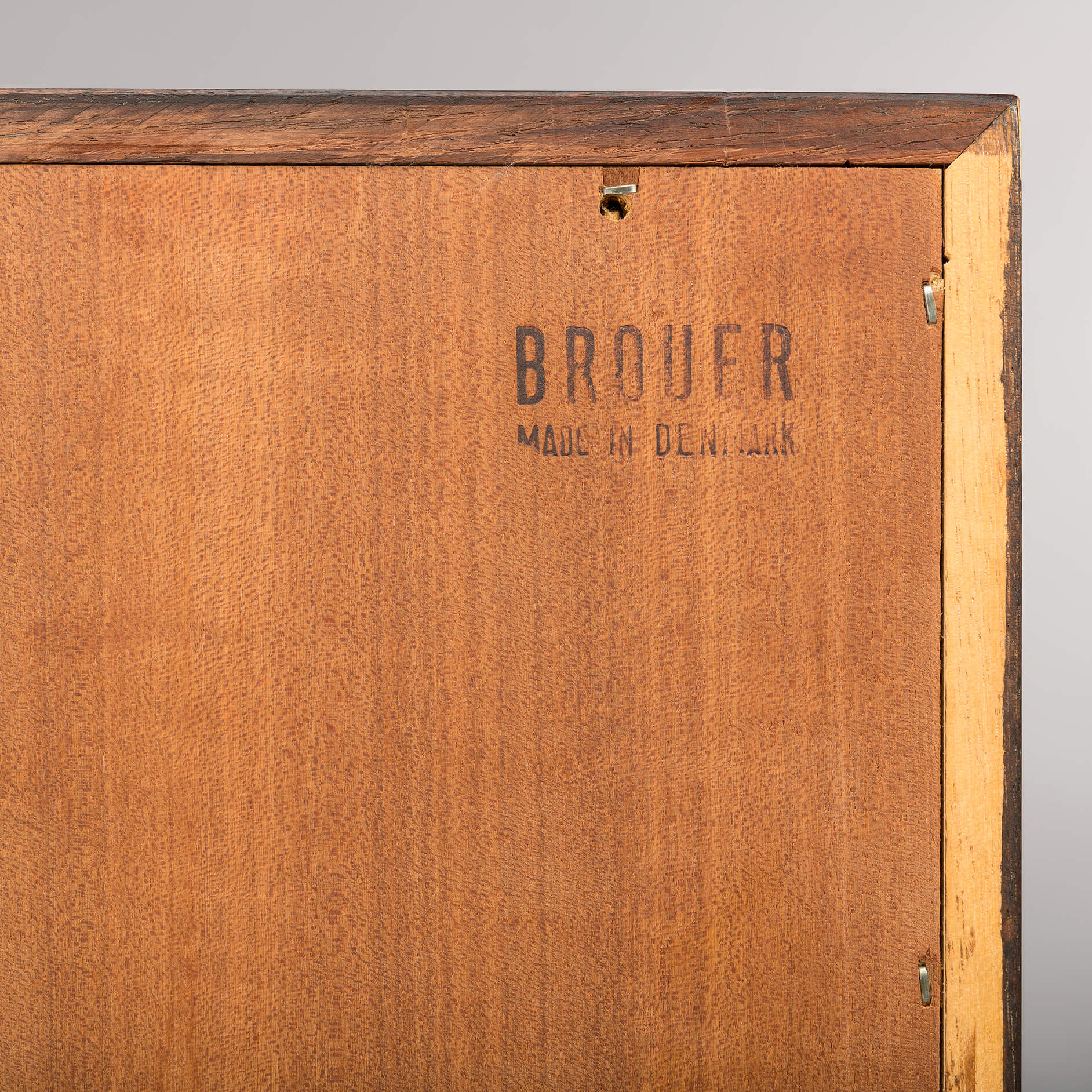 Het is de signature van Brouer: fantastische tekening in het hout en deze kleurtint, tegen donker warmrood aan. Het binnenwerk van de lades is gemaakt van een hardhout, zeer waarschijnlijk meranti. In de rechterla is een kleinere binnenla voor bestek te vinden voorzien van groen vilt. Achter de twee openslaande deuren zit een verstelbare plank, die er ook uit gehaald kan worden. Met enkele krassen en glans verschillen op de bovenkant, is deze kast in zeer goede vintage staat.