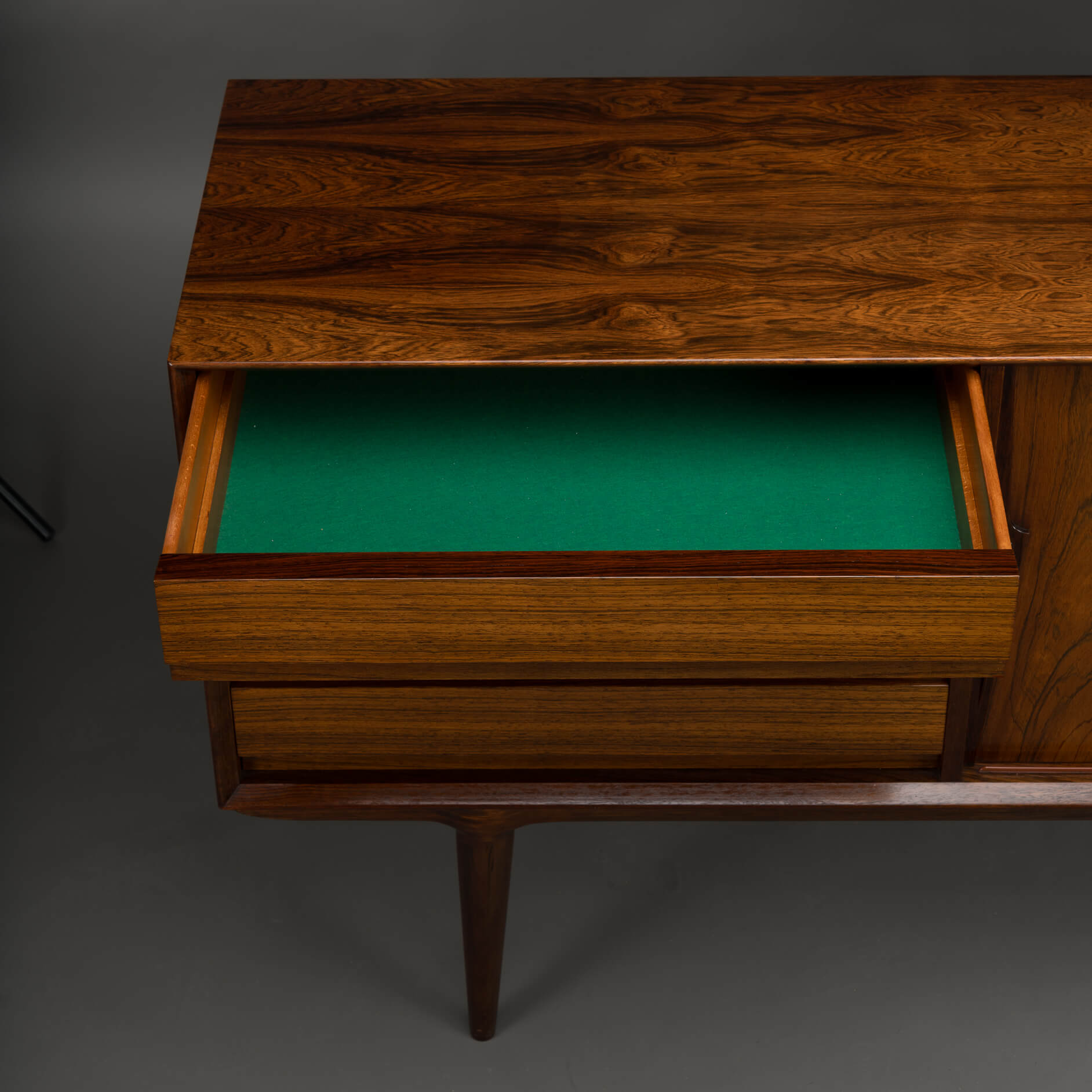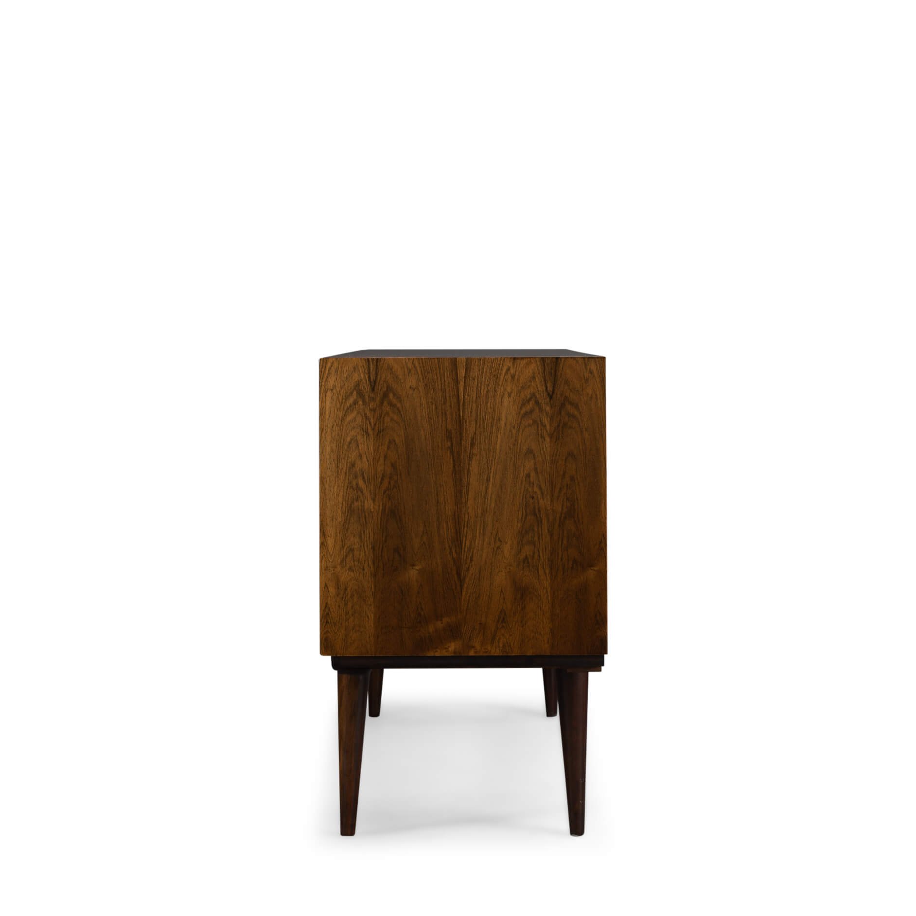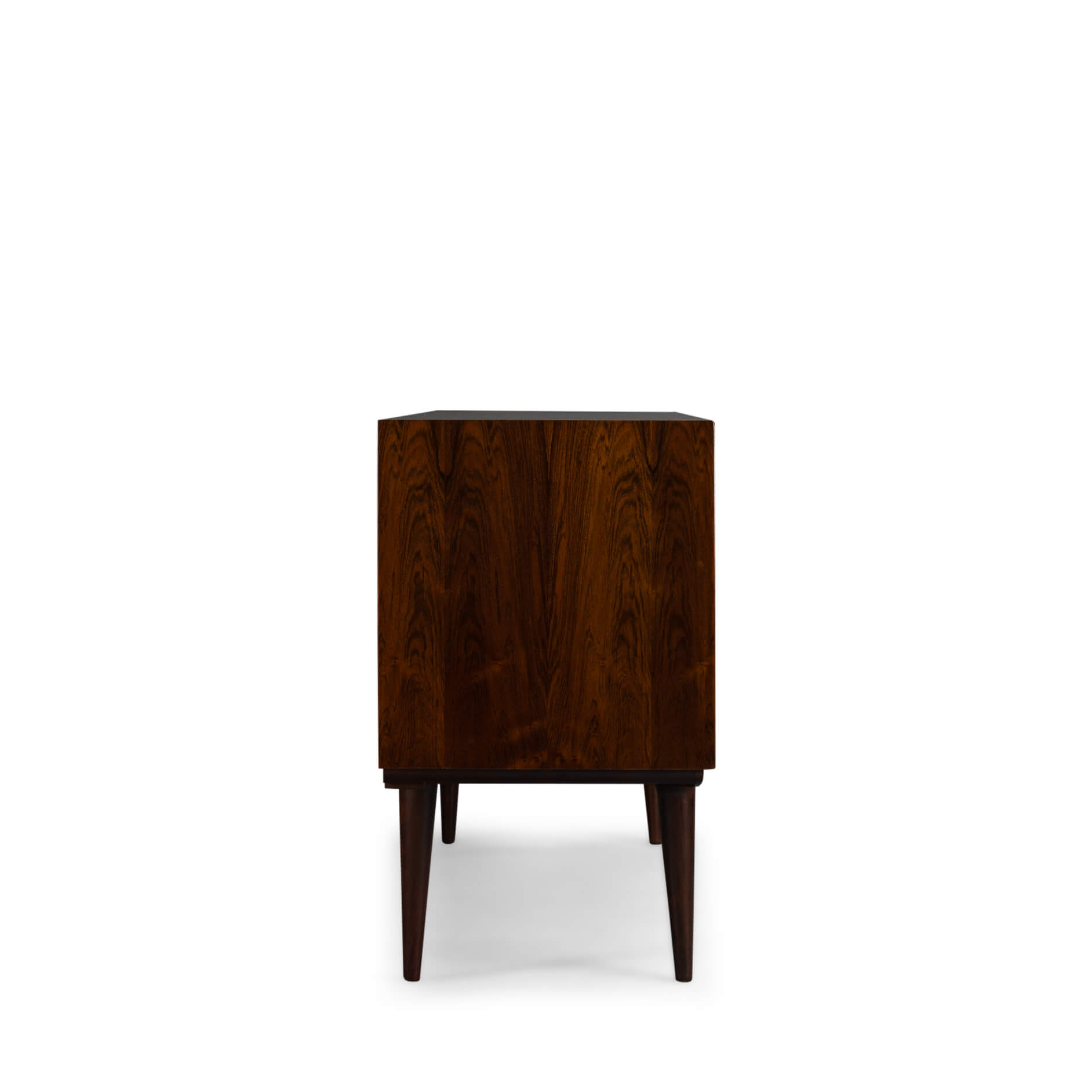 Classic! is dit Model 18 dressoir gedesigned door Gunni Omann. Met z'n zeer herkenbare stijl is dit vintage design masterpiece bepalend voor de vibe van je interieur. Zeer hoog kwalitatief in afwerkingsgraad. Door het gebruik van hoogwaardige materialen brengt deze kast een compromisloos Deens design signatuur in je woning. Het dressoir is uitgevoerd in een subtiel getint palissander met een symmetrische tekening. Verder heeft dit credenza een ladeblok en schuifdeur gedeelte. De vier robuust uitgevoerde lades zijn voorzien van een massief beuken binnenwerk.
