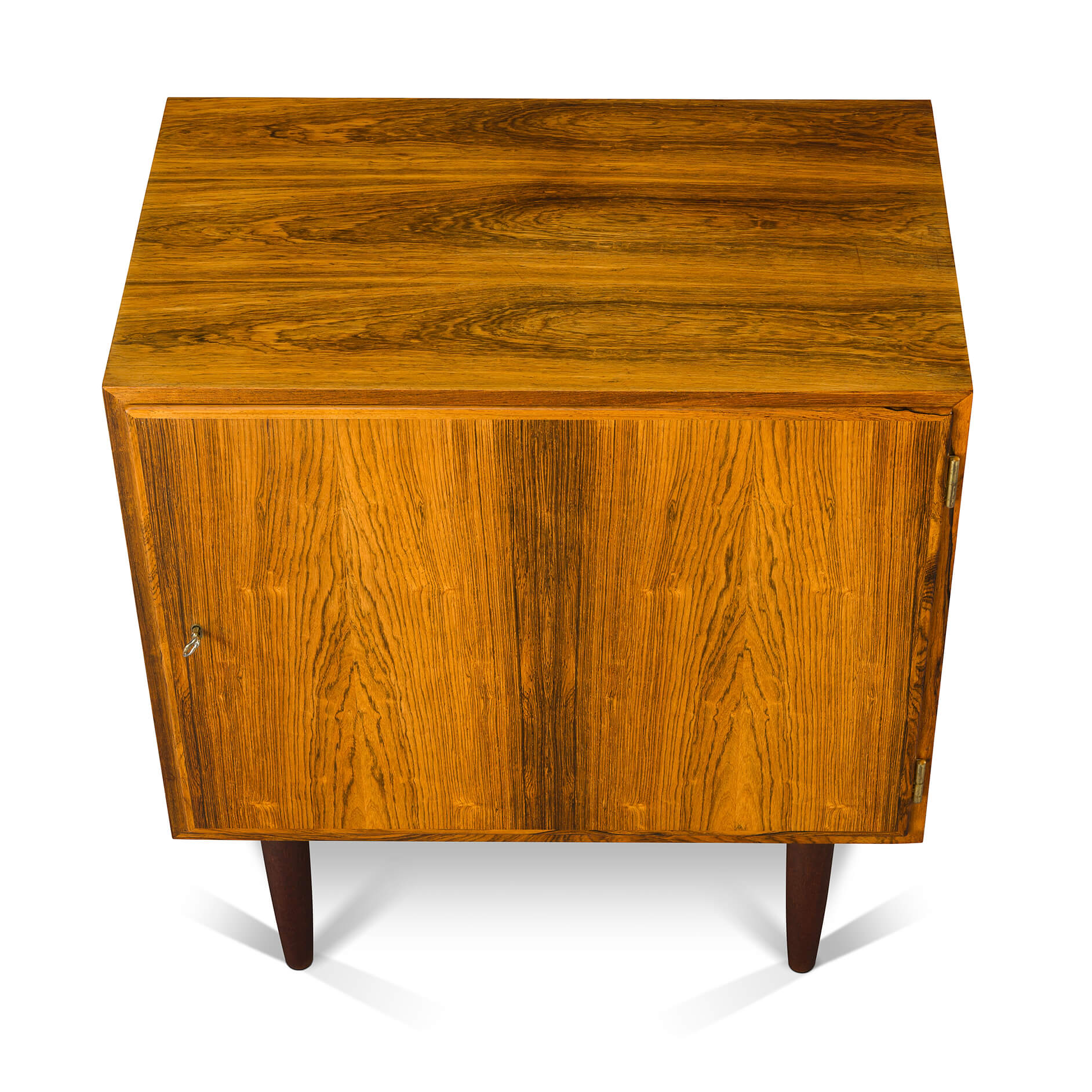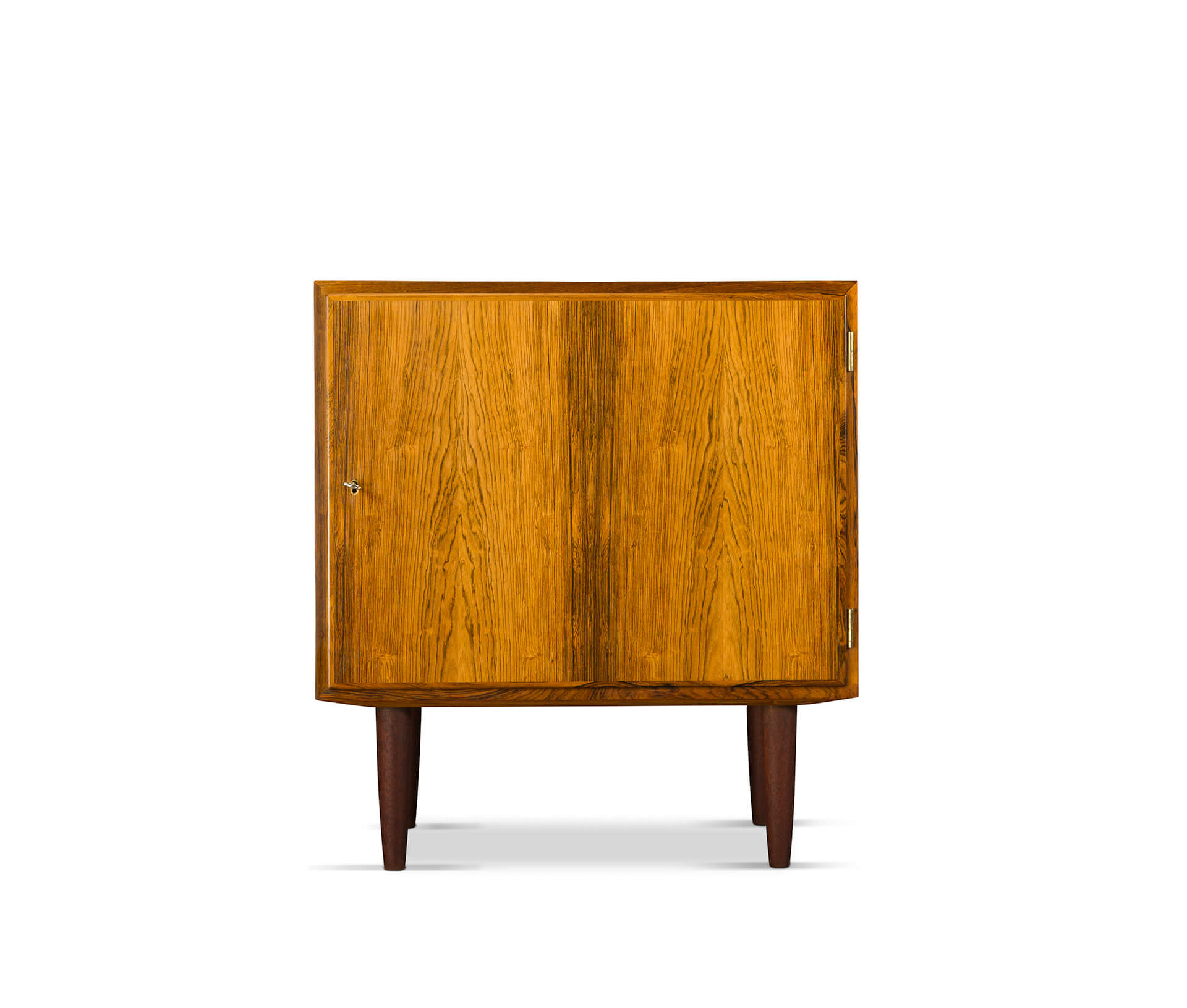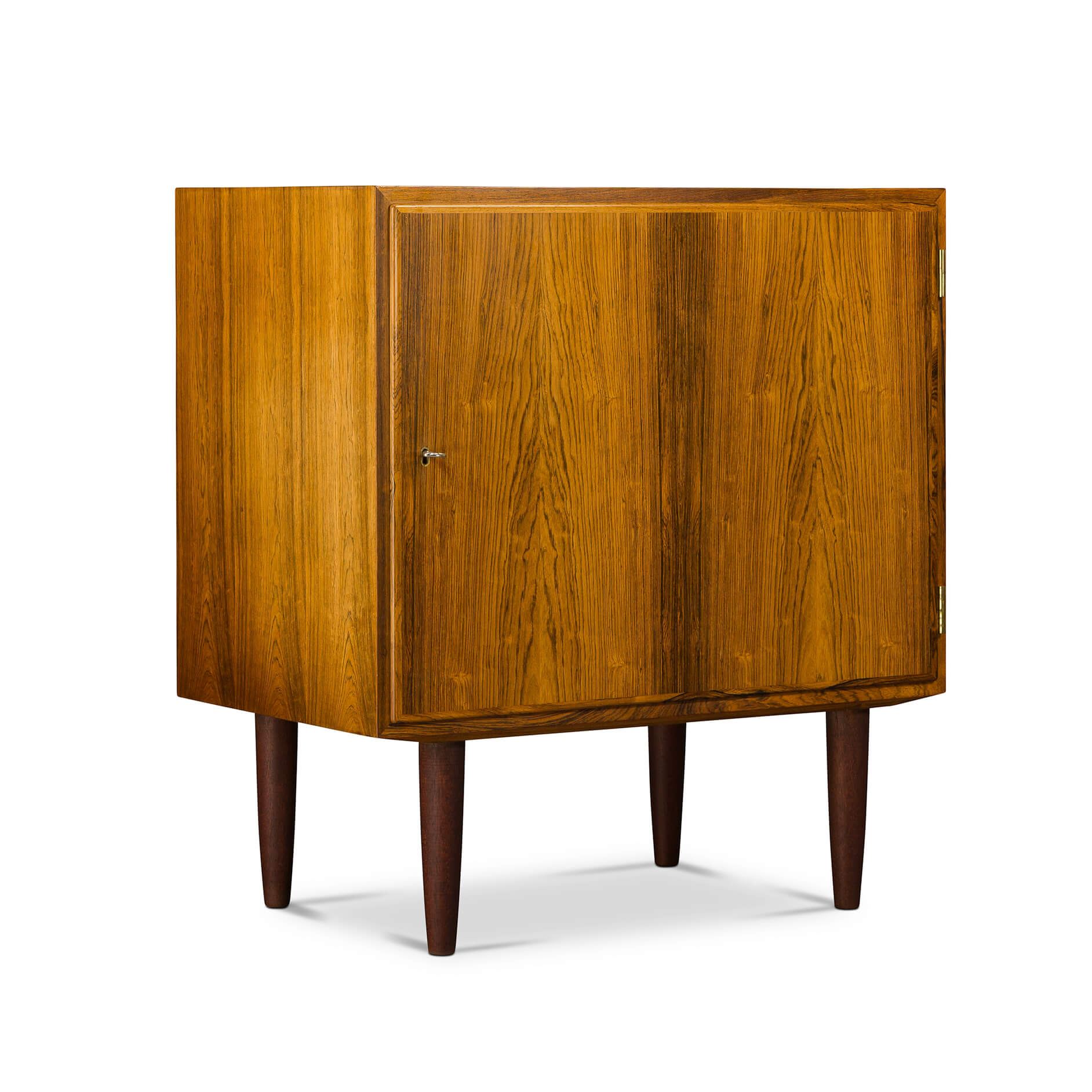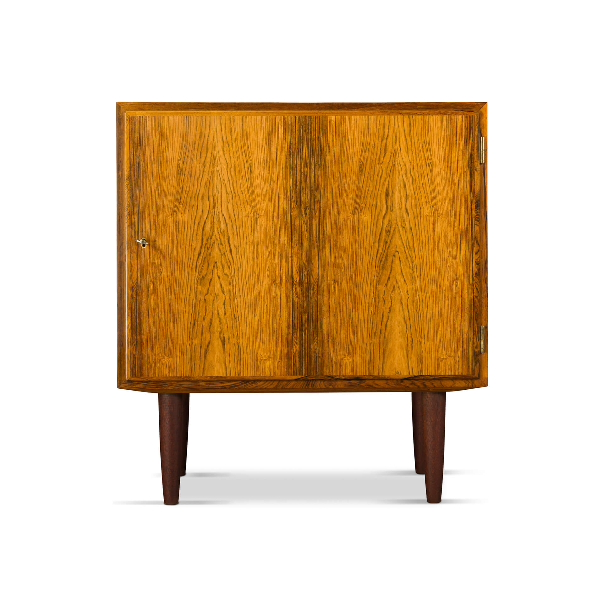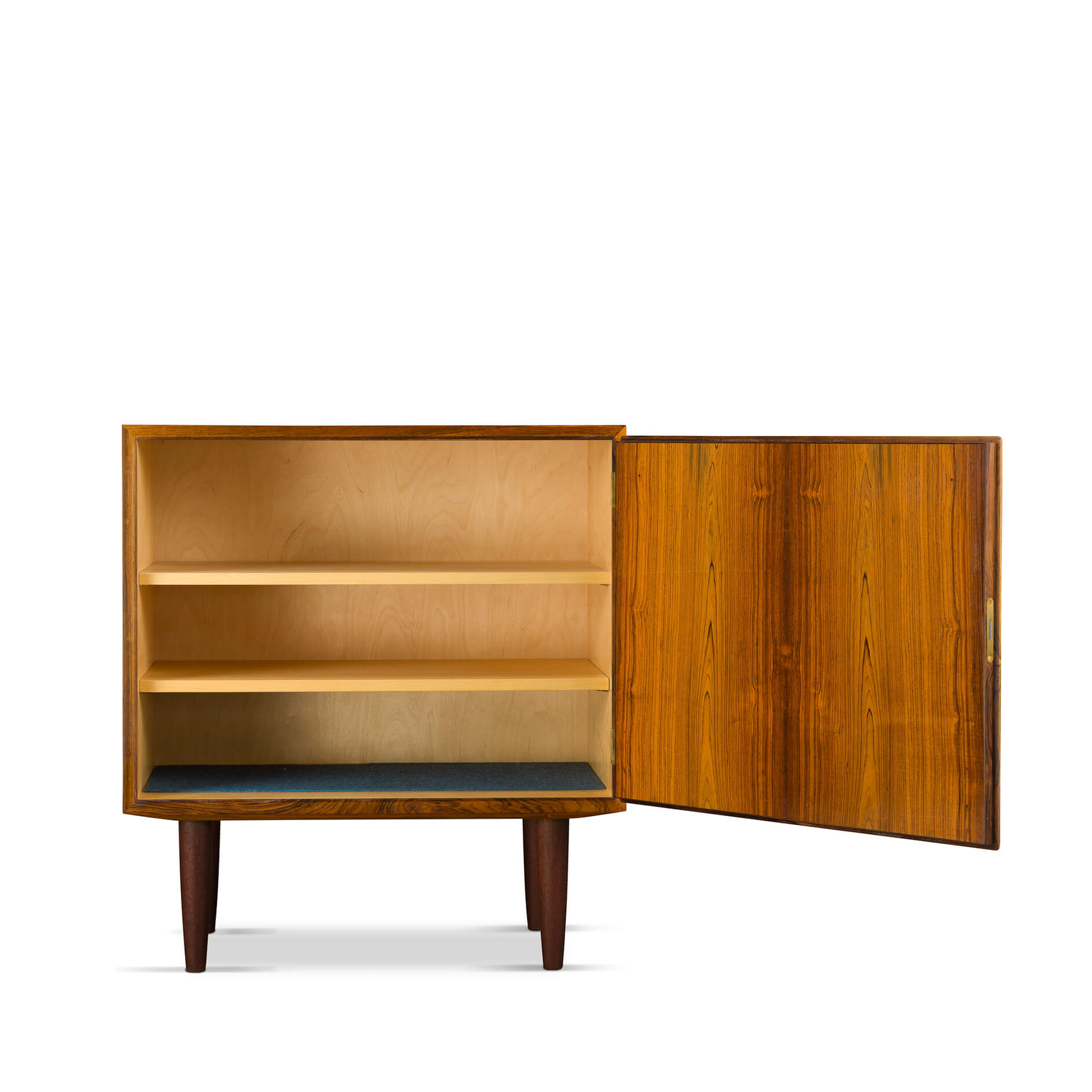 Mid-century modern klein dressoir designed by Carlo Jensen en gemaakt door Hundevad & Co. Deze palissander kast heeft één deur en daarachter twee in hoogte verstelbare planken. Het palissander hout heeft een prachtige print en kleur en dat allemaal in zeer goede vintage conditie!