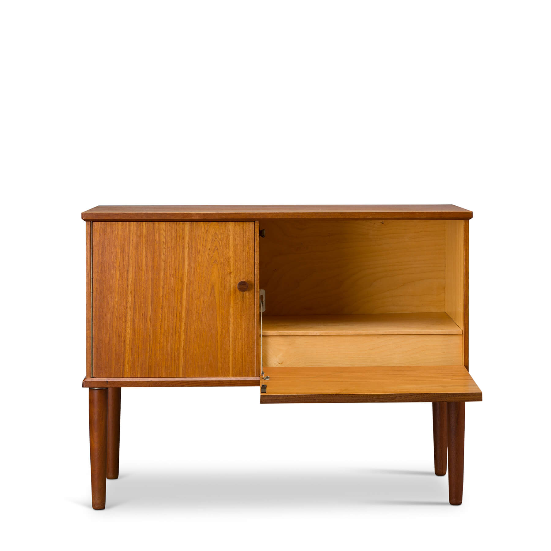 Uitgevoerd in teak en hoogwaardig afgewerkt met facet randen uit massief teak hinten naar een hoge graad van afwerking. Elegant gesneden knopje op de deur en een greepje op de klep balanceren het geheel.