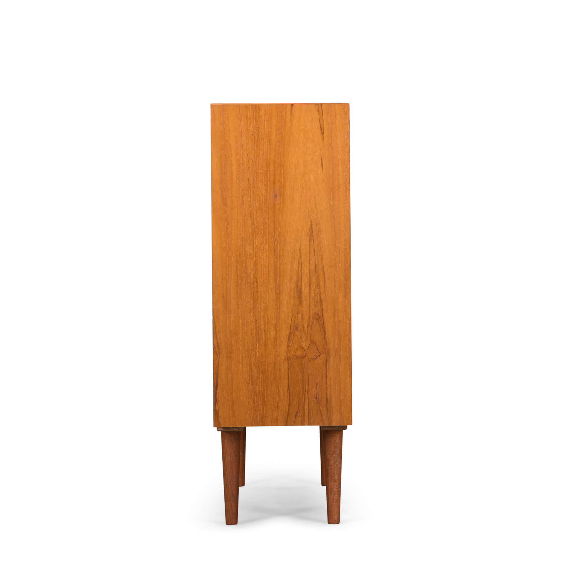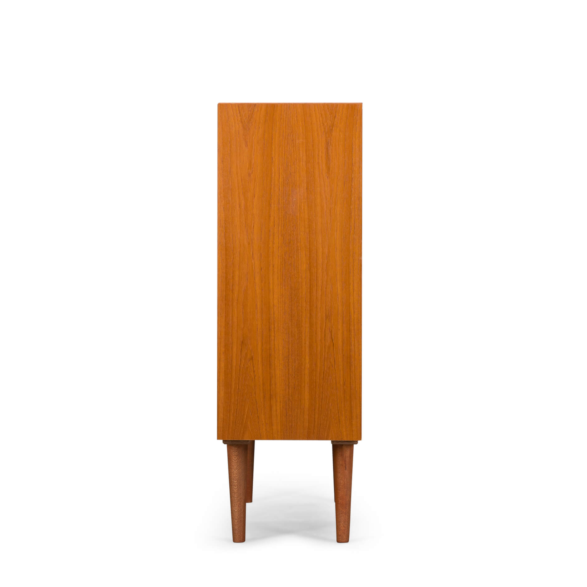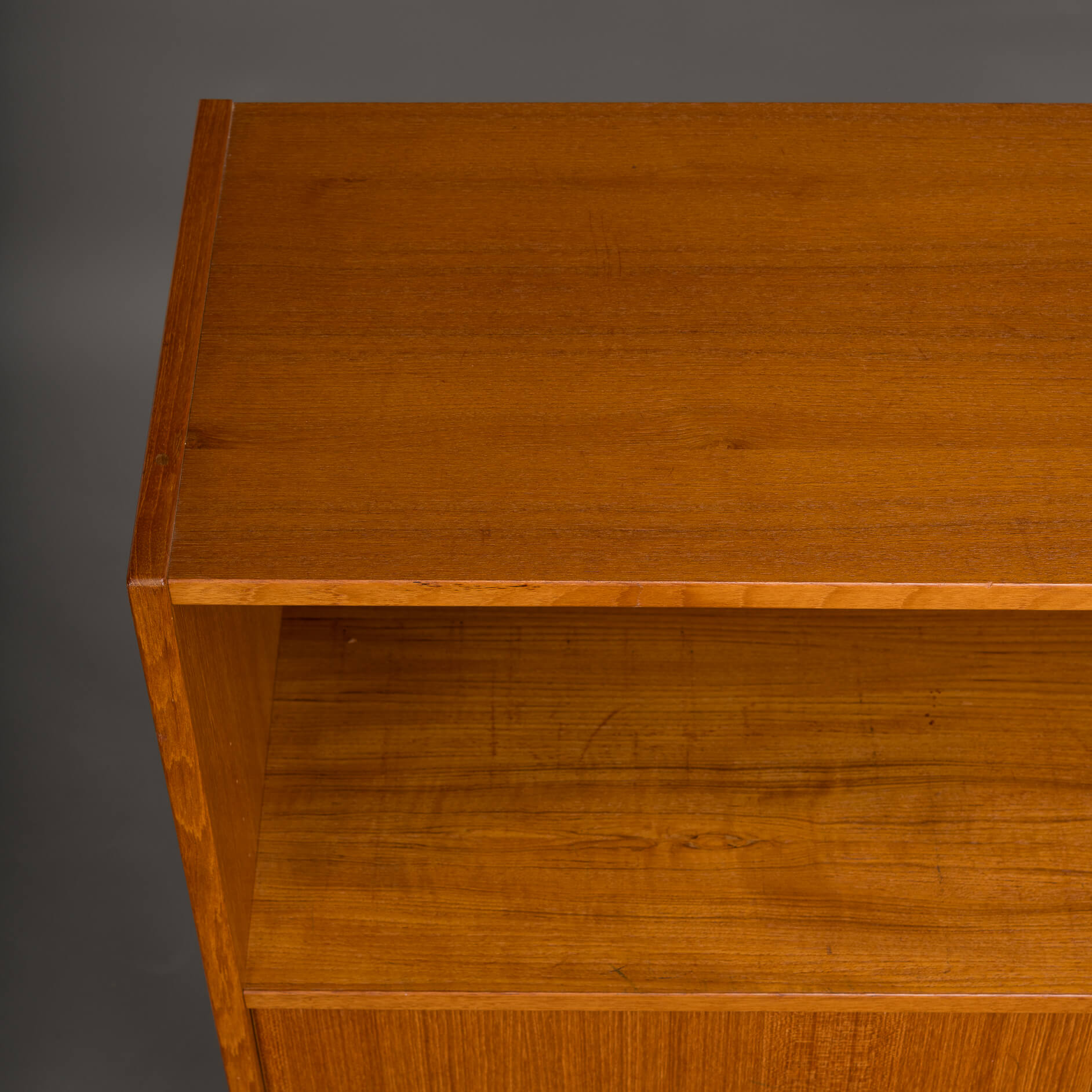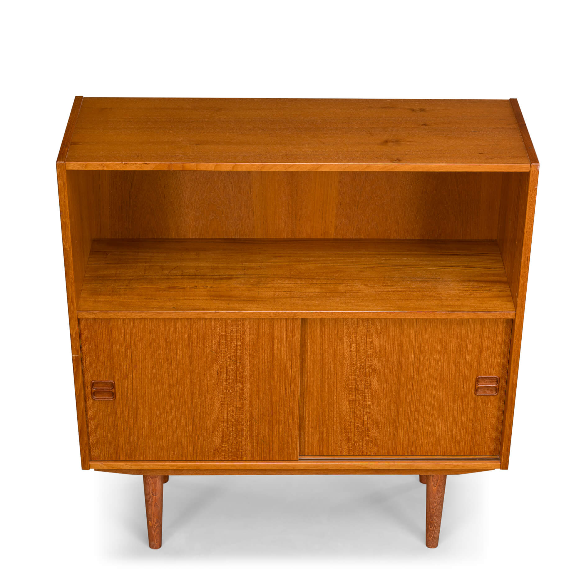 Deens mid century klein dressoir of boekenkastje in mooi teak fineer gemaakt door Bornholms Møbelfabrik, herkenbaar aan de greepjes. Deze kast uit midden jaren 70 heeft 1 boekenplank, en een onderste gedeelte met twee schuifdeurtjes.