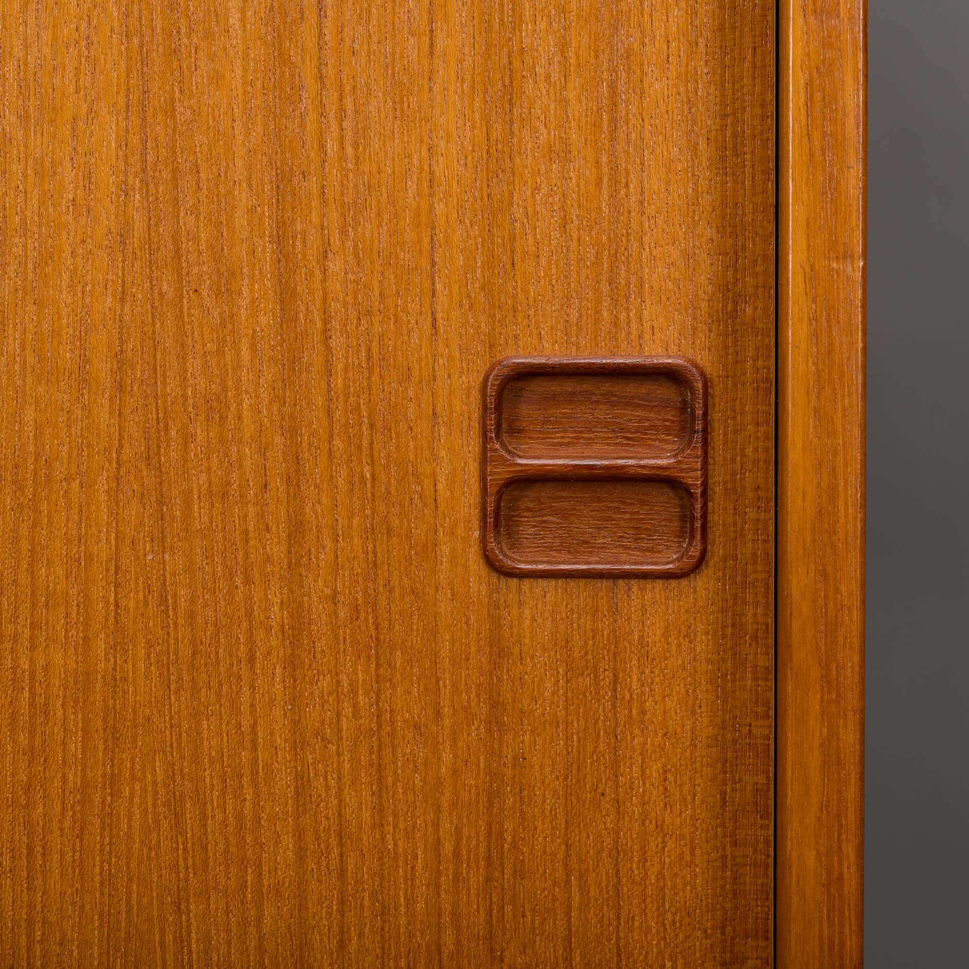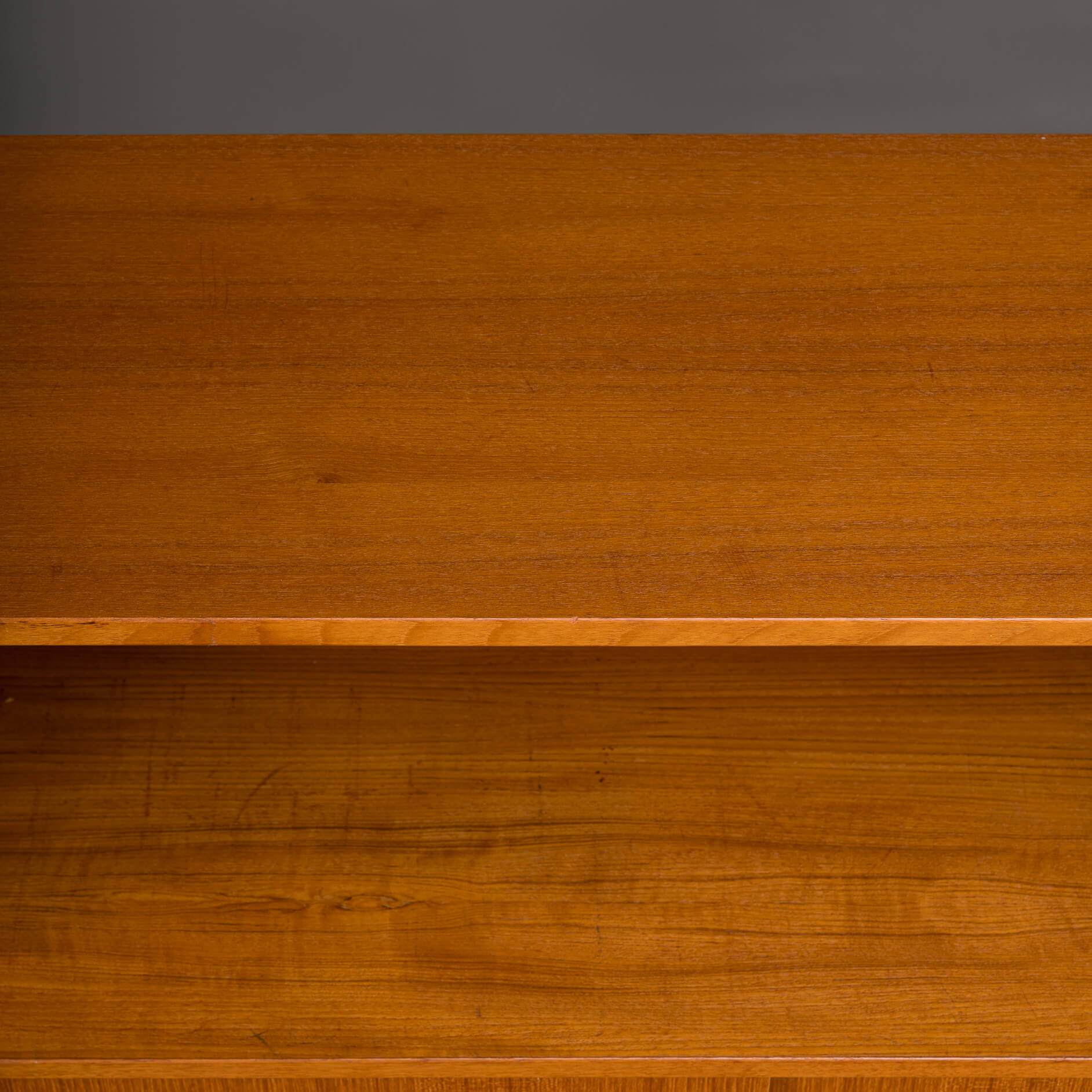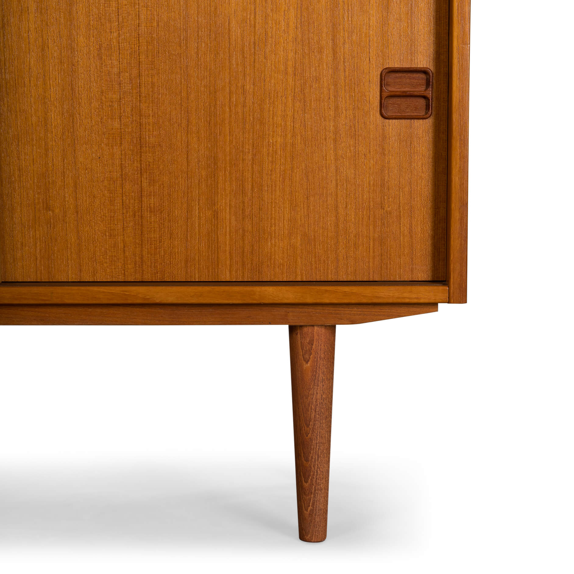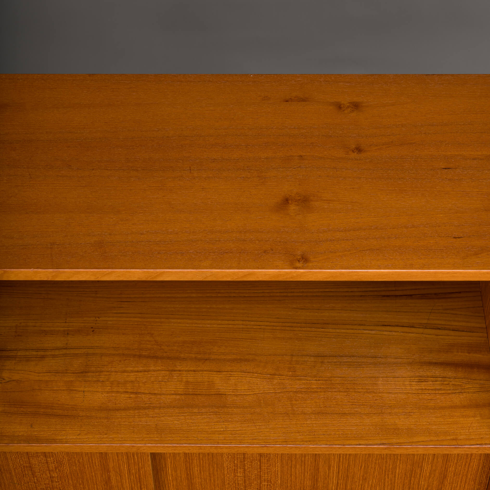 Deens mid century klein dressoir of boekenkastje in mooi teak fineer gemaakt door Bornholms Møbelfabrik, herkenbaar aan de greepjes. Deze kast uit midden jaren 70 heeft 1 boekenplank, en een onderste gedeelte met twee schuifdeurtjes.