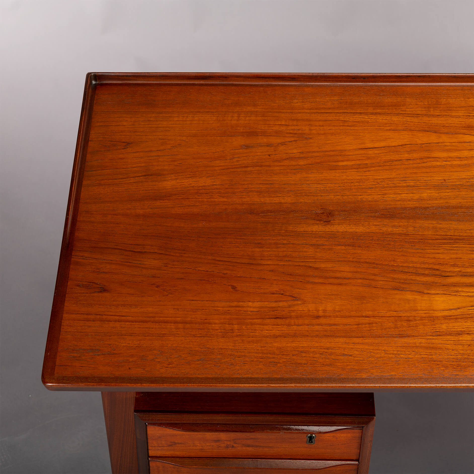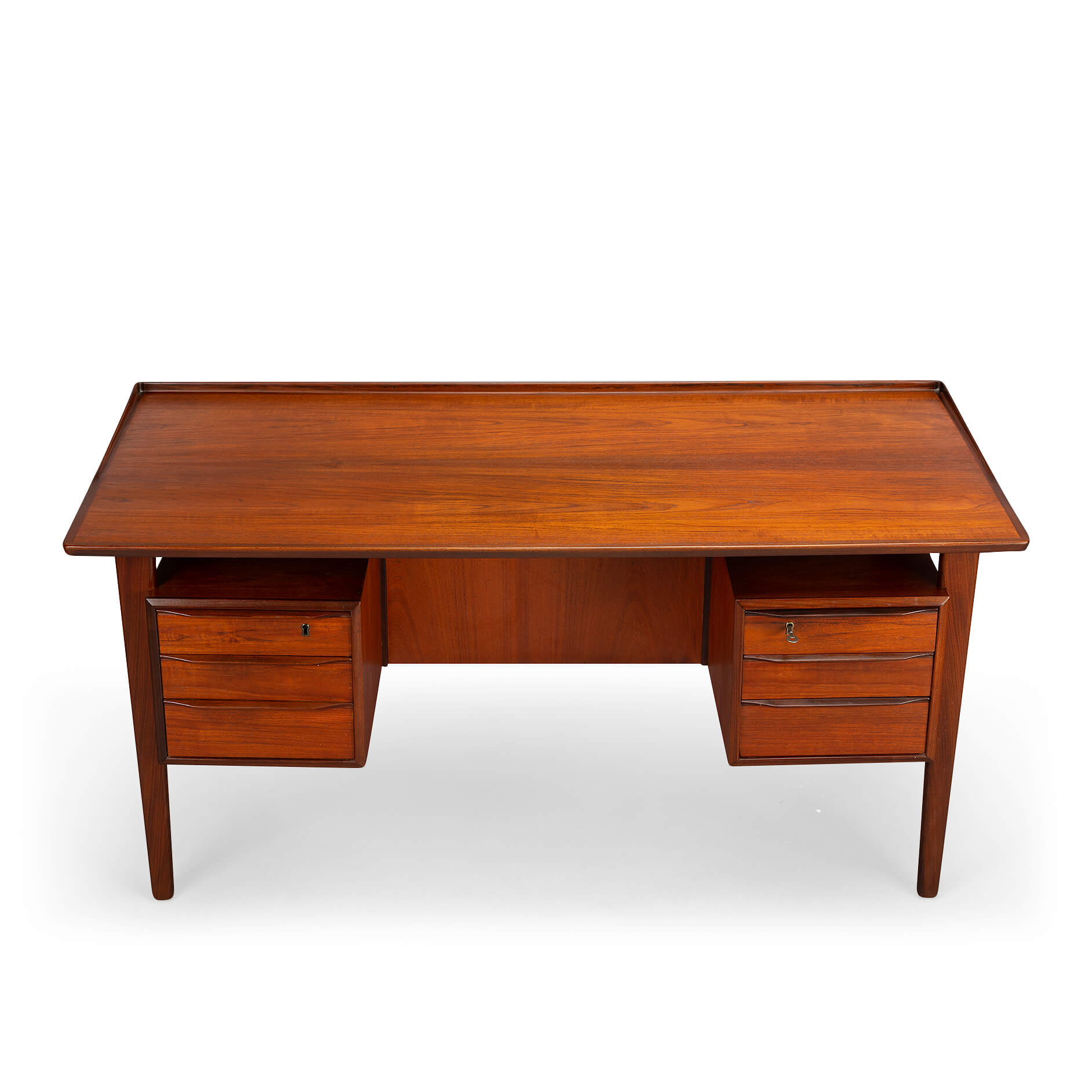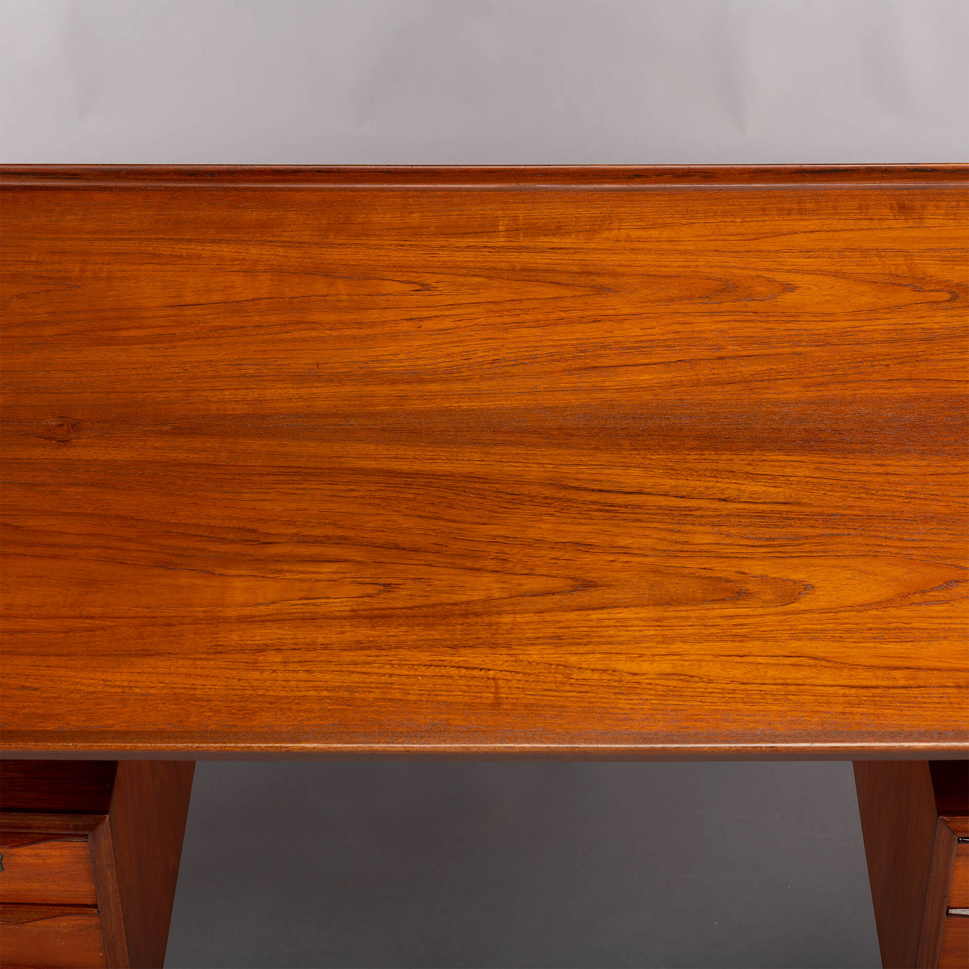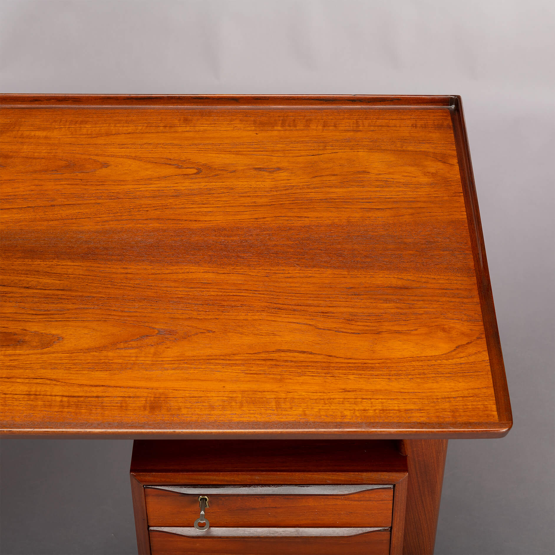 Dit teak buro is het item voor een stijlvol home office. Aan weerszijde heb je een ladeblok met drie lades waarvan de bovenste afsluitbaar is. Aan de achterkant van het buro is plek voor boeken wat het ook mogelijk maakt om dit buro centraal te plaatsen in een ruimte. Het blad heeft aan een zijde een opstaande rand die mooi terug loopt aan de zijkanten. Deze rand is gemaakt in massief teak evenals de poten en dit alles geeft het buro een hoge kwaliteit en afwerking.