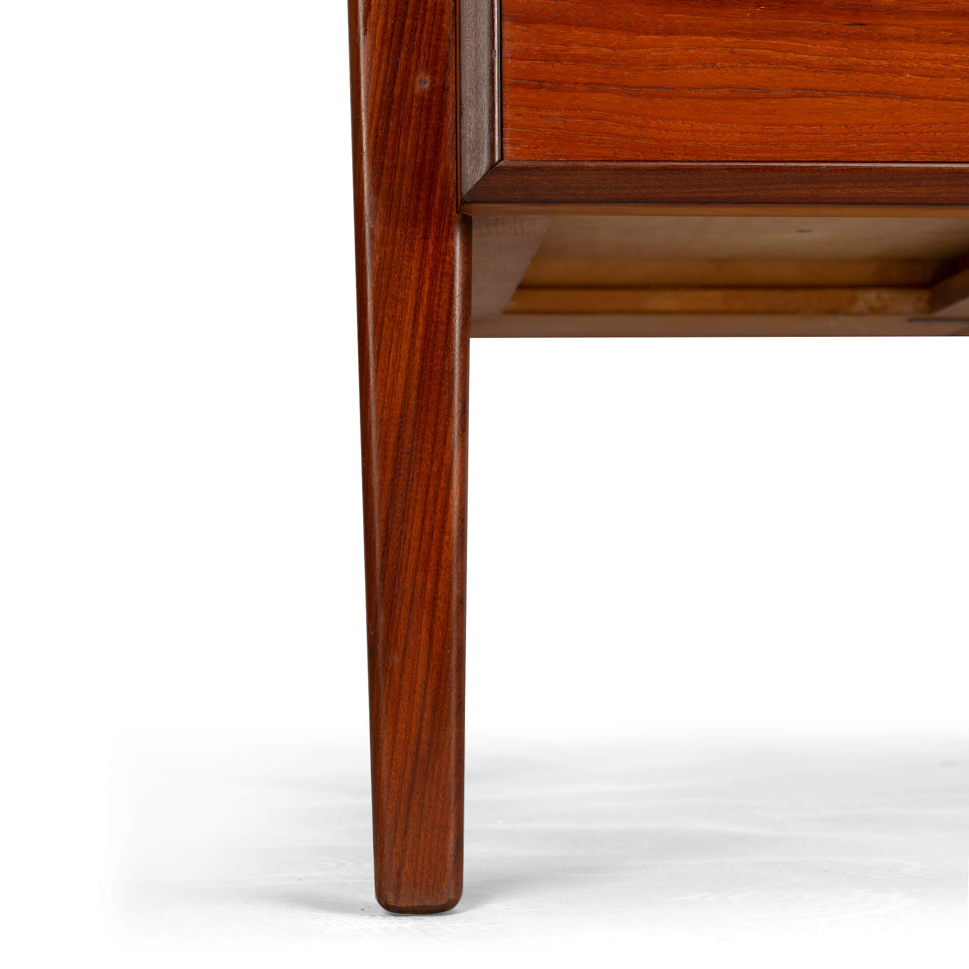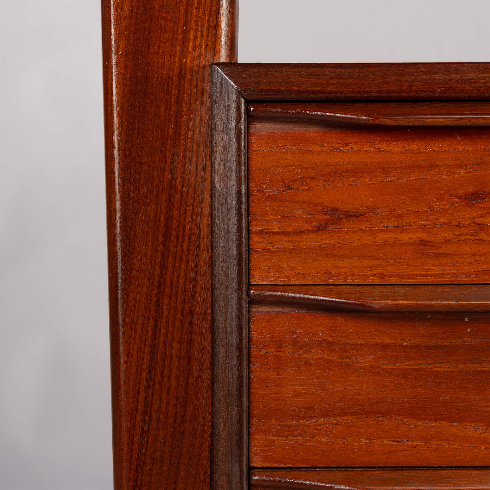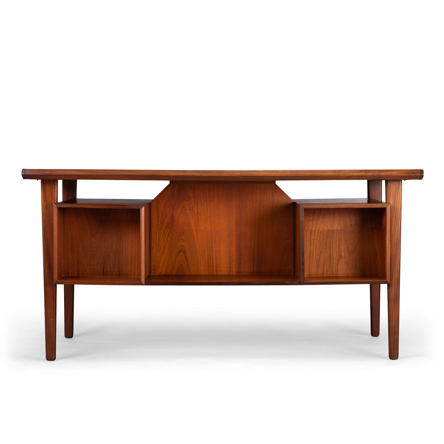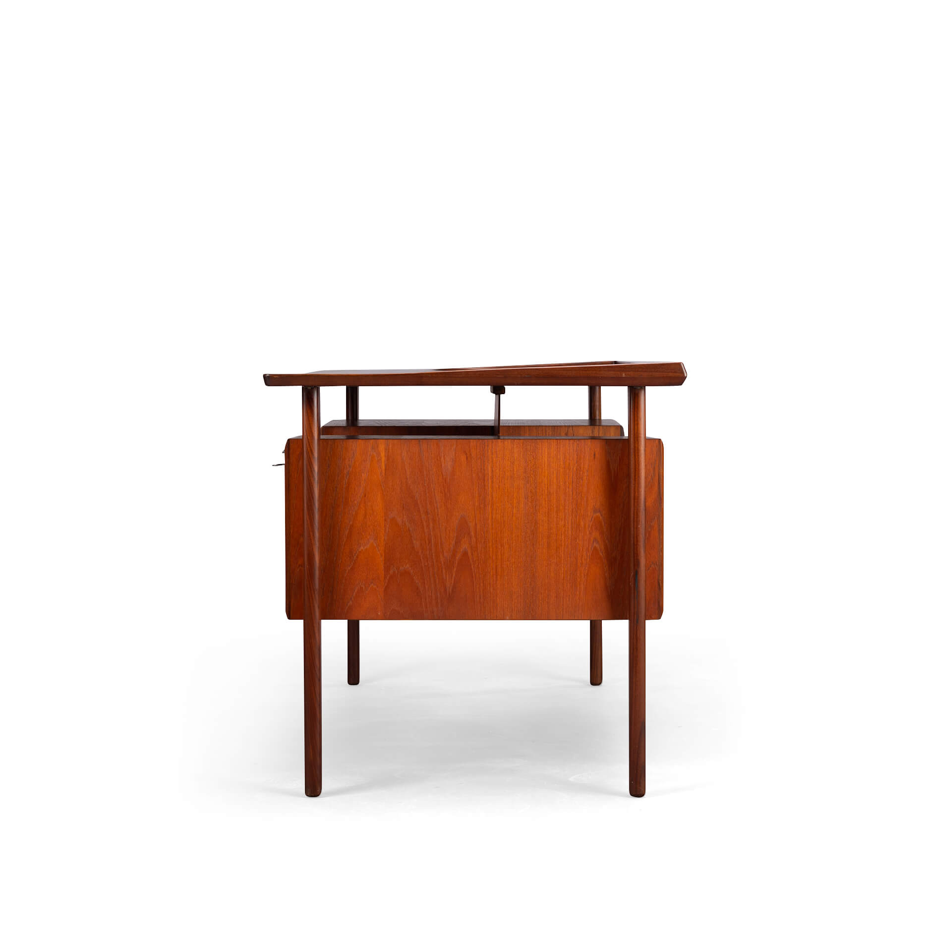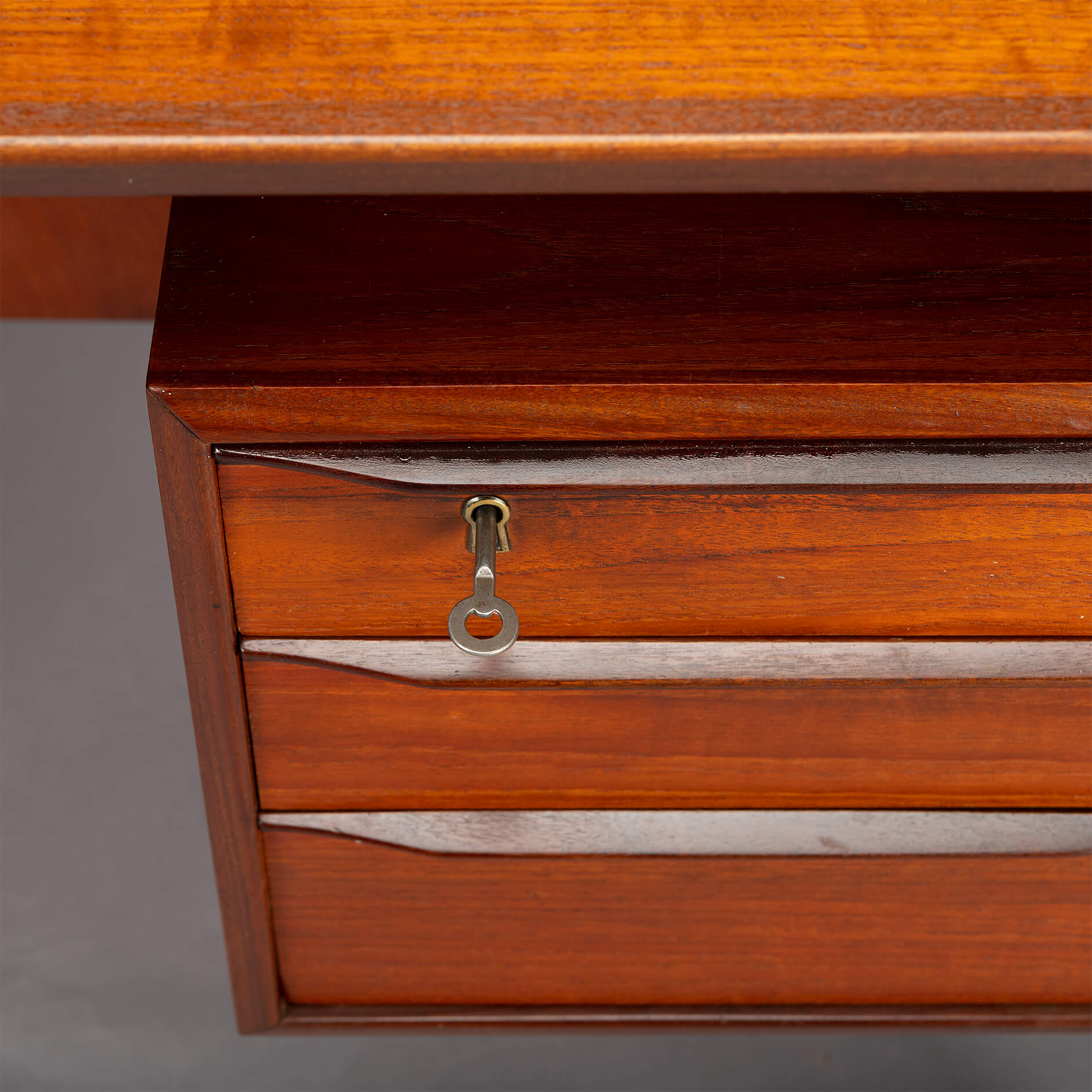 Dit teak buro is het item voor een stijlvol home office. Aan weerszijde heb je een ladeblok met drie lades waarvan de bovenste afsluitbaar is. Aan de achterkant van het buro is plek voor boeken wat het ook mogelijk maakt om dit buro centraal te plaatsen in een ruimte. Het blad heeft aan een zijde een opstaande rand die mooi terug loopt aan de zijkanten. Deze rand is gemaakt in massief teak evenals de poten en dit alles geeft het buro een hoge kwaliteit en afwerking.