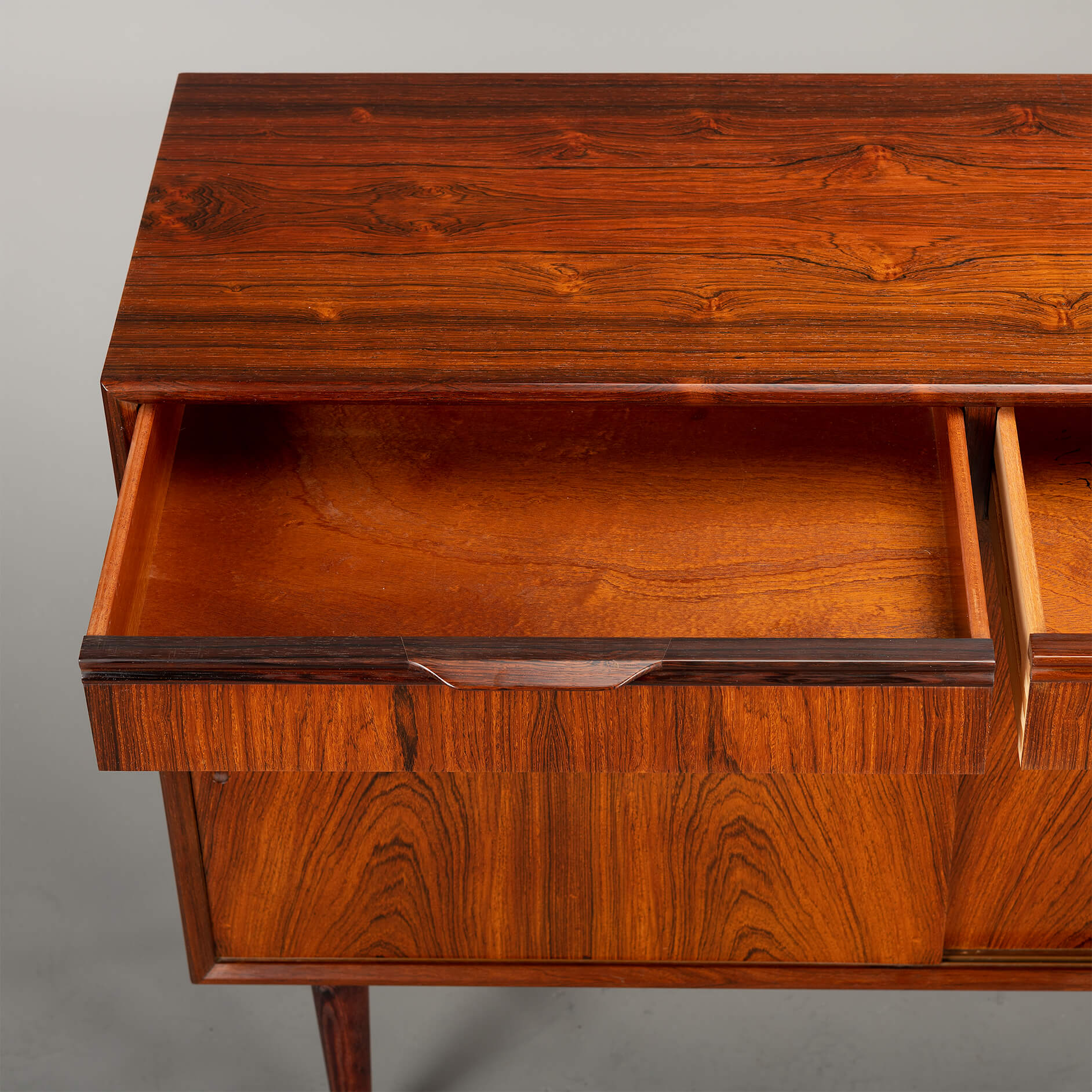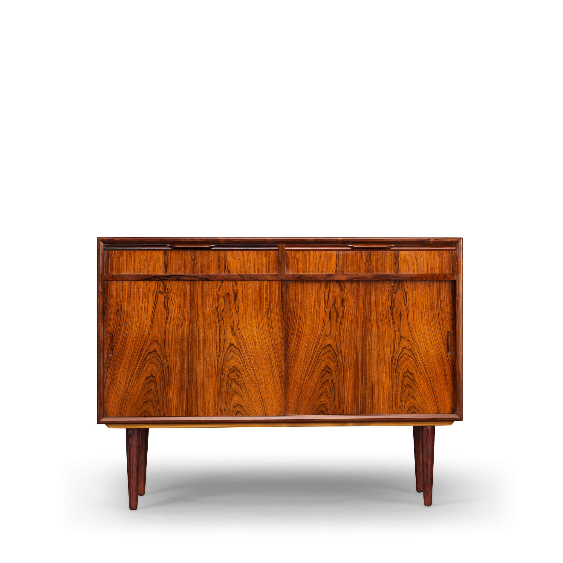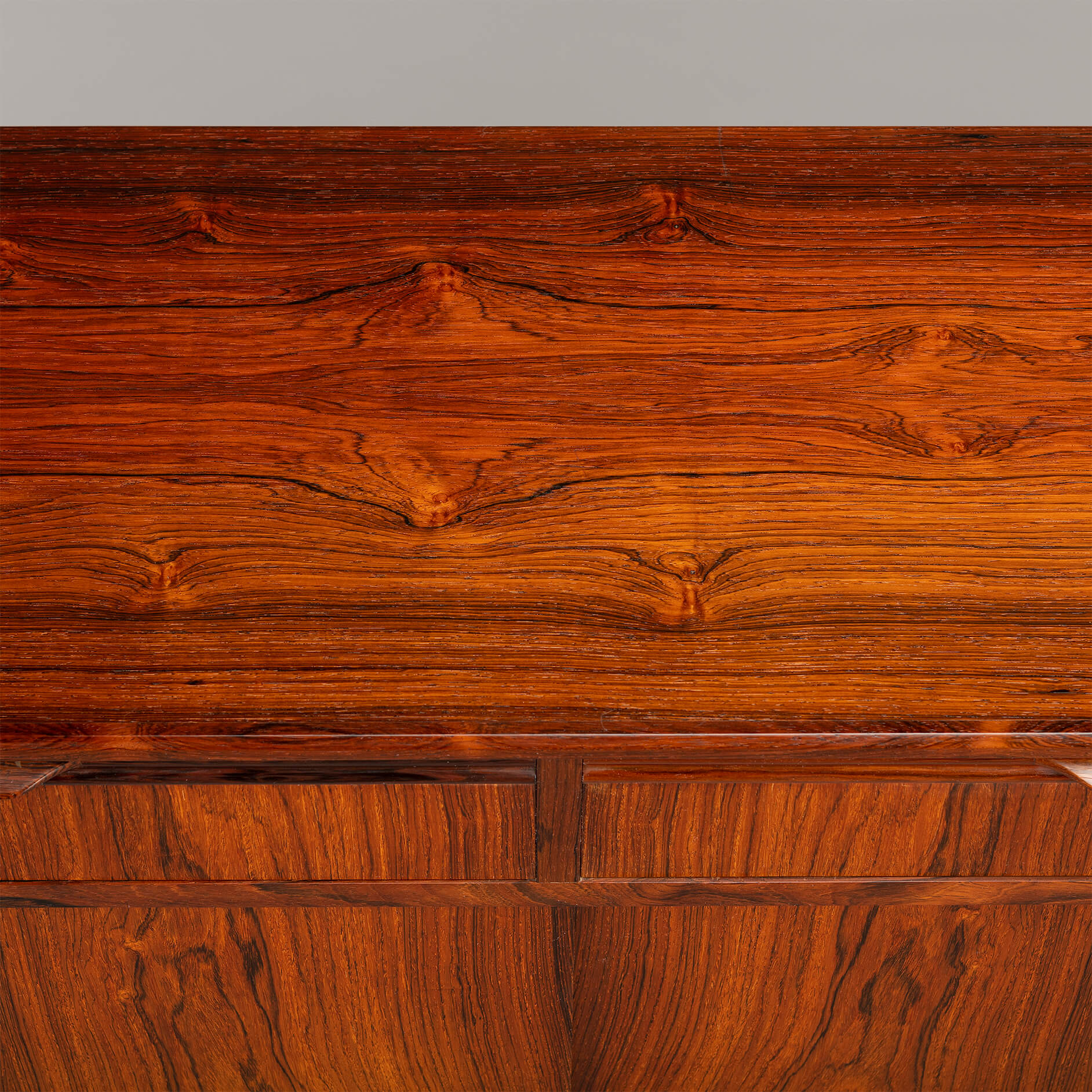 Minimalistisch Deens palissander design dressoir. Gemaakt van een prachtig symmetrisch Palissander. Doordat het dressoir in de loop der tijd iets lichter is geworden door zonlicht, heeft deze kast een prachtige duidelijk zichtbare tekening in het hout.