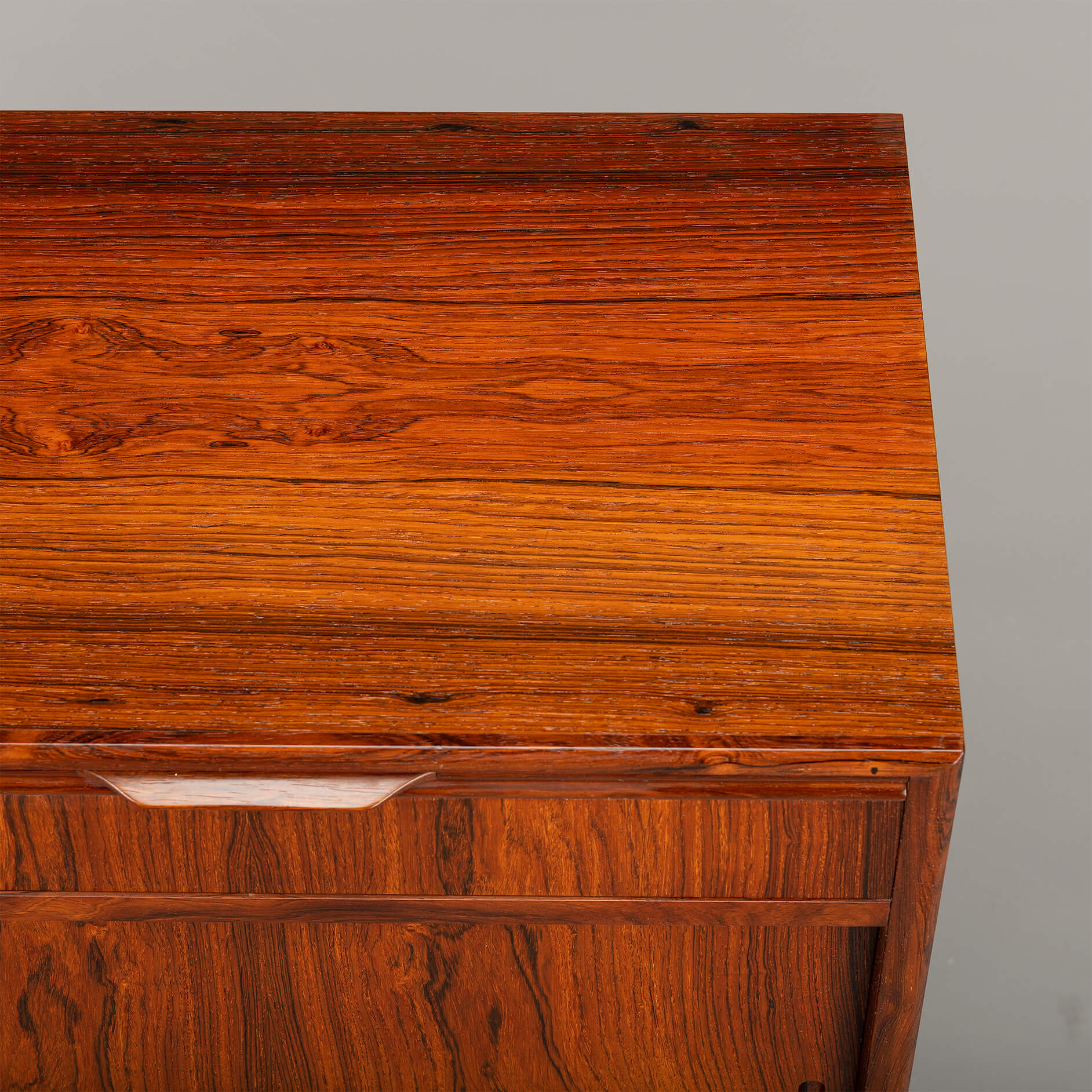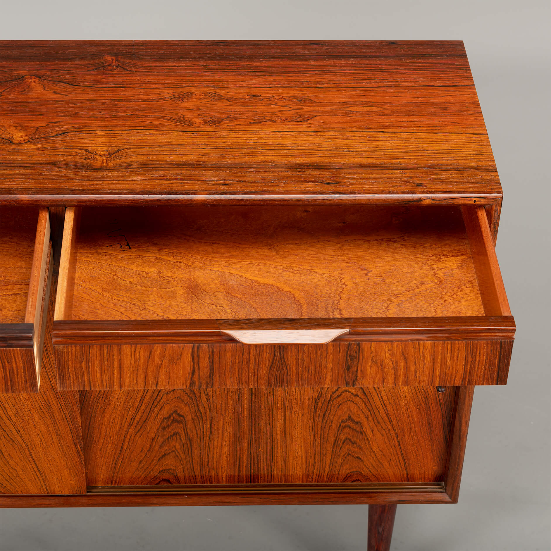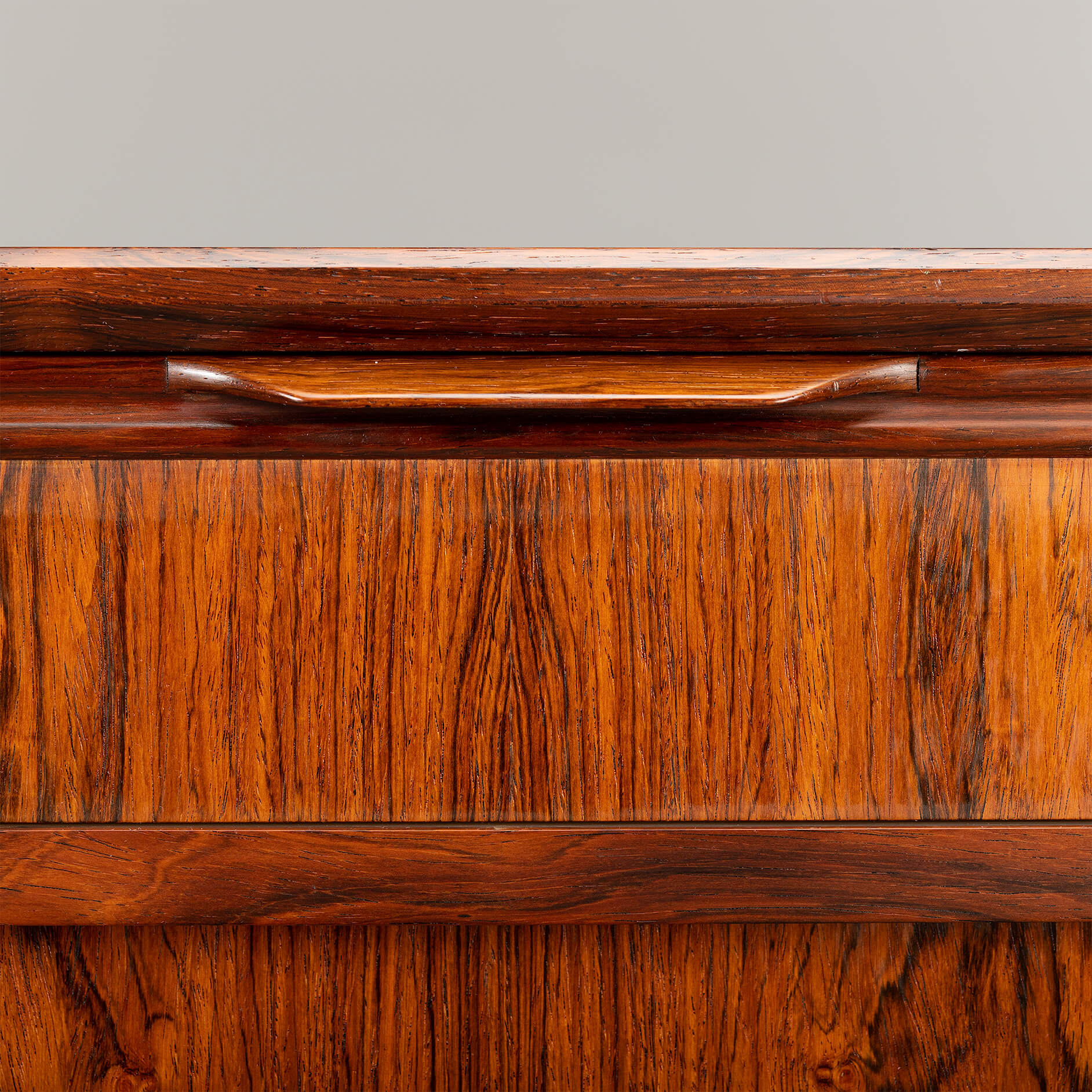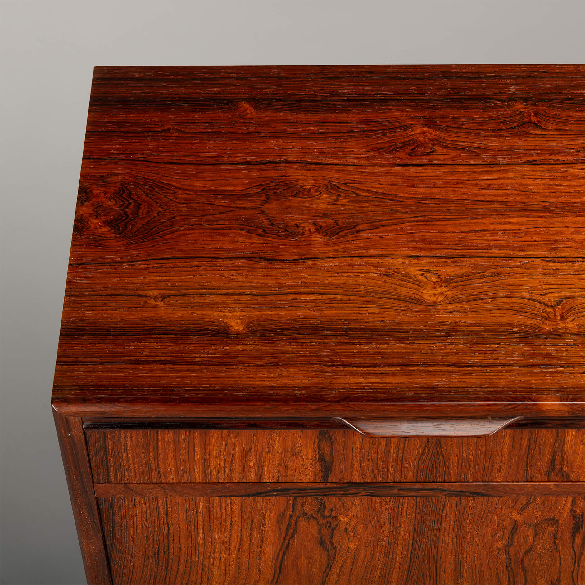 Minimalistisch Deens palissander design dressoir. Gemaakt van een prachtig symmetrisch Palissander. Doordat het dressoir in de loop der tijd iets lichter is geworden door zonlicht, heeft deze kast een prachtige duidelijk zichtbare tekening in het hout.