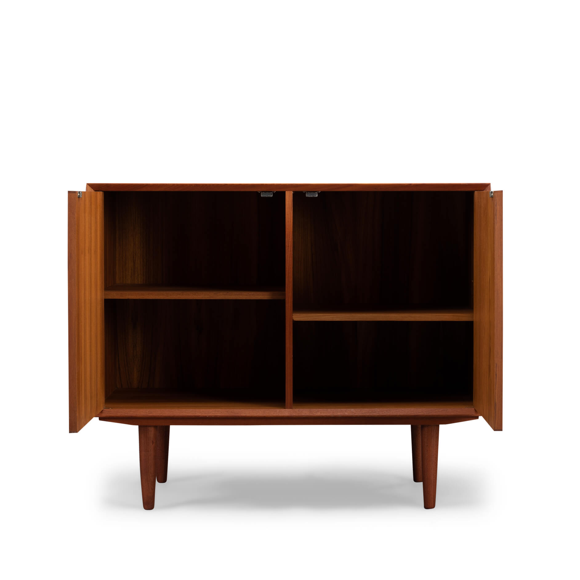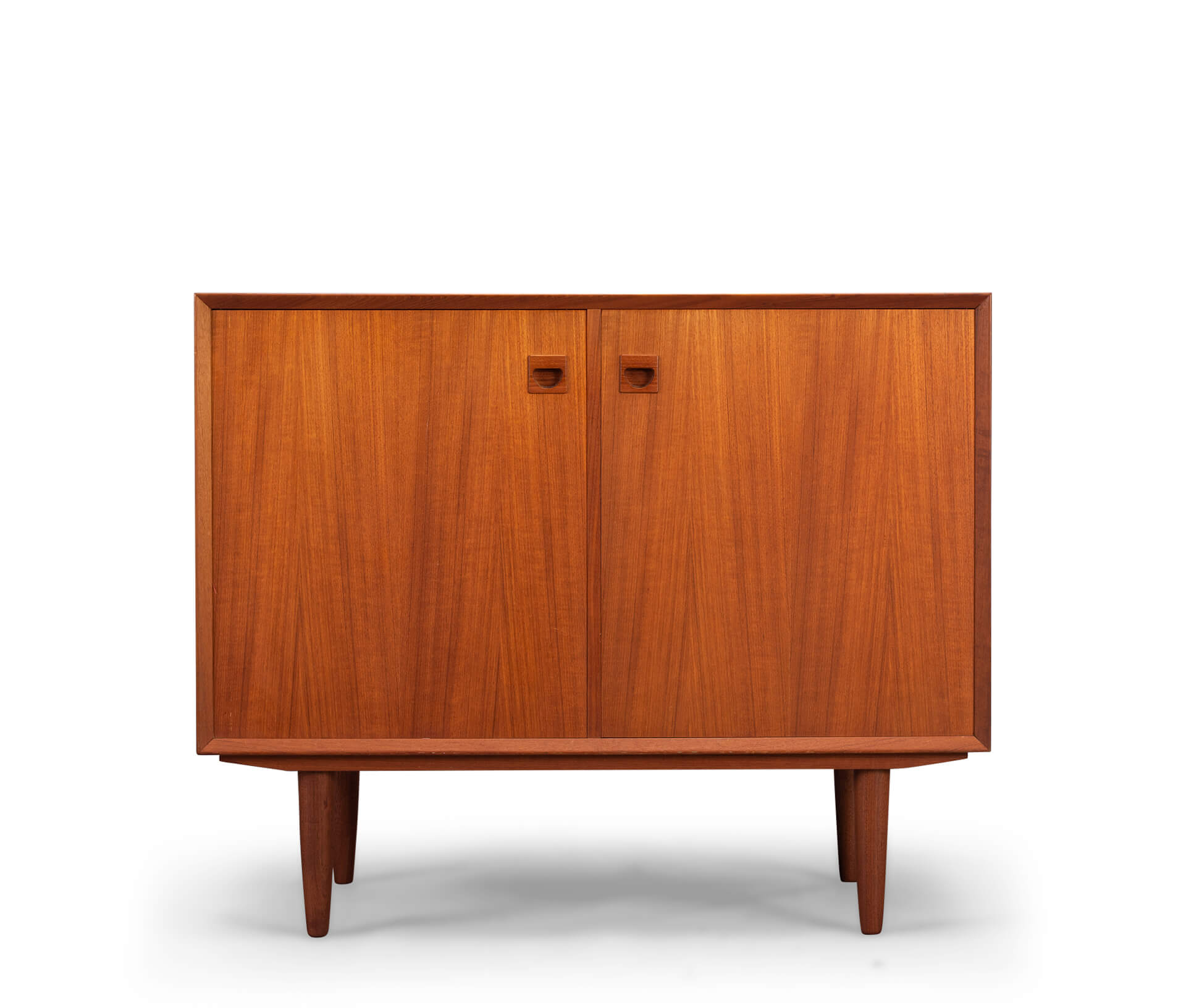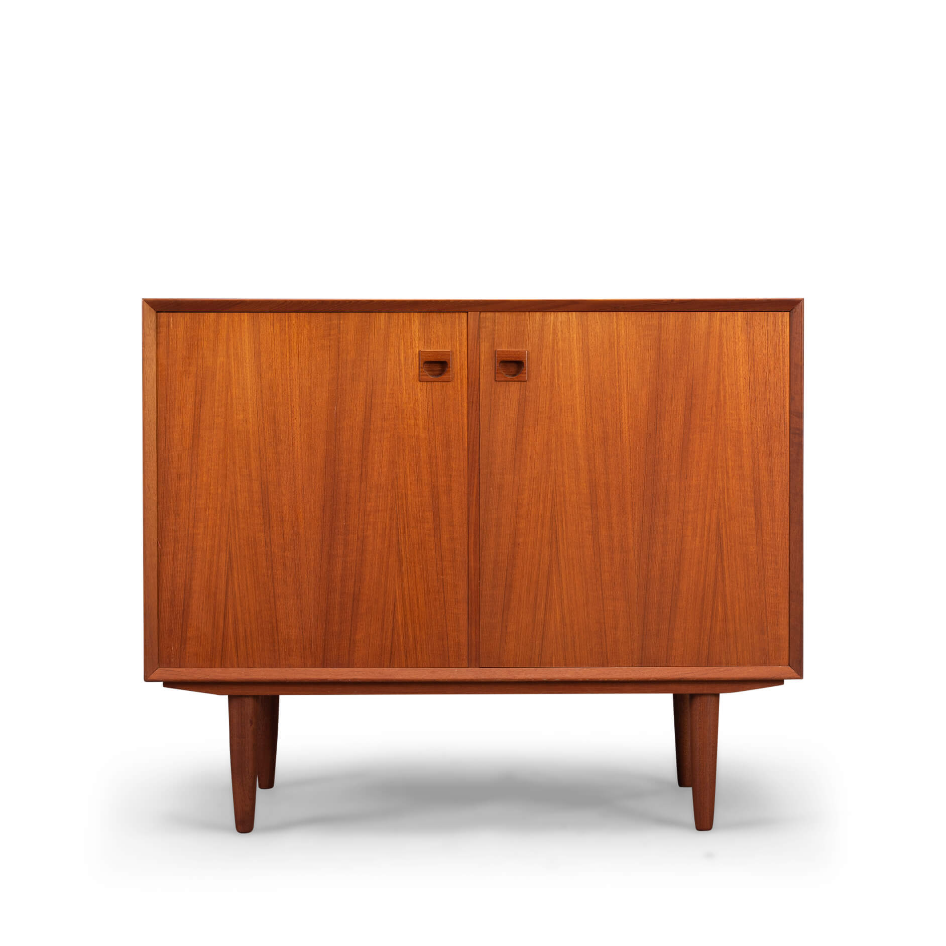 Klein teak dressoir, ontworpen door E. Brouer en vervaardigd door de Brouer Møbelfabrik. Een echte blikvanger in de gang, studeerkamer of living.  Deze kast heeft twee openslaande deuren.