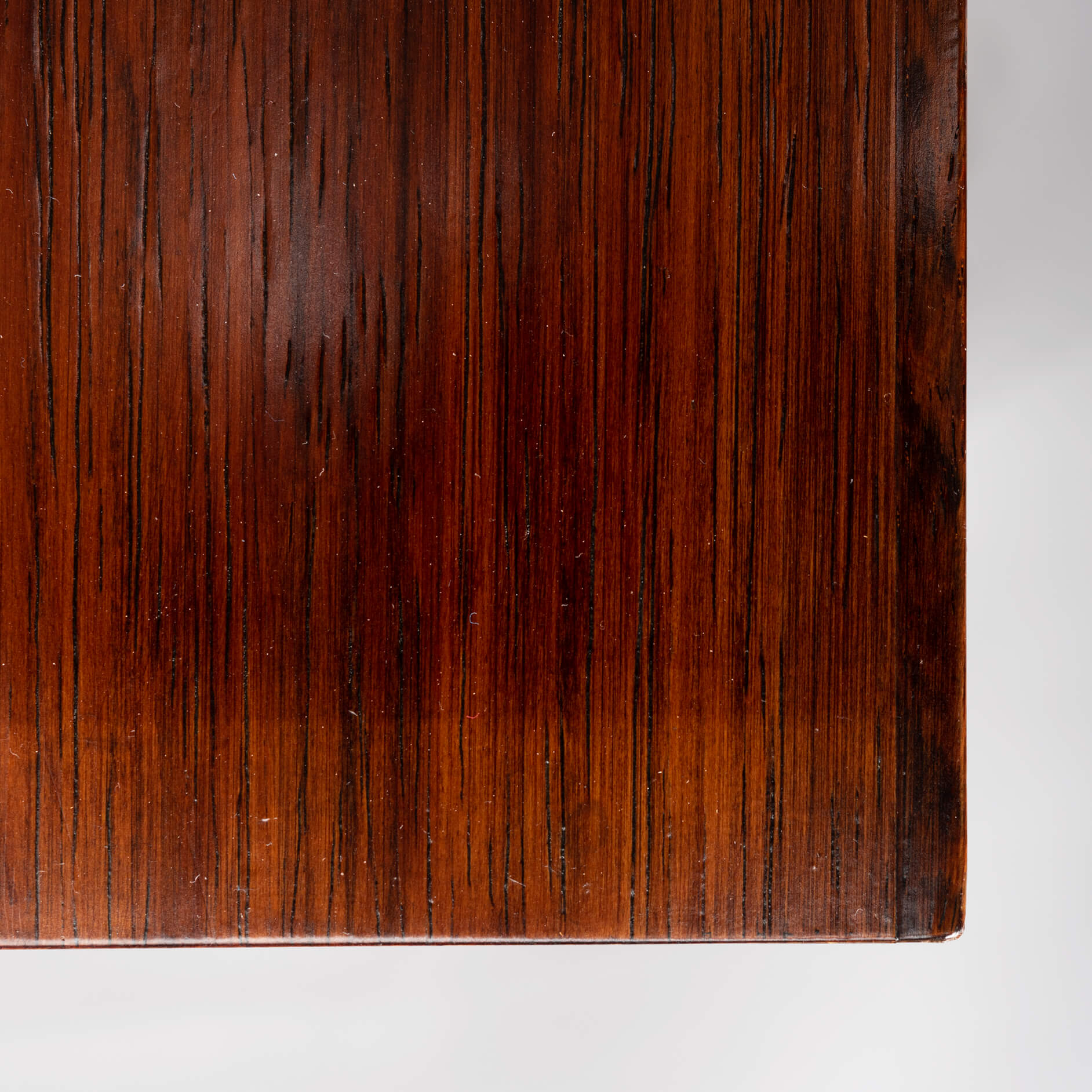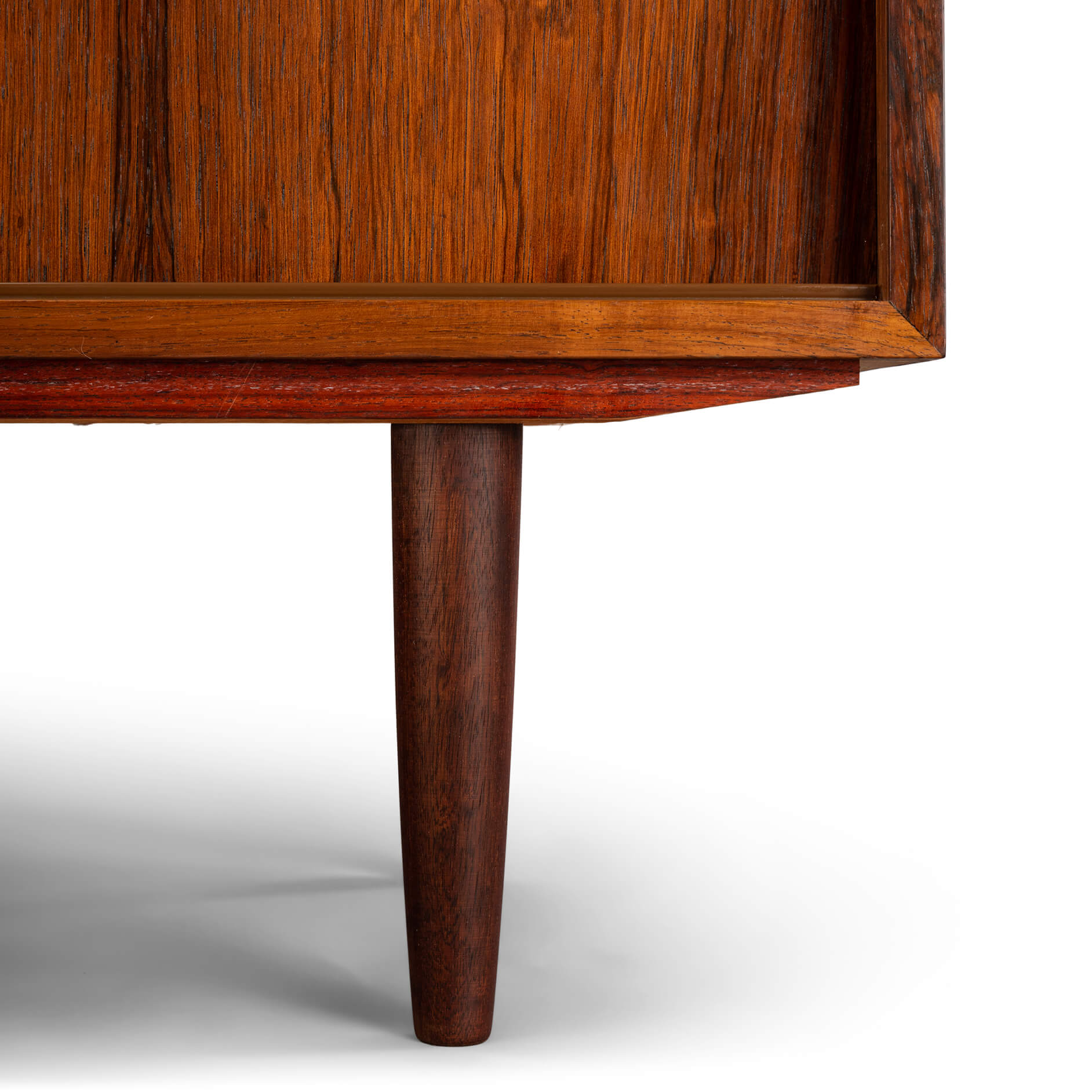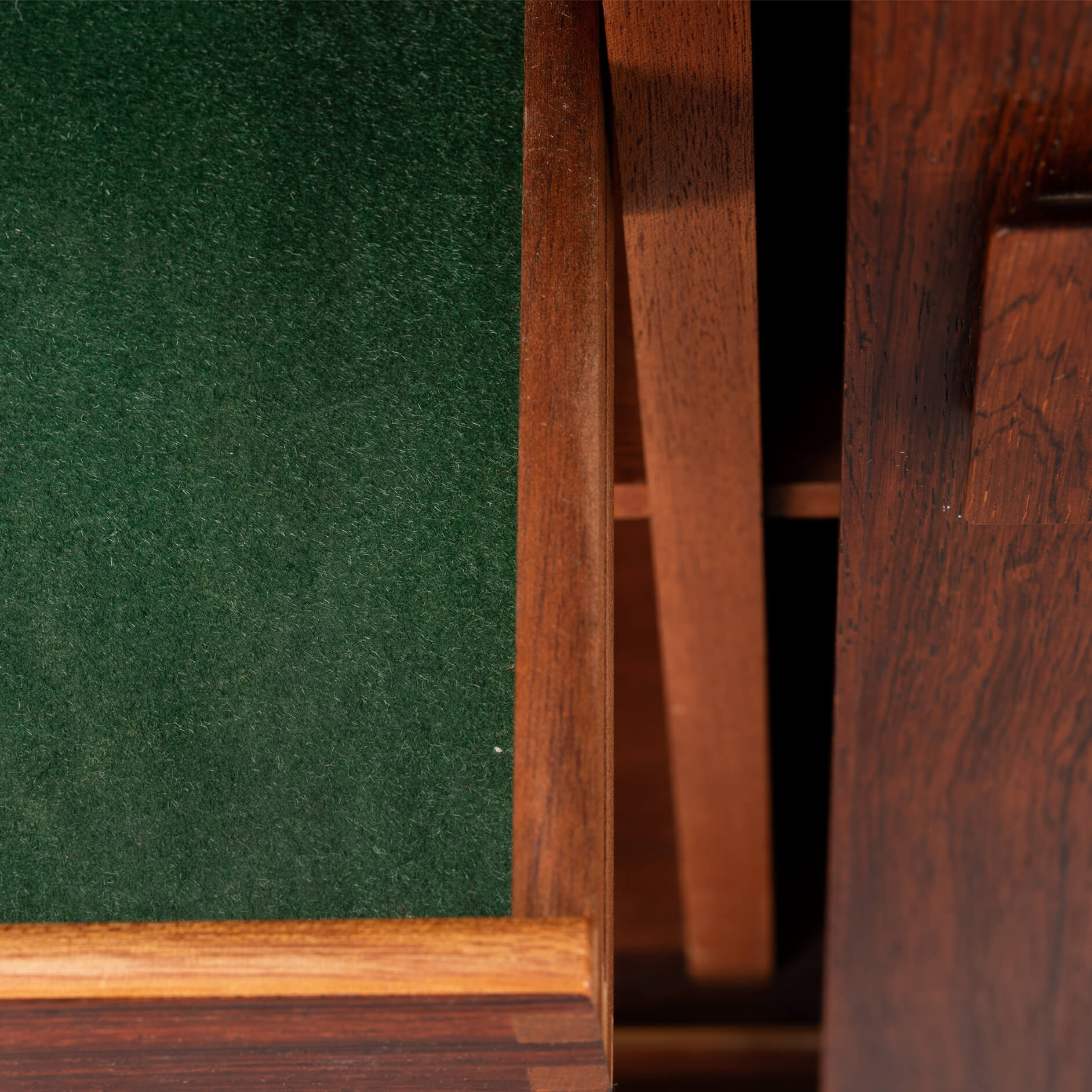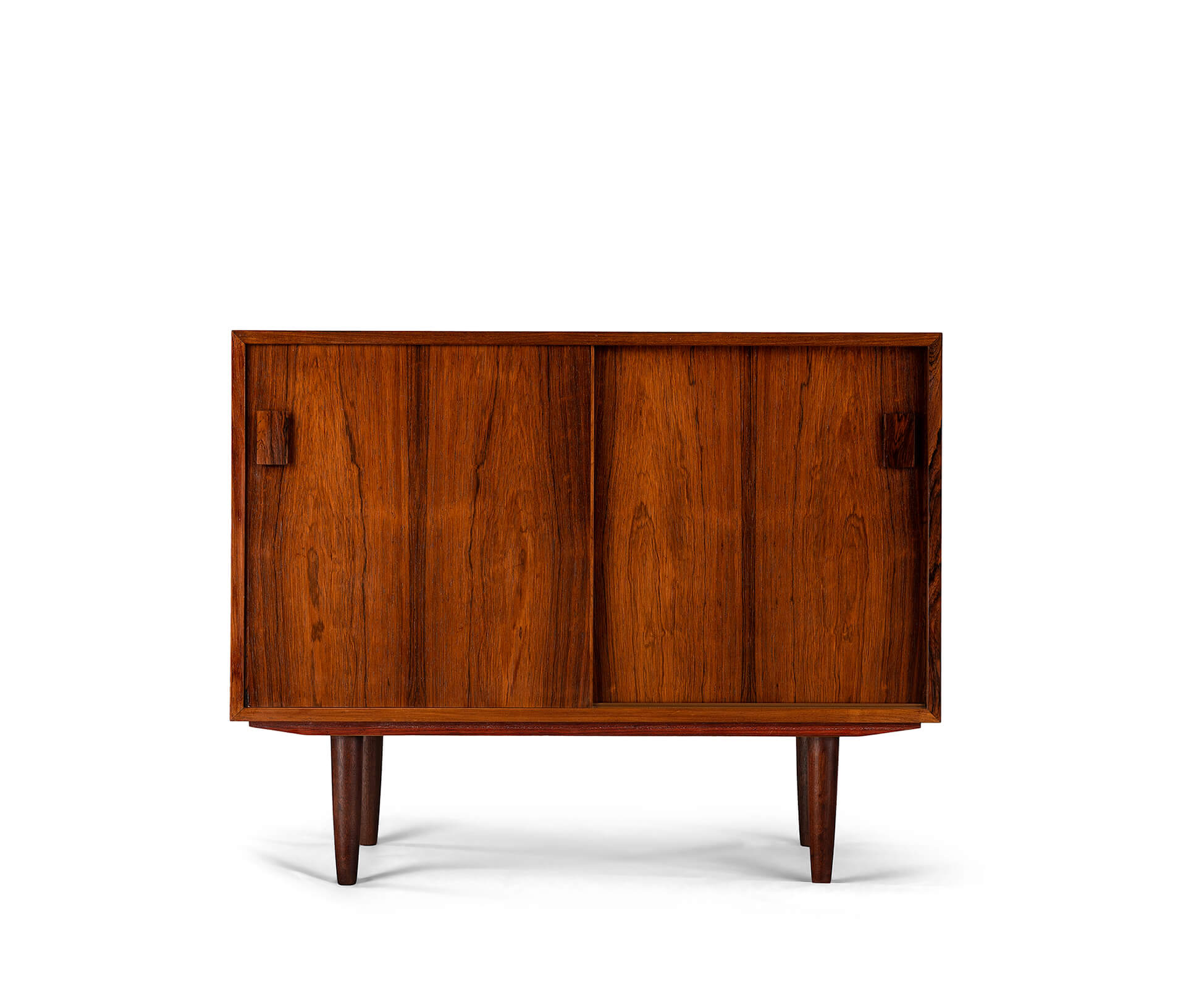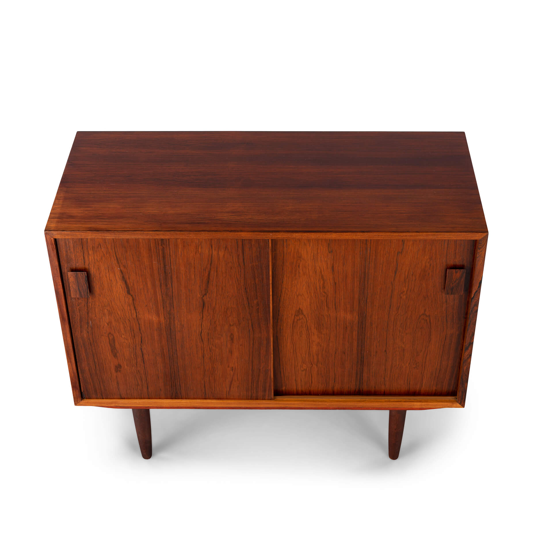 Prachtig donker getinte palissander kleine kast met schuifdeuren. De opbergruimte is in te delen met in hoogte verstelbare planken. Aan de linkerkant ook 2 lades met het originele groene vilt. Rechthoekige in facet gezaagde grepen geven de kast een strakke en functionele uitstraling.