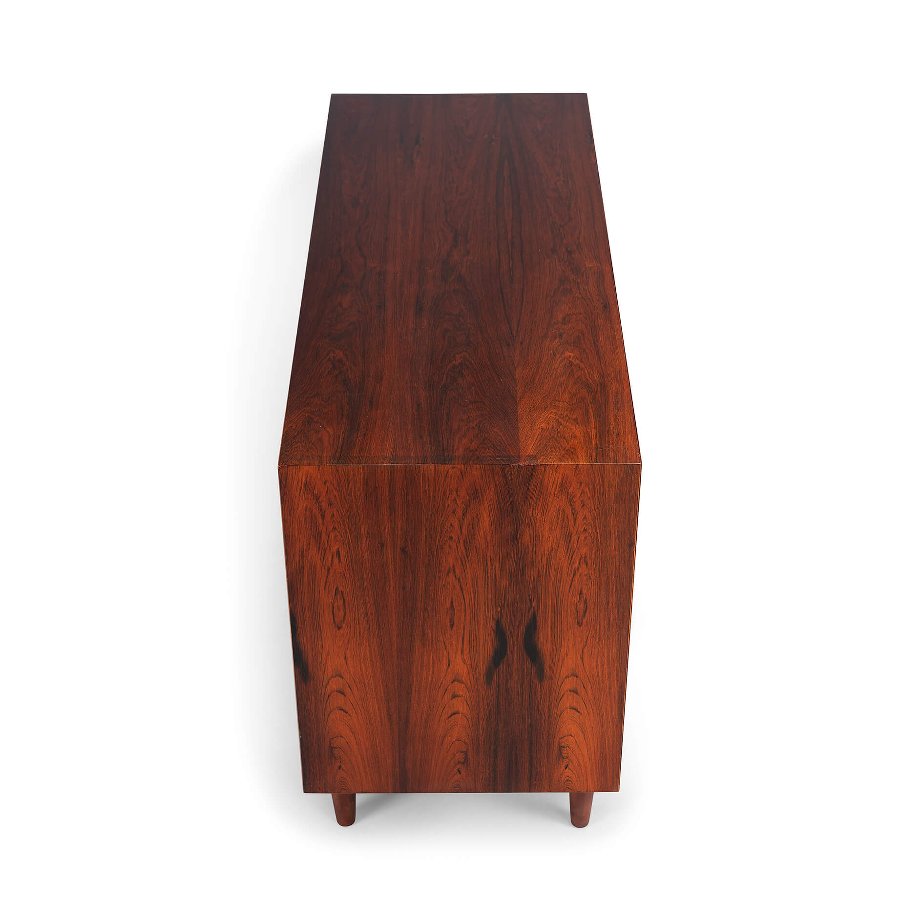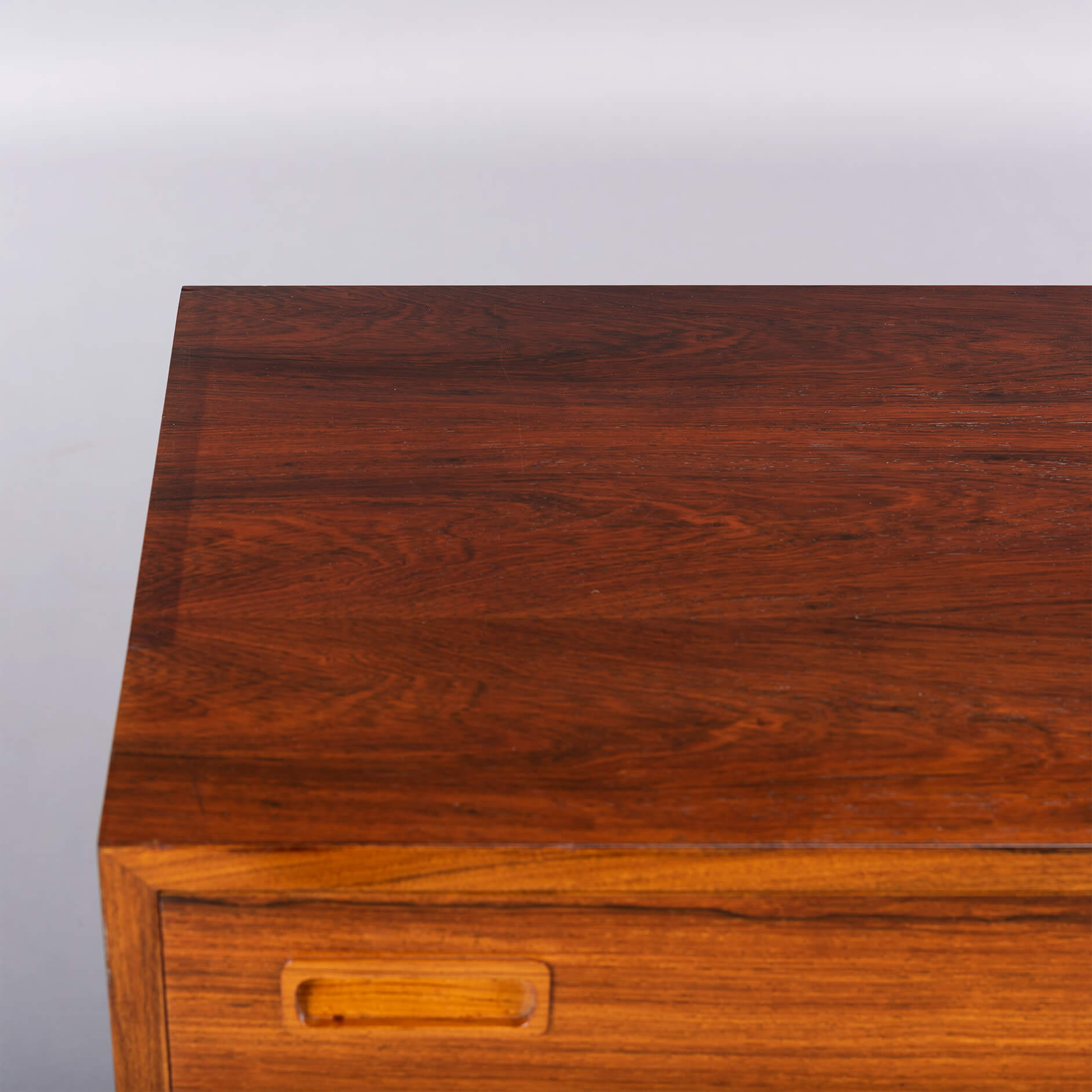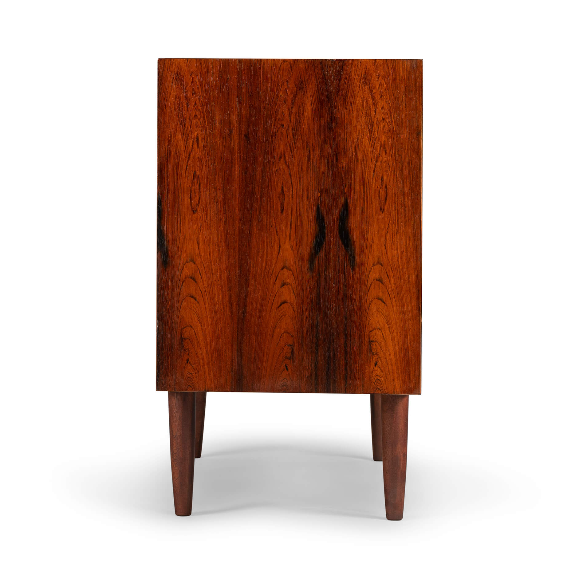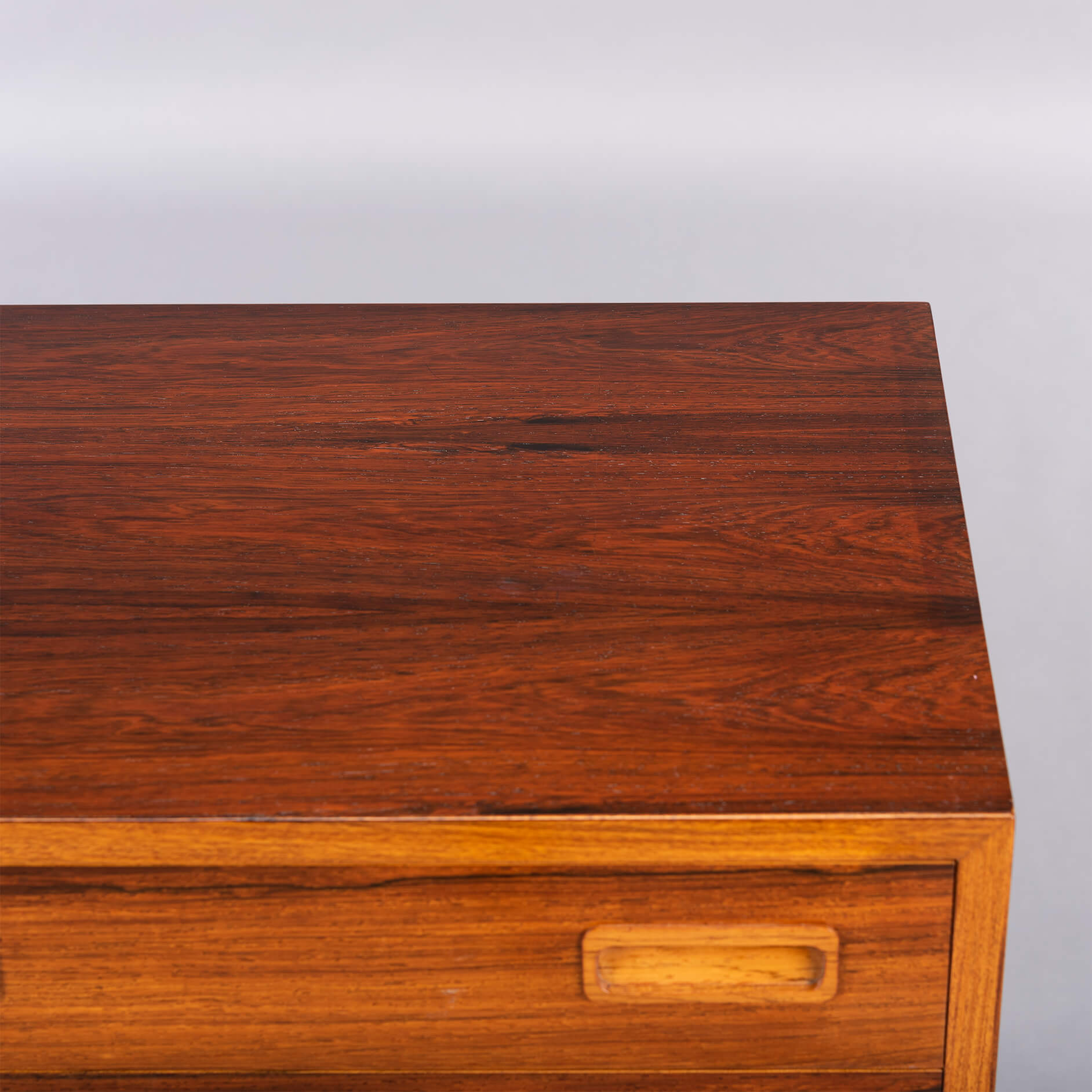 Deze ladekast is een typische Hundevad: functioneel, met aandacht tot in het kleinste detail afgewerkt met zorgvuldig geselecteerde materialen. De ‘perfect match’ tussen vorm en functie, tussen lades en kastframe. Voor dit design liet Poul Hundevad zich verleiden door ‘Dalbergia Sissoo’, ofwel Indiaas palissander. Het is een exclusieve zeer harde houtsoort met enkele diep zwarte accenten. De ladekast is gemaakt in de jaren ‘70 en bekroond met het Deense export label ‘furniture make control’. Kortom ben je op zoek naar uniek vintage design plaats dan deze ‘attention drawer’ in jouw interieur.