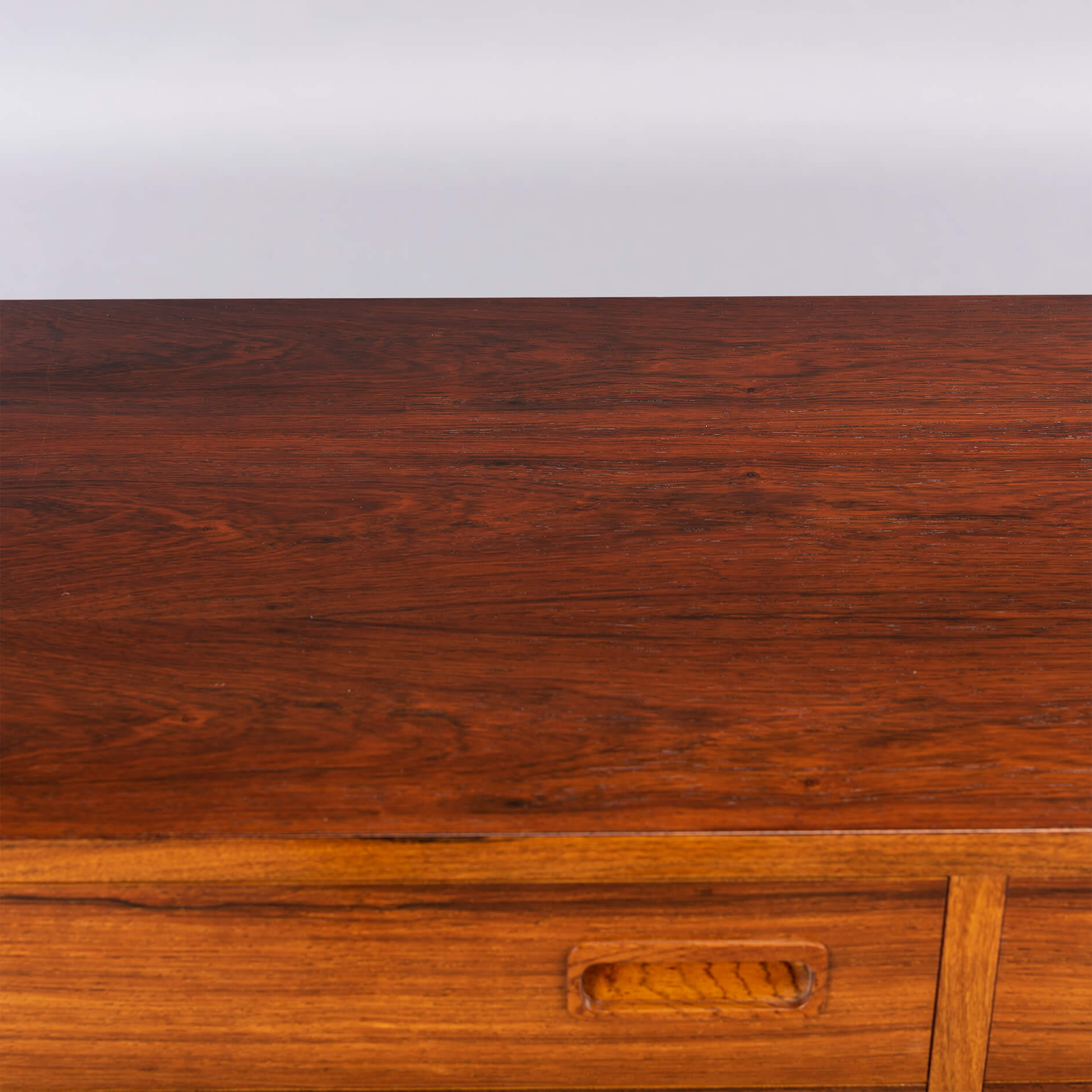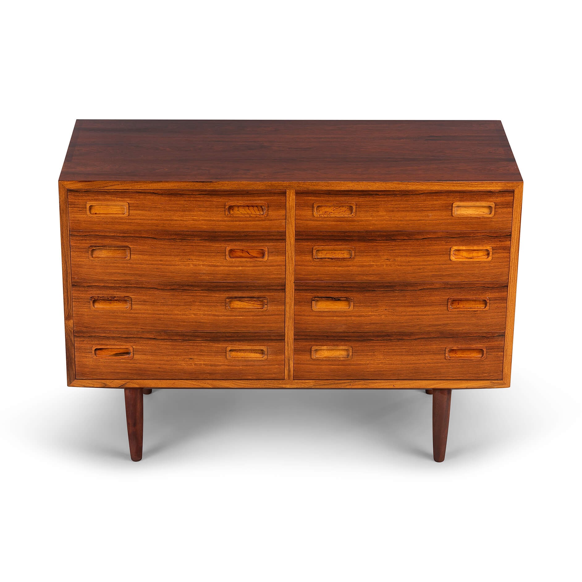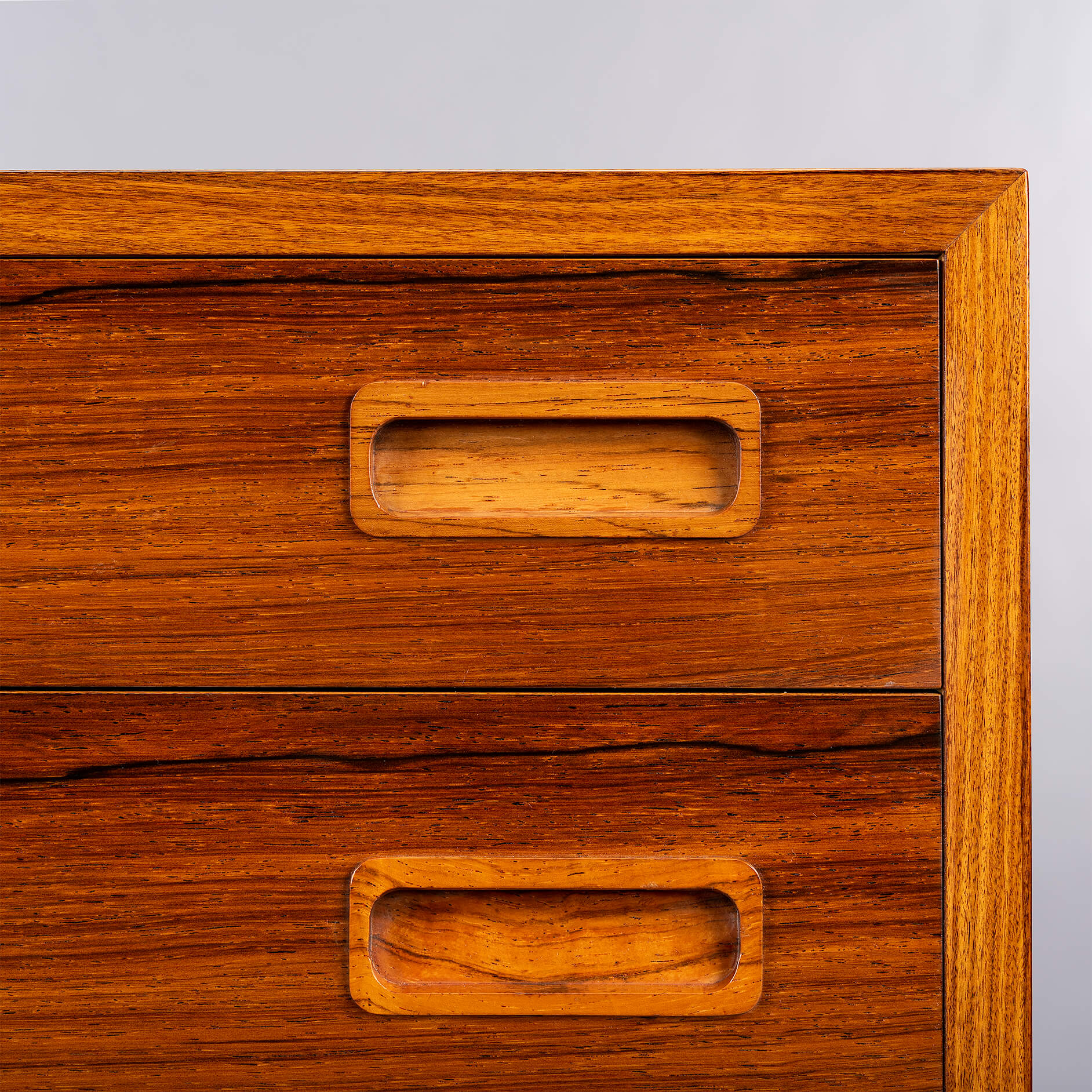 Deze ladekast is een typische Hundevad: functioneel, met aandacht tot in het kleinste detail afgewerkt met zorgvuldig geselecteerde materialen. De ‘perfect match’ tussen vorm en functie, tussen lades en kastframe. Voor dit design liet Poul Hundevad zich verleiden door ‘Dalbergia Sissoo’, ofwel Indiaas palissander. Het is een exclusieve zeer harde houtsoort met enkele diep zwarte accenten. De ladekast is gemaakt in de jaren ‘70 en bekroond met het Deense export label ‘furniture make control’. Kortom ben je op zoek naar uniek vintage design plaats dan deze ‘attention drawer’ in jouw interieur.